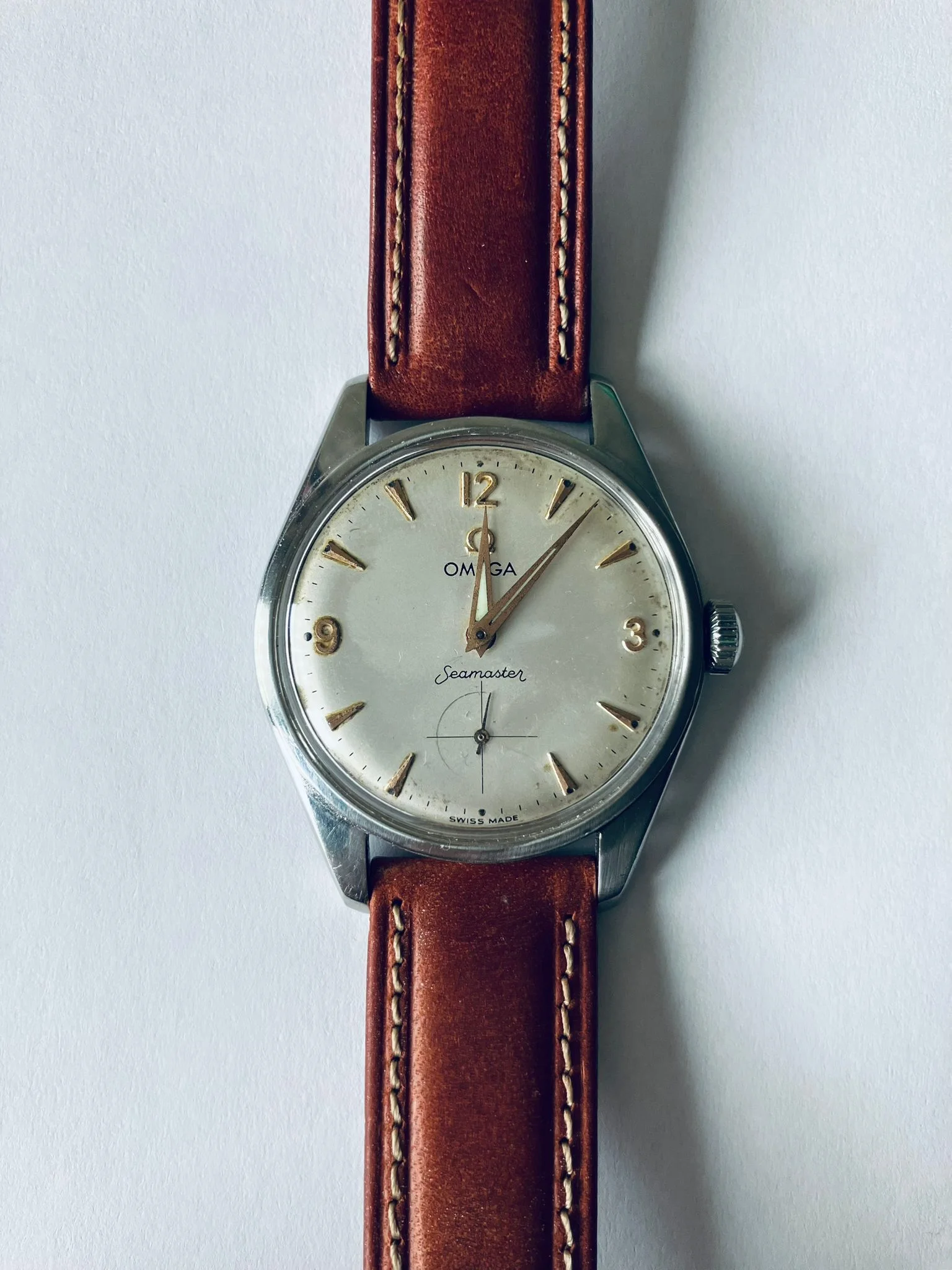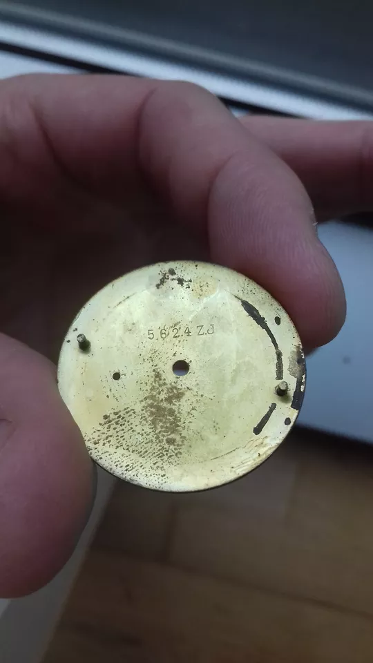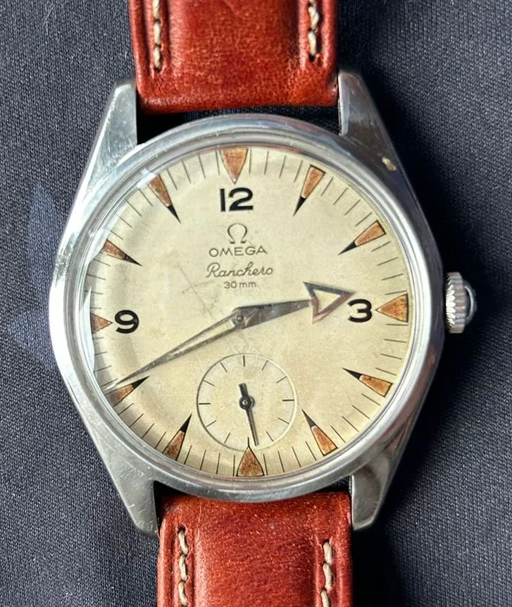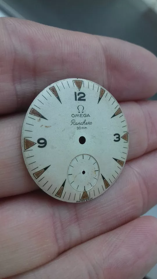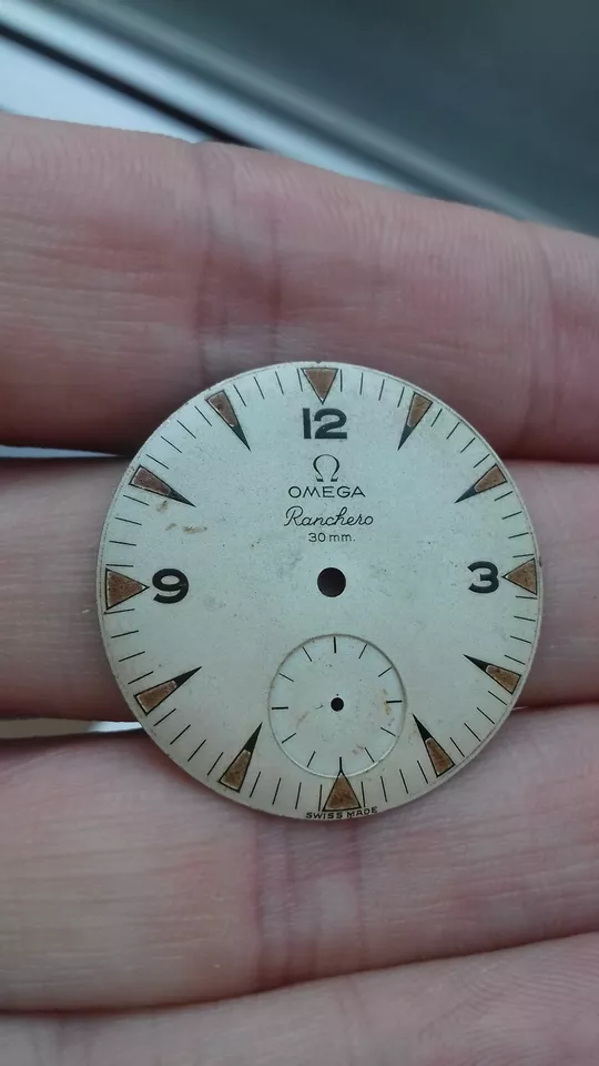 The project is based on a very good case and movement. I'll post some photos, and then there's the dial. This is a dial that I think we could call a barn find. I bought it from a watchmaker, and the story is that it's from an Omega Ranchero, and as soon as I bought it, the dial was replaced with a Seamaster dial. You know, at that time, Seamasters were much more expensive than Rancheros, and those things were sometimes done. The dial stayed in a drawer until now, and I bought it from the watchmaker.