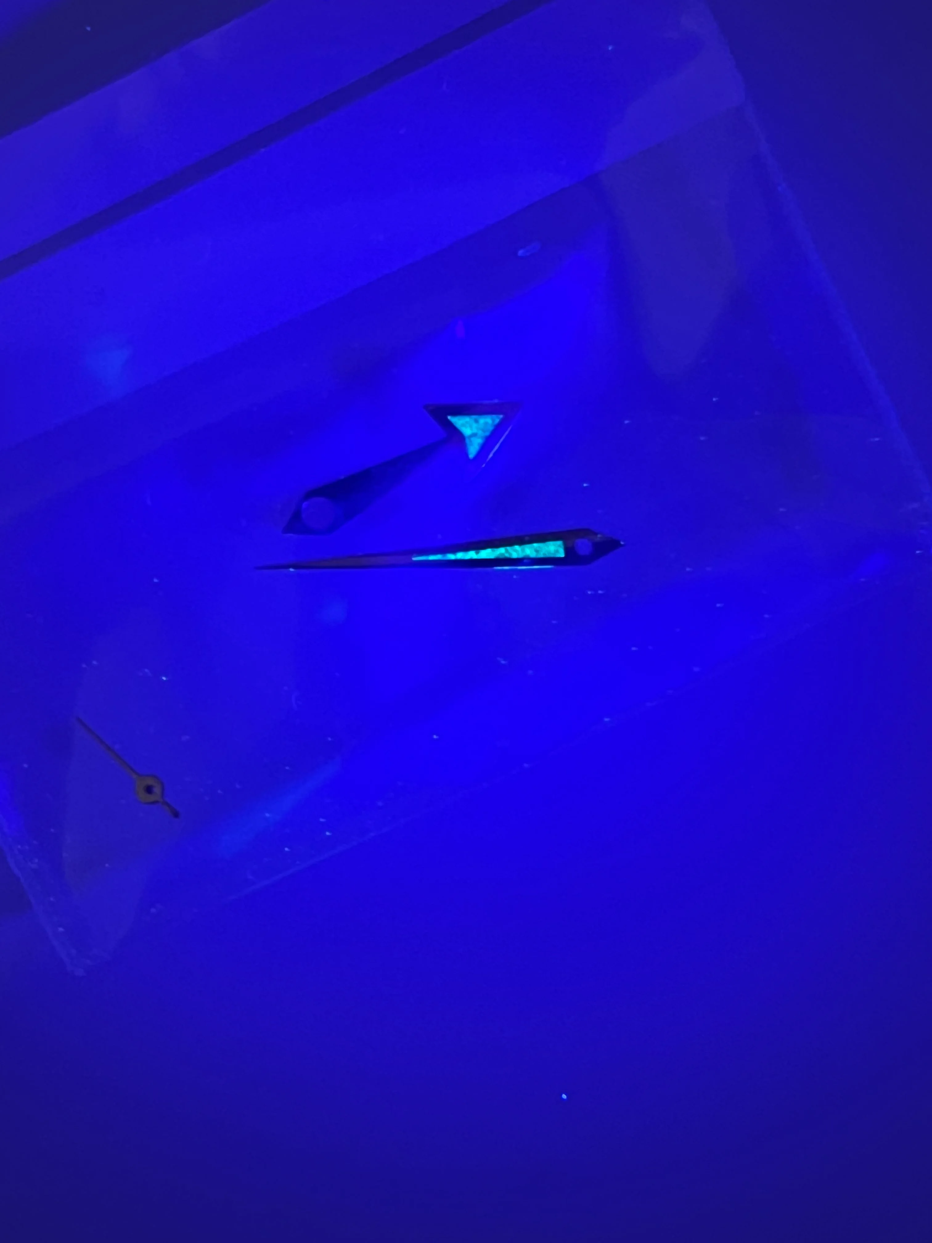 Could you have a look them and let me know whether you see anything that would make you believe that they could not be authentic. The lume is coarsly granular, fades quickly after UV is removed. Color of the lume is best reflected on the first pic.