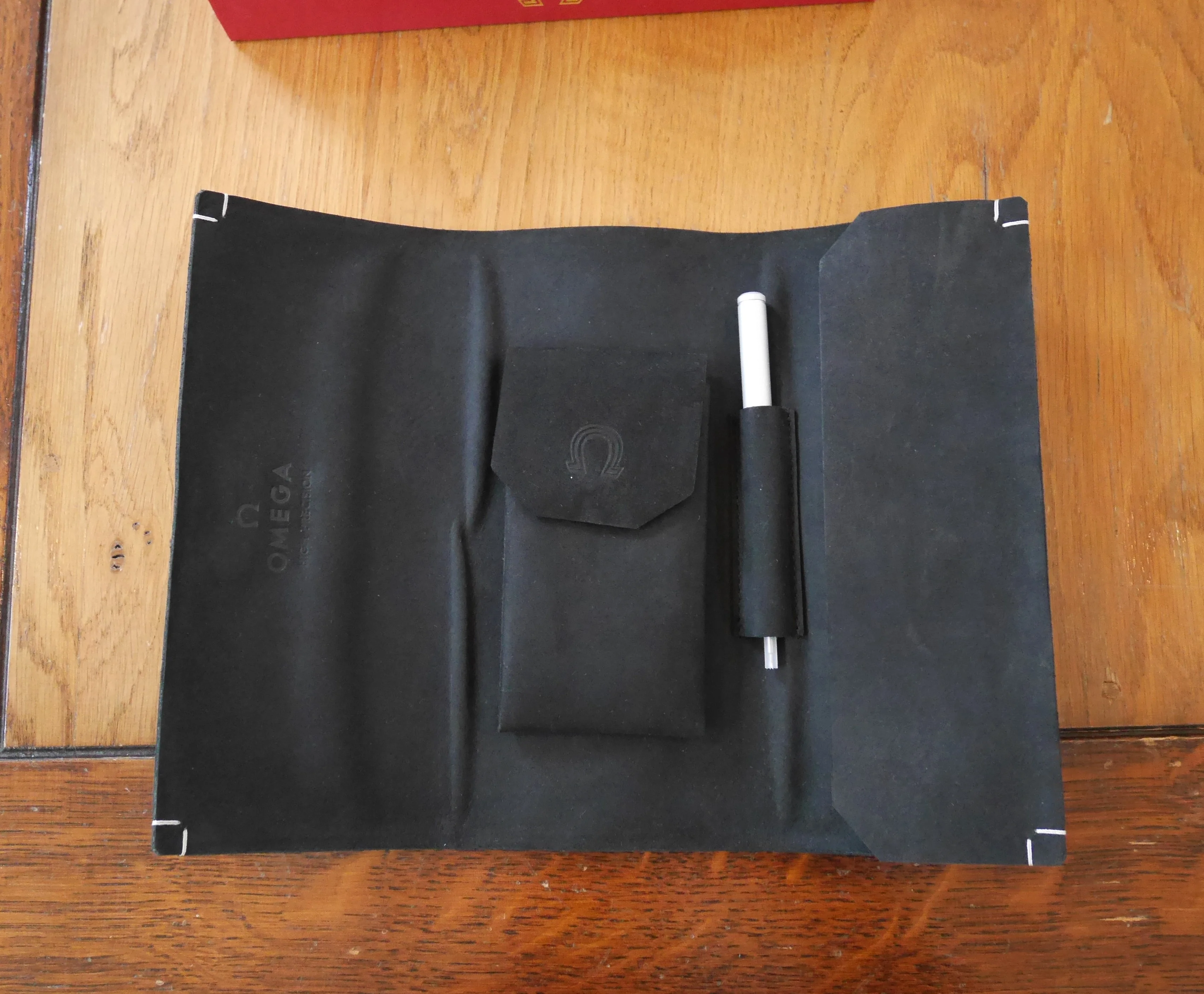 With instruction booklet and card holder, black leather pouch and strap change tool.