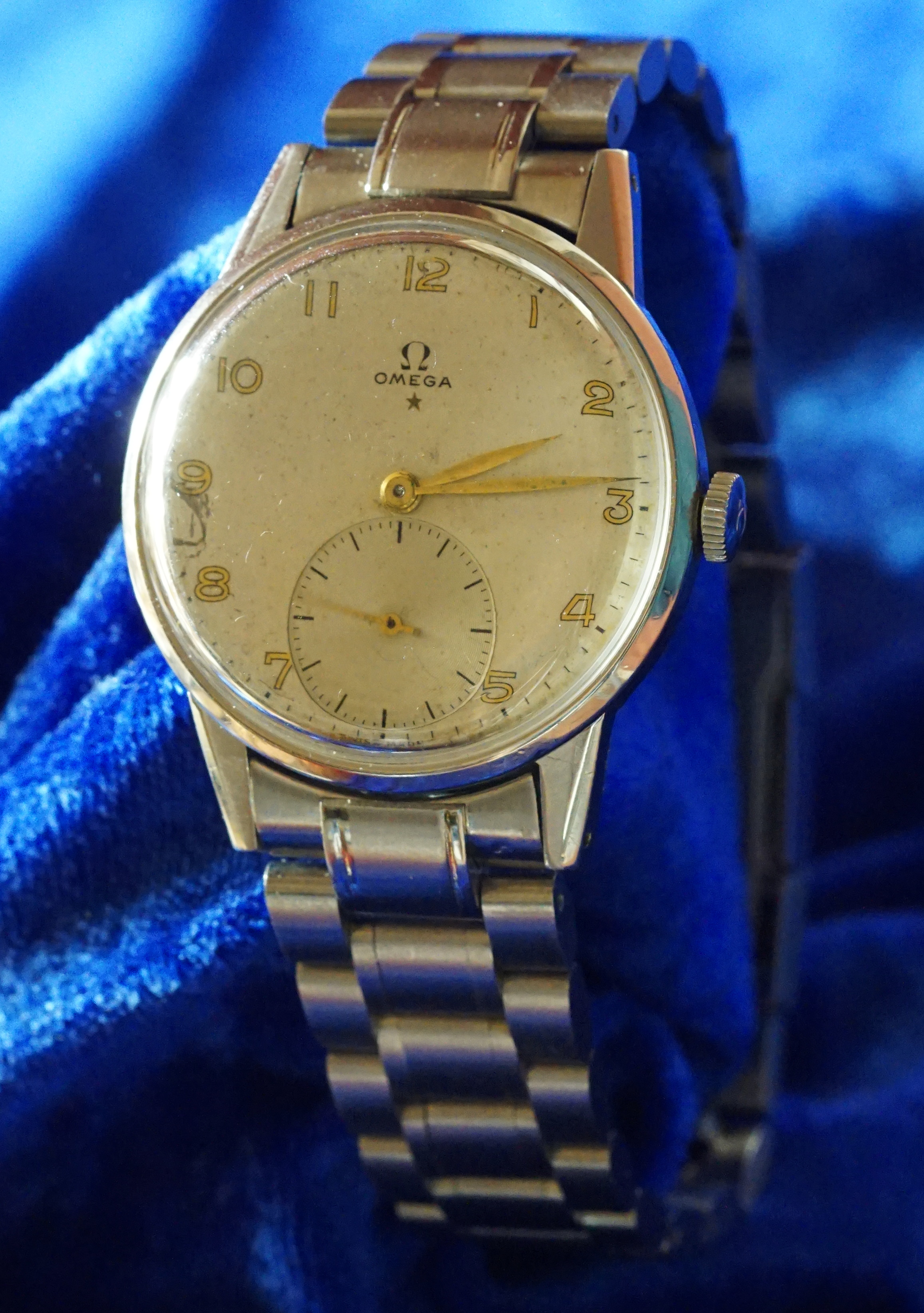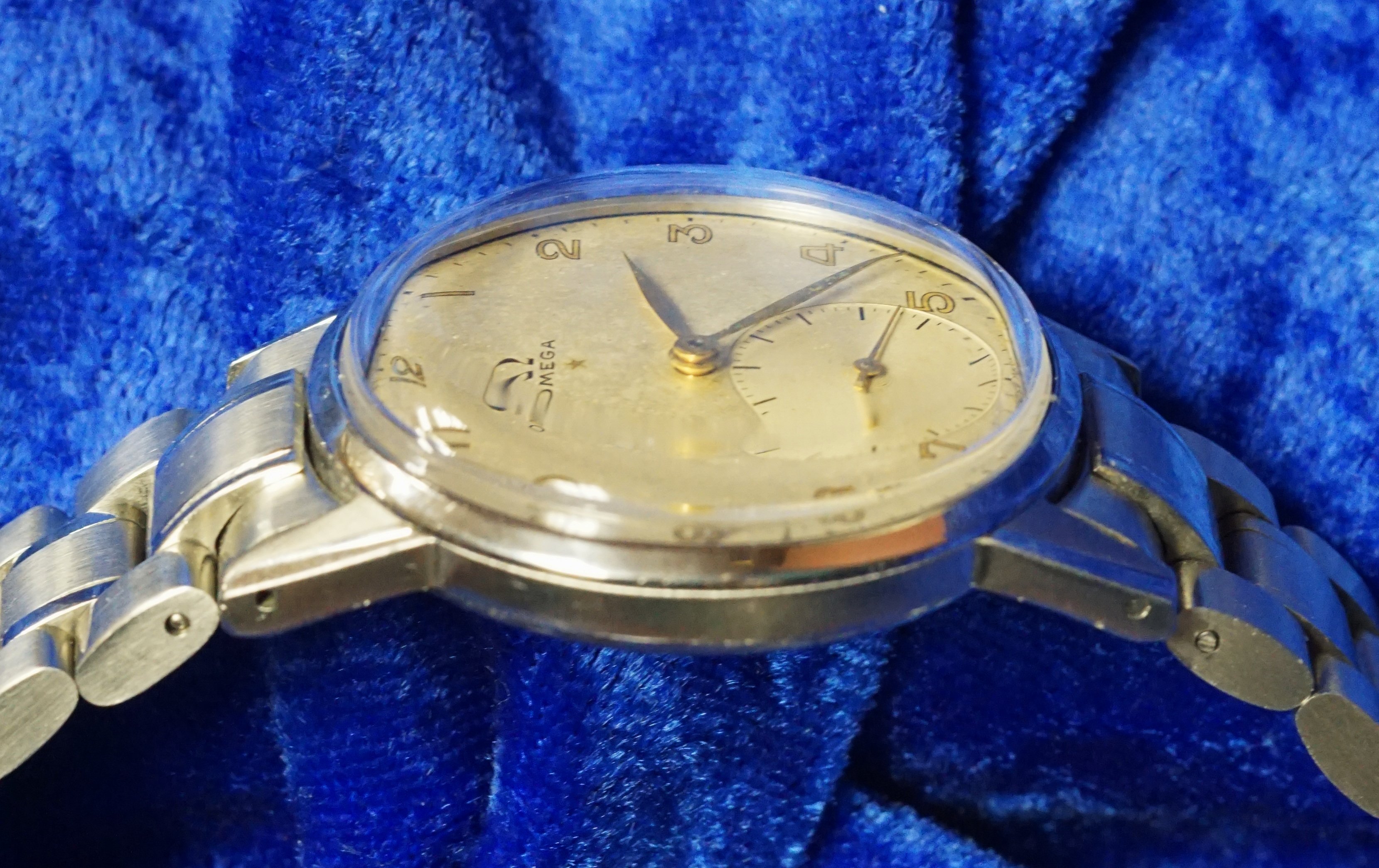 ·This is a new watch for me, that was just returned from the watchmaker. Running terrific. I do have some questions, and am hoping some of the experienced hawkeyes will weigh in. While being serviced the mainspring and crystal were replaced. Was Omega even putting the symbol in the crystals in 1949-50? I also suspect that the signed crown is a retrofit, and if so I am not really concerned with replacing it. The bracelet is an inexpensive one that I shaved the endpieces down a hair to fit. My bigger question is the dial, to my amateur eye is seems OK, but there is so much I do not know.