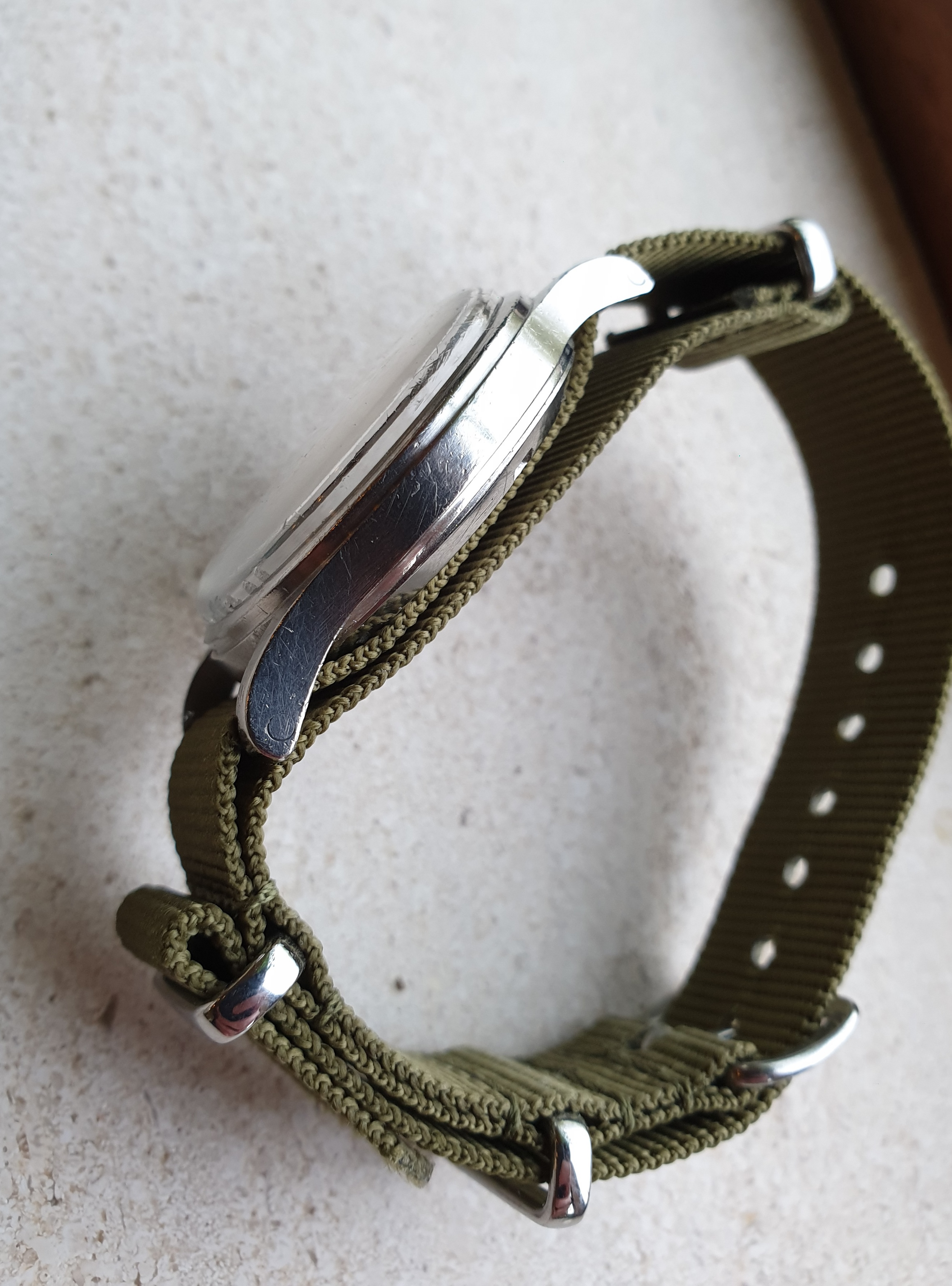 The case is somewhat worn, showing signs of regular use. Engravings are still deep and crisp, showing no sign of case refinishing. The lug width is 18mm and the lug bar is fixed as per specs.