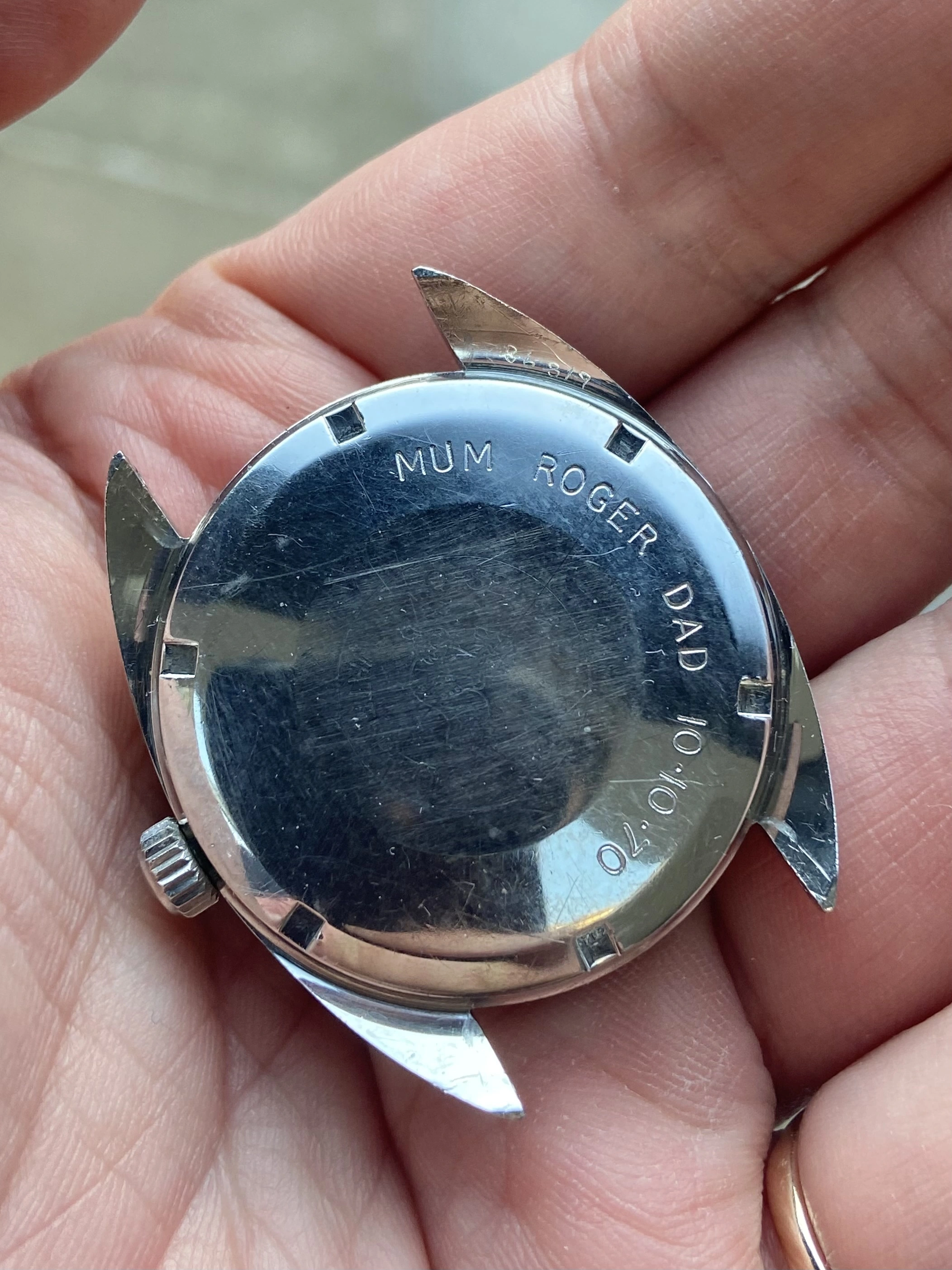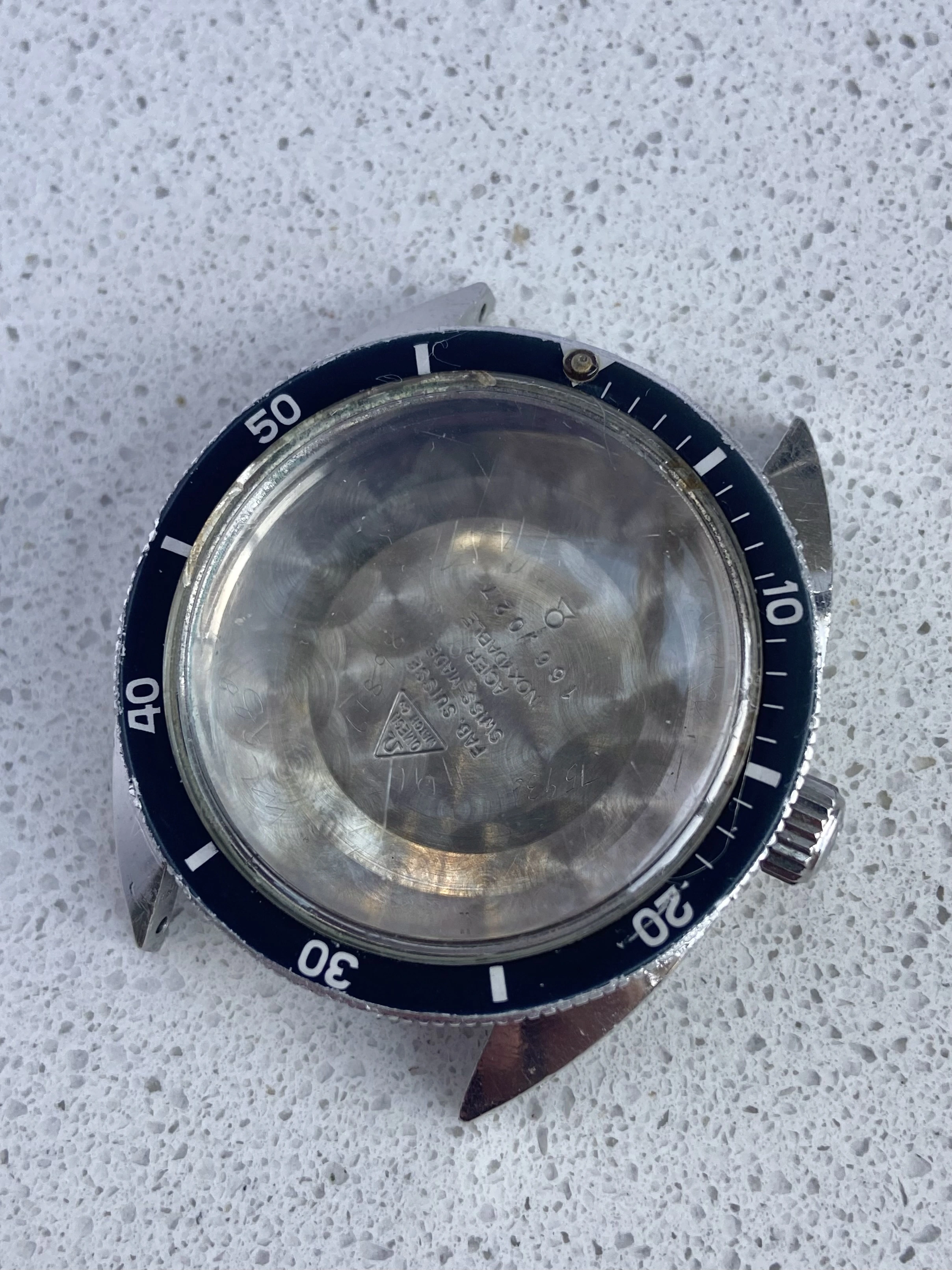 The crystal has scratches and the caseback has an engraving and has also been polished.