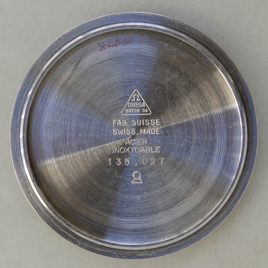 Case / Crown: Distinctive “cut-out” case measures 36mm in diameter with the distance between lugs being 19mm. Case shows minor surface scratches and likely received a light polish in the past. Brushed finish on lugs still present. Some minor scratches on caseback. Interior caseback shows diving bell symbol which indicates the case was made by Ervin Piquerez SA. Signed Omega crown.