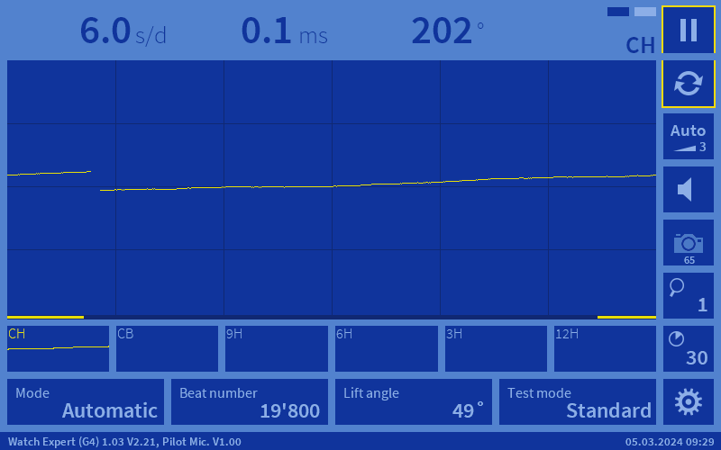 3. Movement performance check, amplitude and rate at 0H (30 minutes after removing from the auto winder) - I would usually show three performance pictures as specified by Omega being CH (dial up), 6H (Six O'clock high), 9H (Nine O'clock high) but as the dial up amplitude is low, I am just showing that. In this case, although the power reserve is good, the timegrapher picture shows low amplitude so, it is definitely in need of a service.