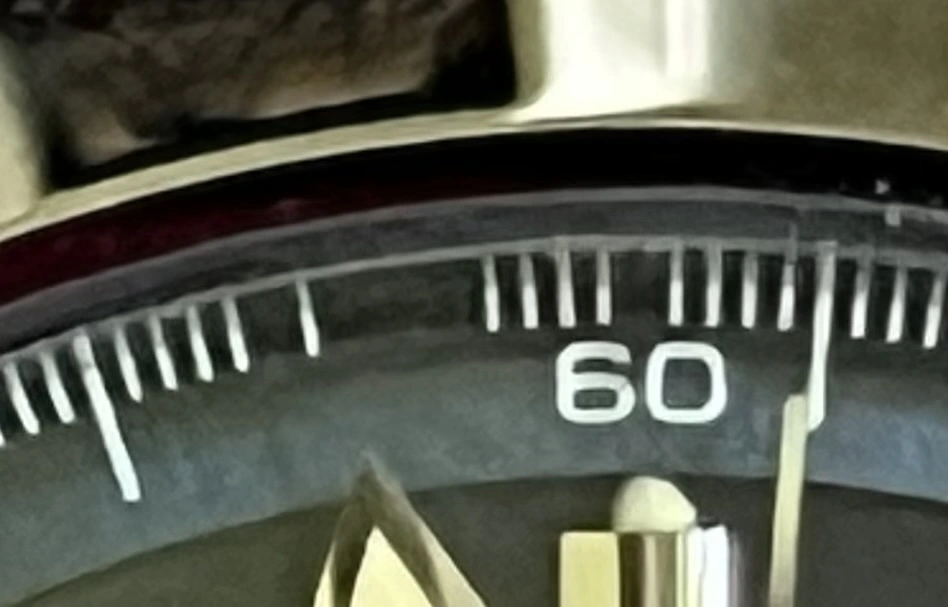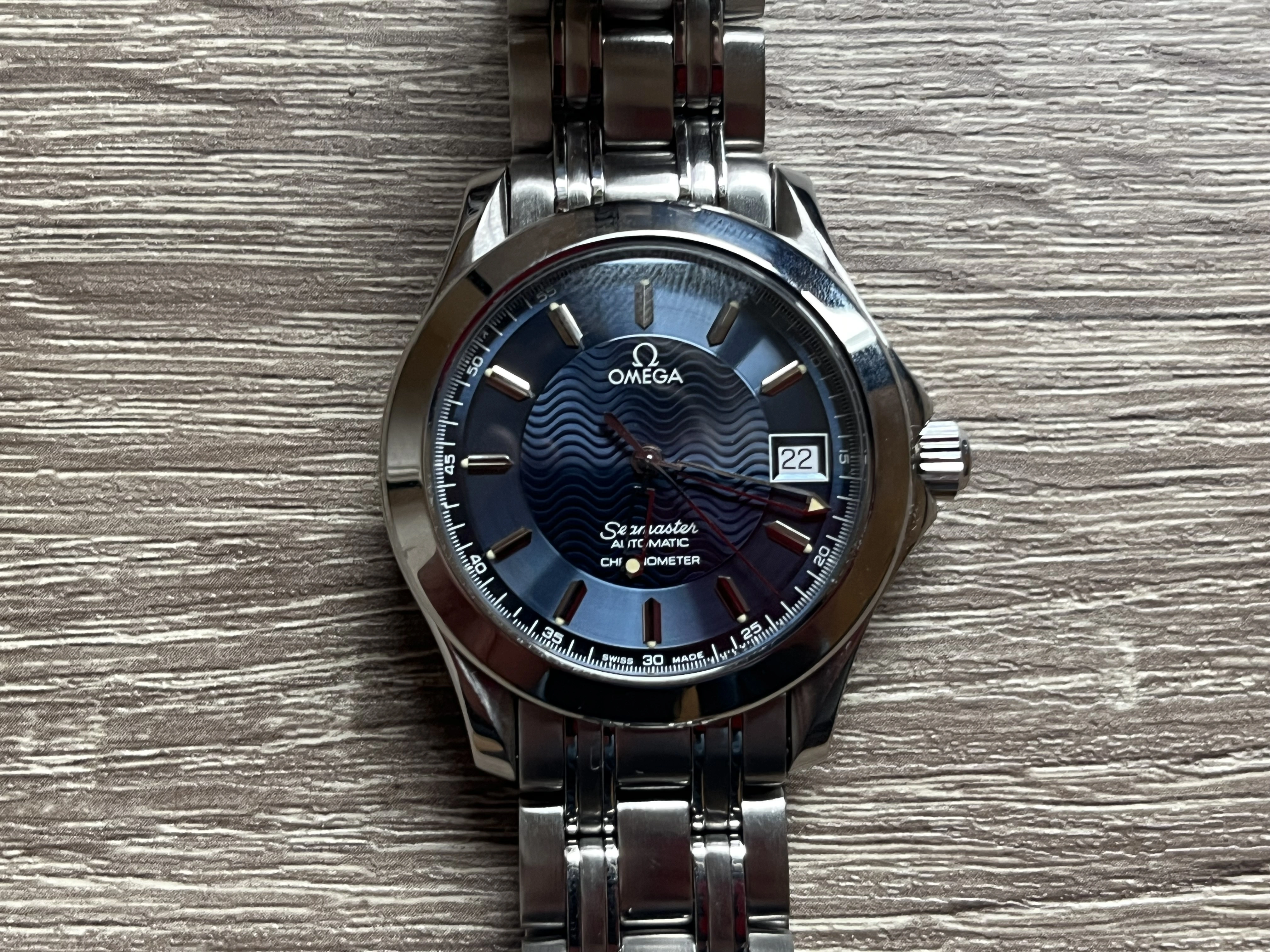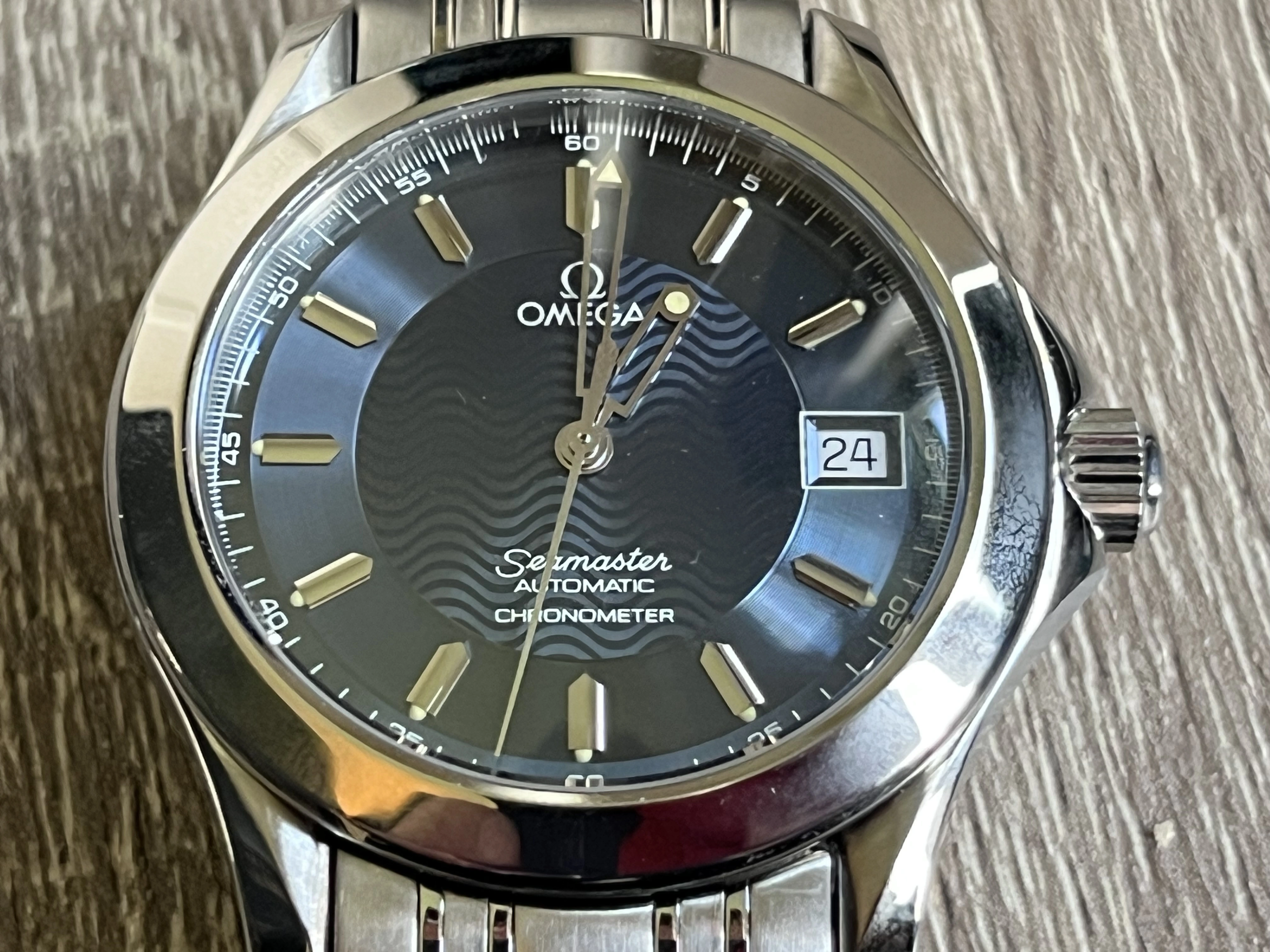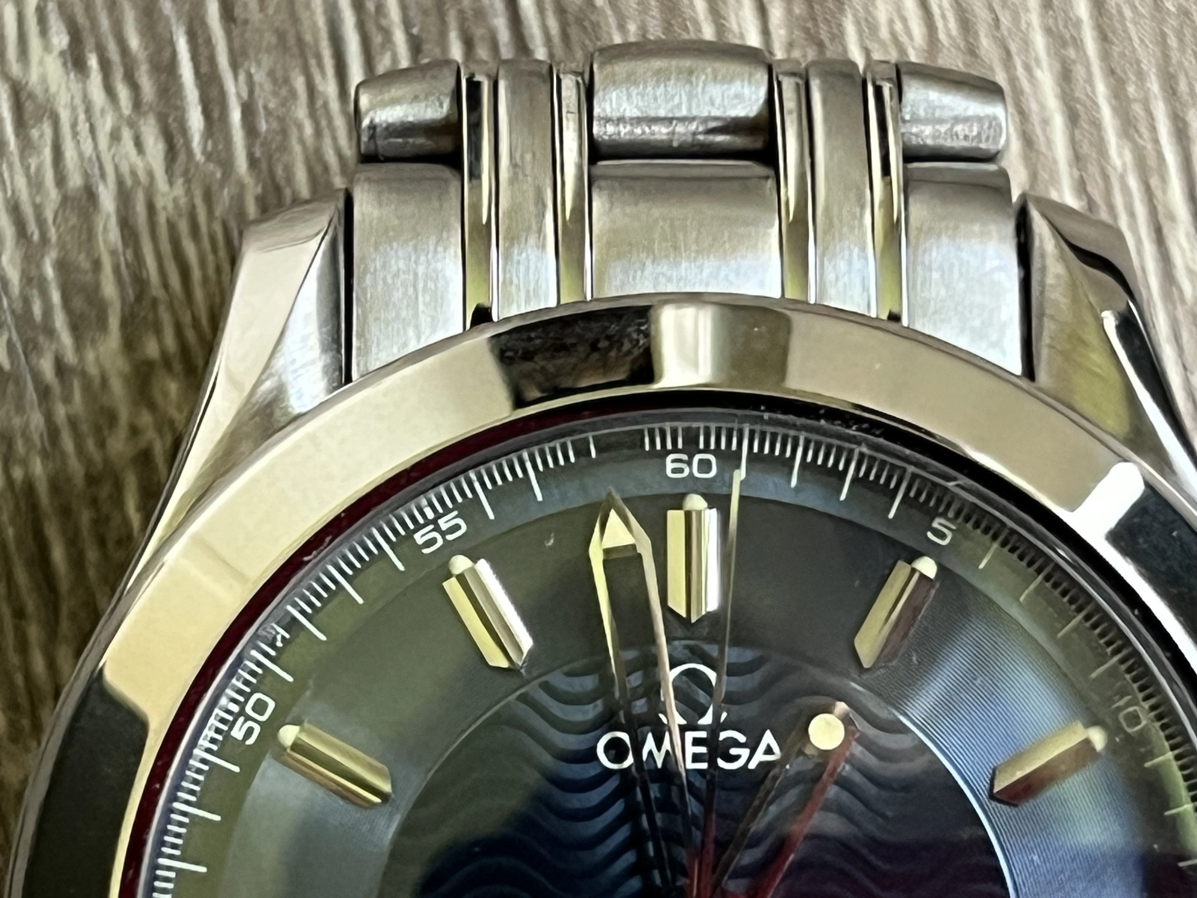 ·I have bought an Omega Seamaster 120M (ref. 2501.81) from 1996 on Chrono24 from a professional dealer. They have over 10 000 reviews and 4.9/5 in score. I bought it with the original box and a warranty card. The serial number on the card matches the serial number on the watch. It starts with 496. So far so good. When I got the watch, I first noticed something I hadn't noticed on the product photos. Some of the 1/5 second markings around the edge of the dial are missing (mostly around the 60-second mark). What I find strange, is that there is no residue or faded remnants where the markings should be. The markings immeditately next to the missing are in perfect condition. The watch itself doesn't look used. I have a hard time finding a single scratch. The box has discoloration and looks old. The dealer thinks it is age-related deterioration, but I want a second opinion just to be sure. How likely is it that the watch, including the dial, is authentic? What can be the cause behind the missing markers?