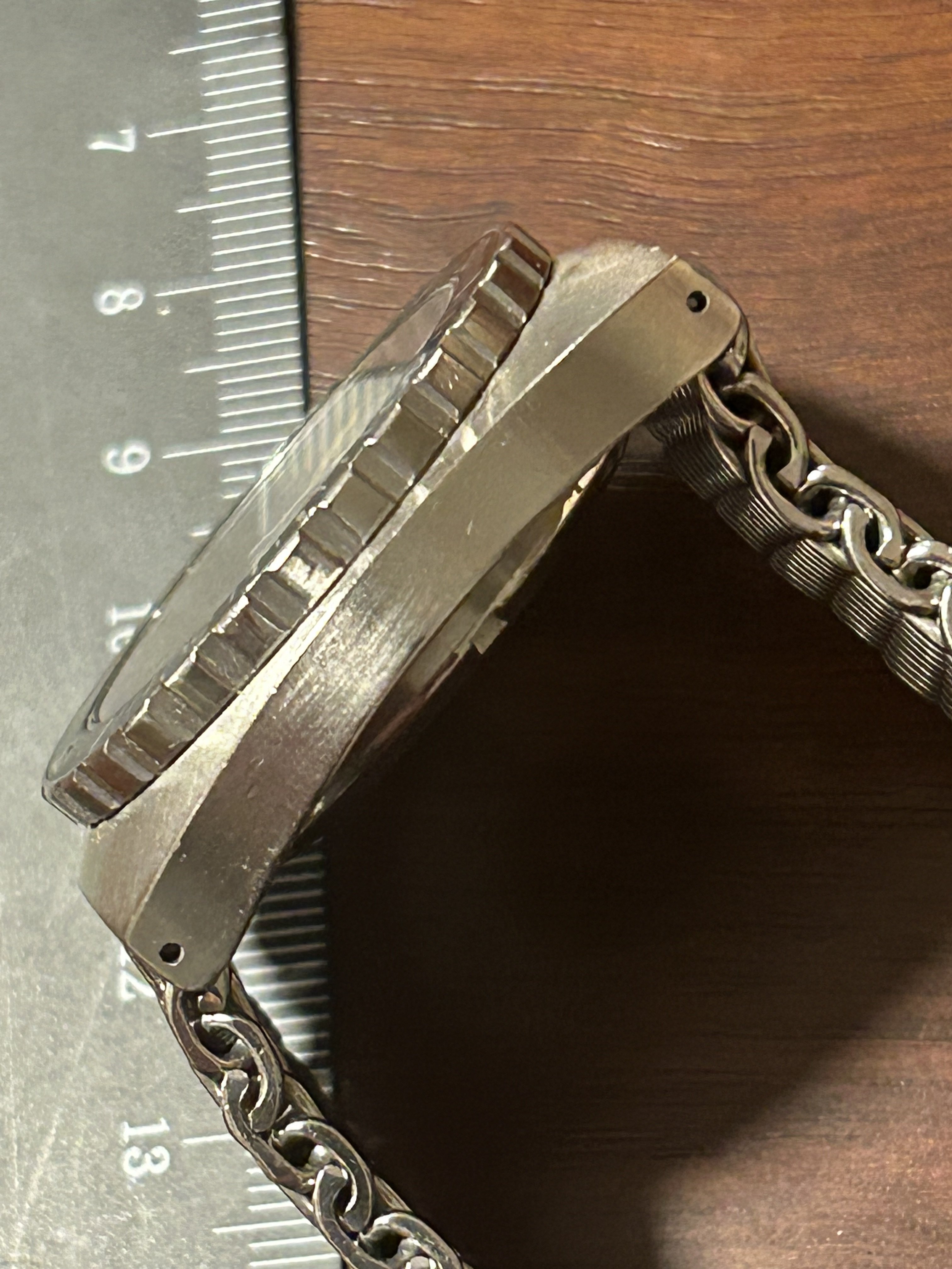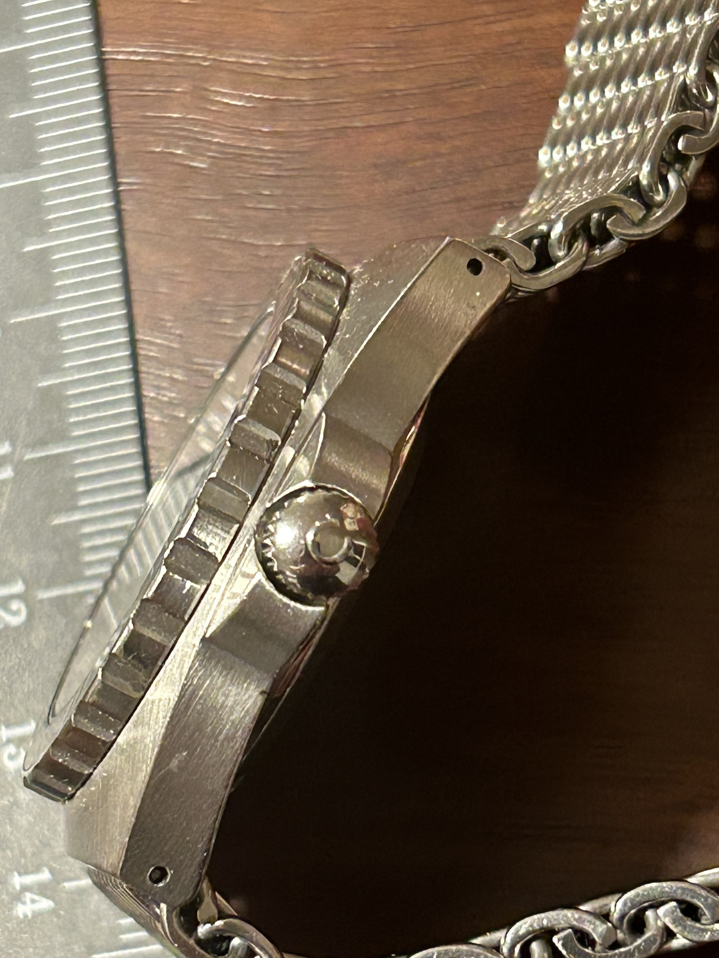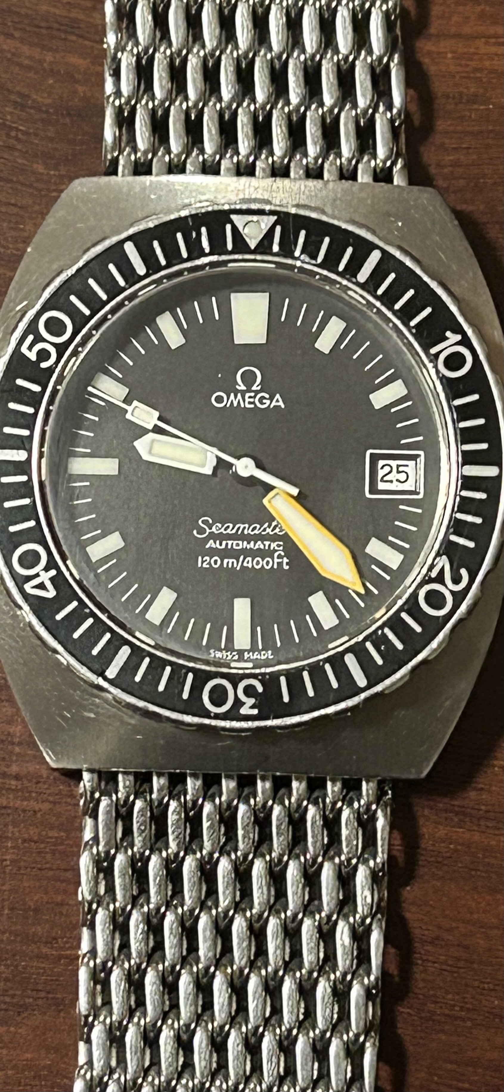 Omega's diver's model "Seamaster 120 ref.166.0250", nicknamed the "Baby Ploprof". The watch and case band is in very good condition with no nicks or case dents. Serviced to Omega specs.