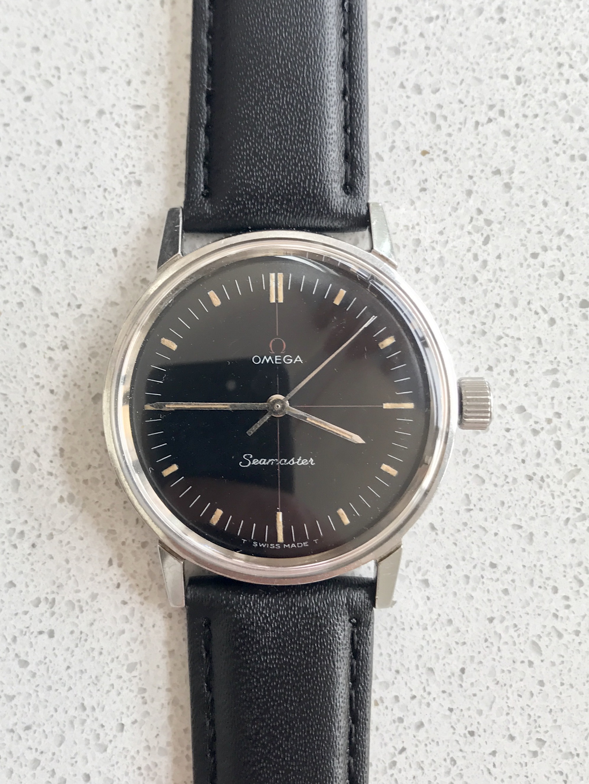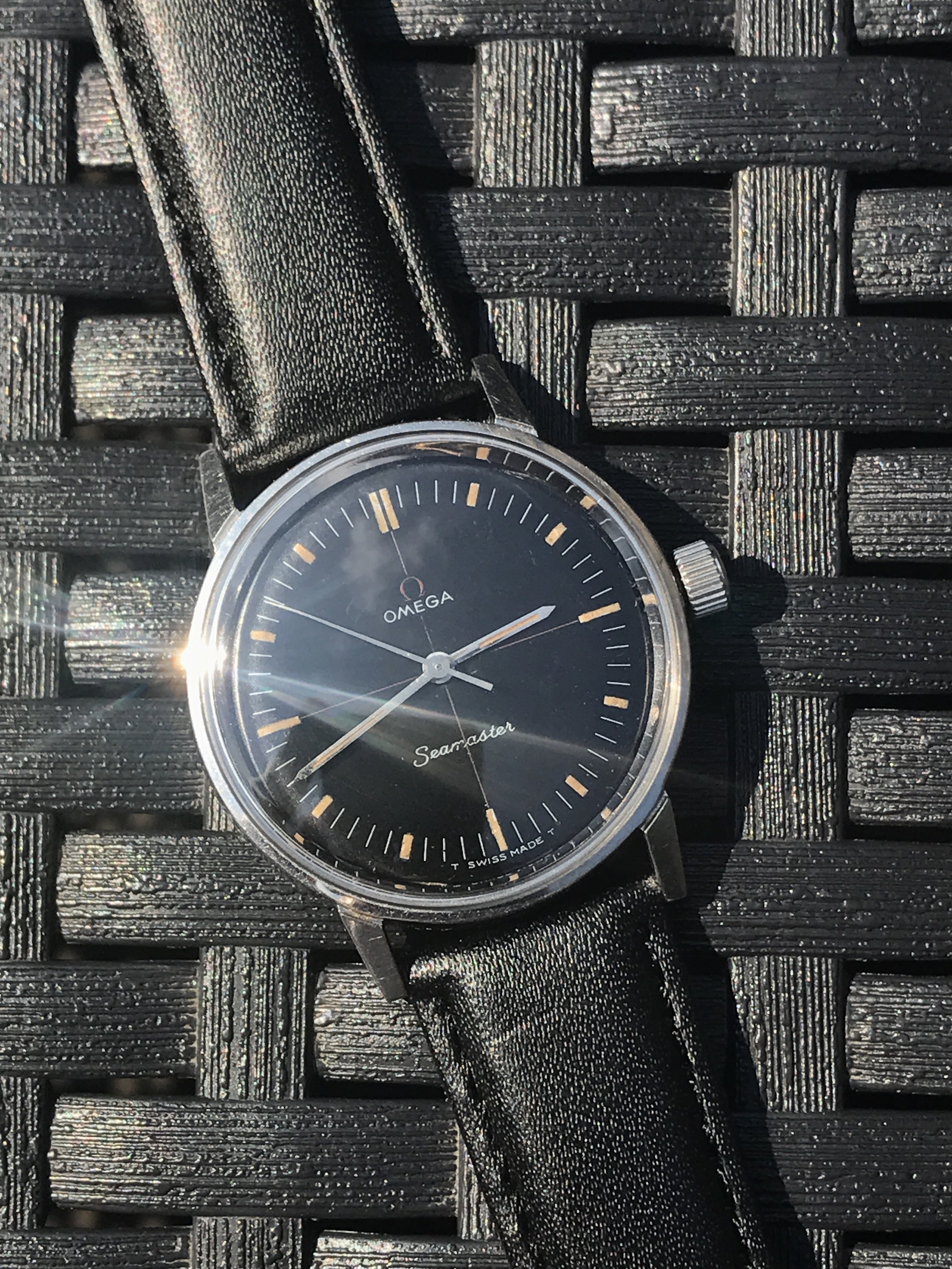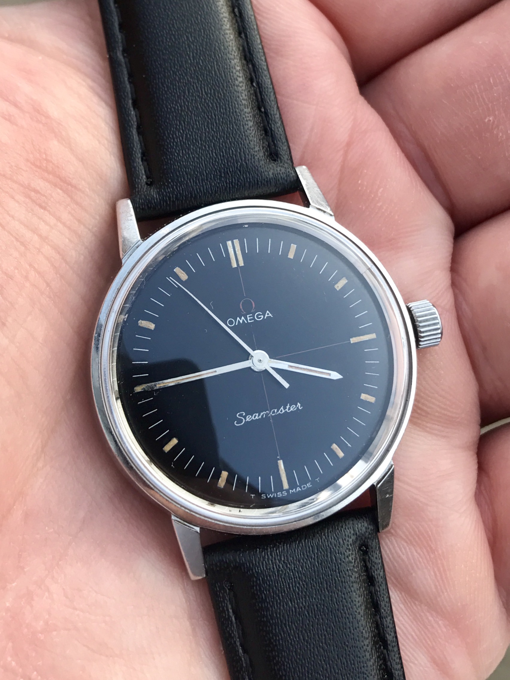 Dial - factory original black dial, not refinished or restored. Red Omega logo and crosshair. Evenly coloured lume which glows faintly under UV. Dial is not perfect with light scratch at 11 and a couple of marks around the centre. These are not particularly visible when worn. I've included several pictures of the dial under various lighting conditions to highlight these. Correct steel hands with matching lume.