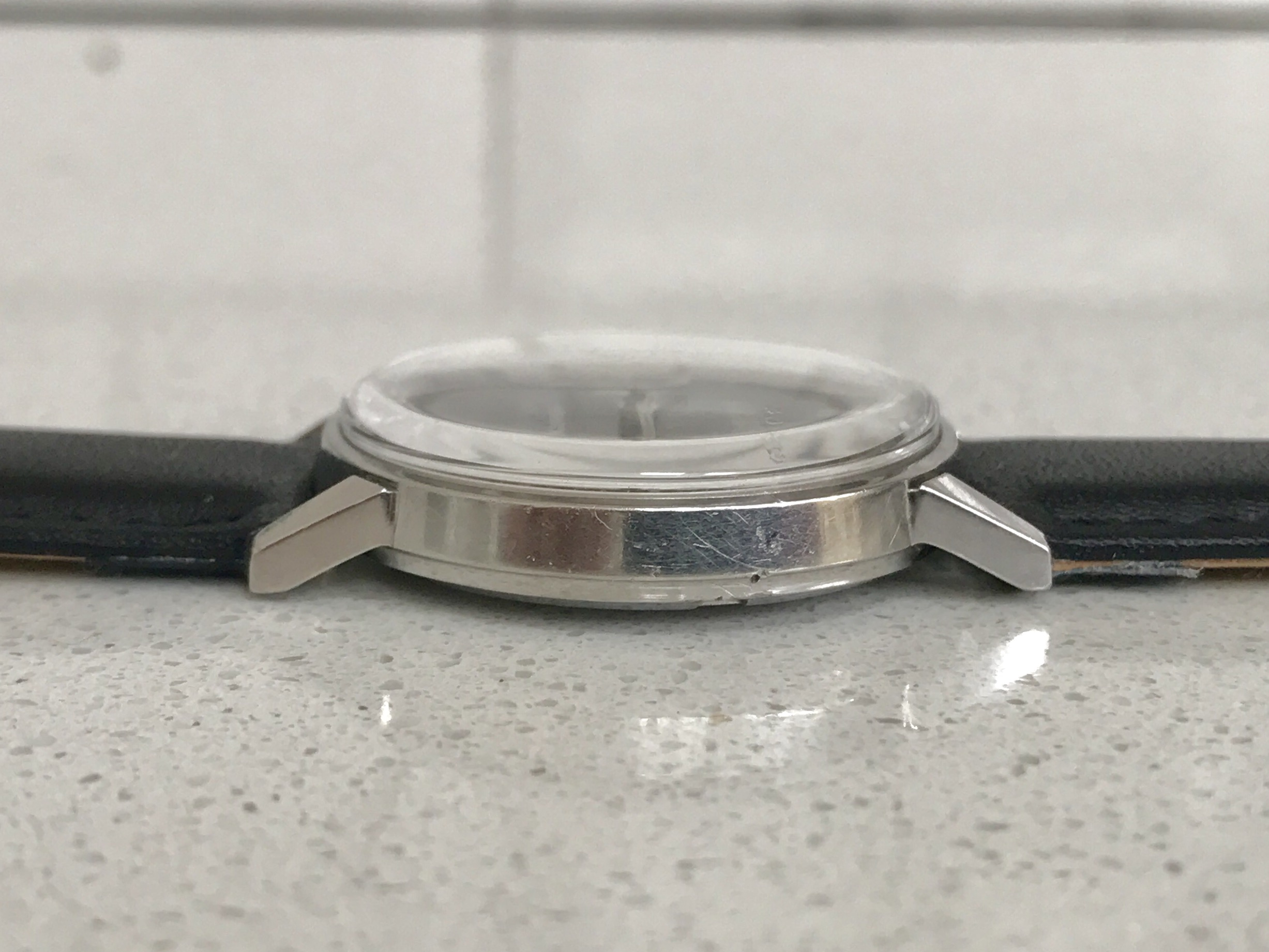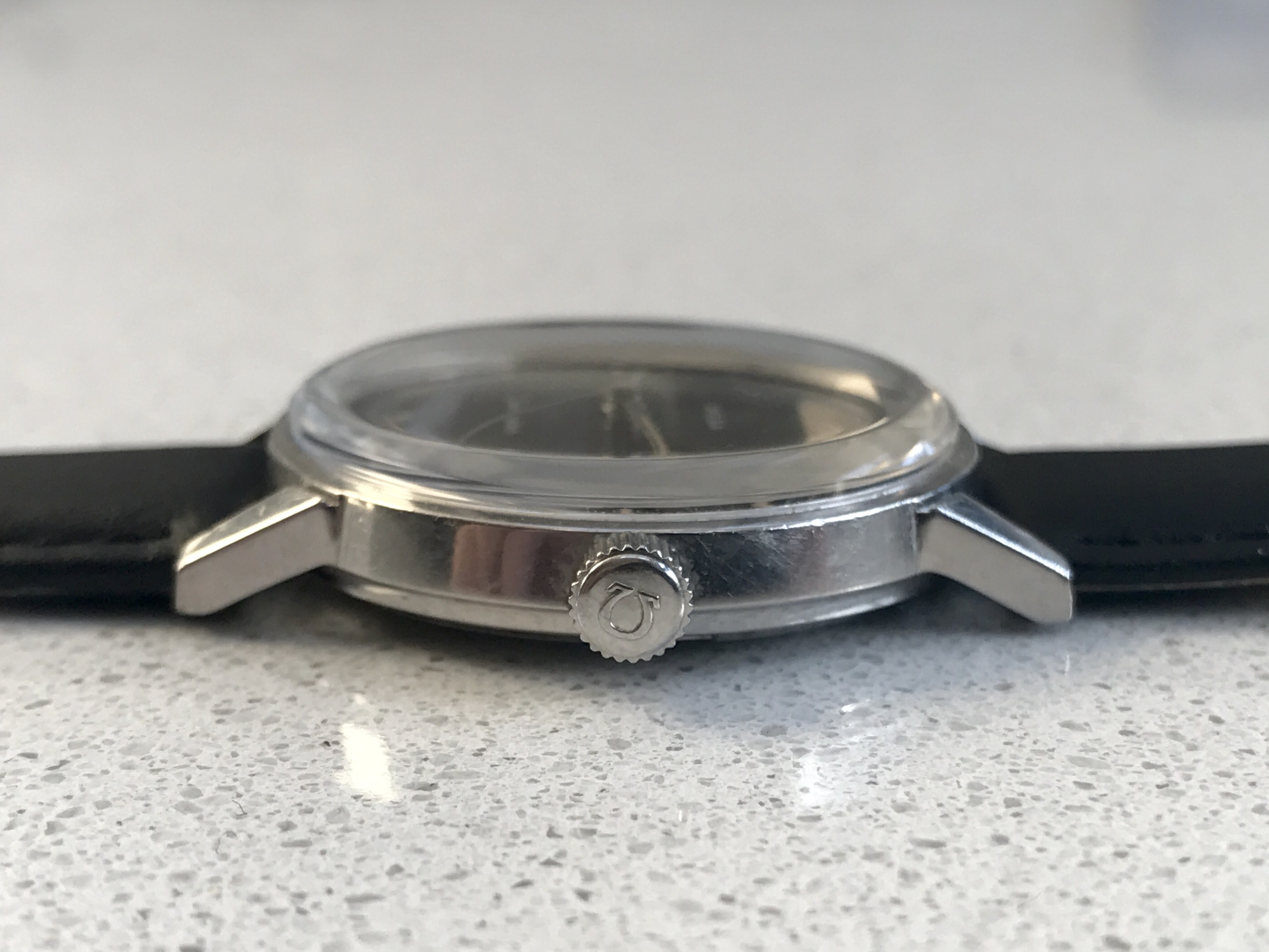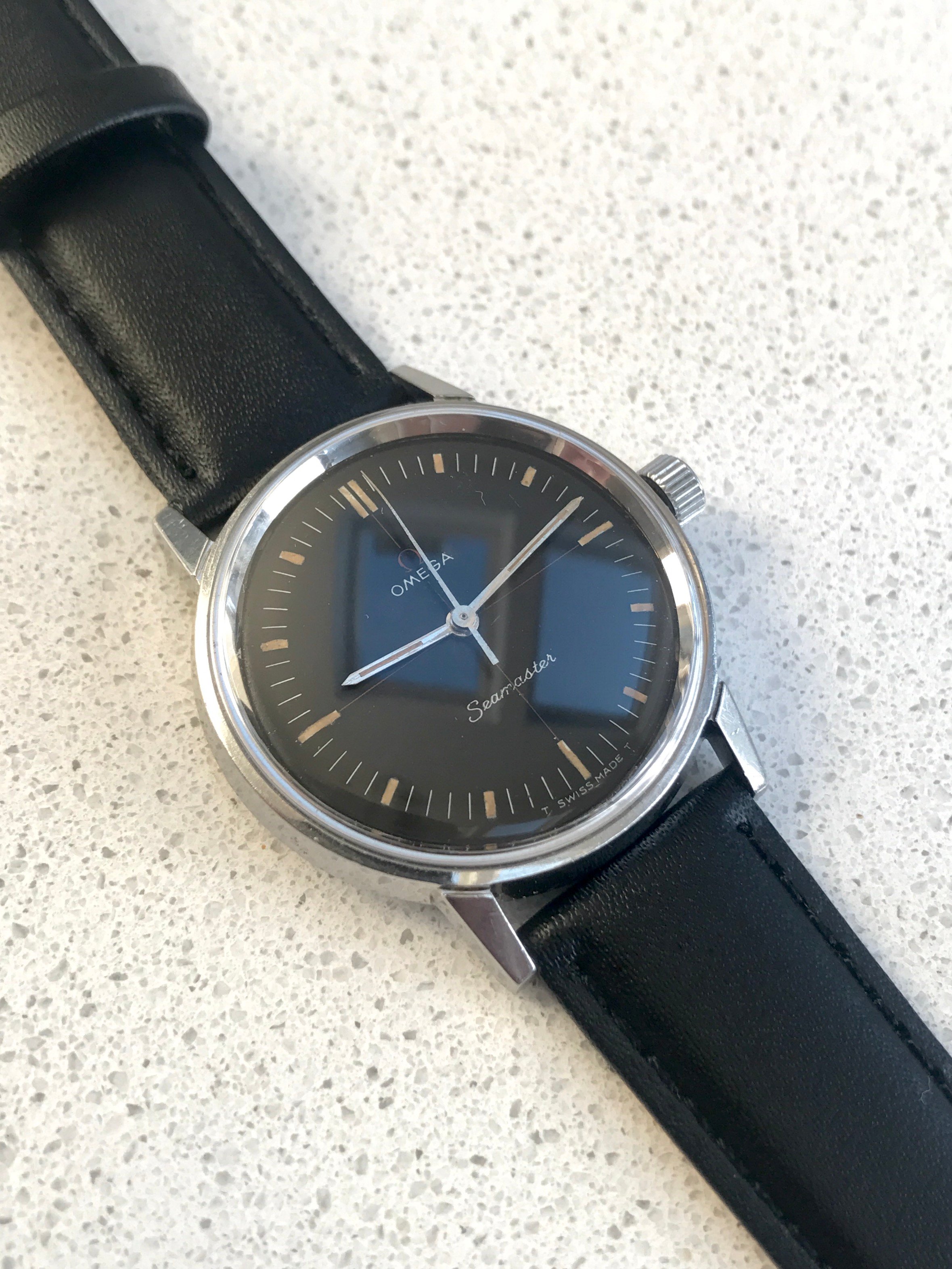 Dial - factory original black dial, not refinished or restored. Red Omega logo and crosshair. Evenly coloured lume which glows faintly under UV. Dial is not perfect with light scratch at 11 and a couple of marks around the centre. These are not particularly visible when worn. I've included several pictures of the dial under various lighting conditions to highlight these. Correct steel hands with matching lume.