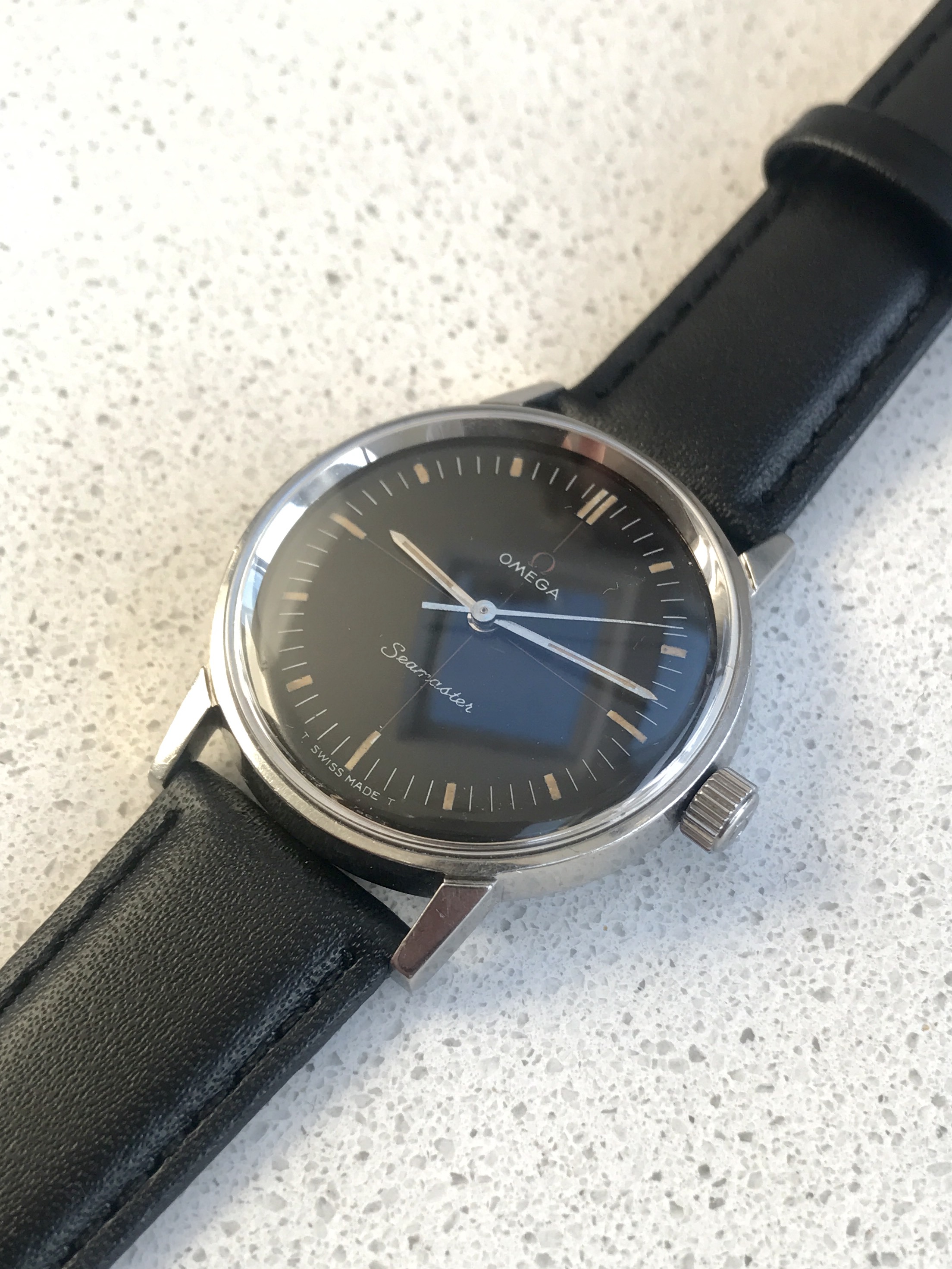 These 'technic' dialed Seamasters are not that easy to find and this one has a great look with the black dial, red crosshair and orange lume combining to create a really attractive example.