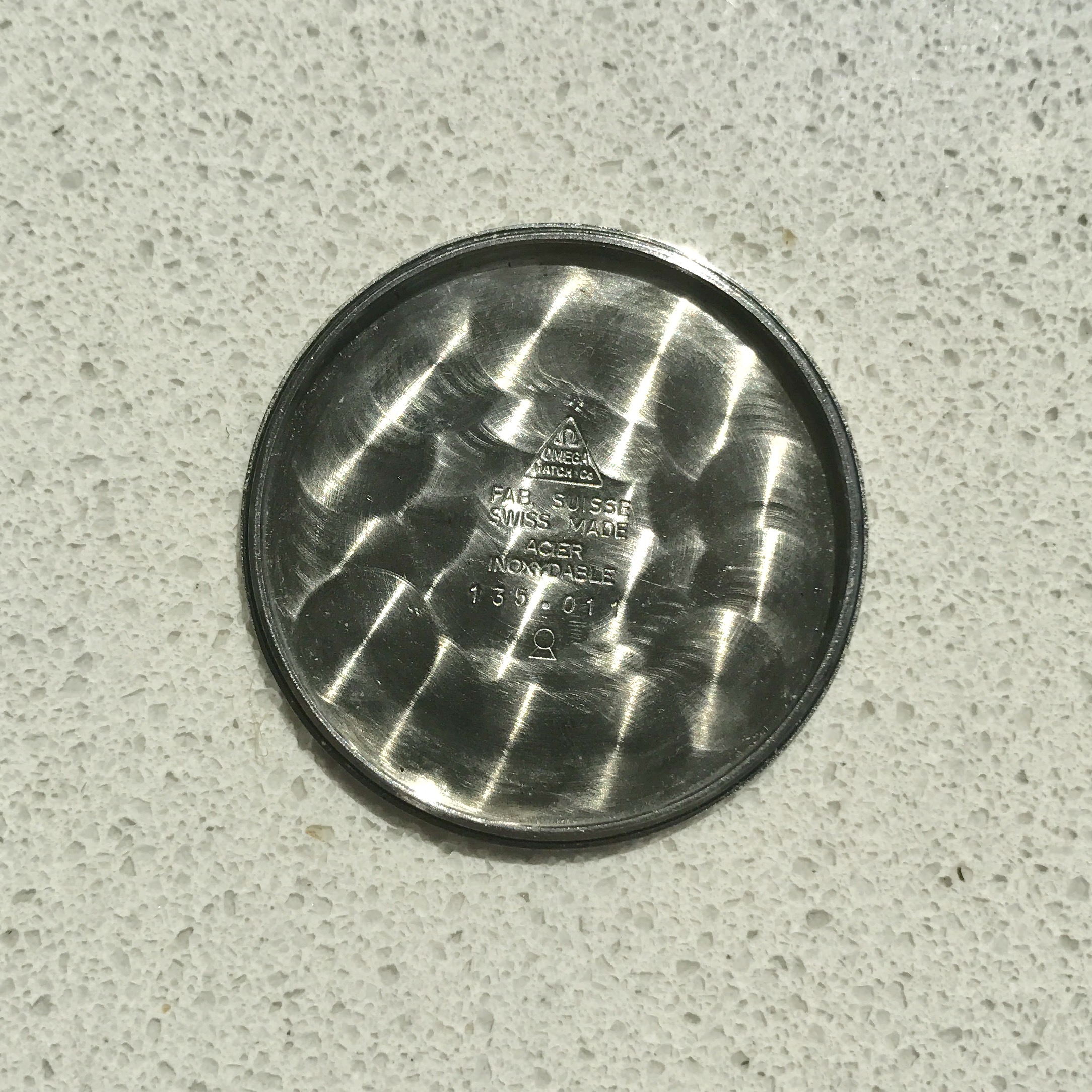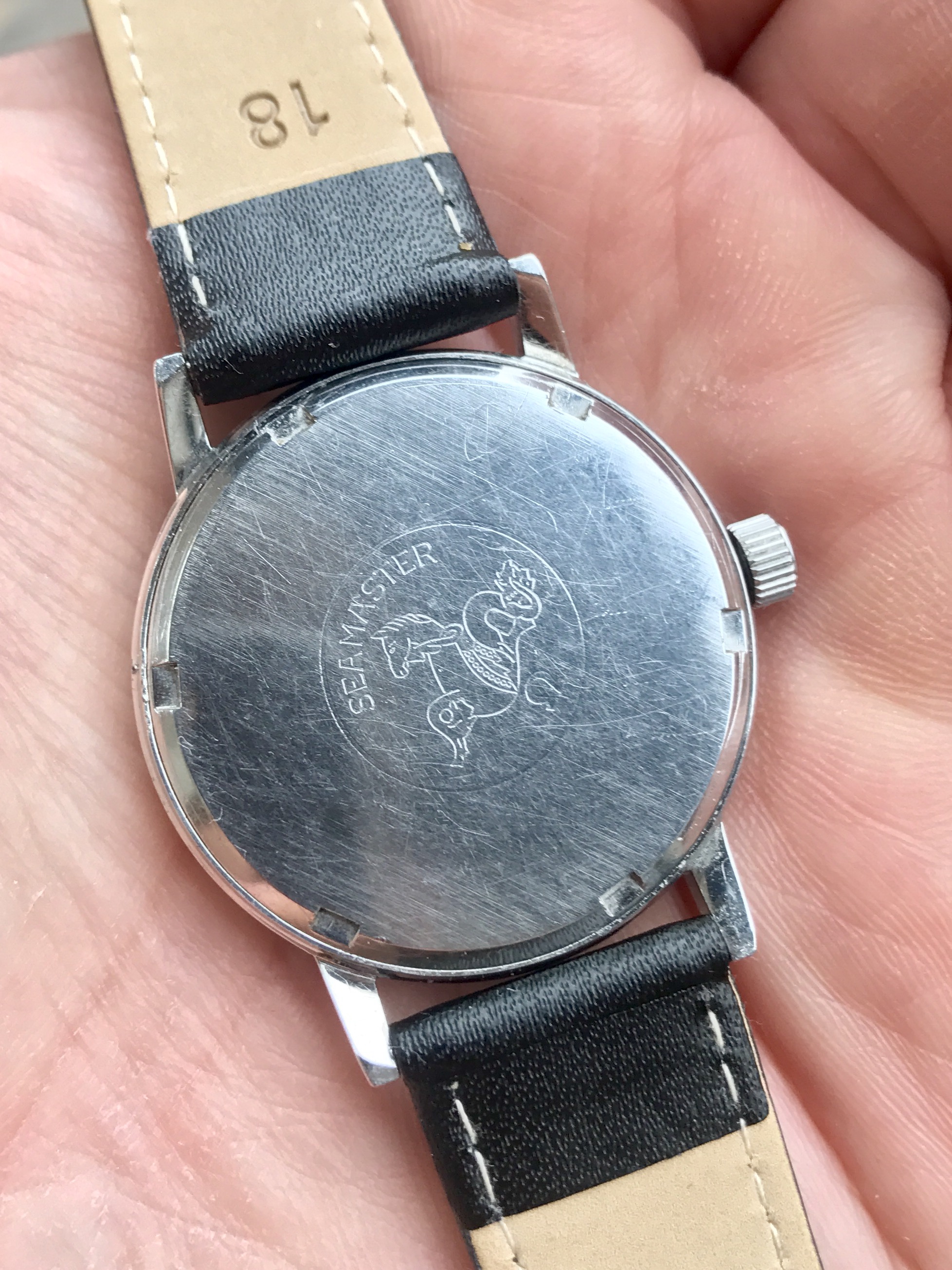 Case - 34mm stainless steel case ref 135.011, with Seamaster caseback. In good condition, with sharp edges and bevels. Has some surface scratches and the crown is an Omega service item.