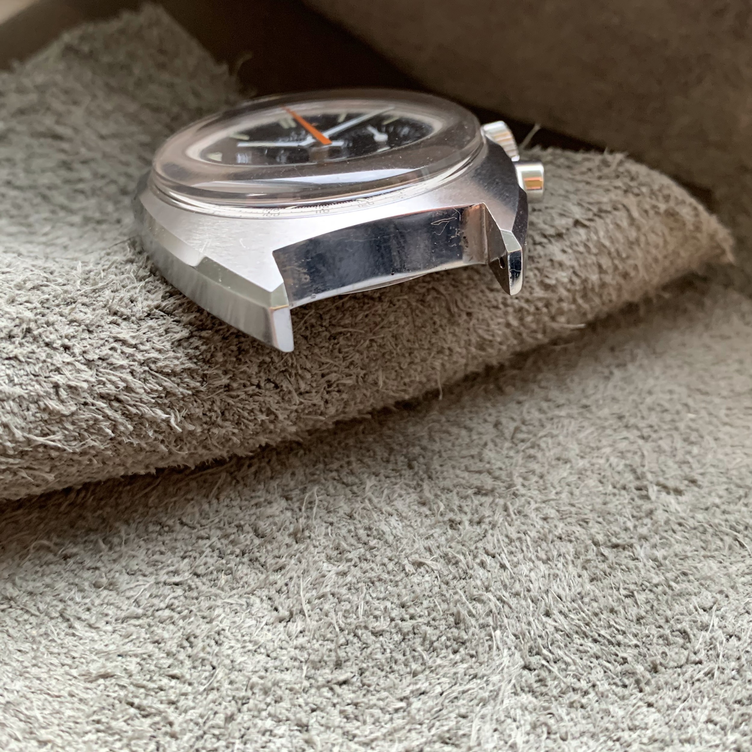 The case in my humble opinion is unpolished with all factory finishes and surfaces intact. There are some micro-swirls and a few hairline scratches, but overall its absolutely mint and just killer on the wrist.