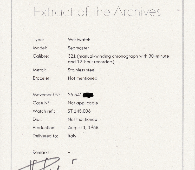 According to the Extract from Omega Archives the watch was produced on 1 August 1968 and delivered to Switzerland. Which is odd, as that is National Swiss Day ...