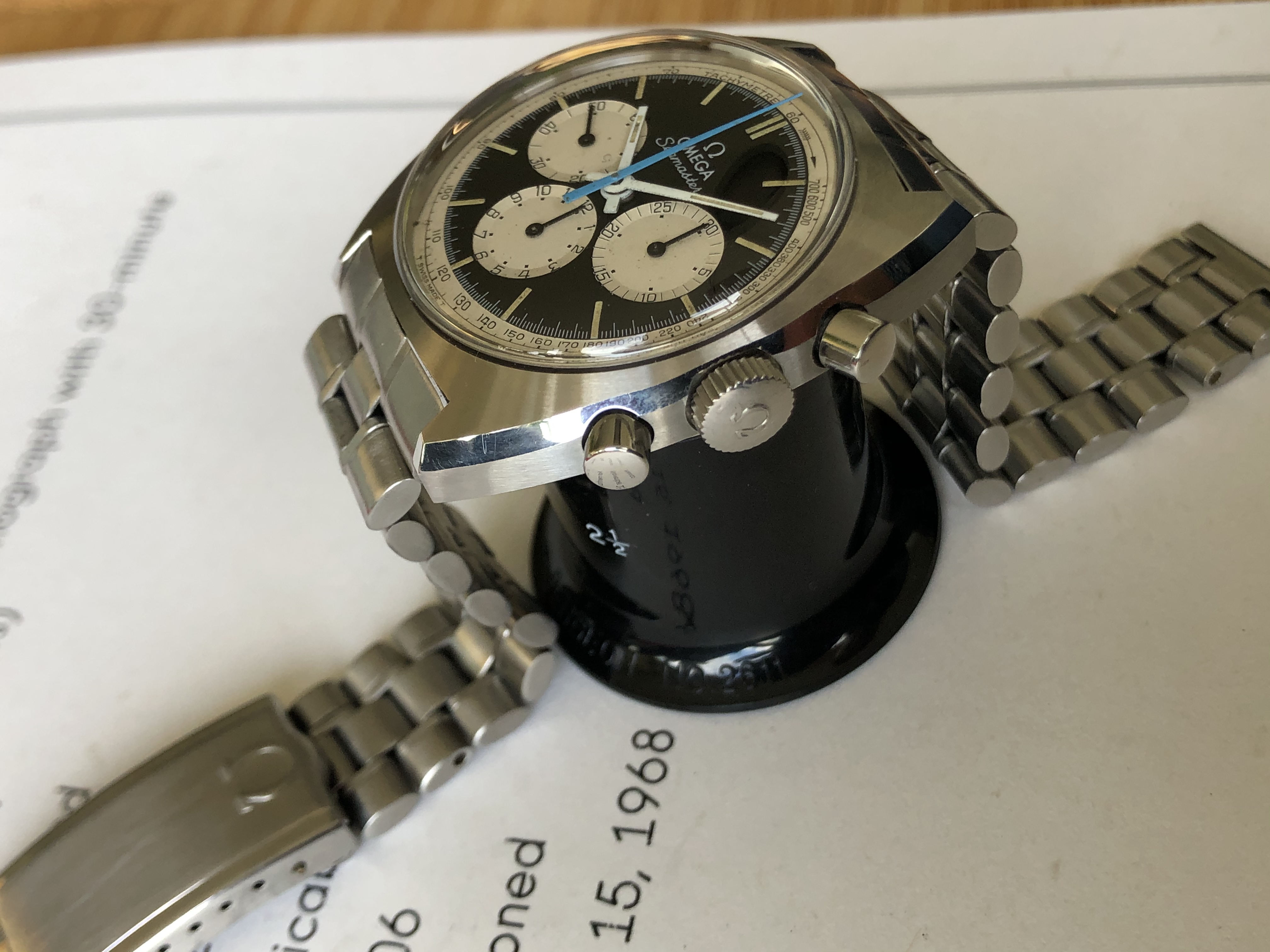 The dial has no damage and the lume (obviouly tritium) is intact. The hands also have a tritium lume and present a beautiful patina. A part of the lume track on the hour hand fell off - I am not a relume guy so I don't touch that. Considering the small lume surface, I think it's an easy thing to have this done but I wouldn't. The blue chrono hand is original on the 321 on the late 321 variations like this one, some additional charm.