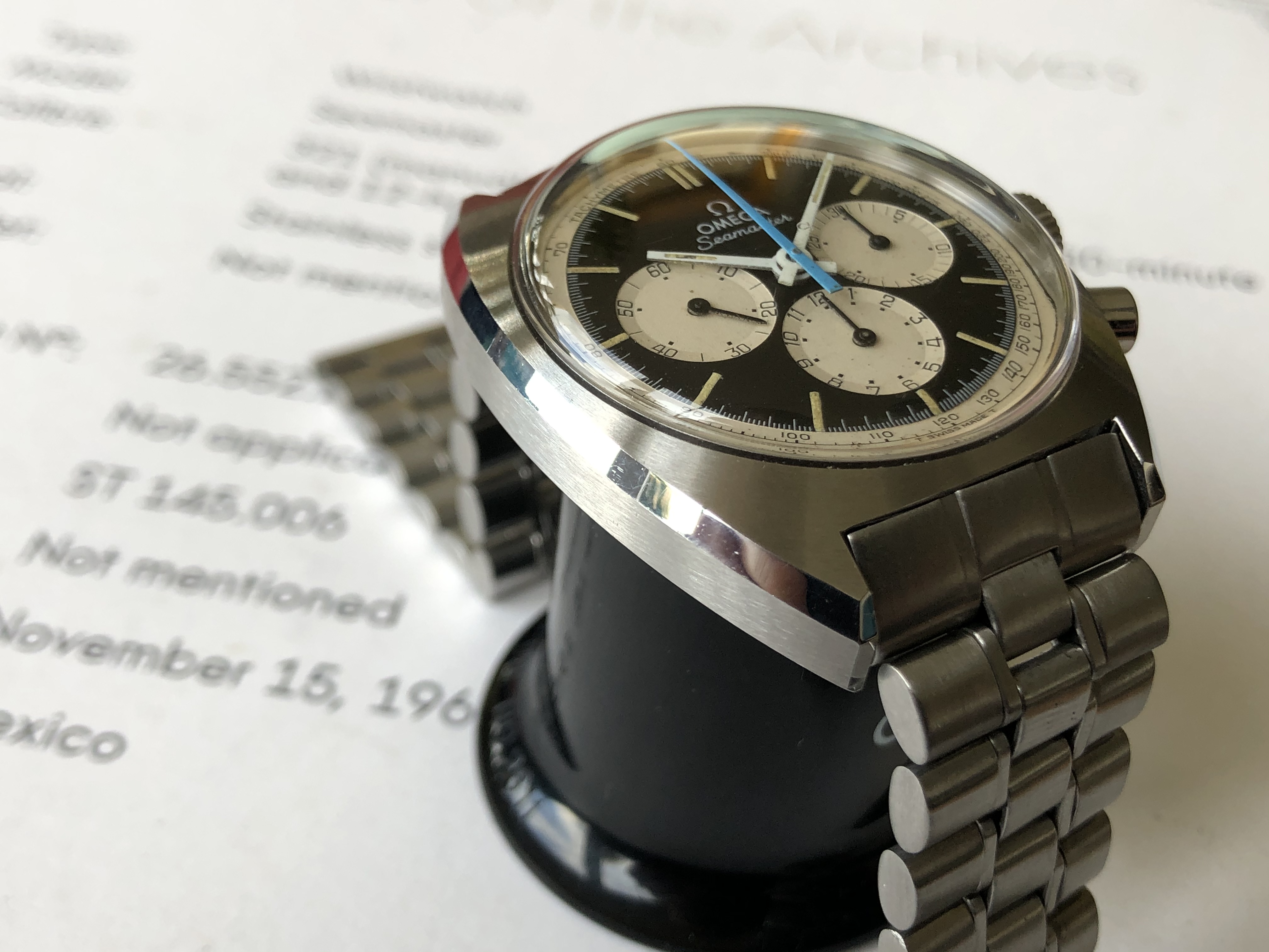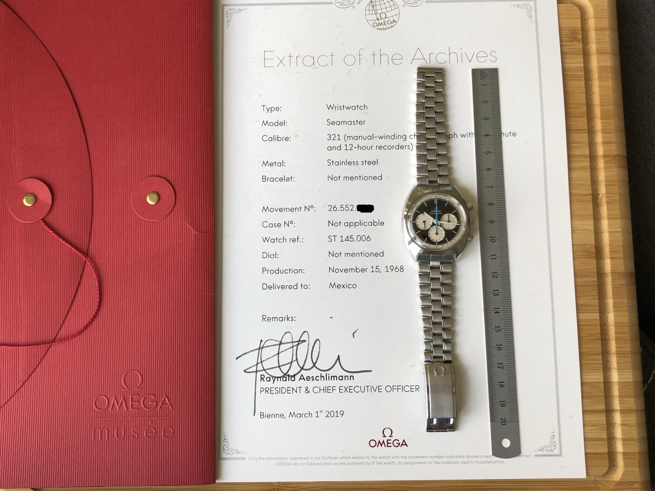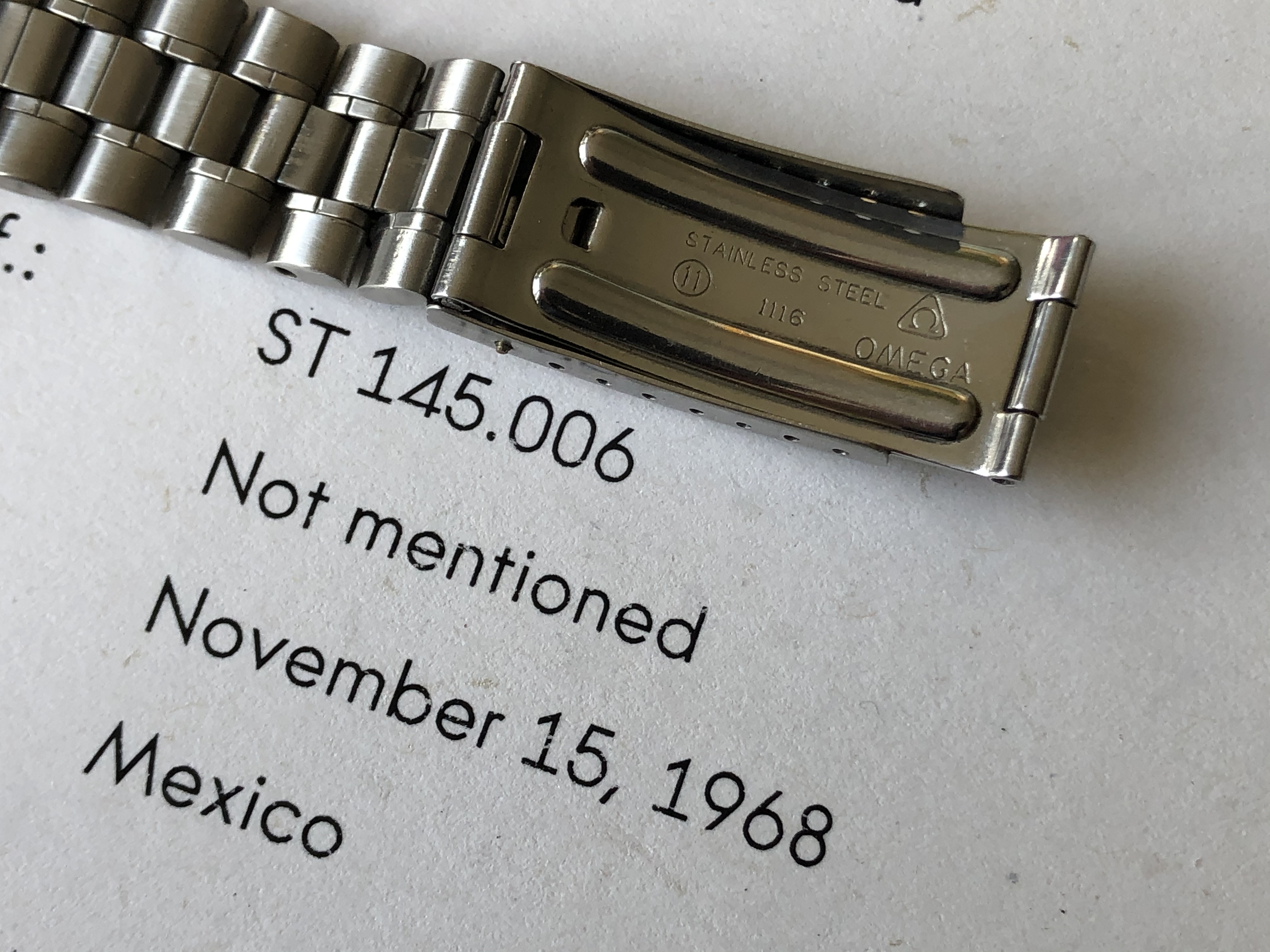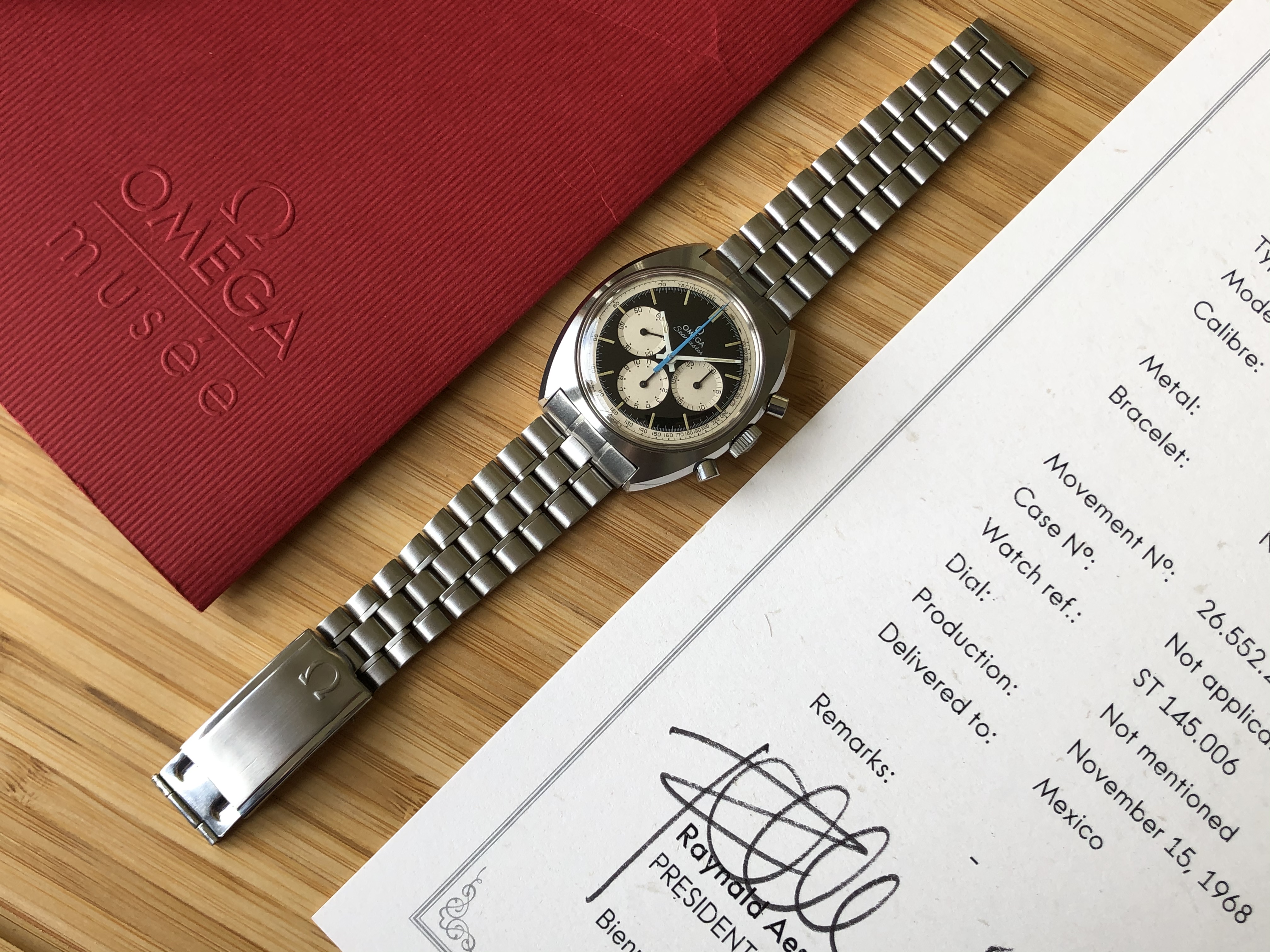 According to the Extract from Omega Archives, the watch was produced on November 15, 1968 and delivered to Mexico.