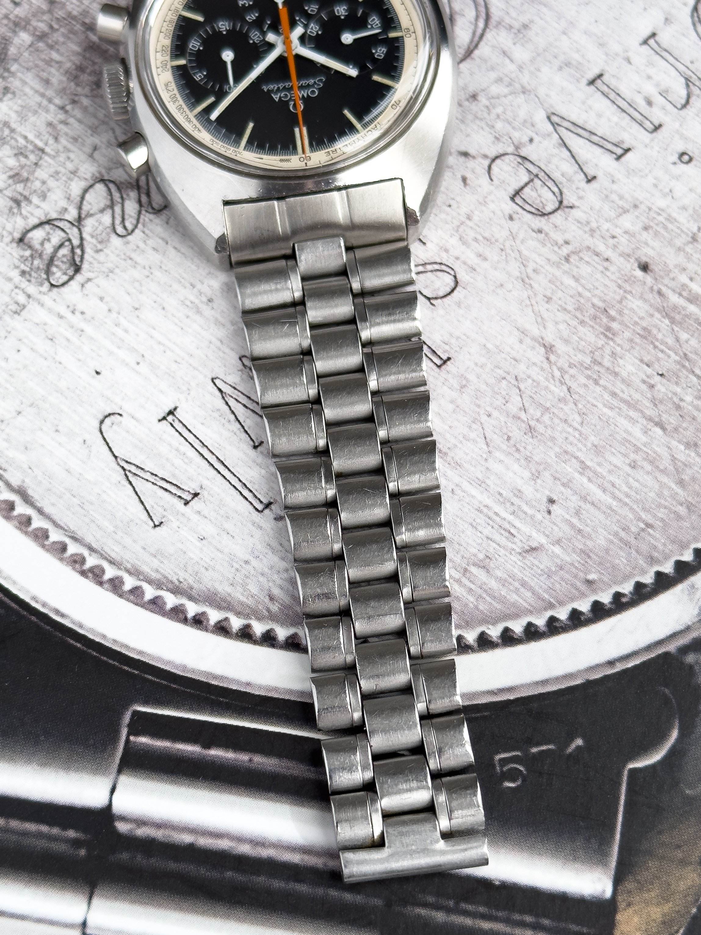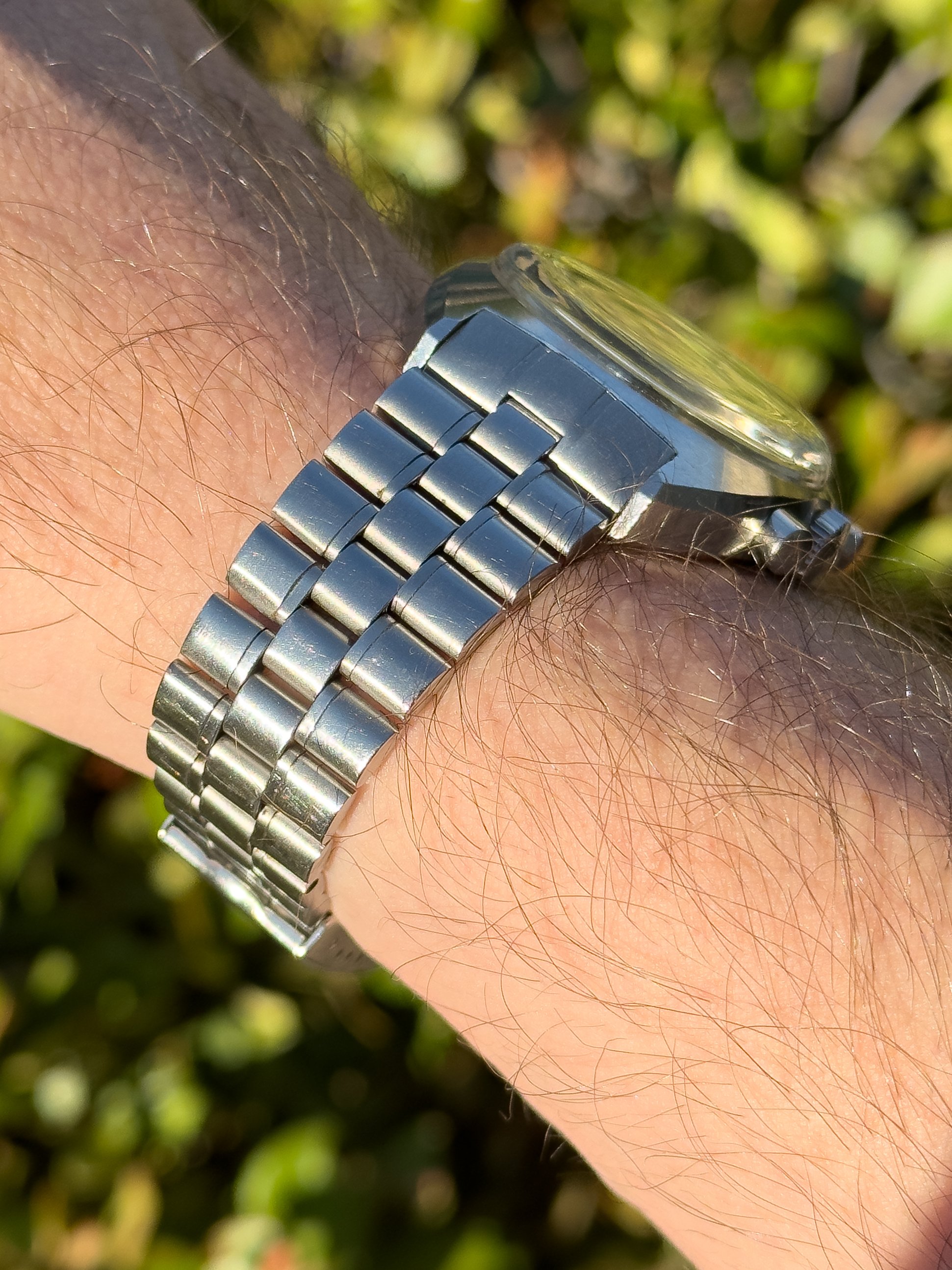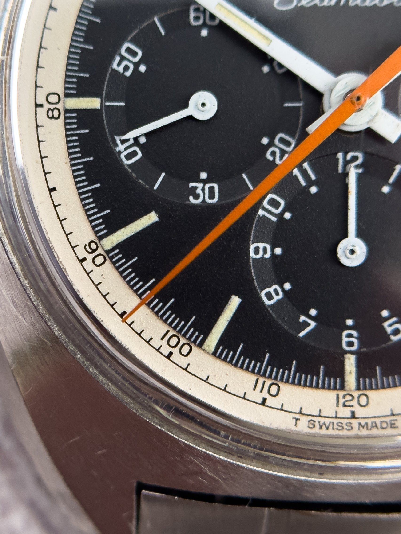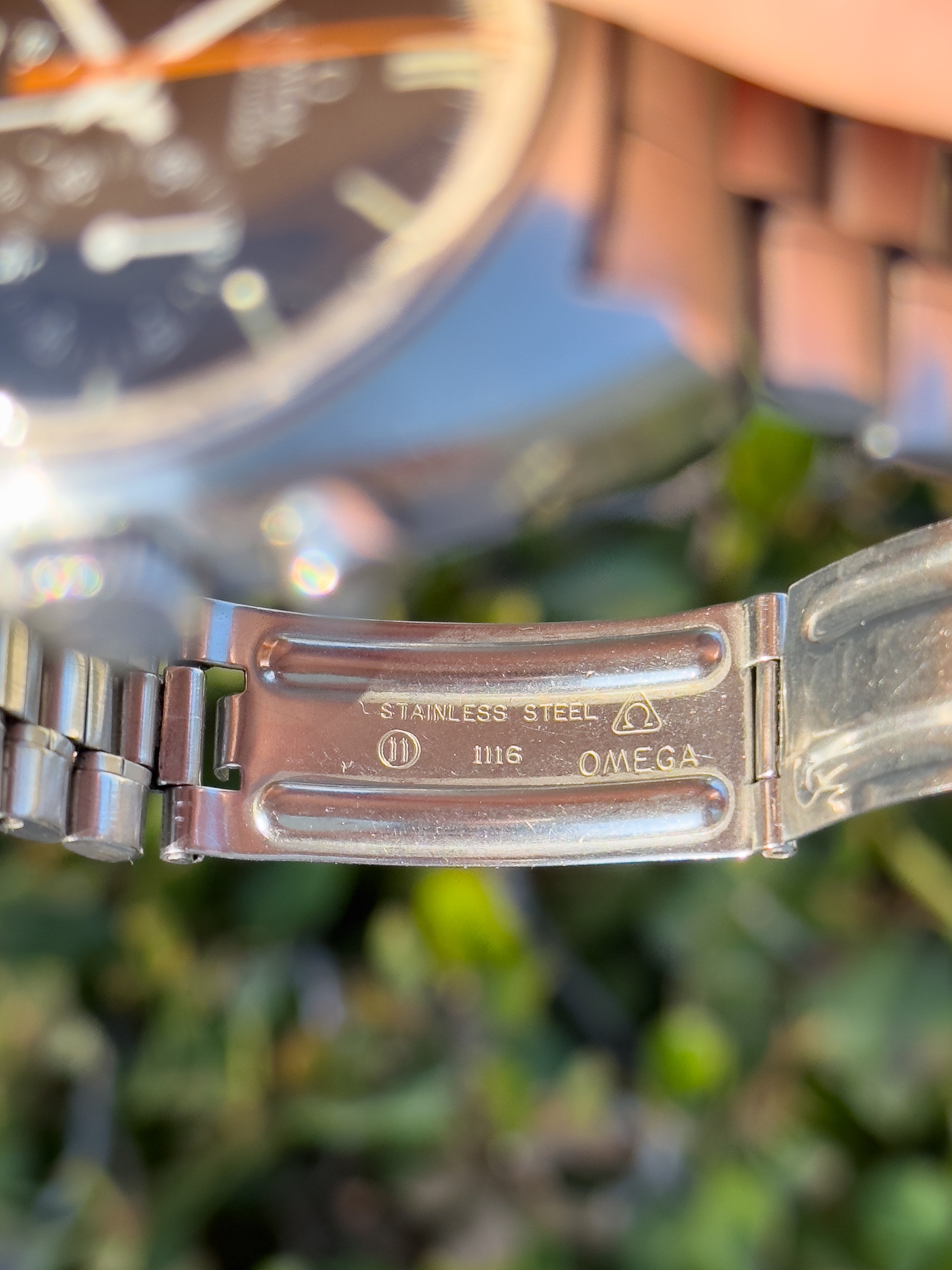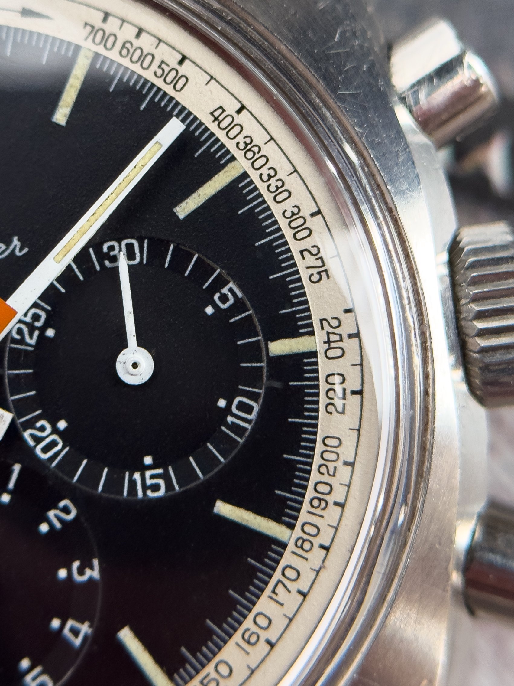Overall this piece is in very good condition and it is such a joy to wear. As you can see from the original listing, it was serviced in 2021 and while I don't have physical proof of this, the movement is clean and everything operates as you would expect. I have worn this daily for extended periods of time and this watch has always kept time very well and has a healthy power reserve under full wind. I can't say this is unpolished as I have not owned this watch since it was first sold; however, I can say that it retains its original shape with sharp lines and chamfers. I can faintly see remnants of the original brushing but it has been "polished" down from use over time. The case does show wear that is commensurate with age. The 1116/548 bracelet is correct for this reference and has more than enough length for my 7.25" wrist. It even has plenty of room to spare as I wear it four micro adjust holes in from the edge of the clasp. Back to the watch- the crystal is signed, intact, clean and in great shape. If anything, the crystal could benefit from a slight polish. The black dial is beautiful and well preserved. Any shadows seen in the outdoor wrist shots are just that- shadows from the superficial marks on the crystal. The outer white tachymetre ring is well preserved and has a lovely almost parchment tone to it. The original tritium lume on the dial and hands is intact and has patinated to a beautiful soft custard color that is really pleasing to look at. The crown and movement wind smoothly and the pushers have a pleasing tactile action when pressed. That is everything I can think of but if you have any questions, please do ask.