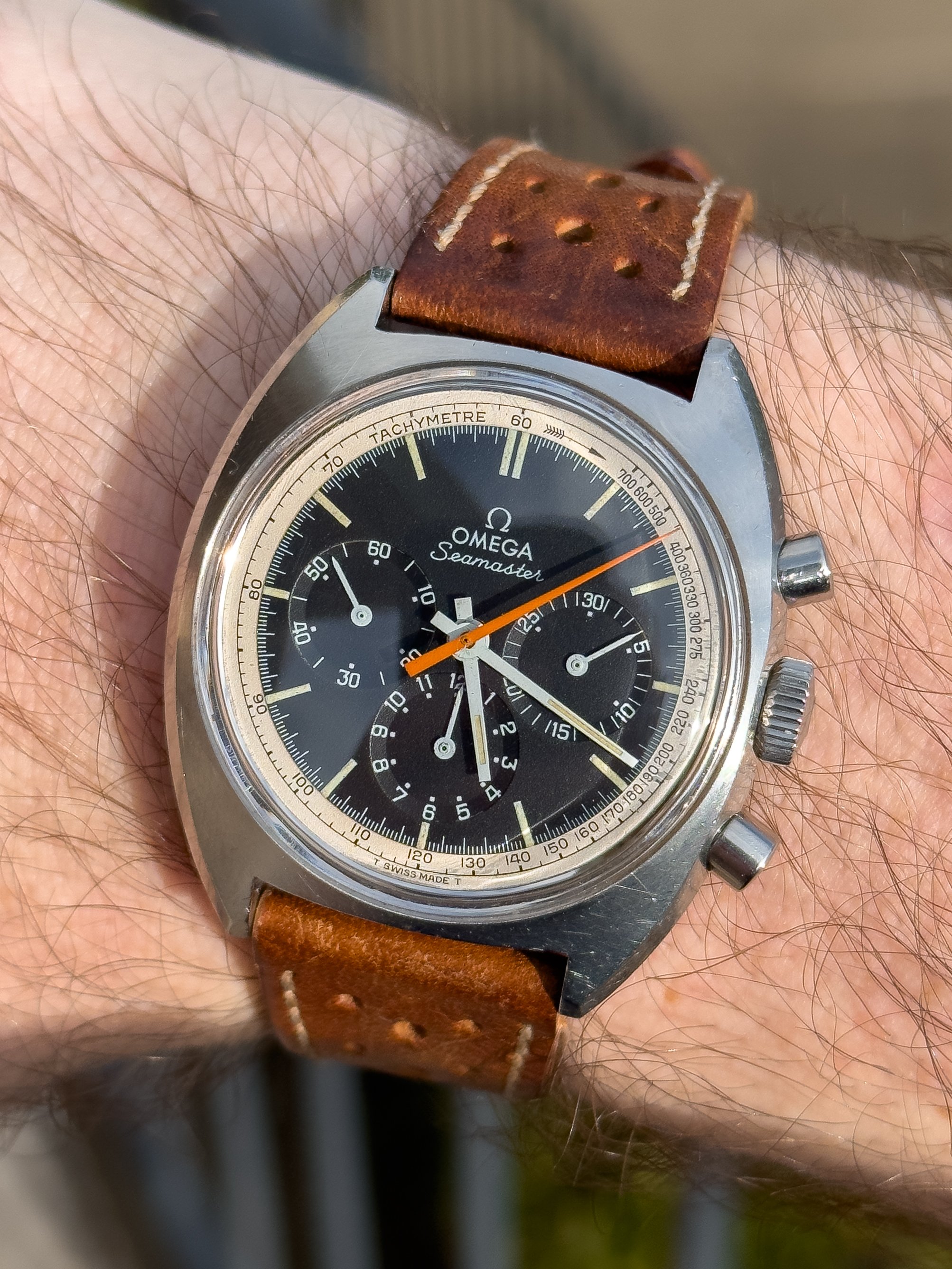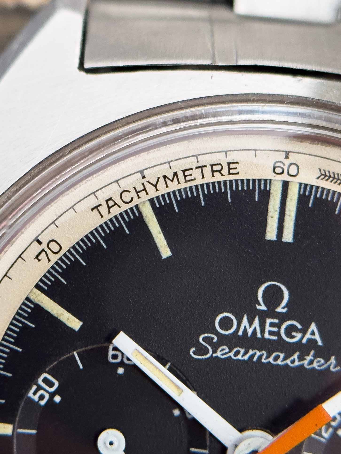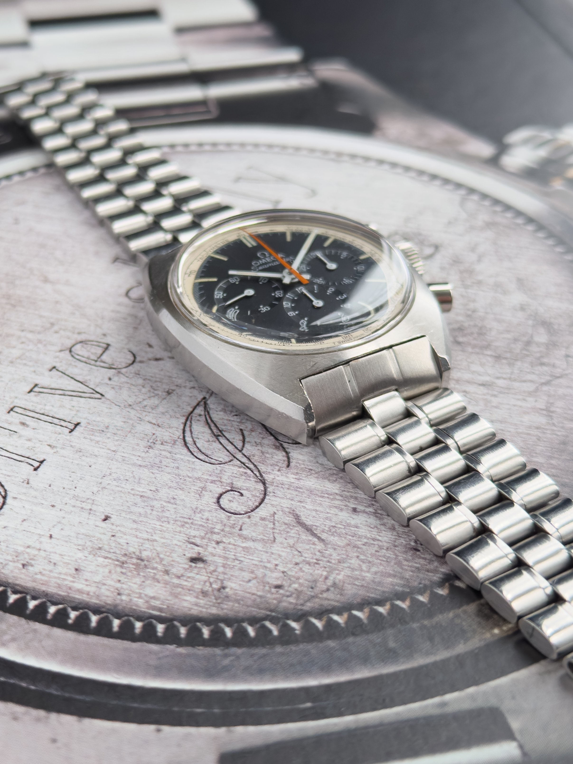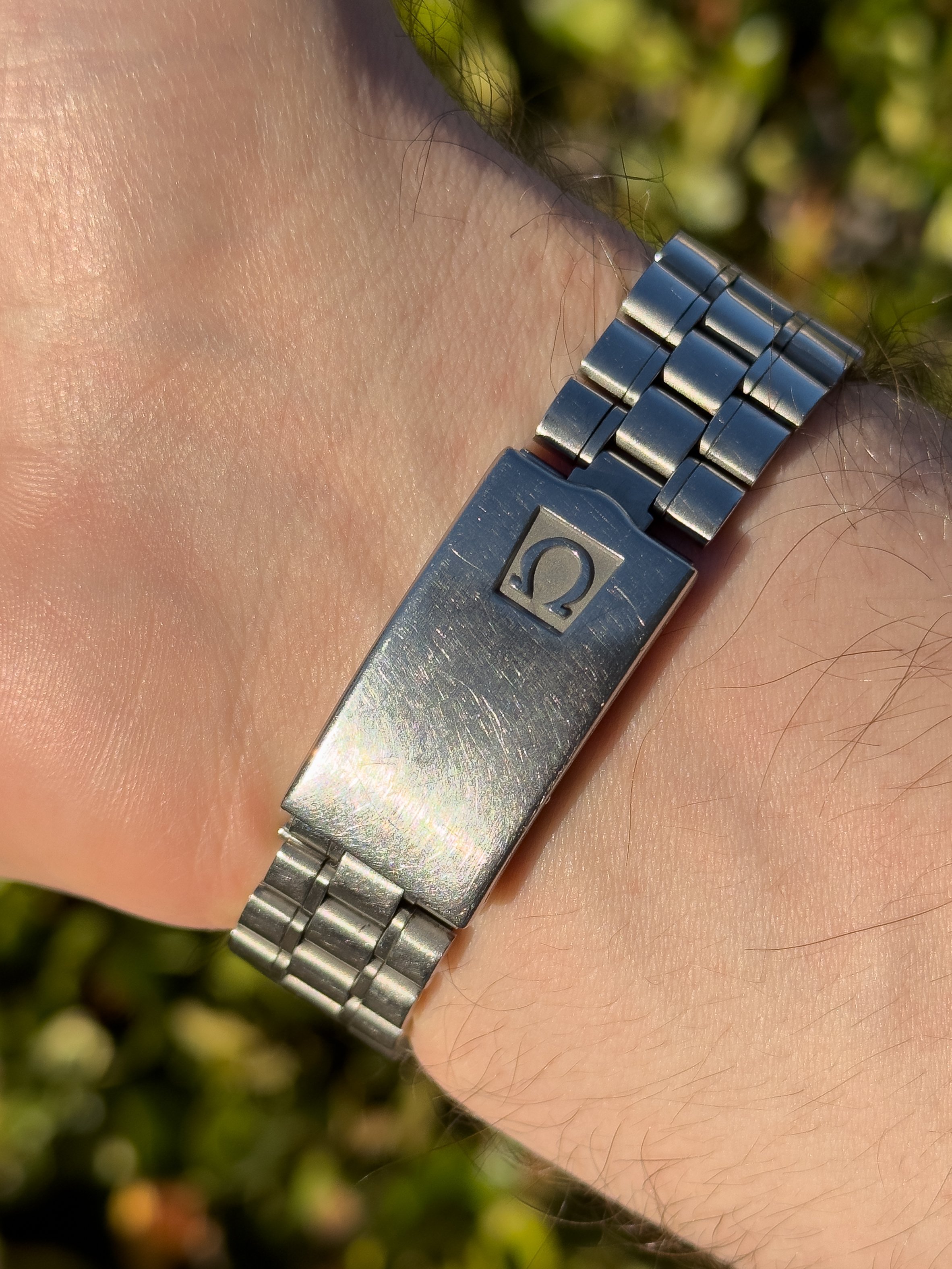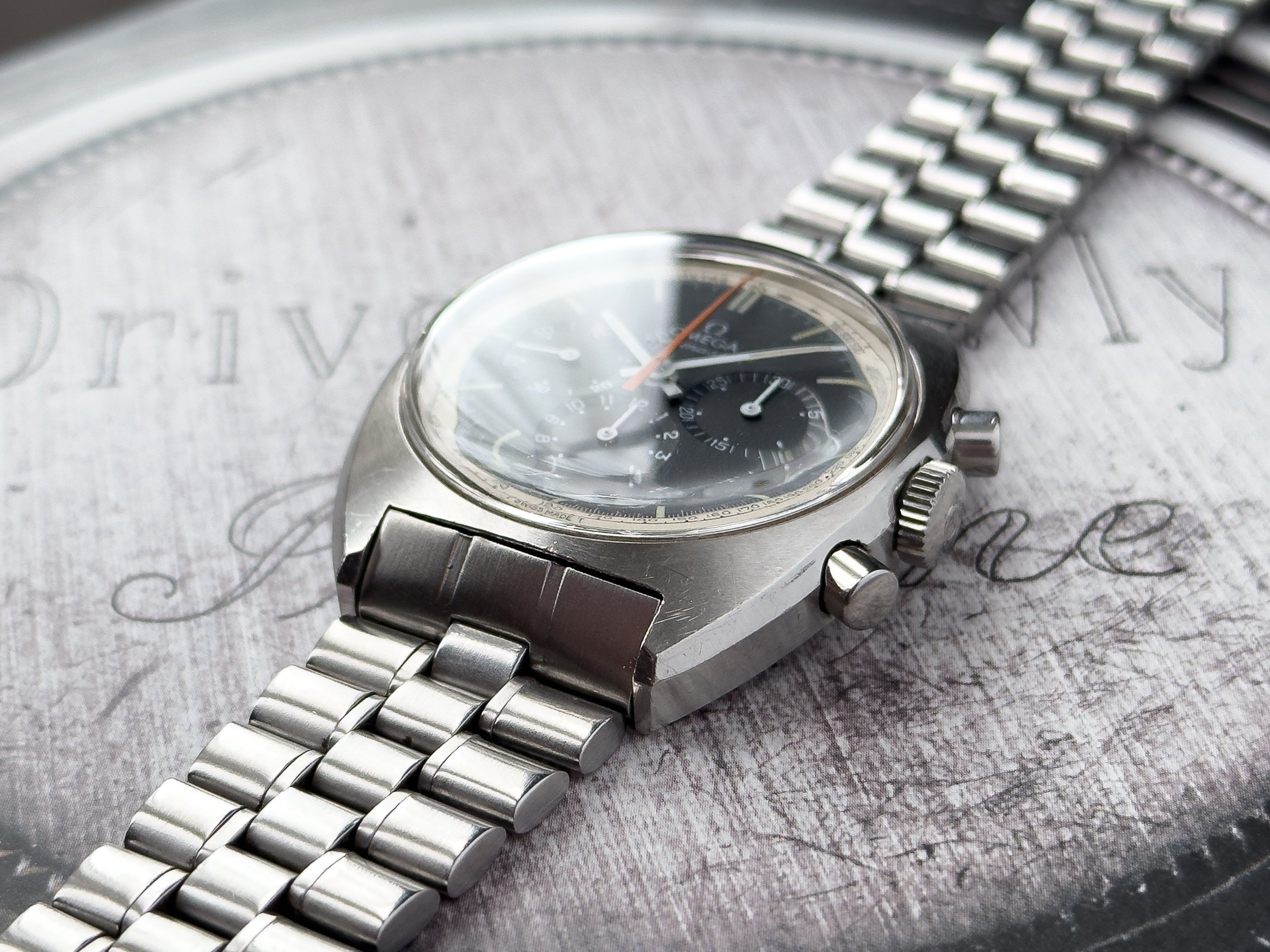 Overall this piece is in very good condition and it is such a joy to wear. As you can see from the original listing, it was serviced in 2021 and while I don't have physical proof of this, the movement is clean and everything operates as you would expect. I have worn this daily for extended periods of time and this watch has always kept time very well and has a healthy power reserve under full wind. I can't say this is unpolished as I have not owned this watch since it was first sold; however, I can say that it retains its original shape with sharp lines and chamfers. I can faintly see remnants of the original brushing but it has been "polished" down from use over time. The case does show wear that is commensurate with age. The 1116/548 bracelet is correct for this reference and has more than enough length for my 7.25" wrist. It even has plenty of room to spare as I wear it four micro adjust holes in from the edge of the clasp. Back to the watch- the crystal is signed, intact, clean and in great shape. If anything, the crystal could benefit from a slight polish. The black dial is beautiful and well preserved. Any shadows seen in the outdoor wrist shots are just that- shadows from the superficial marks on the crystal. The outer white tachymetre ring is well preserved and has a lovely almost parchment tone to it. The original tritium lume on the dial and hands is intact and has patinated to a beautiful soft custard color that is really pleasing to look at. The crown and movement wind smoothly and the pushers have a pleasing tactile action when pressed. That is everything I can think of but if you have any questions, please do ask.