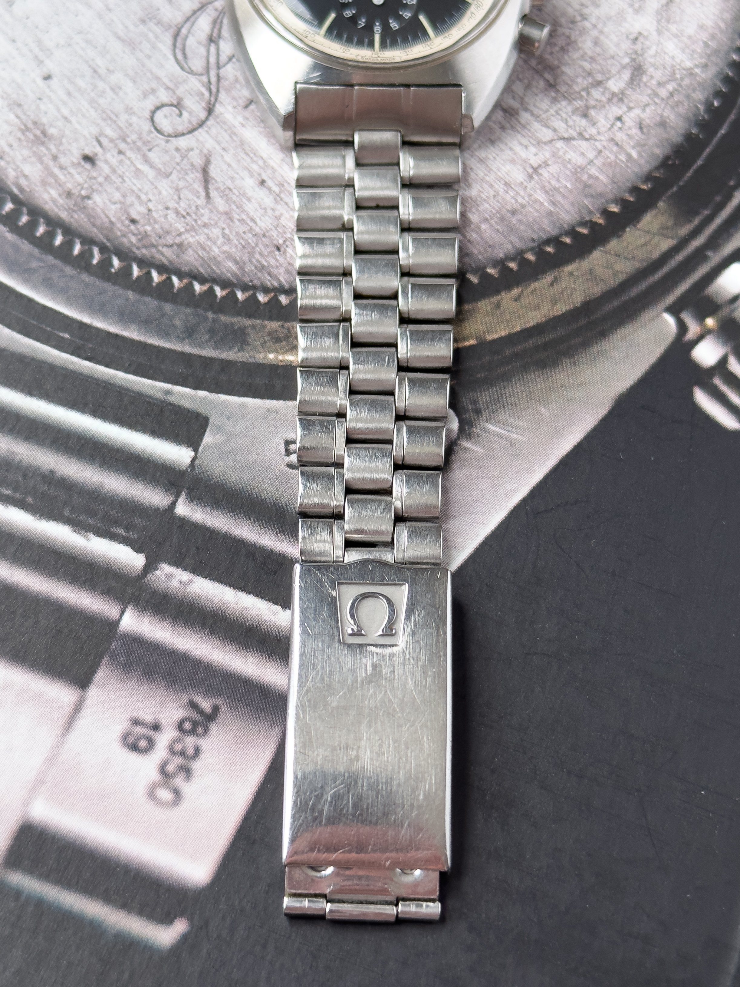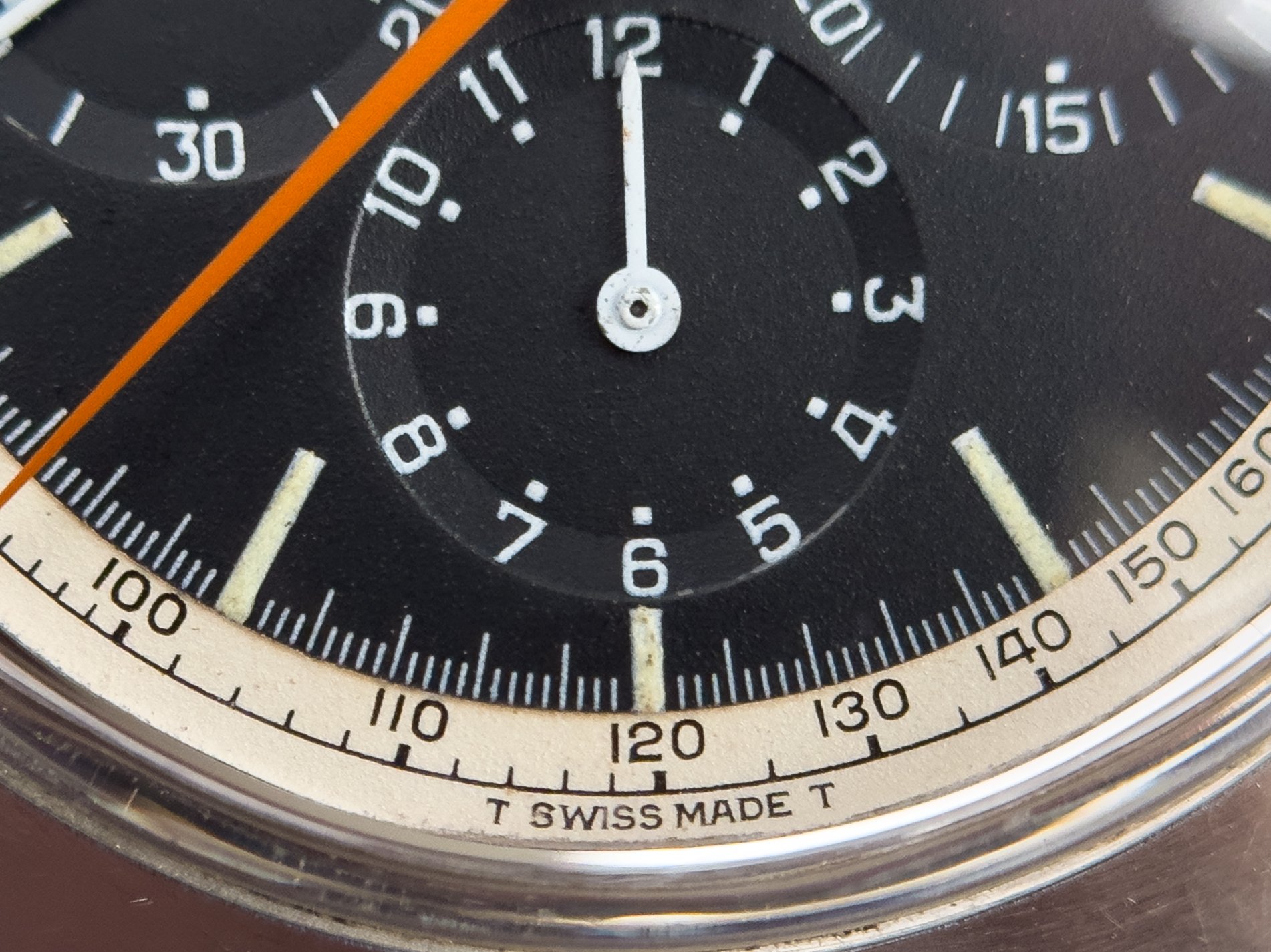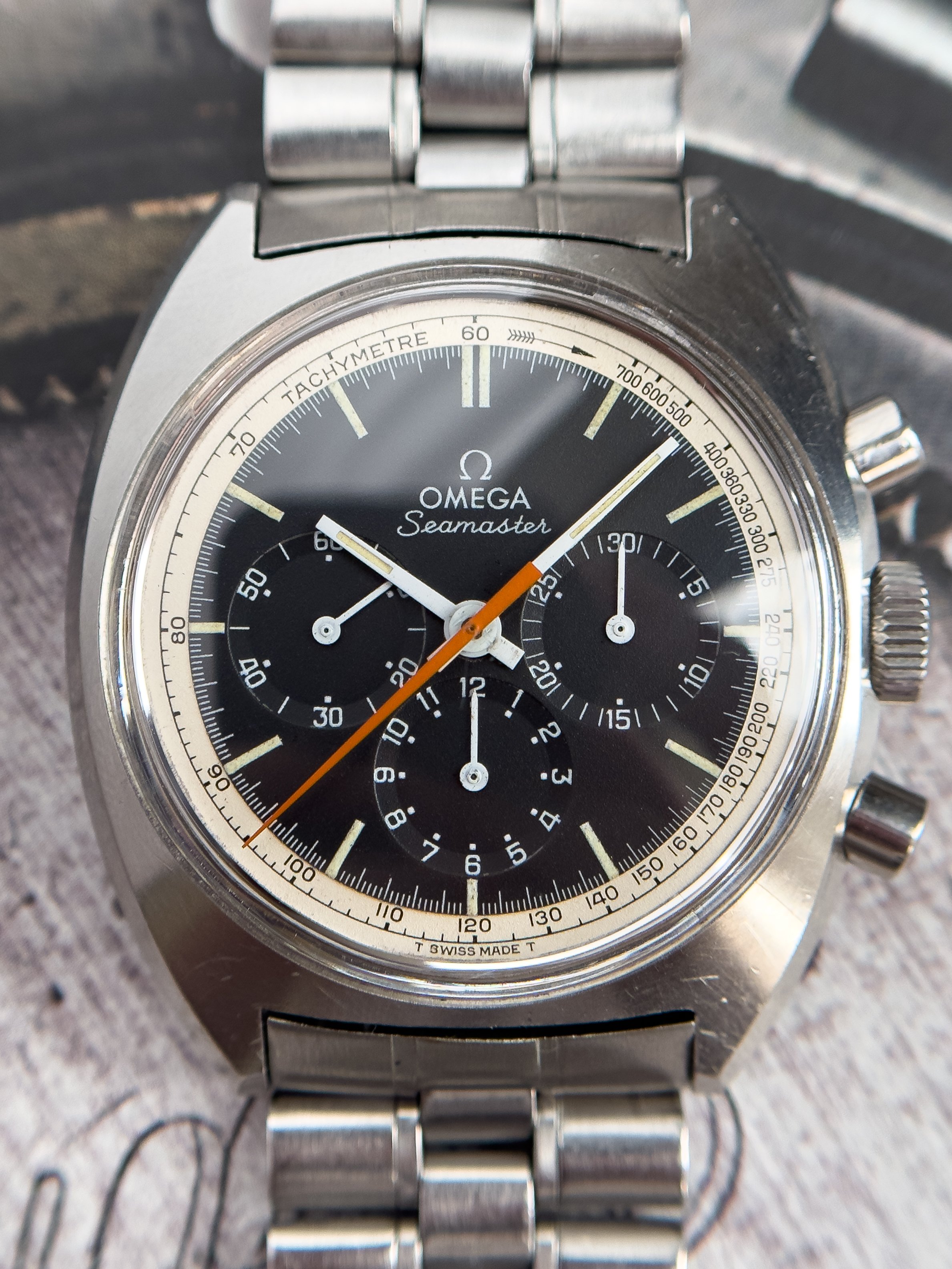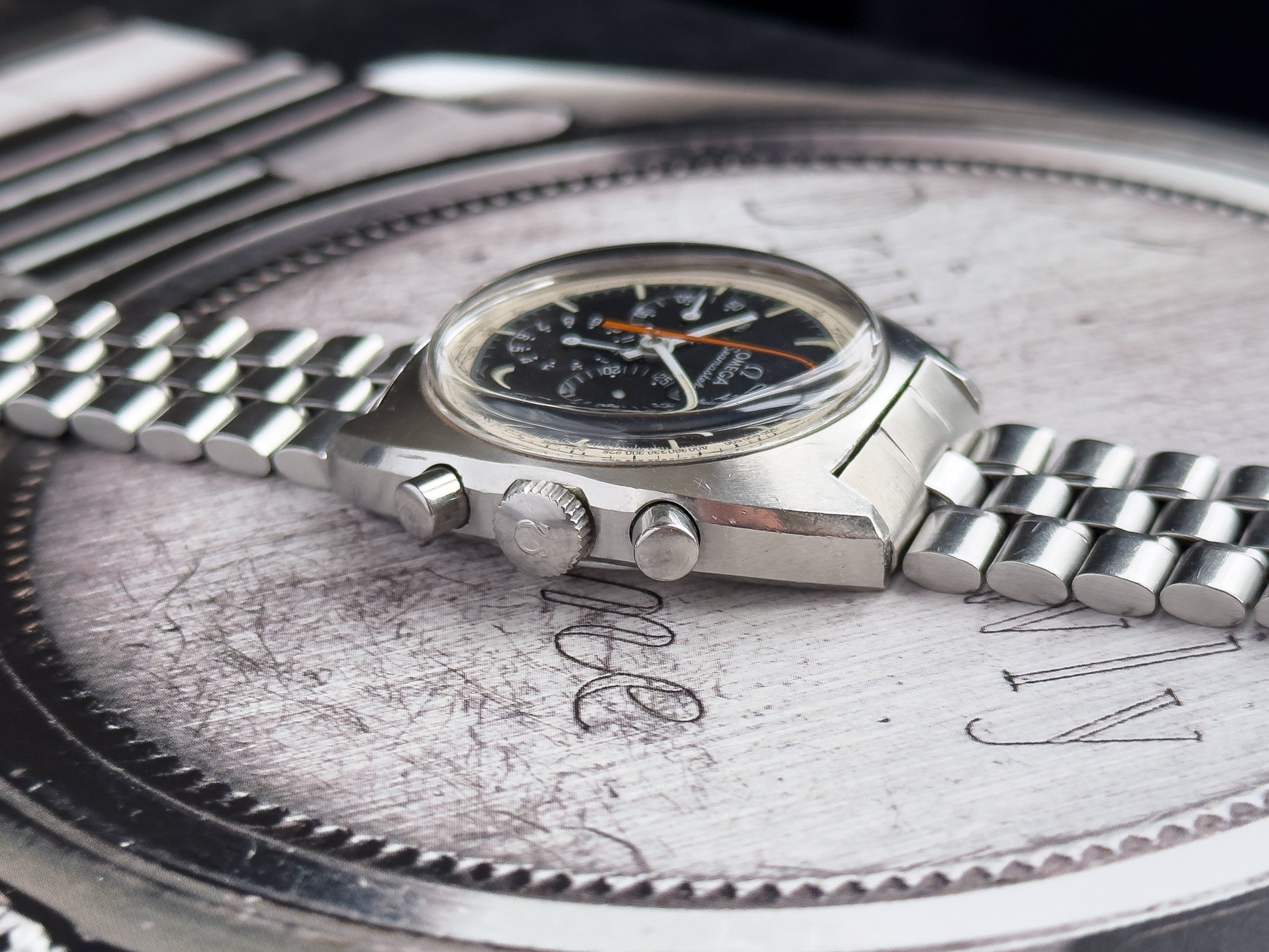 Overall this piece is in very good condition and it is such a joy to wear. As you can see from the original listing, it was serviced in 2021 and while I don't have physical proof of this, the movement is clean and everything operates as you would expect. I have worn this daily for extended periods of time and this watch has always kept time very well and has a healthy power reserve under full wind. I can't say this is unpolished as I have not owned this watch since it was first sold; however, I can say that it retains its original shape with sharp lines and chamfers. I can faintly see remnants of the original brushing but it has been "polished" down from use over time. The case does show wear that is commensurate with age. The 1116/548 bracelet is correct for this reference and has more than enough length for my 7.25" wrist. It even has plenty of room to spare as I wear it four micro adjust holes in from the edge of the clasp. Back to the watch- the crystal is signed, intact, clean and in great shape. If anything, the crystal could benefit from a slight polish. The black dial is beautiful and well preserved. Any shadows seen in the outdoor wrist shots are just that- shadows from the superficial marks on the crystal. The outer white tachymetre ring is well preserved and has a lovely almost parchment tone to it. The original tritium lume on the dial and hands is intact and has patinated to a beautiful soft custard color that is really pleasing to look at. The crown and movement wind smoothly and the pushers have a pleasing tactile action when pressed. That is everything I can think of but if you have any questions, please do ask.