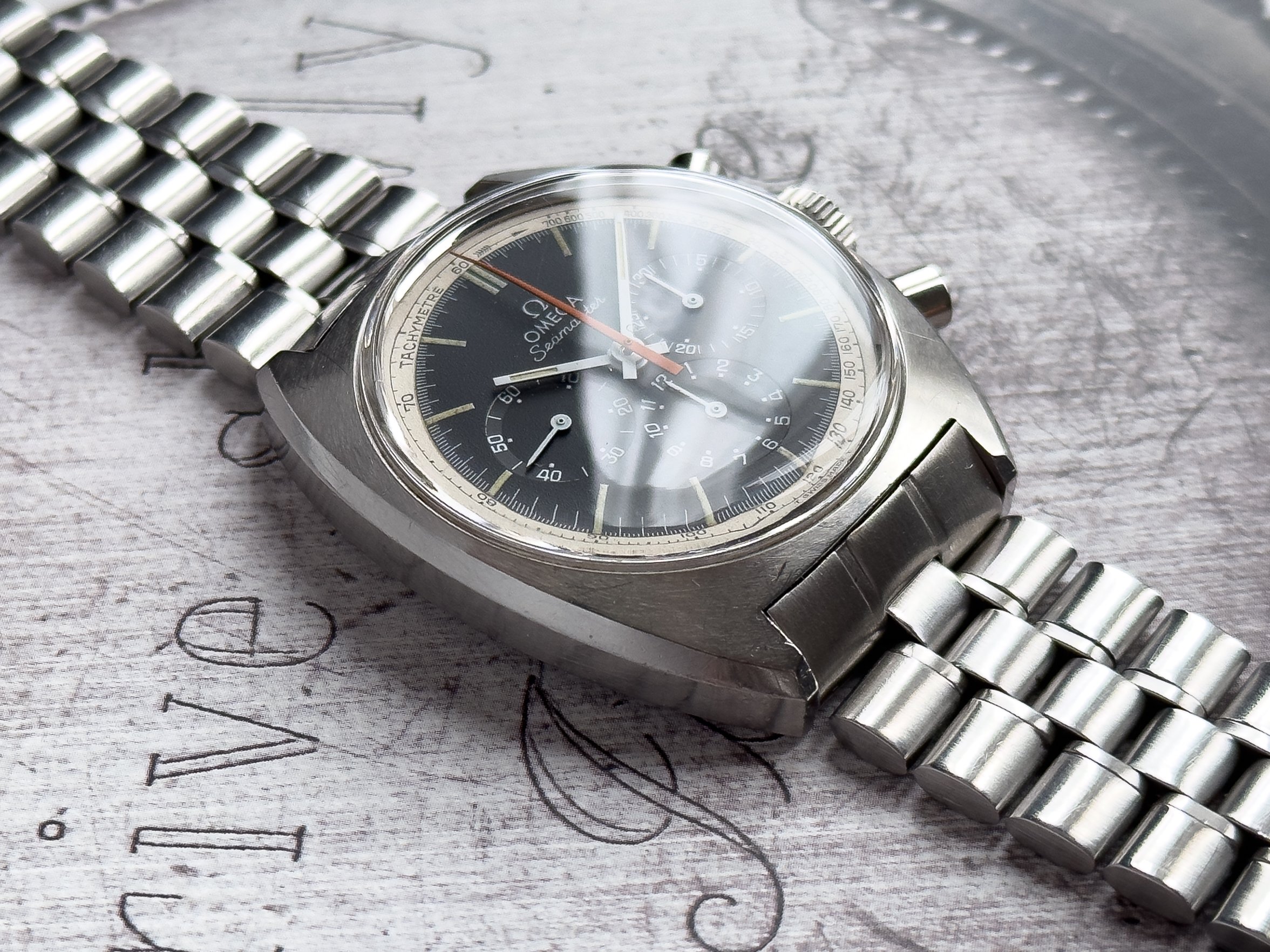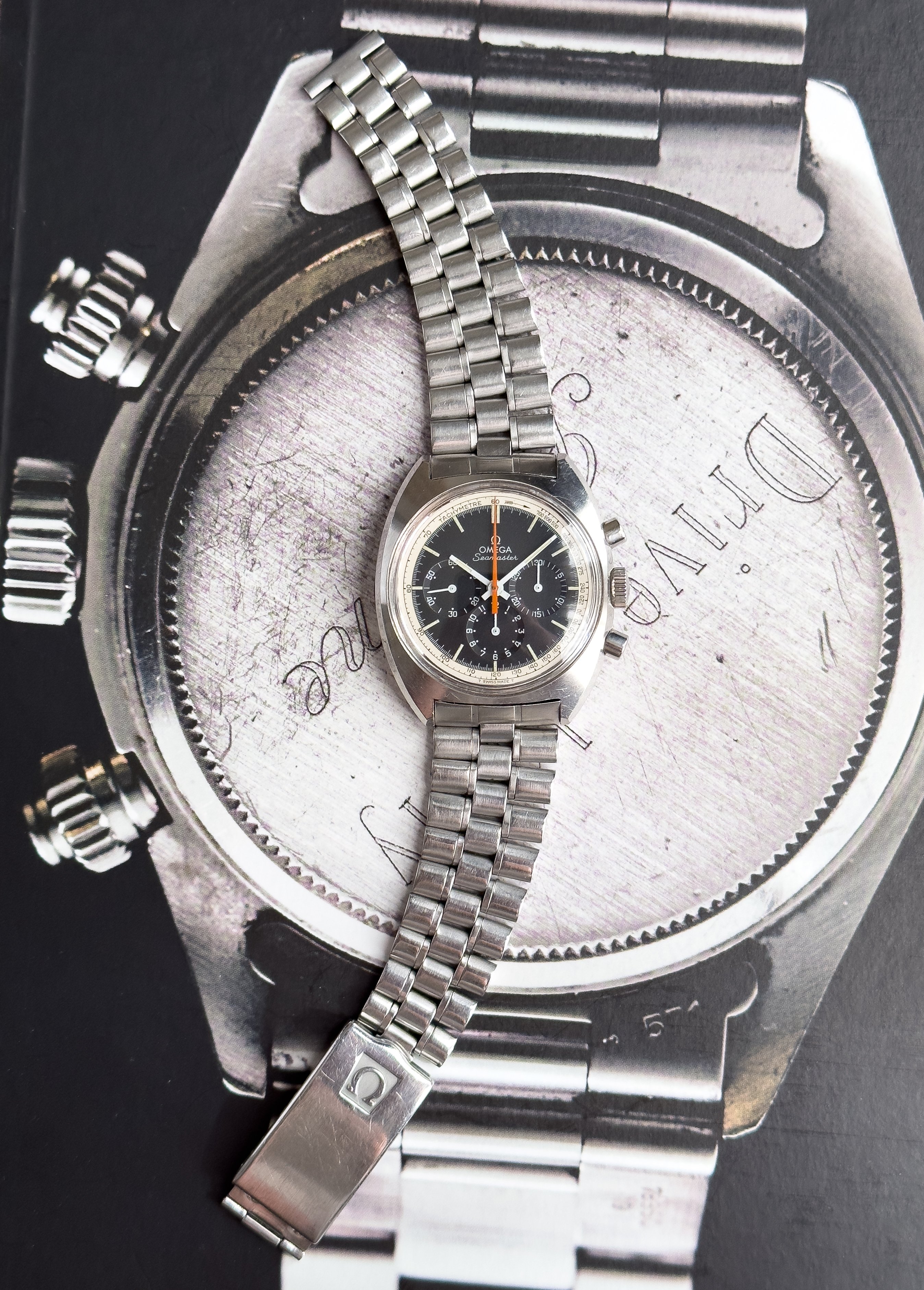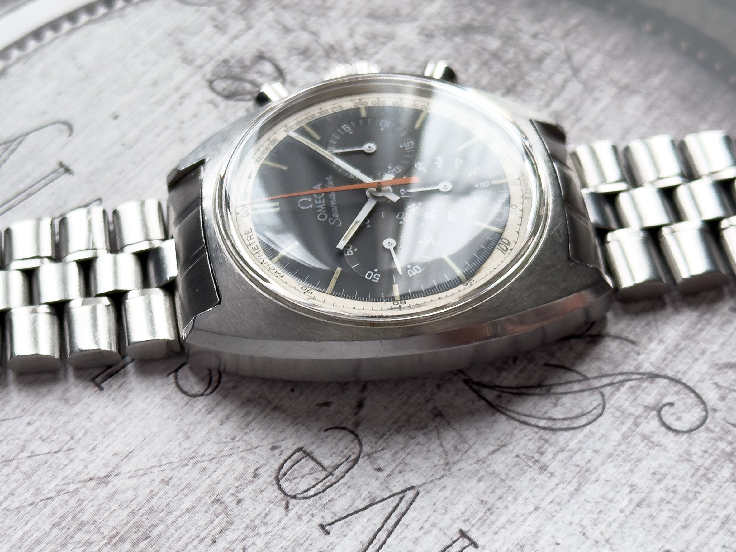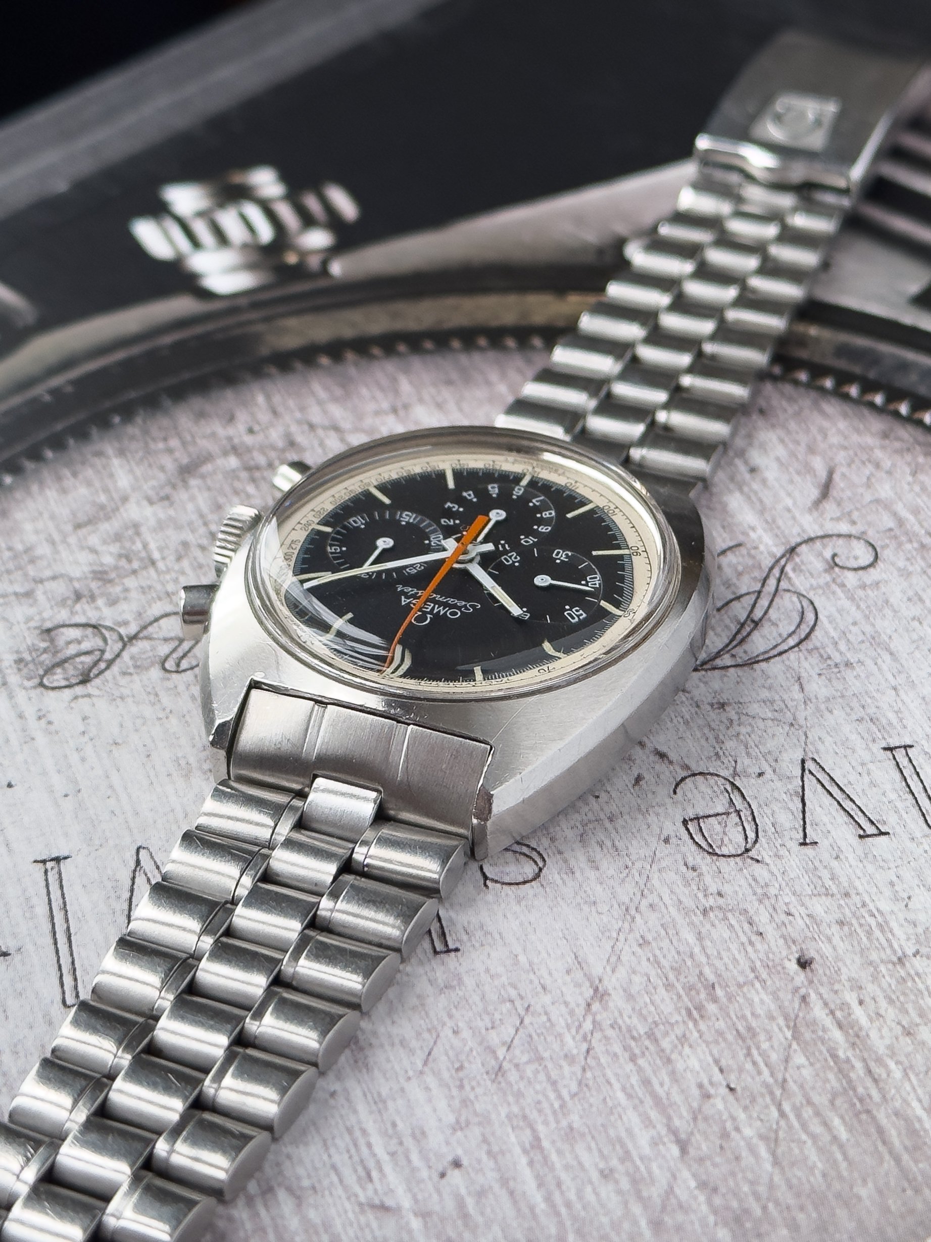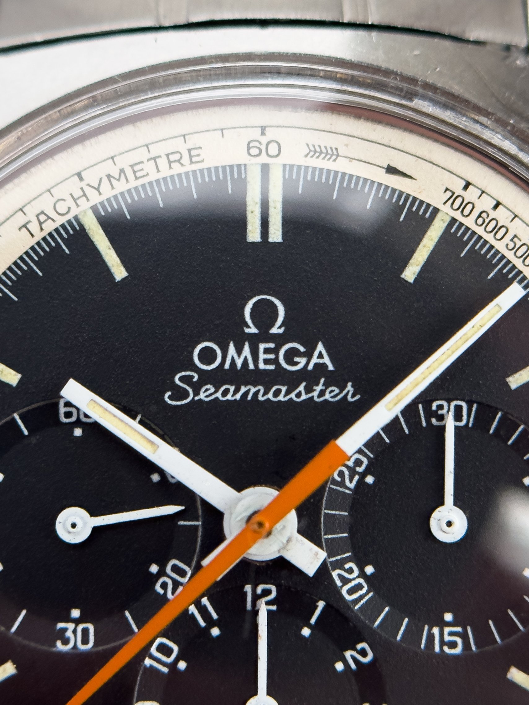 Overall this piece is in very good condition and it is such a joy to wear. As you can see from the original listing, it was serviced in 2021 and while I don't have physical proof of this, the movement is clean and everything operates as you would expect. I have worn this daily for extended periods of time and this watch has always kept time very well and has a healthy power reserve under full wind. I can't say this is unpolished as I have not owned this watch since it was first sold; however, I can say that it retains its original shape with sharp lines and chamfers. I can faintly see remnants of the original brushing but it has been "polished" down from use over time. The case does show wear that is commensurate with age. The 1116/548 bracelet is correct for this reference and has more than enough length for my 7.25" wrist. It even has plenty of room to spare as I wear it four micro adjust holes in from the edge of the clasp. Back to the watch- the crystal is signed, intact, clean and in great shape. If anything, the crystal could benefit from a slight polish. The black dial is beautiful and well preserved. Any shadows seen in the outdoor wrist shots are just that- shadows from the superficial marks on the crystal. The outer white tachymetre ring is well preserved and has a lovely almost parchment tone to it. The original tritium lume on the dial and hands is intact and has patinated to a beautiful soft custard color that is really pleasing to look at. The crown and movement wind smoothly and the pushers have a pleasing tactile action when pressed. That is everything I can think of but if you have any questions, please do ask.