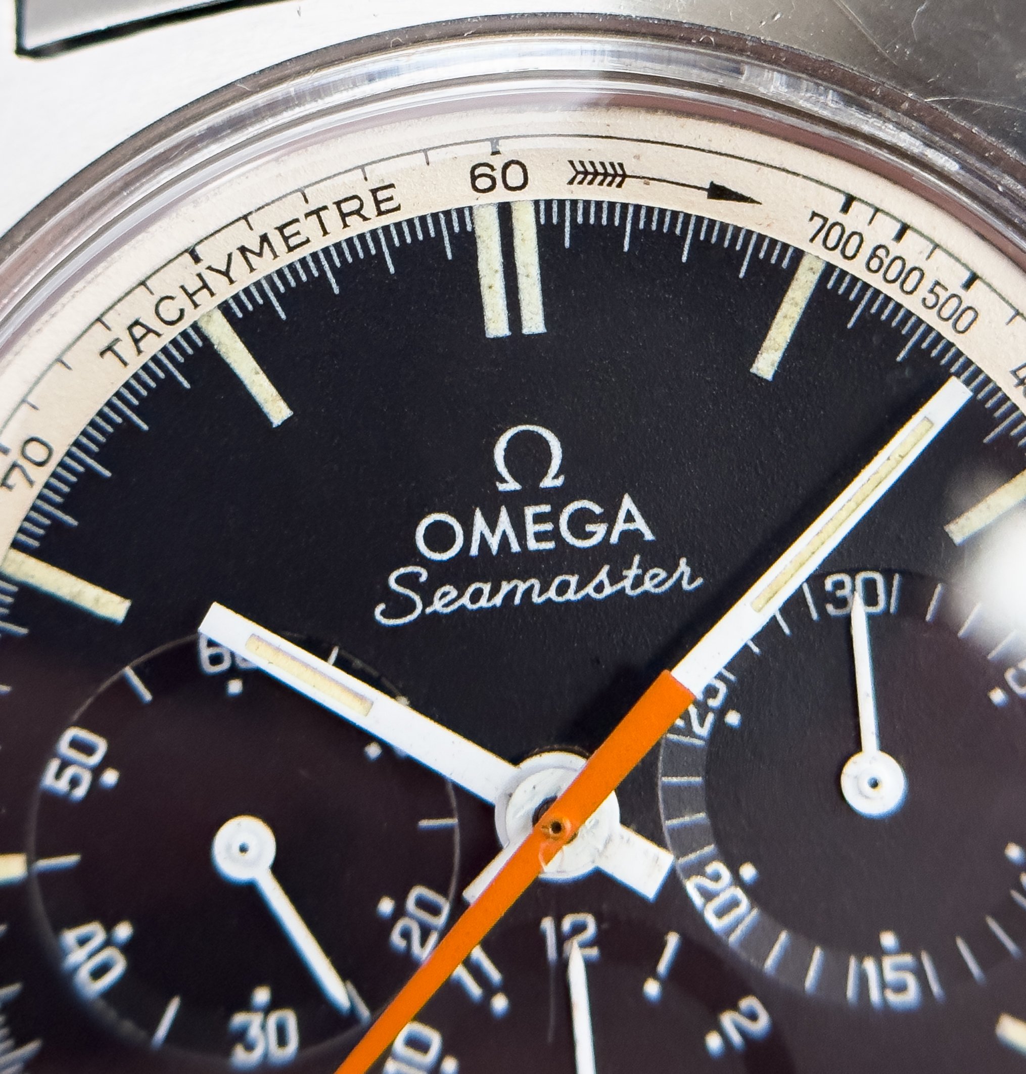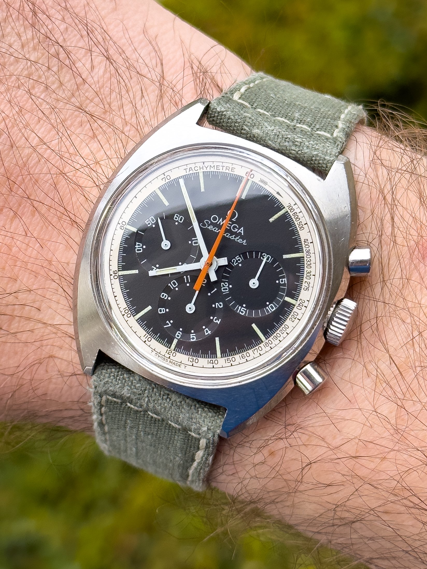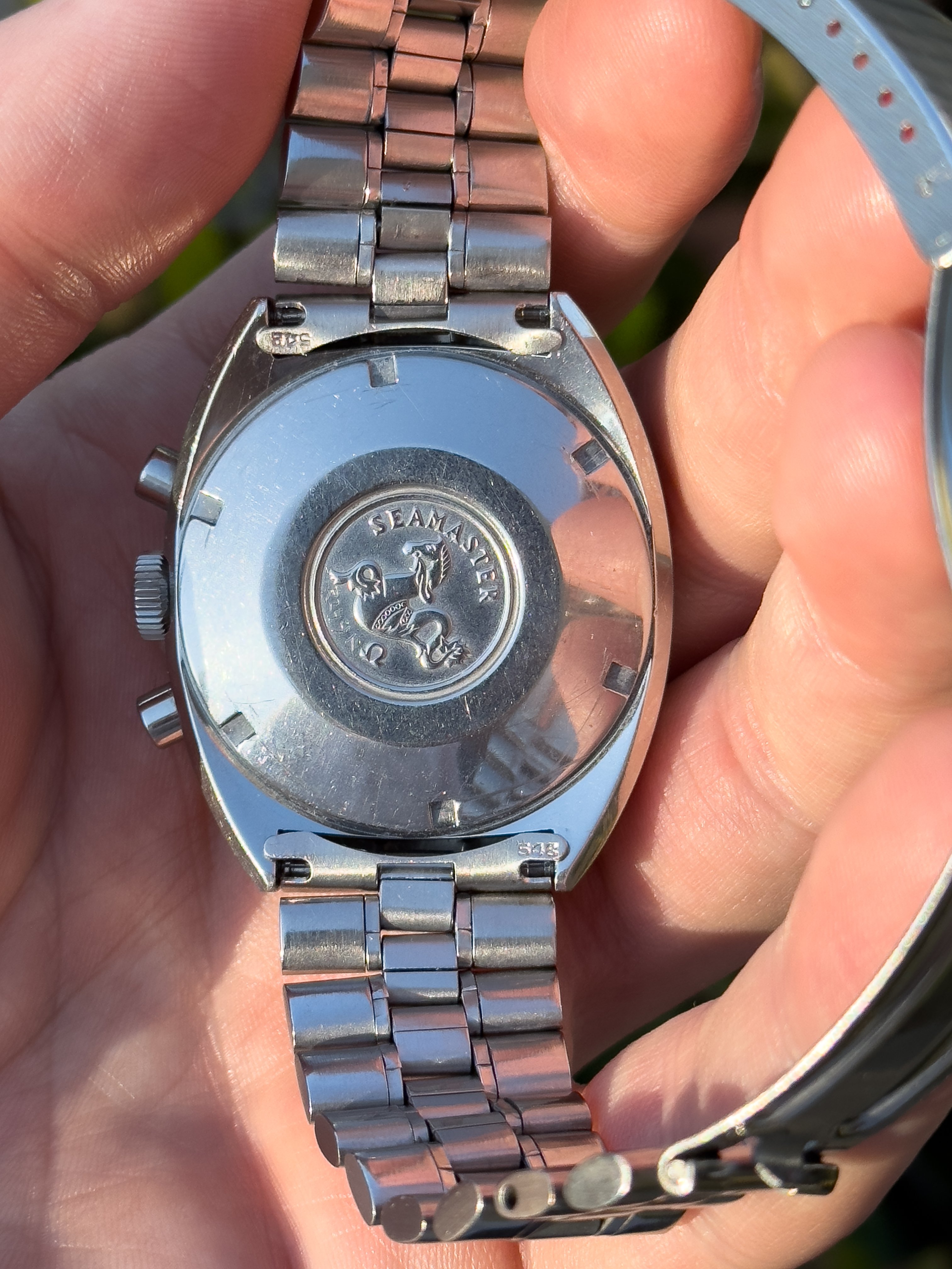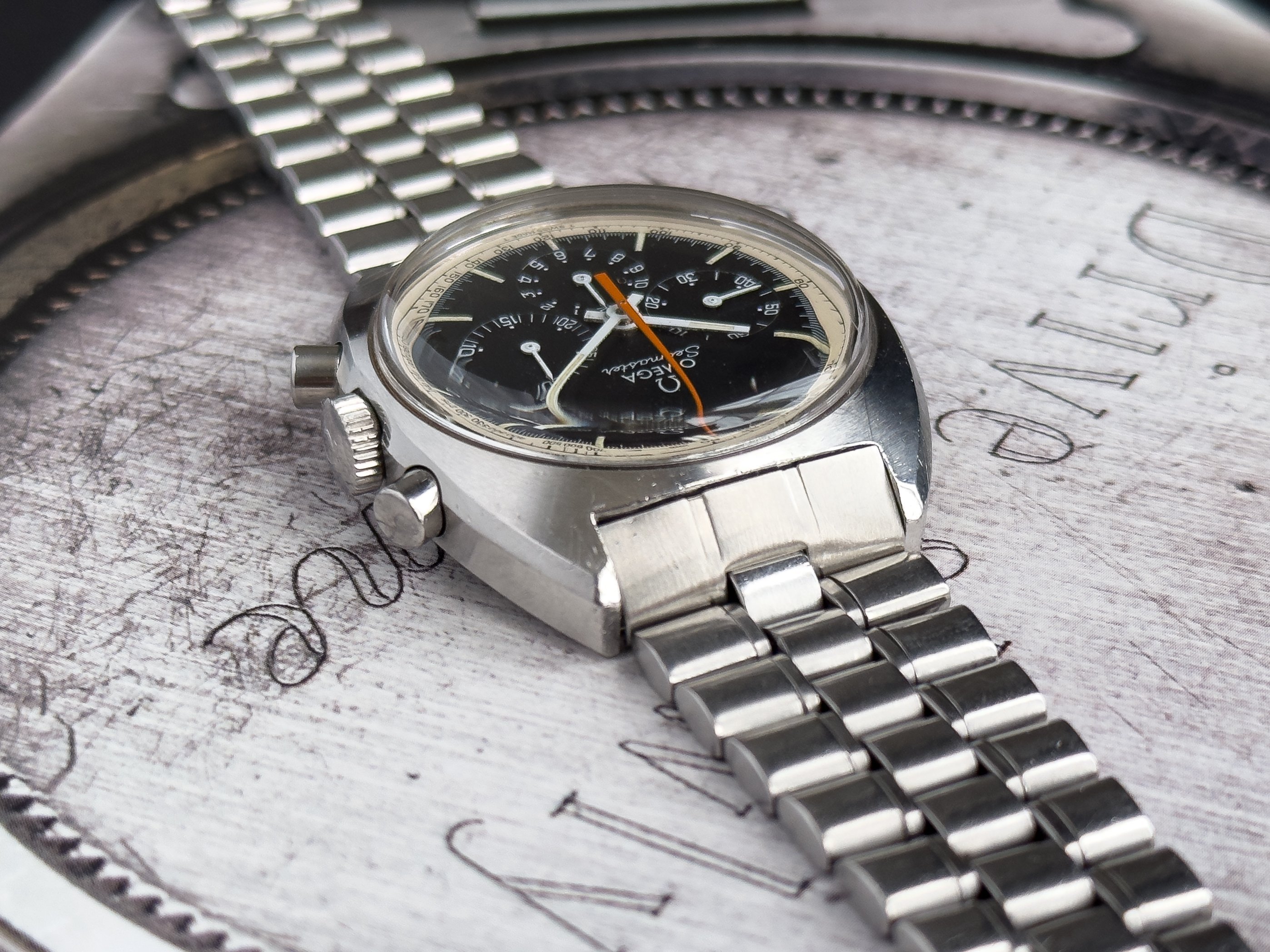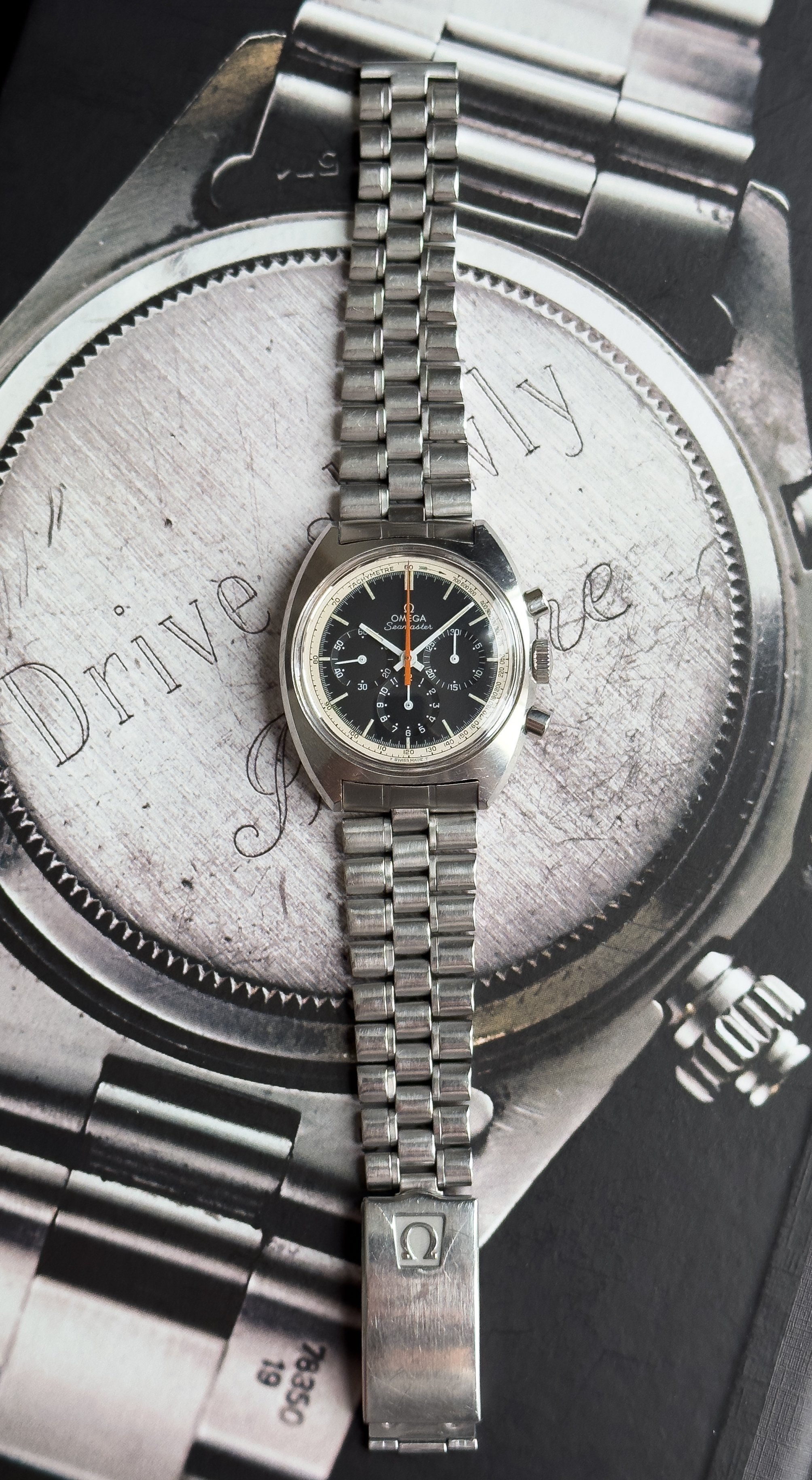 Overall this piece is in very good condition and it is such a joy to wear. As you can see from the original listing, it was serviced in 2021 and while I don't have physical proof of this, the movement is clean and everything operates as you would expect. I have worn this daily for extended periods of time and this watch has always kept time very well and has a healthy power reserve under full wind. I can't say this is unpolished as I have not owned this watch since it was first sold; however, I can say that it retains its original shape with sharp lines and chamfers. I can faintly see remnants of the original brushing but it has been "polished" down from use over time. The case does show wear that is commensurate with age. The 1116/548 bracelet is correct for this reference and has more than enough length for my 7.25" wrist. It even has plenty of room to spare as I wear it four micro adjust holes in from the edge of the clasp. Back to the watch- the crystal is signed, intact, clean and in great shape. If anything, the crystal could benefit from a slight polish. The black dial is beautiful and well preserved. Any shadows seen in the outdoor wrist shots are just that- shadows from the superficial marks on the crystal. The outer white tachymetre ring is well preserved and has a lovely almost parchment tone to it. The original tritium lume on the dial and hands is intact and has patinated to a beautiful soft custard color that is really pleasing to look at. The crown and movement wind smoothly and the pushers have a pleasing tactile action when pressed. That is everything I can think of but if you have any questions, please do ask.