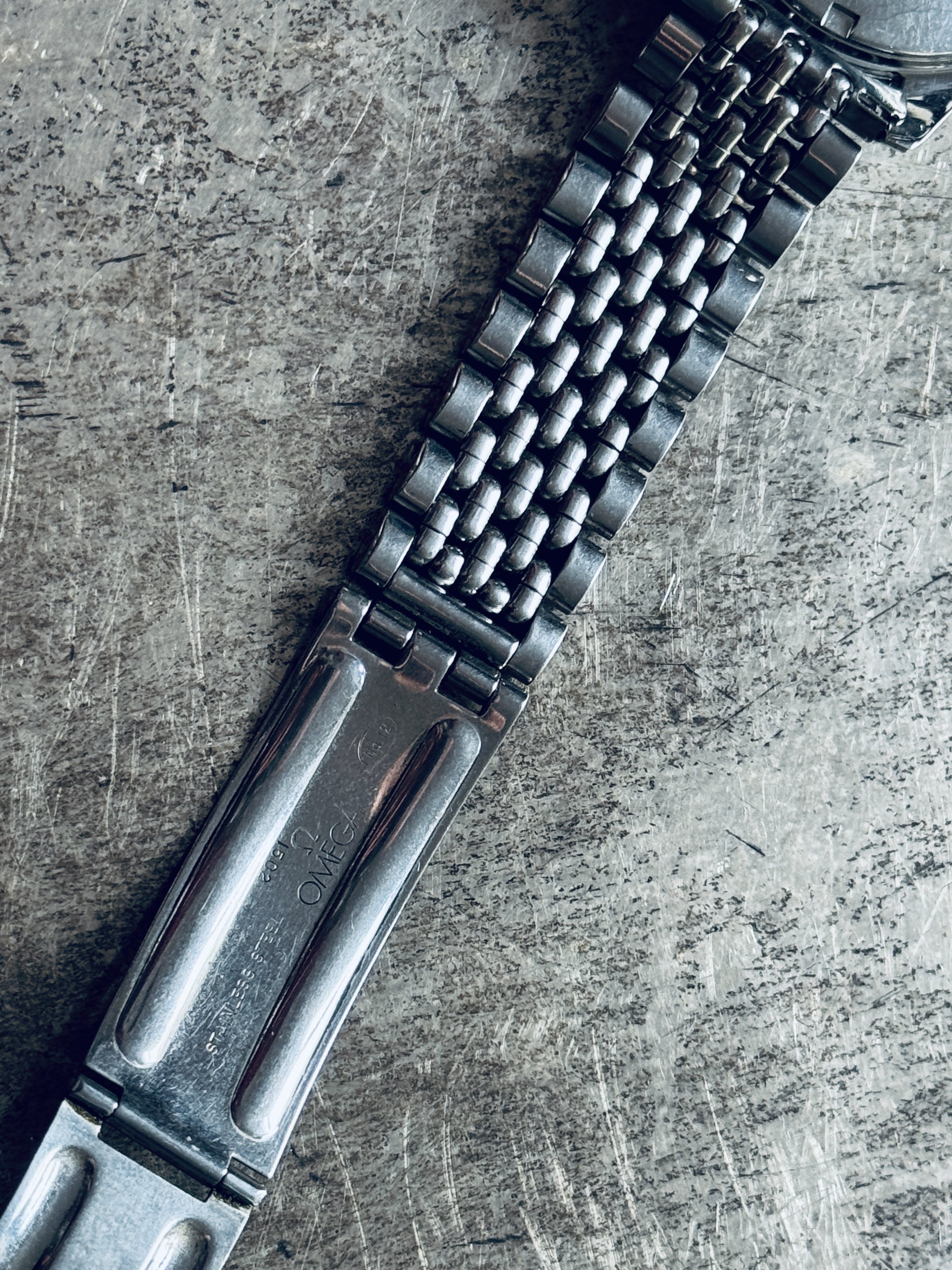This particular example is one of the more uncommon configurations and, to my eyes, one of the most desirable. Non-luminous, very cool monochrome appearance, nicely symmetrical without that date window, and a stunning brushed dial structure. Also, it’s fully original to the last detail: Even the plexi and the crown are the period-correct, original flat-feet-logo versions.
