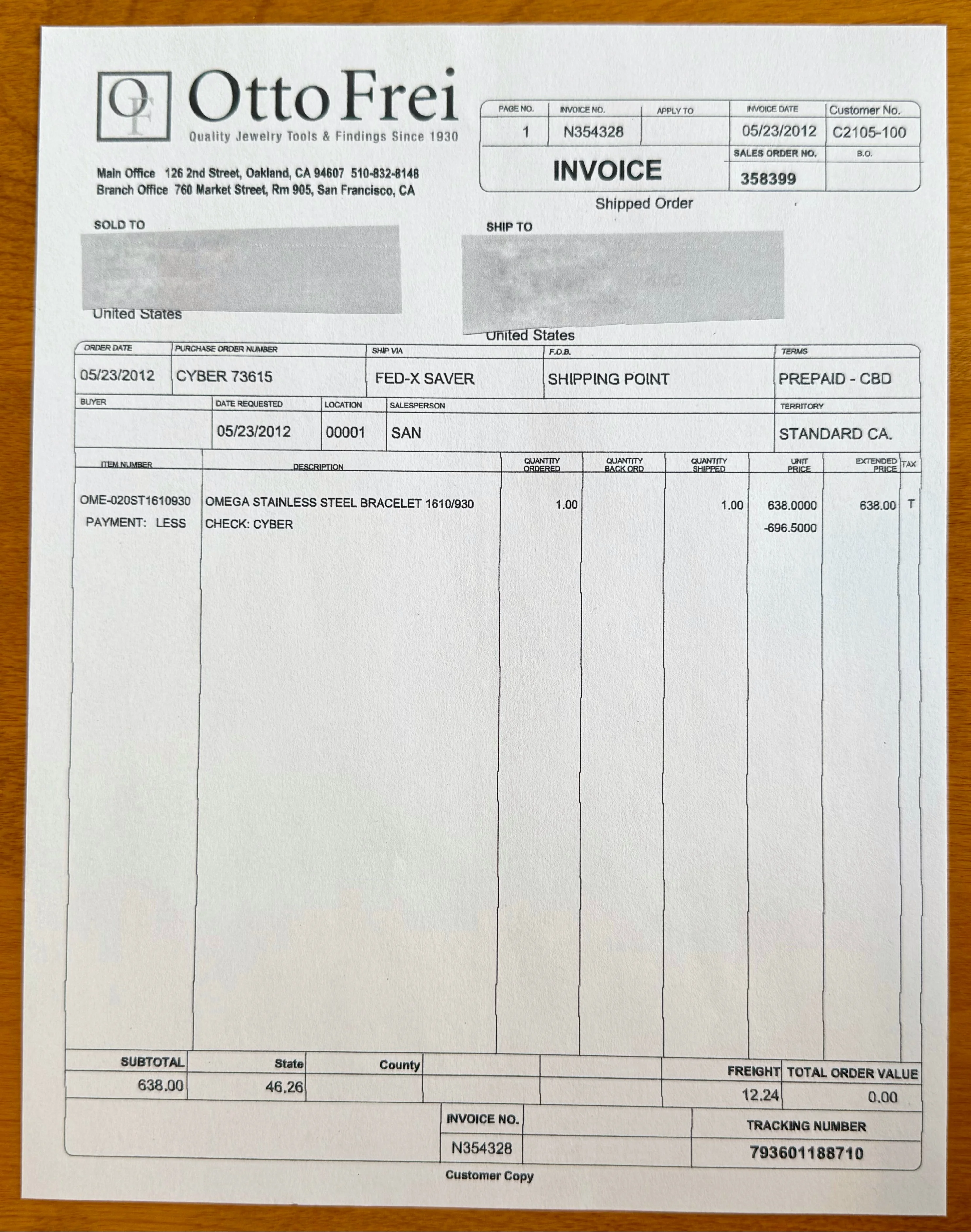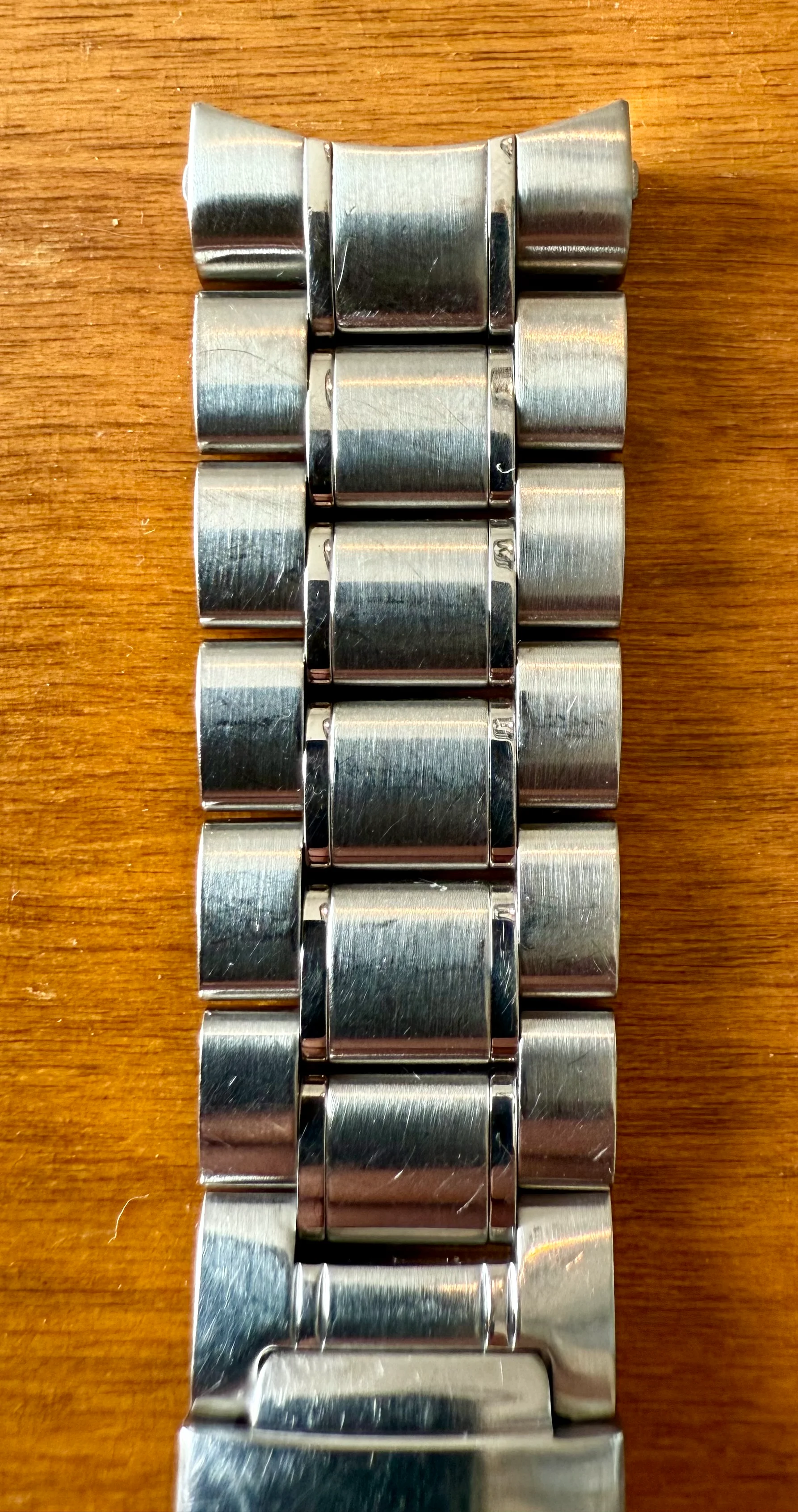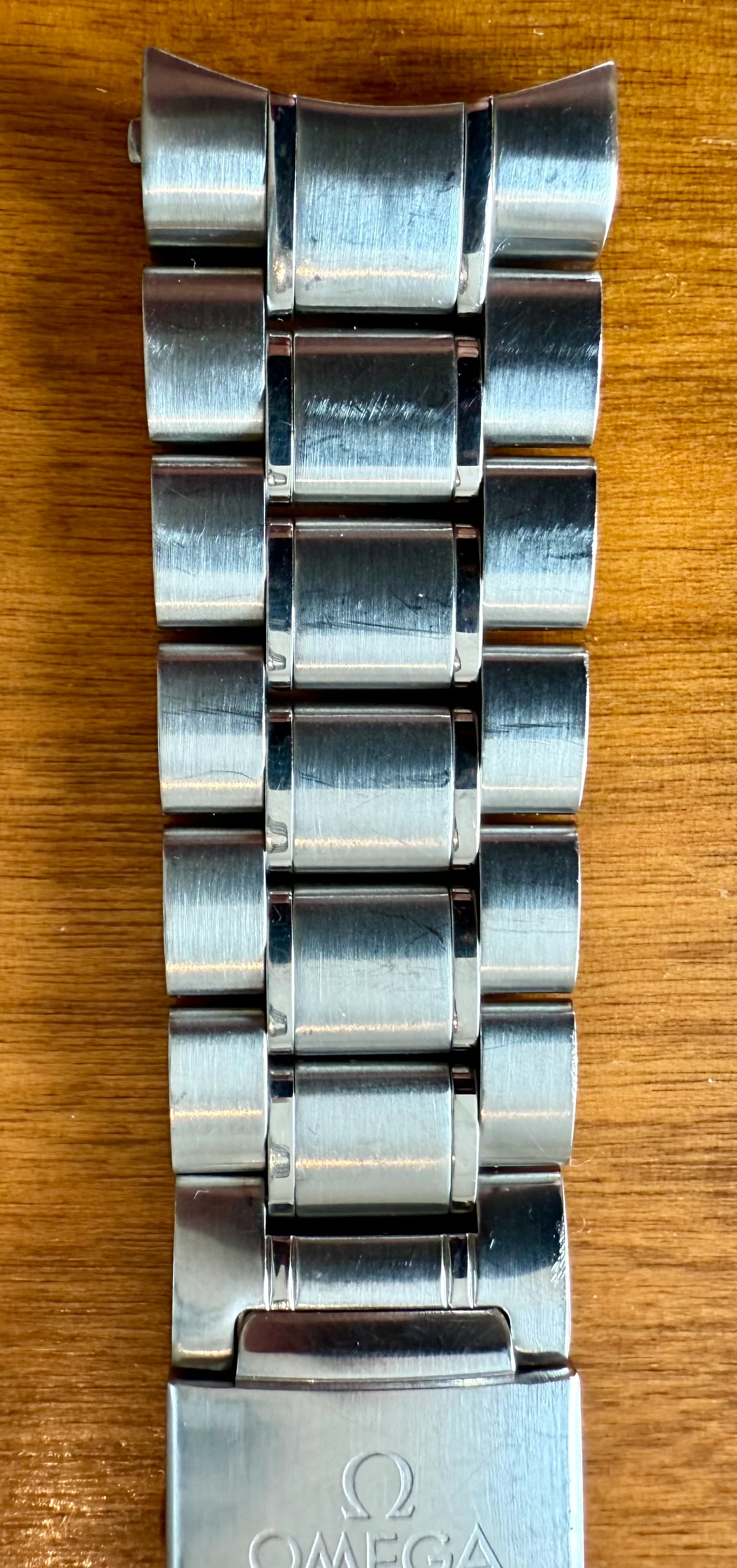 Purchased new from Otto Frei in 2012 (copy of invoice included). Sized to my 6 3/4" wrist. Has the original unused extra links. Fits many 20mm Omega models including the Peter Blake 2254.50 & 2264.50 models. It will also reportedly fit the 2541.80 & 2531.80 models. It may fit other 20mm models but please do your own research on fitment. I wore it on my 212.30.41.20.01.002 Bond Co-Axial and it worked well. This was my daily wear watch for several years and the bracelet is scuffed and scratched as a result. Please see pictures to see general condition - one photo has red arrow indicating a scuff on a link. I do not recall it ever being polished so it is possible that a polish might help make a difference on appearance. (In my opinion, it looks much worse in these photos than it does in person.)
