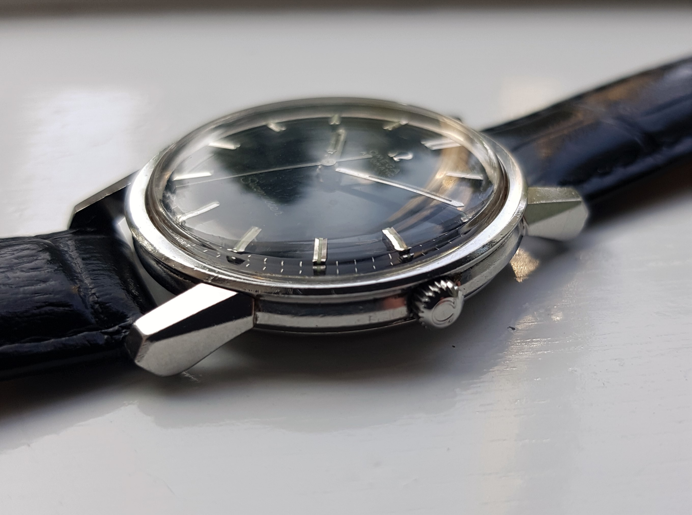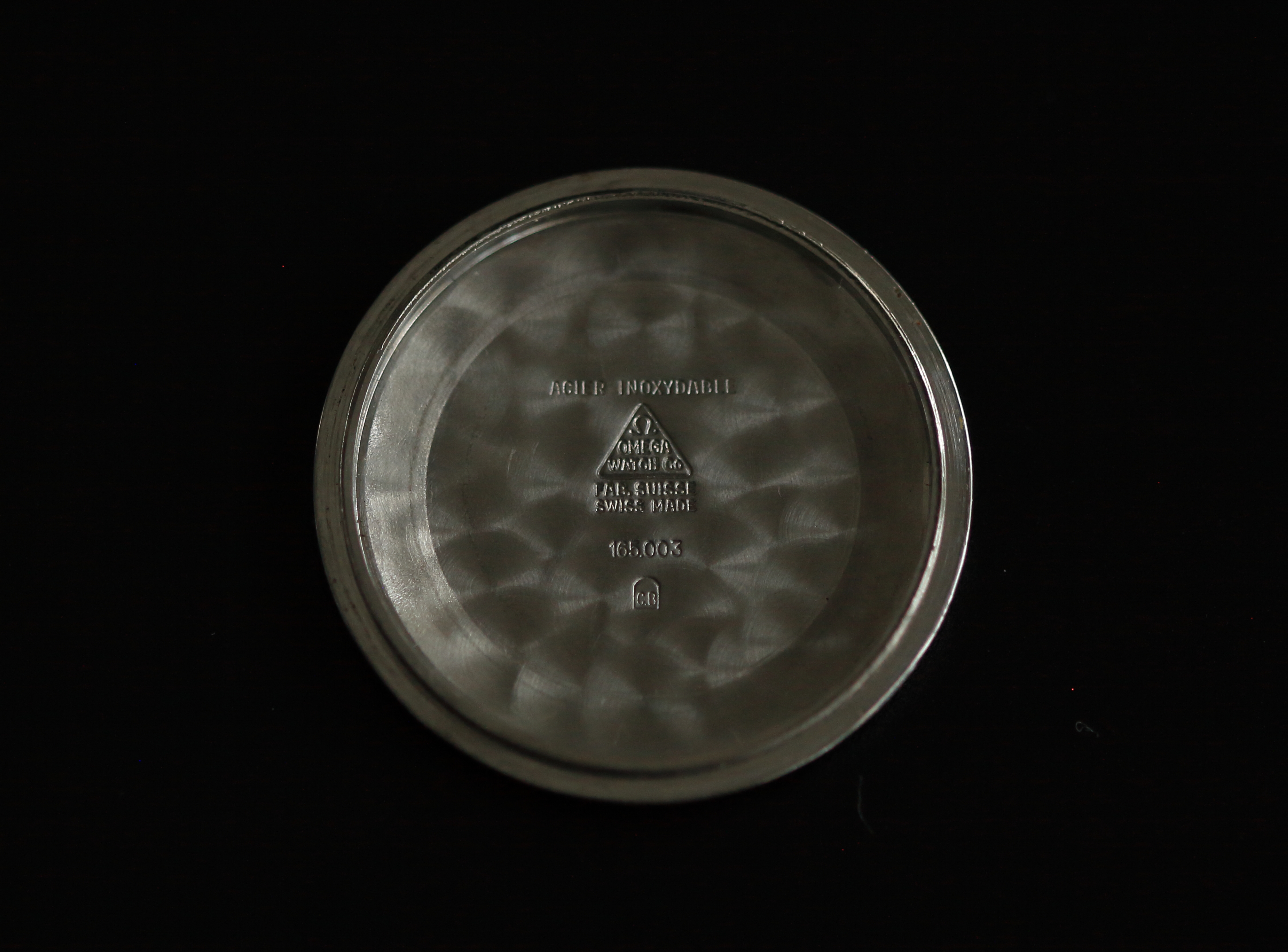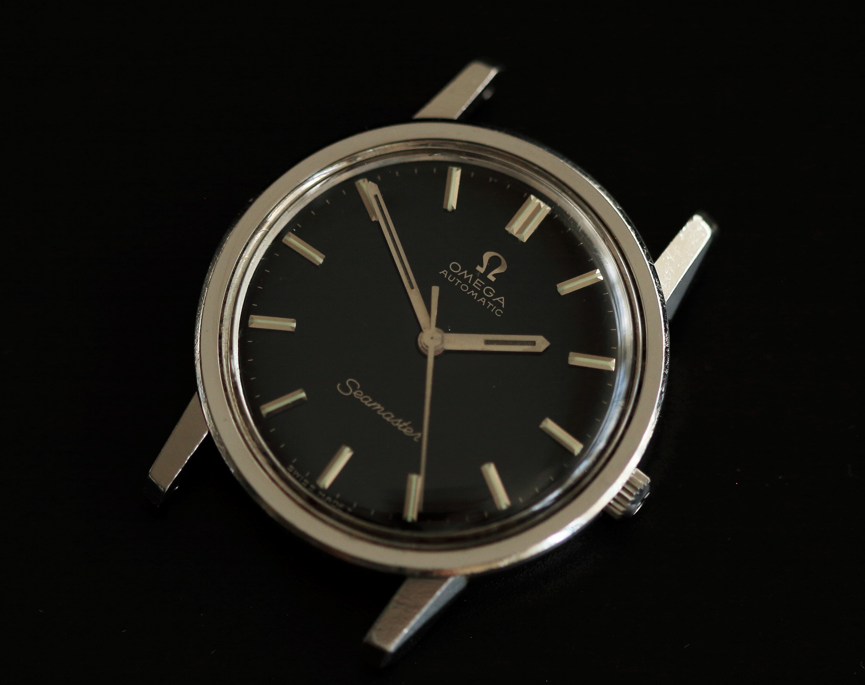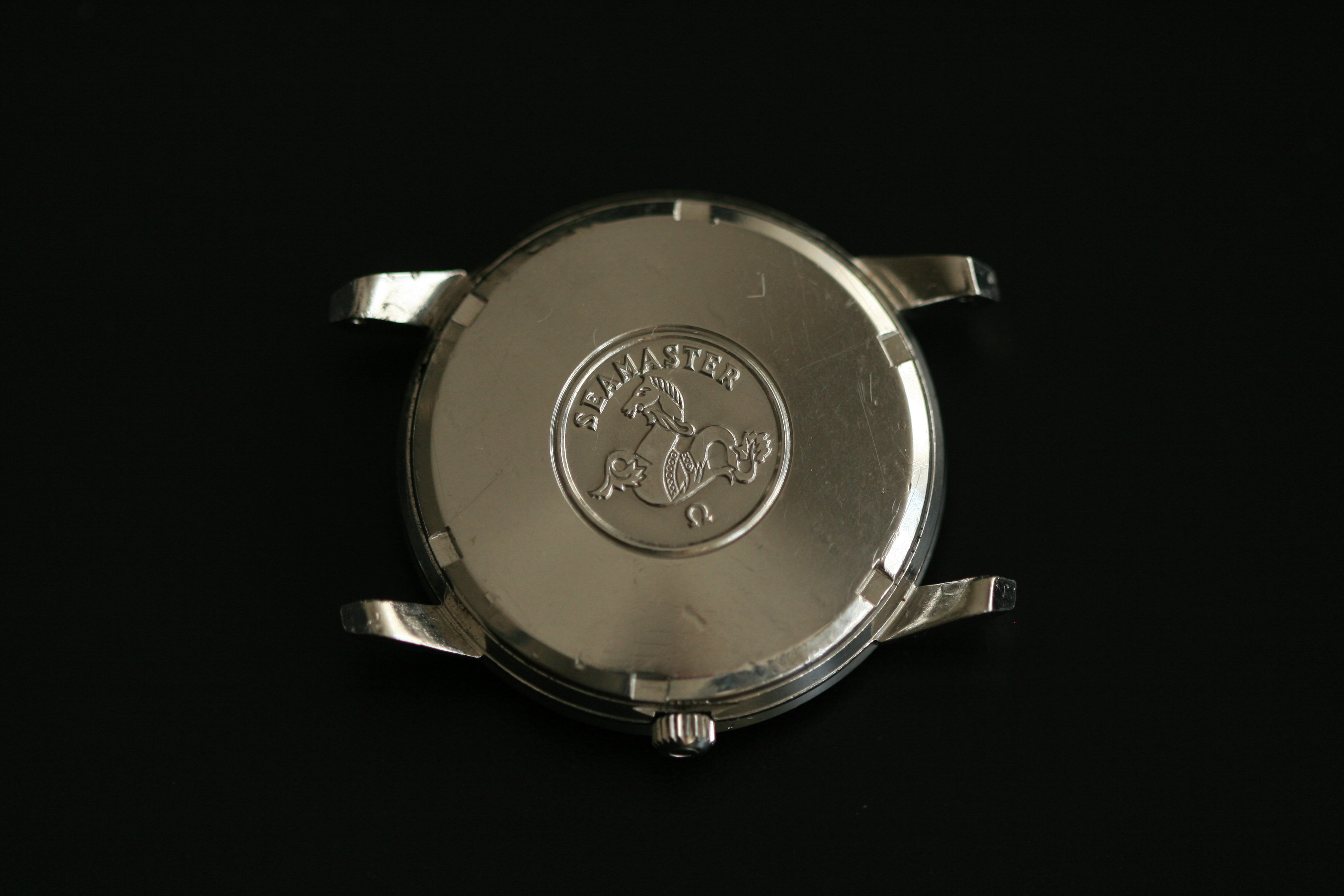 The steel case is sharp with well defined lugs which have a unique profile and what I find interesting about this reference, original crown and nice medallion. The inside back of the centre case has some pitting. The pitting can't be seen when the case back is attached, but good to know. When I bought this watch it came with an incorrect 166.010 Seamaster case back, after a 3 year search I have sourced the correct 165.003 case back which is in good condition.