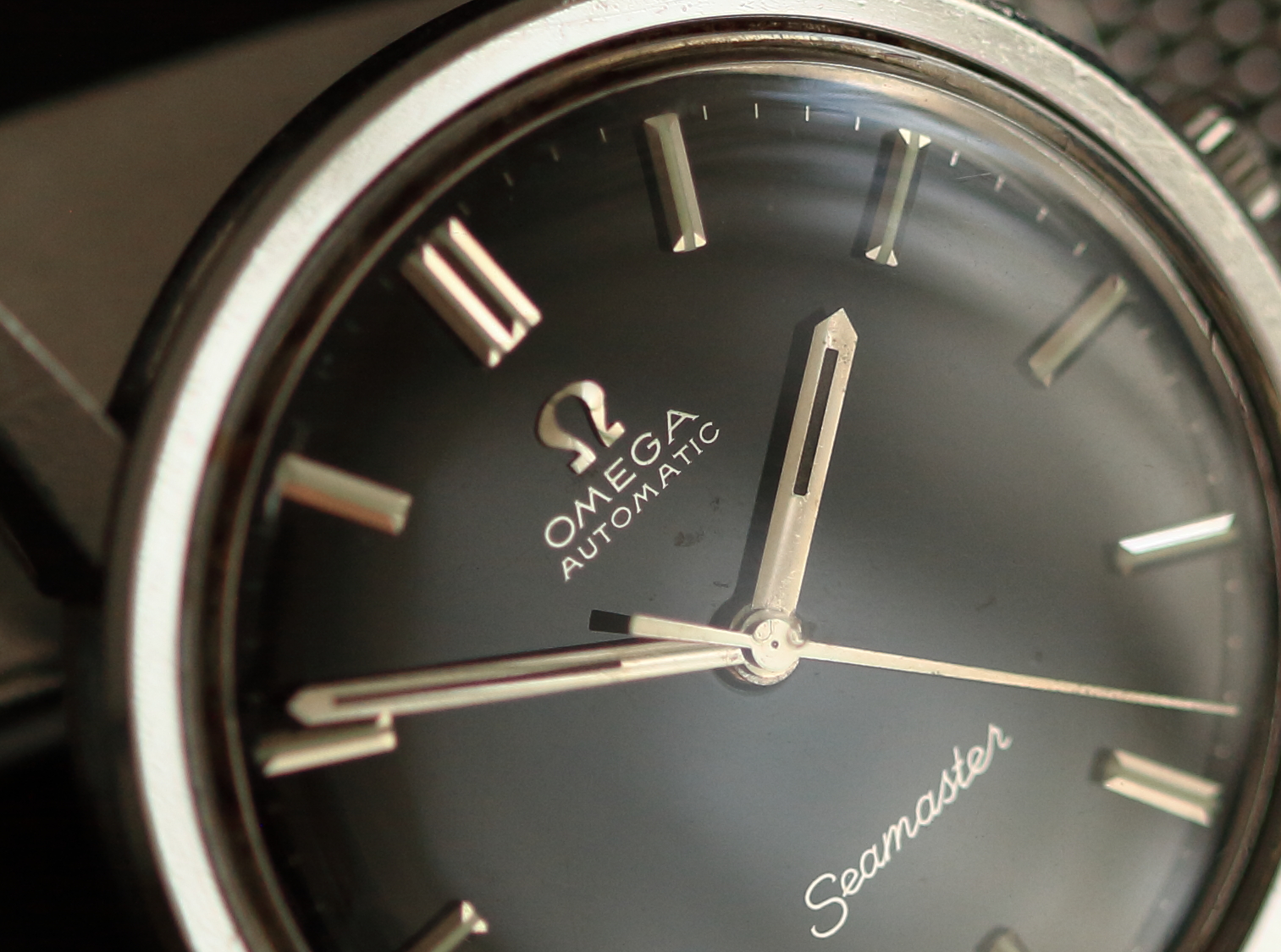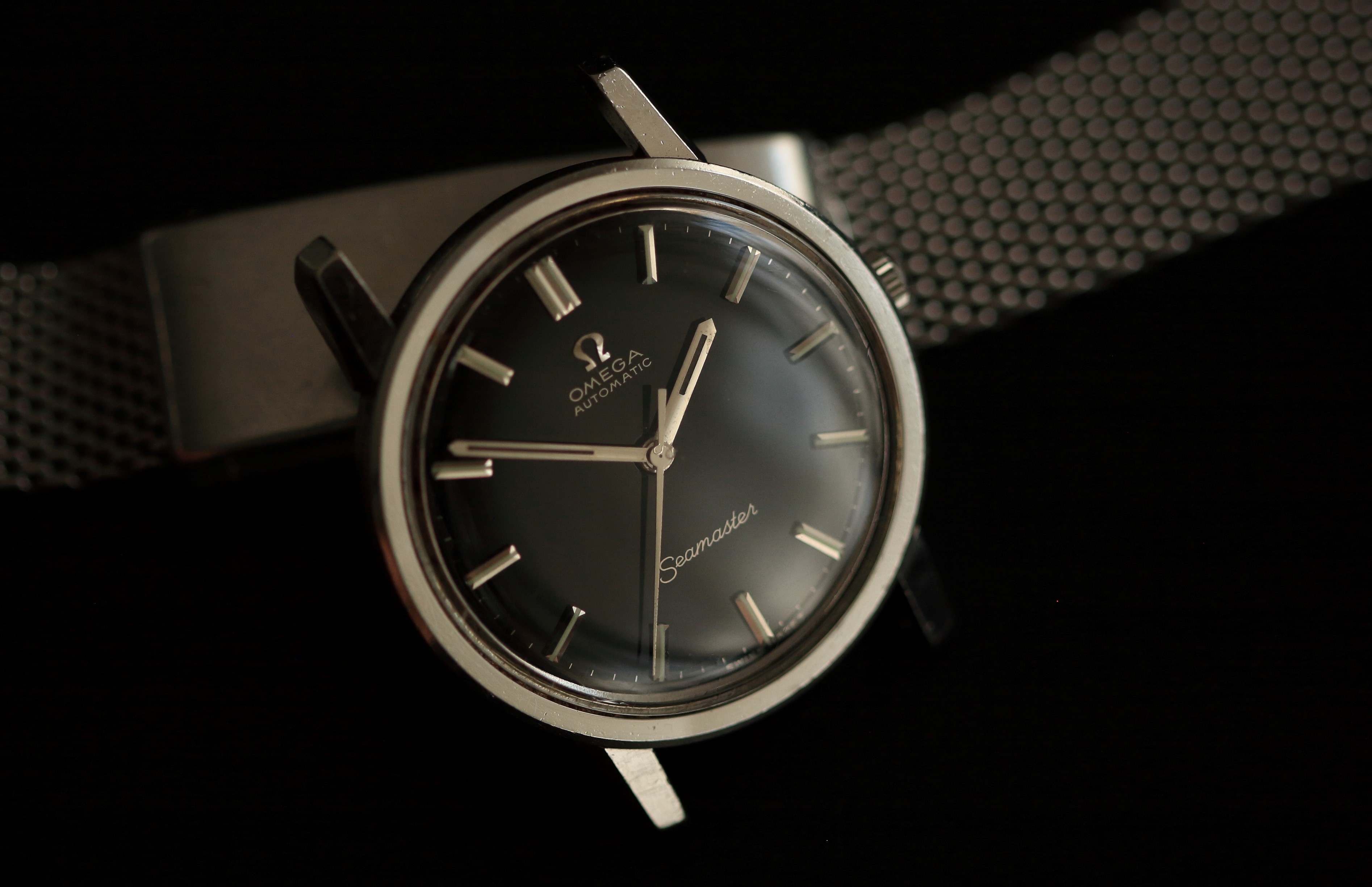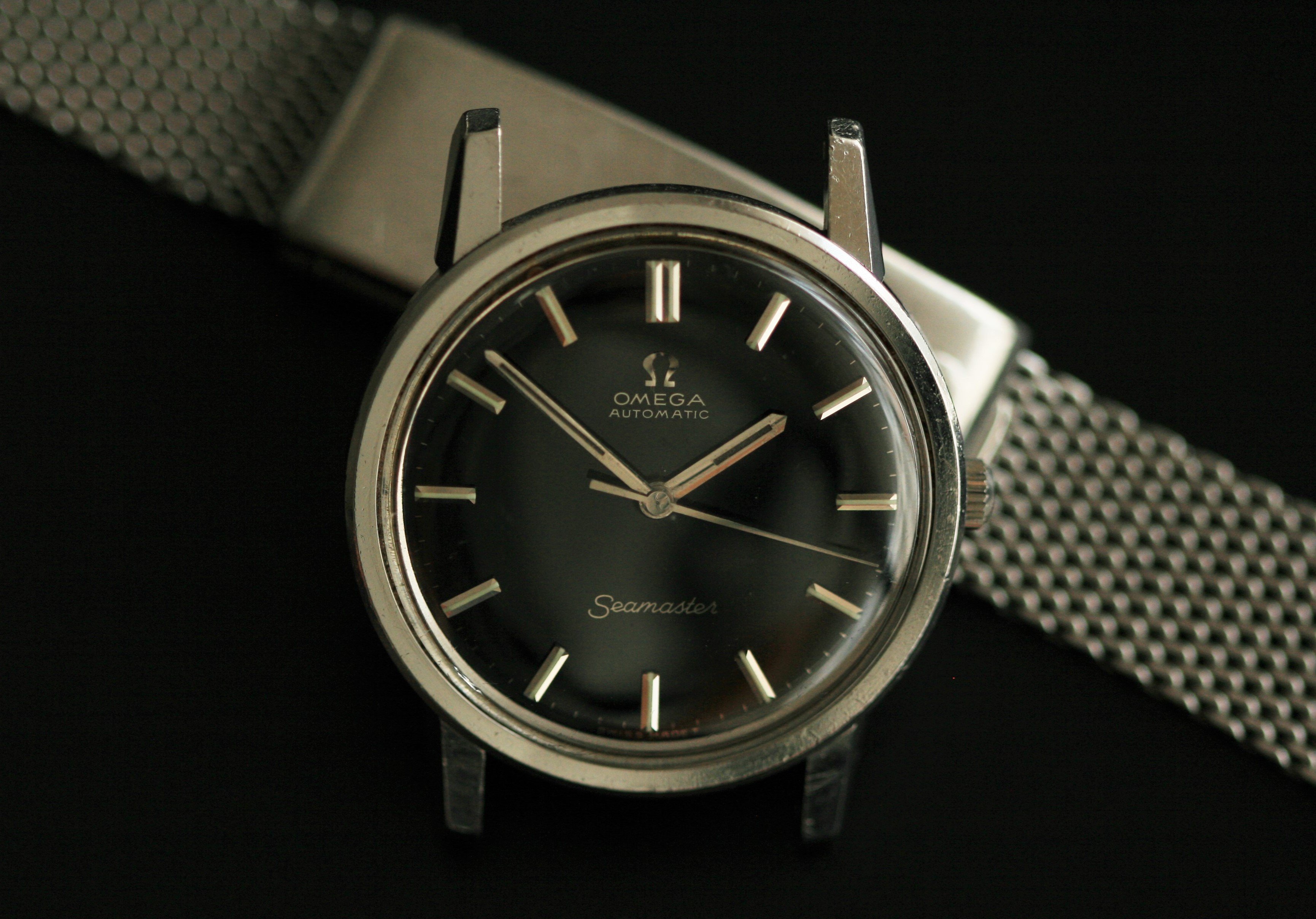 The black gloss dial is extremely beautiful, super glossy and with bright silver gilt lettering, quite tricky to find on this reference. Baton steel hands and markers and a signed Omega crystal.