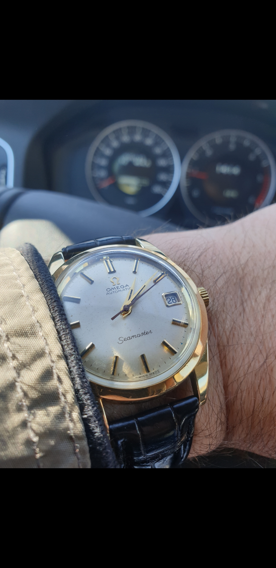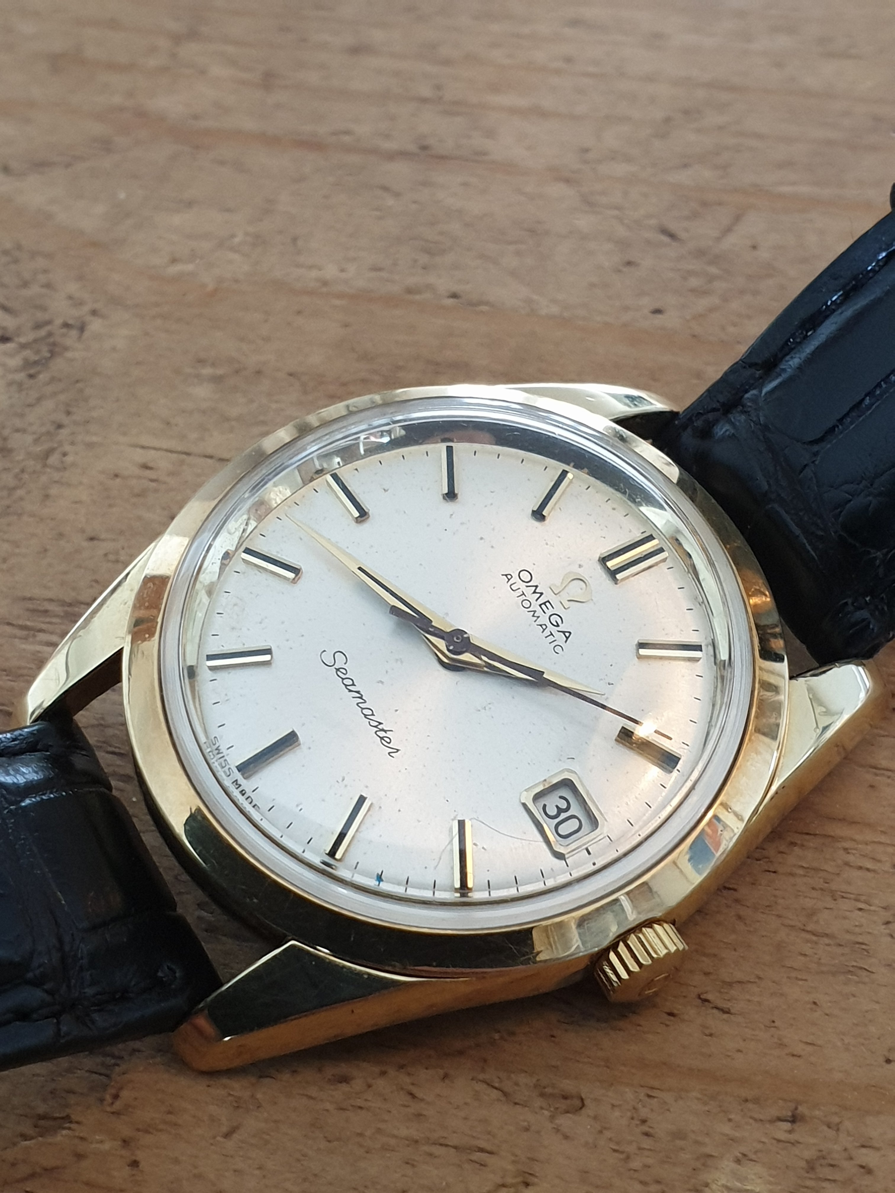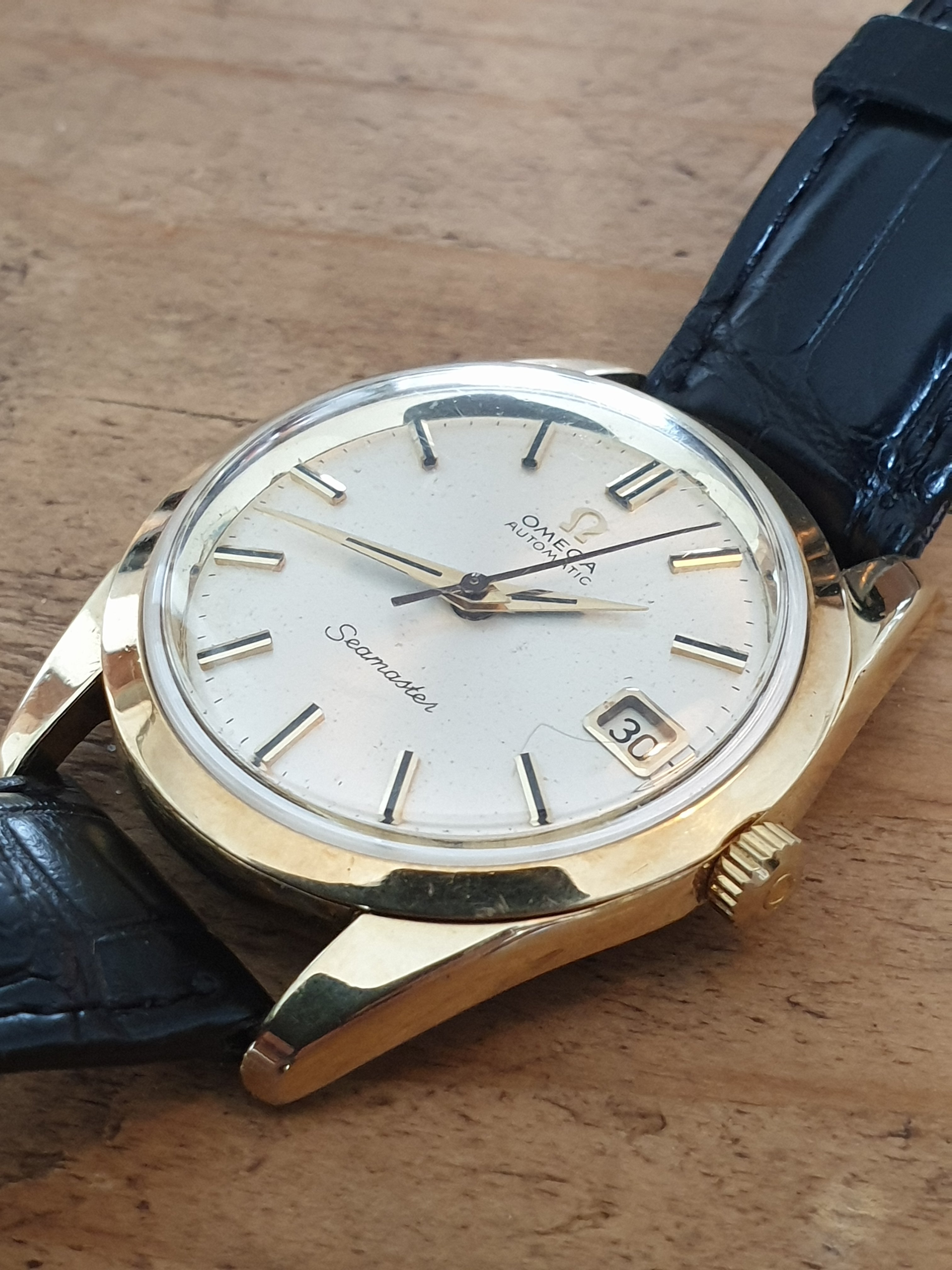 For sale today a Seamaster 166.010 from 1967. Goldplated case in good condition and measures 35mm. Dial has some spotting as can be seen on the pictures. Dauphine hands in good condition. Second hand was probably replaced. Original omega crown. Plexi is generic. Caseback with hippocampus logo still sharp. Caliber 565 with quickset function that works.