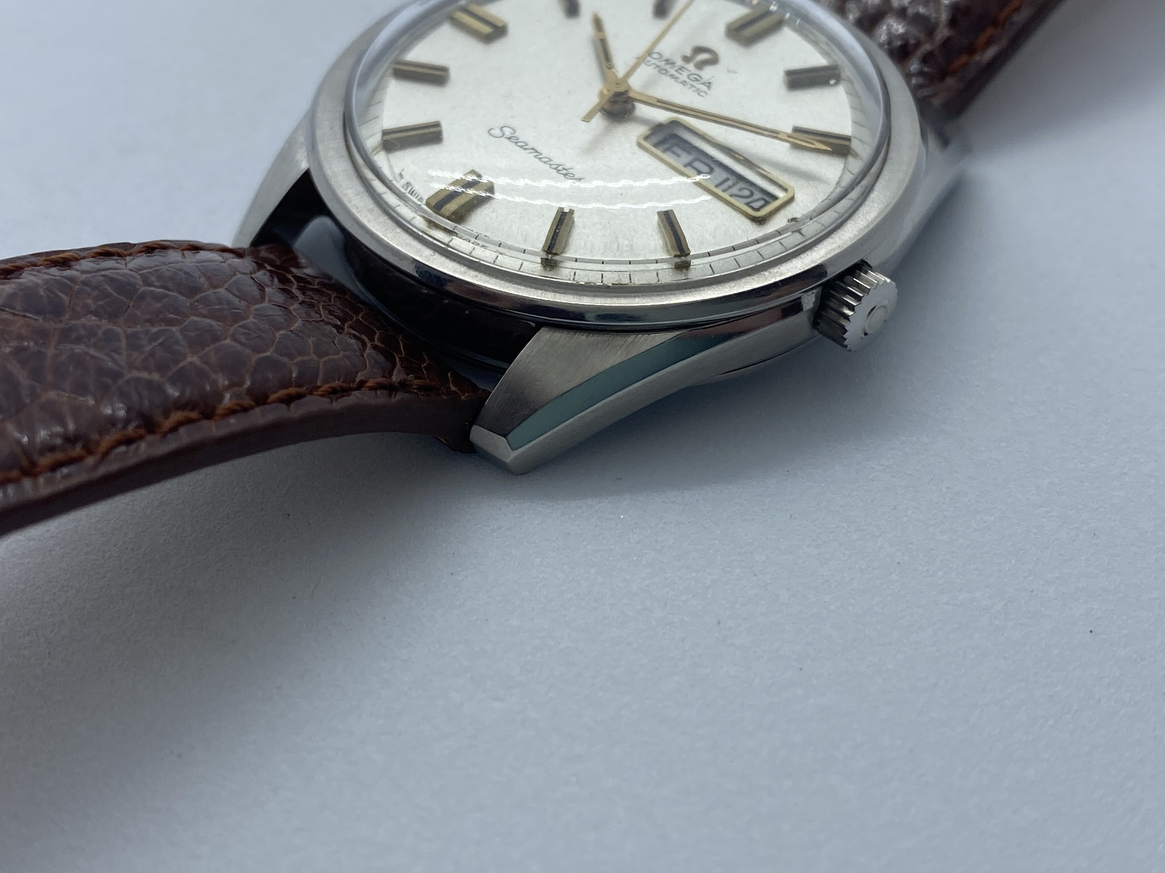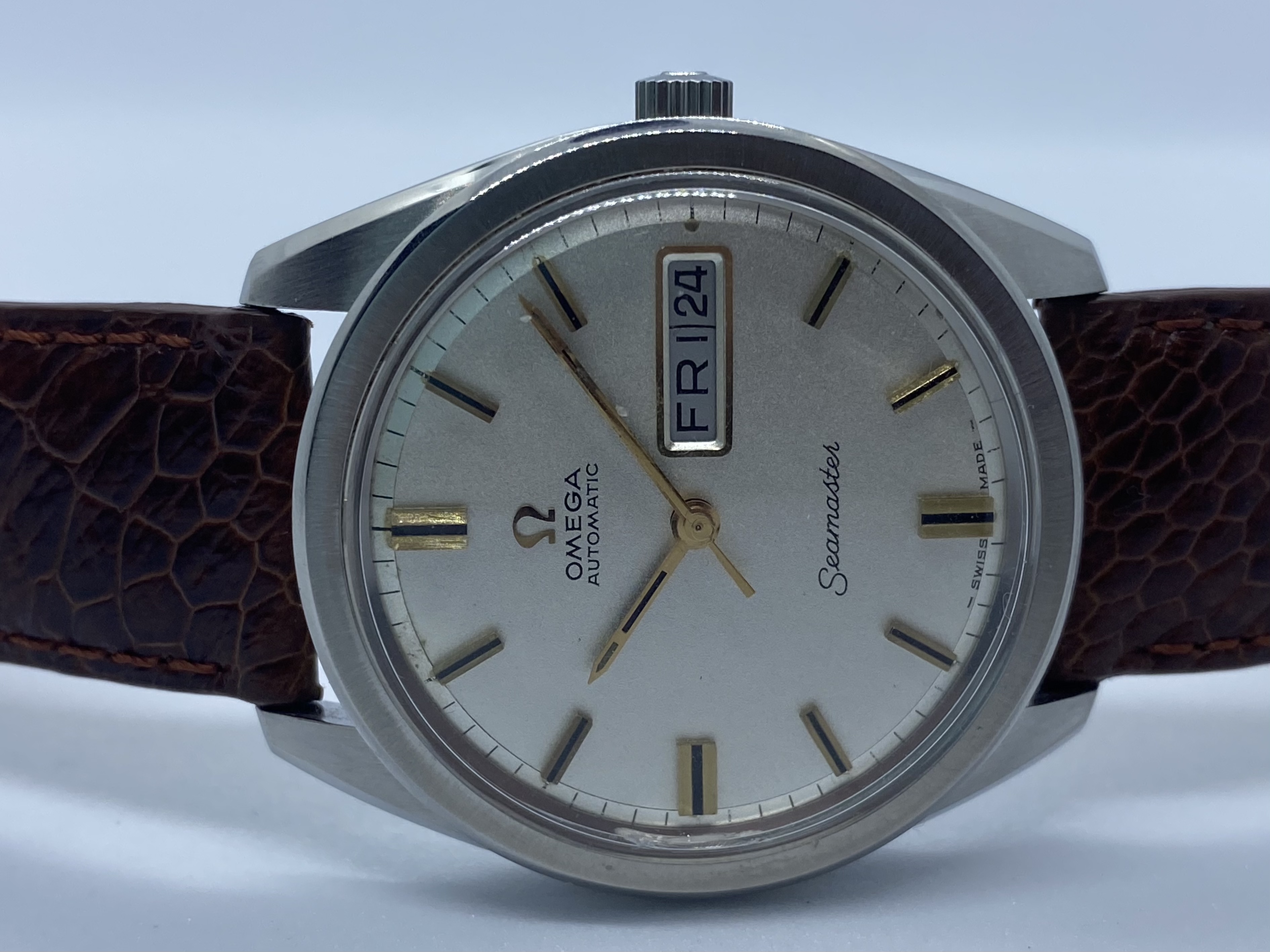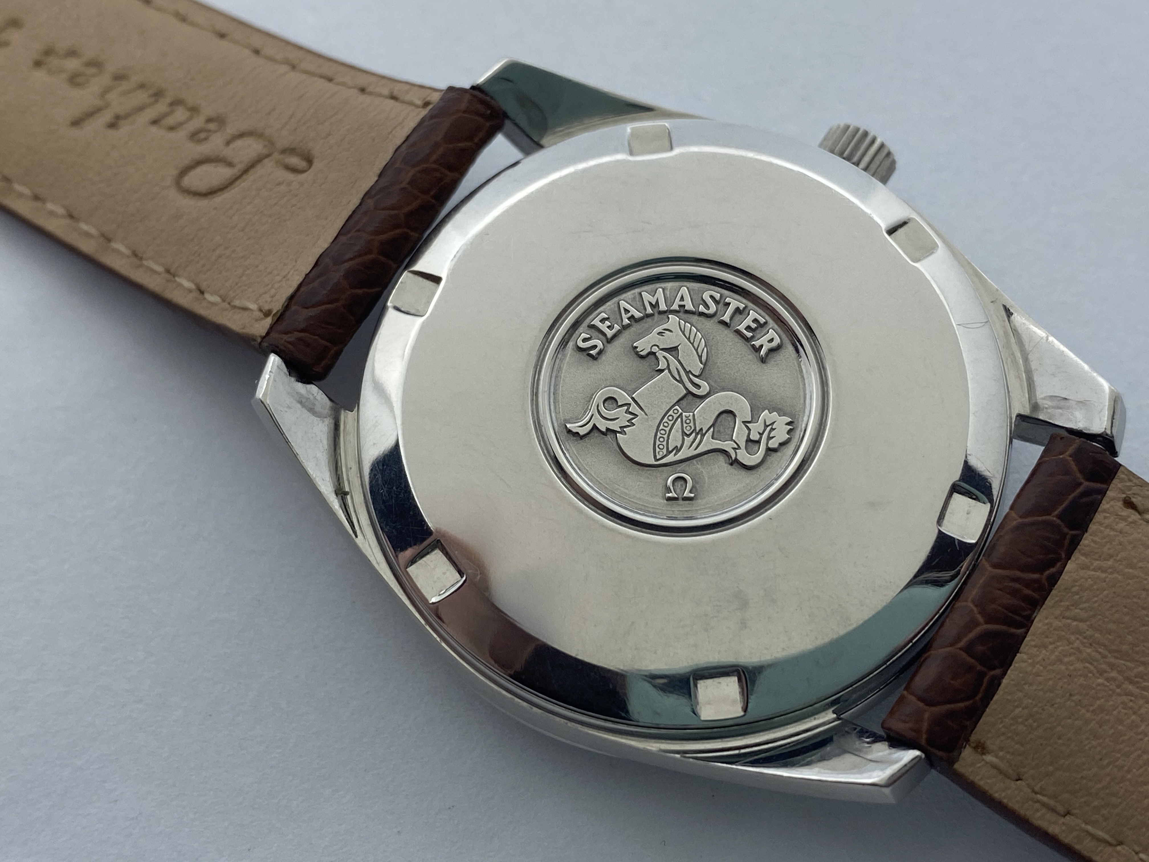 Case: Original 36mm stainless steel case looks great. Only minimal marks visible, original brushing fully intact, sharp edges and chamfers. Only the backside of the lugs show light traces of a bracelet, case back is in good condition, very sharp Seamaster medallion.
