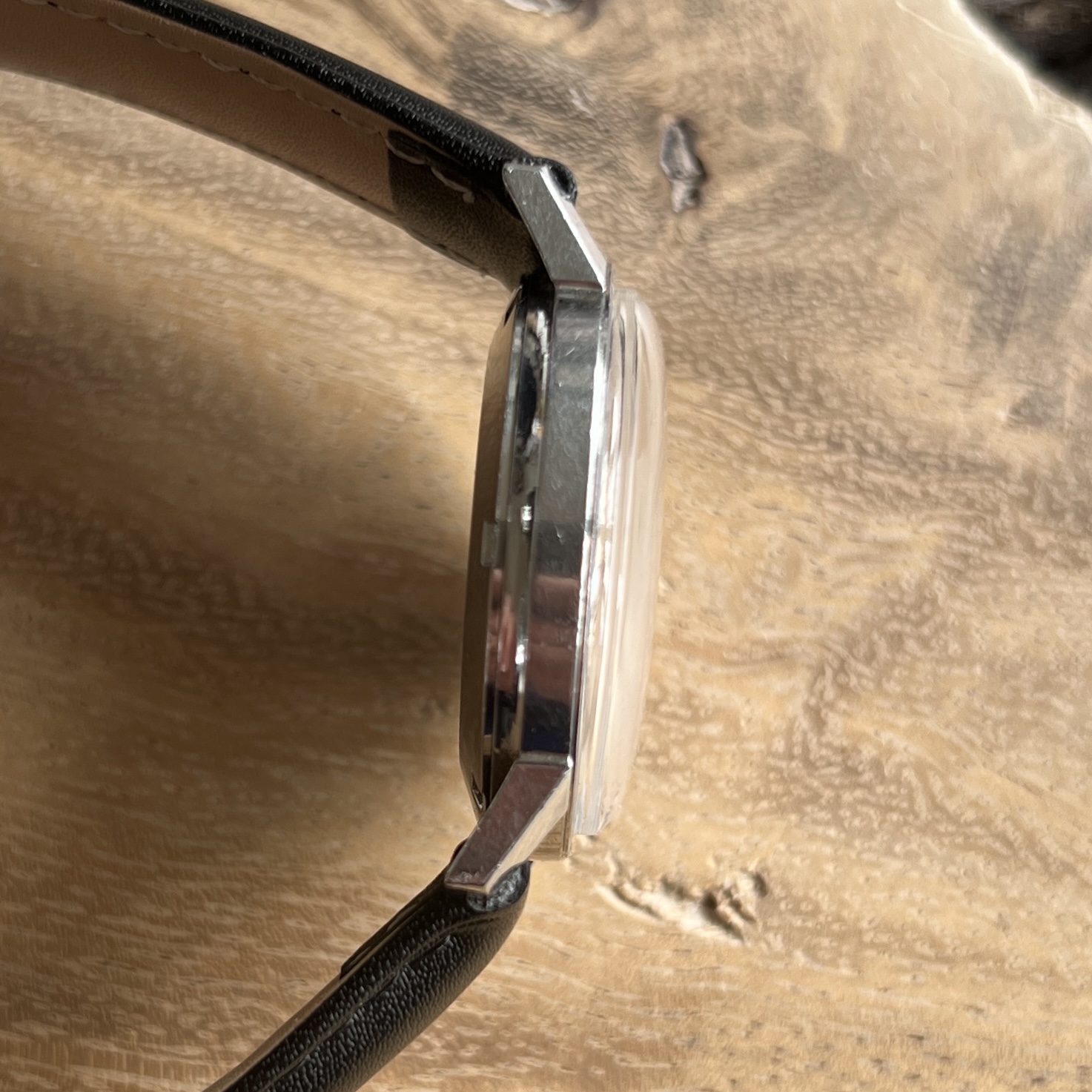 Bracelet: None. Comes with a rather fresh black leather strap (with unmarked buckle) fitting the watch nicely.