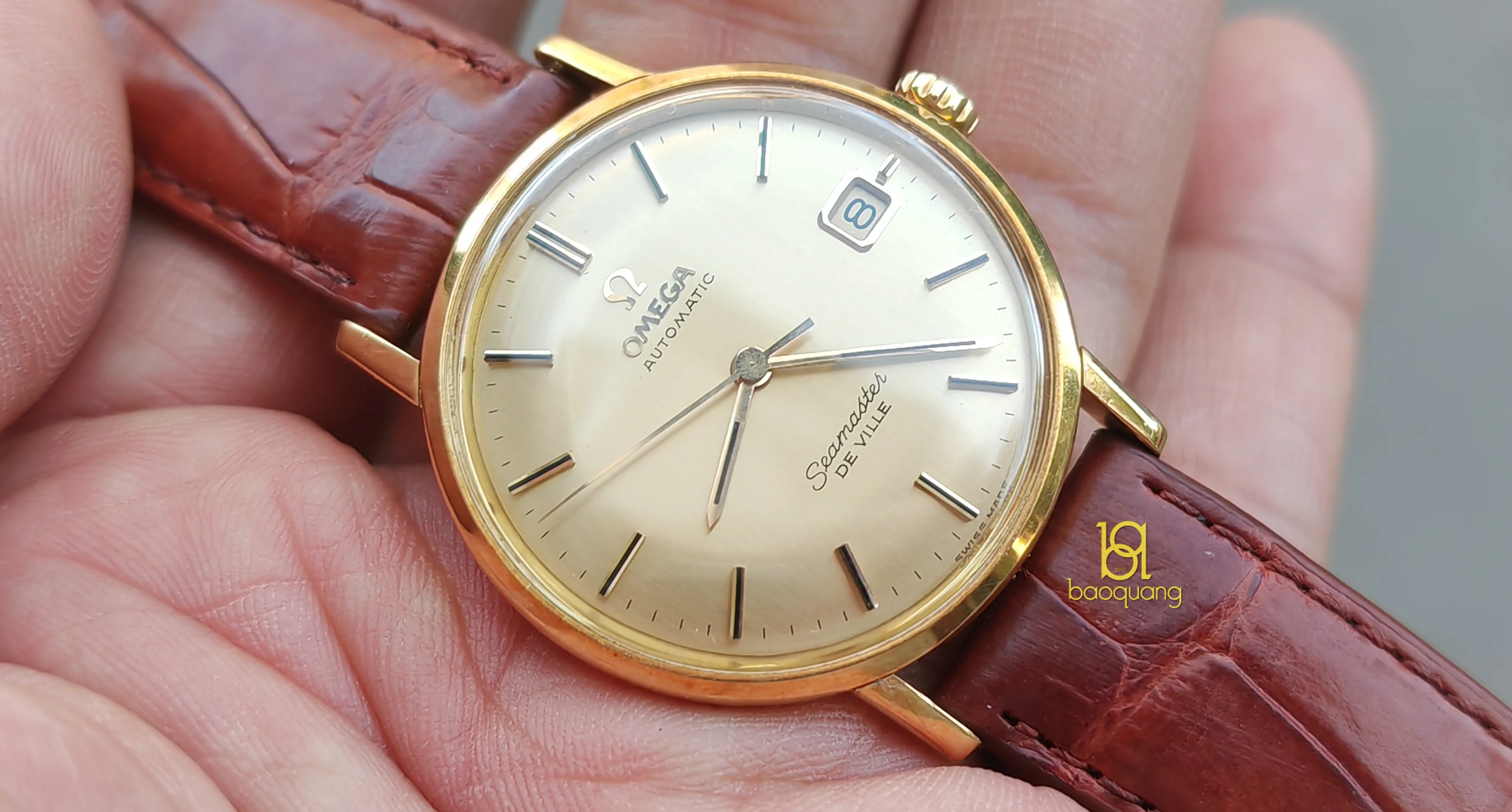 Description: The vintage 6x Omega Seamaster is in 18K yellow gold case, 18K yellow gold dial, 18K yellow gold hands and indexes (with onyx). Date quick change function (interesting solution, with pull / push of the crown). Clear crystal, however non-signed. Very good condition. Original crown. Functional and keeping good time. A brand new leather strap is installed with aftermarket Omega signed buckle.