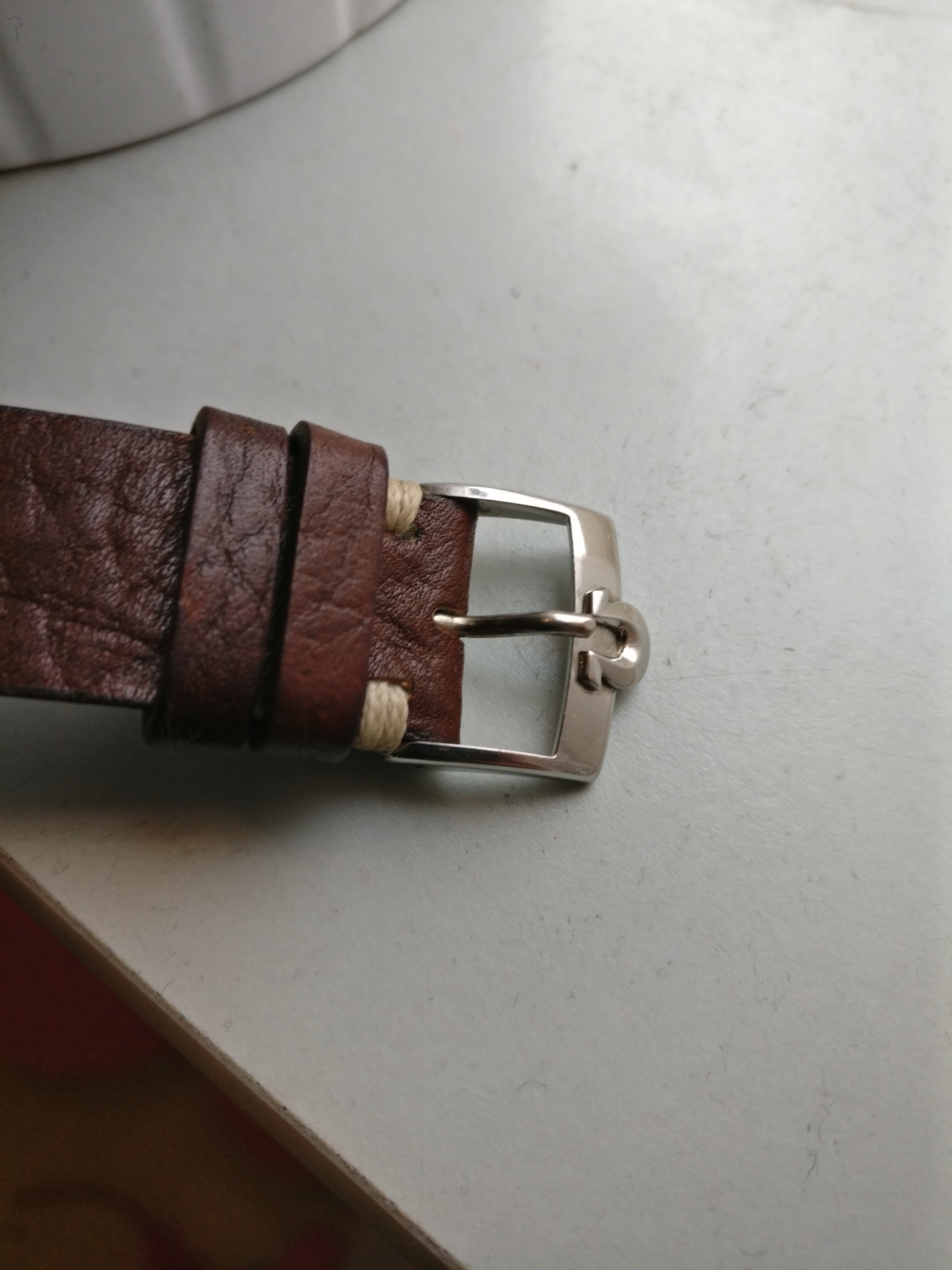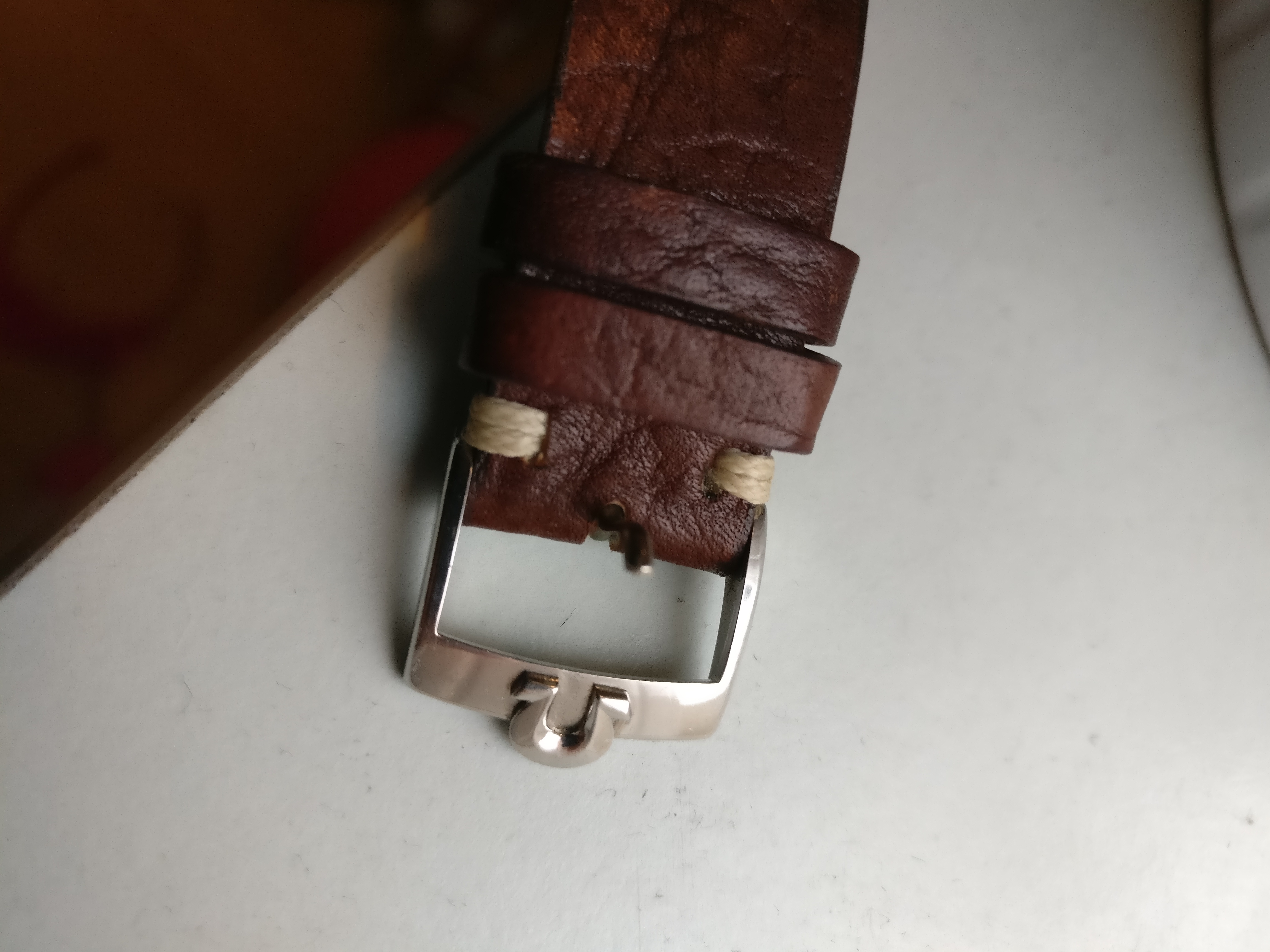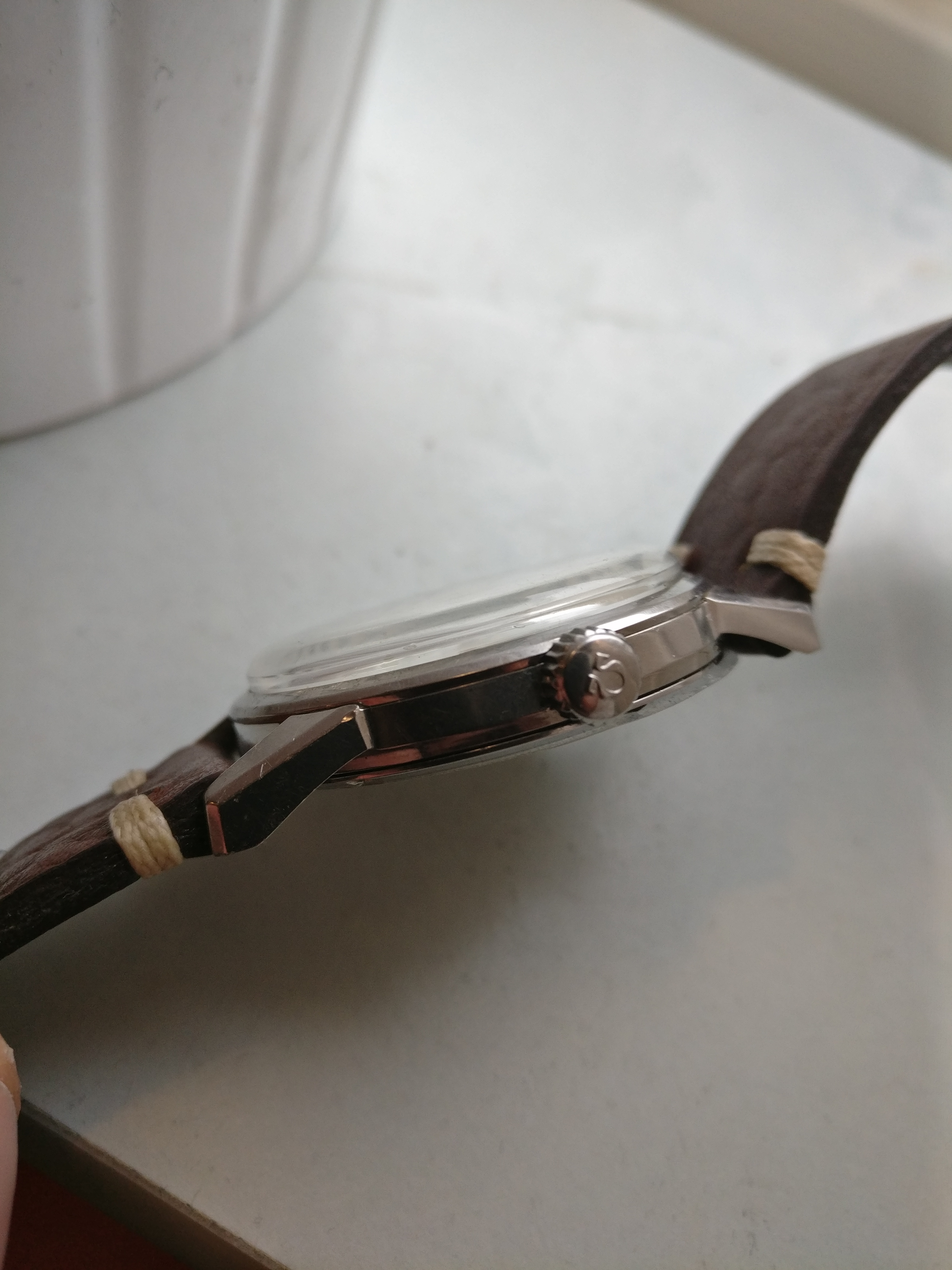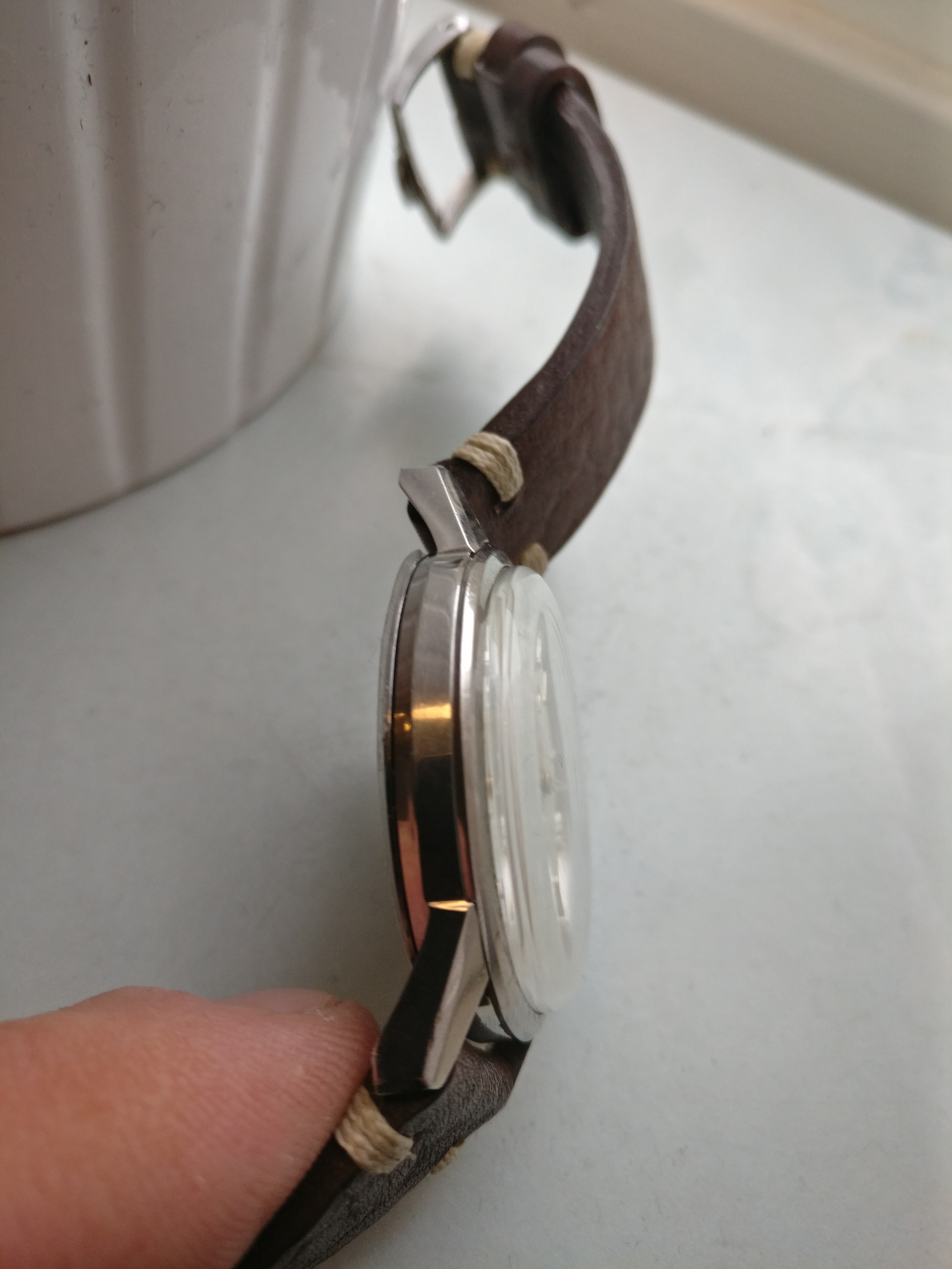 Bracelet: Not original to the watch, Brown leather with buckle