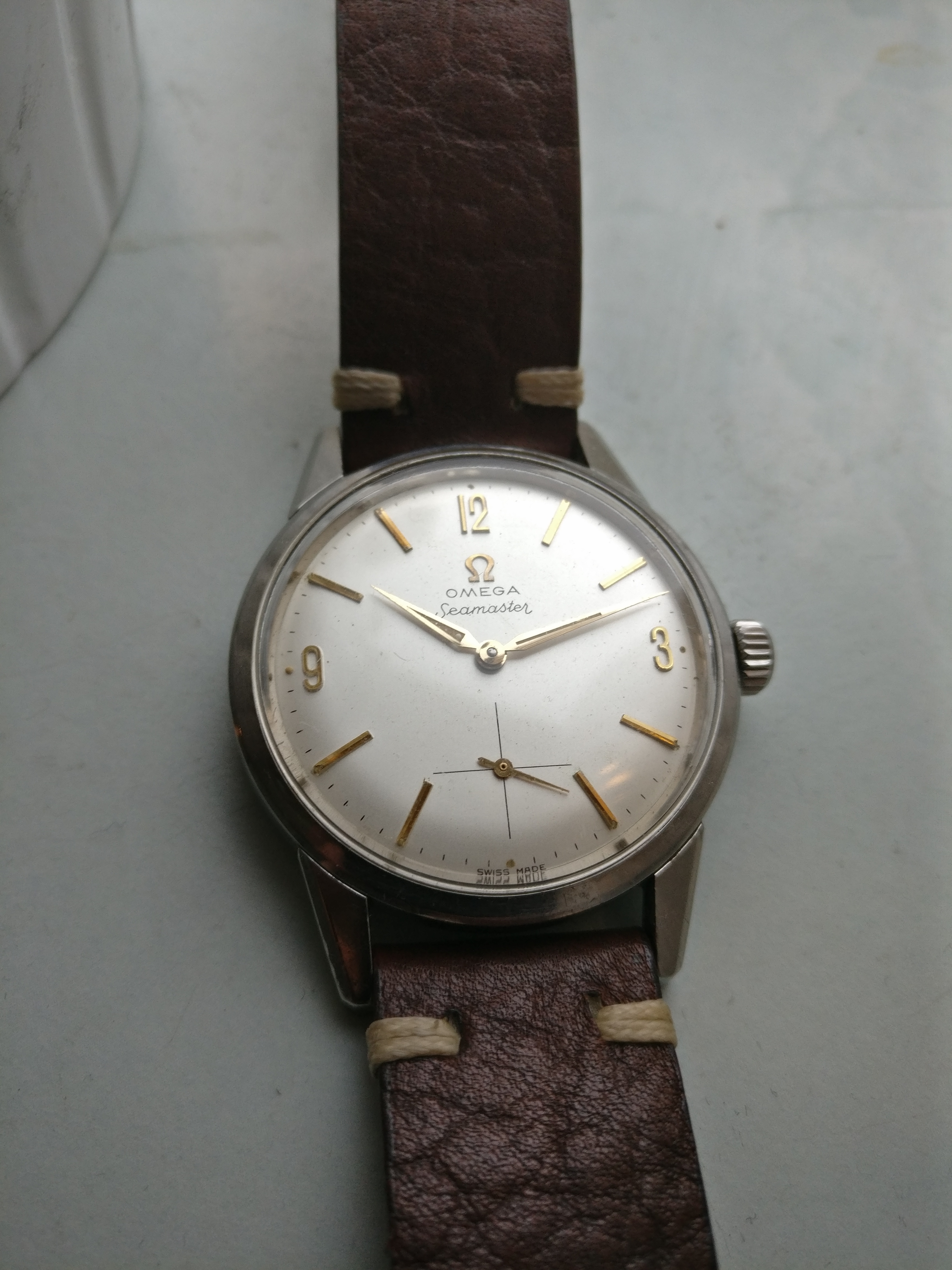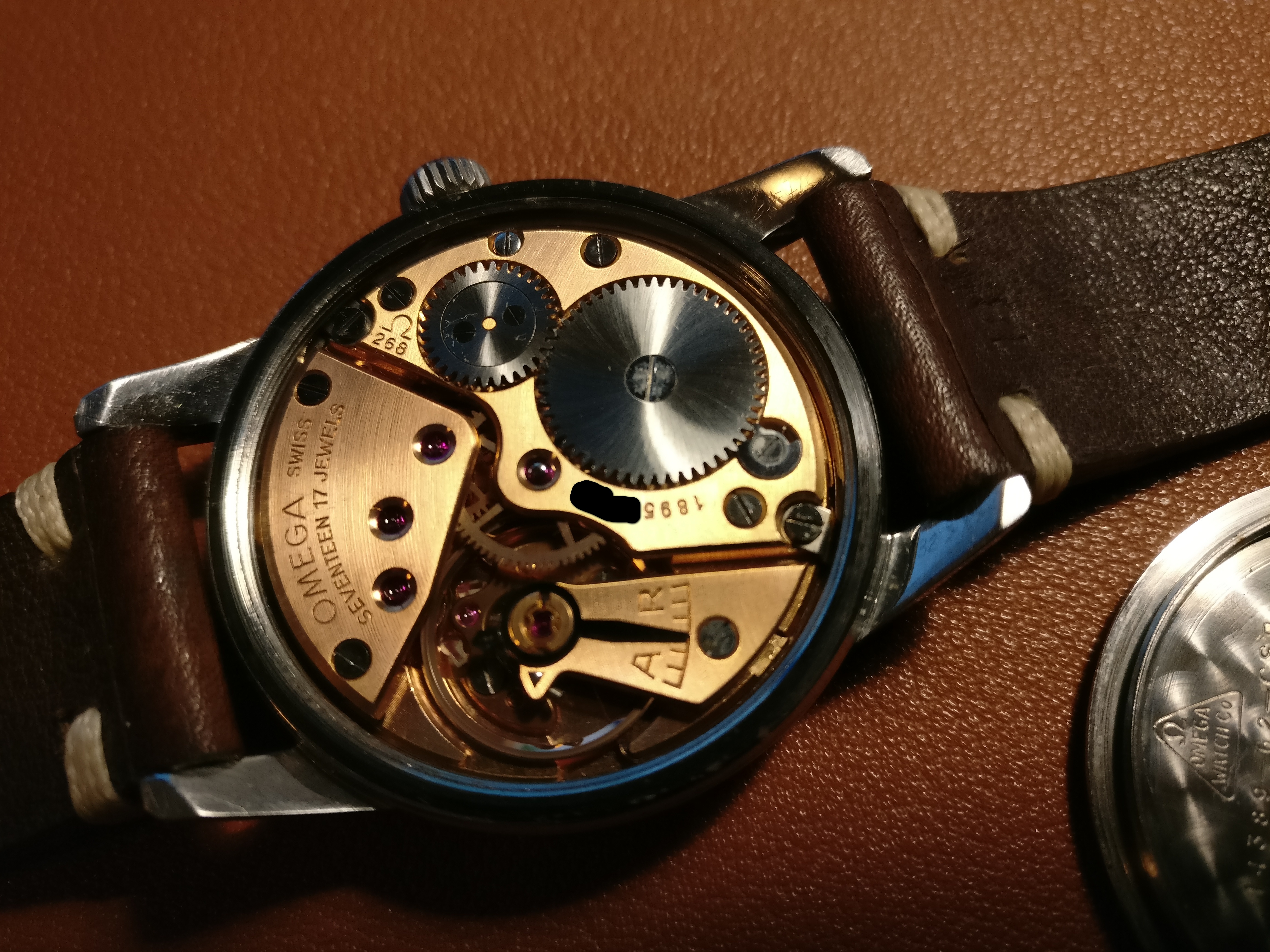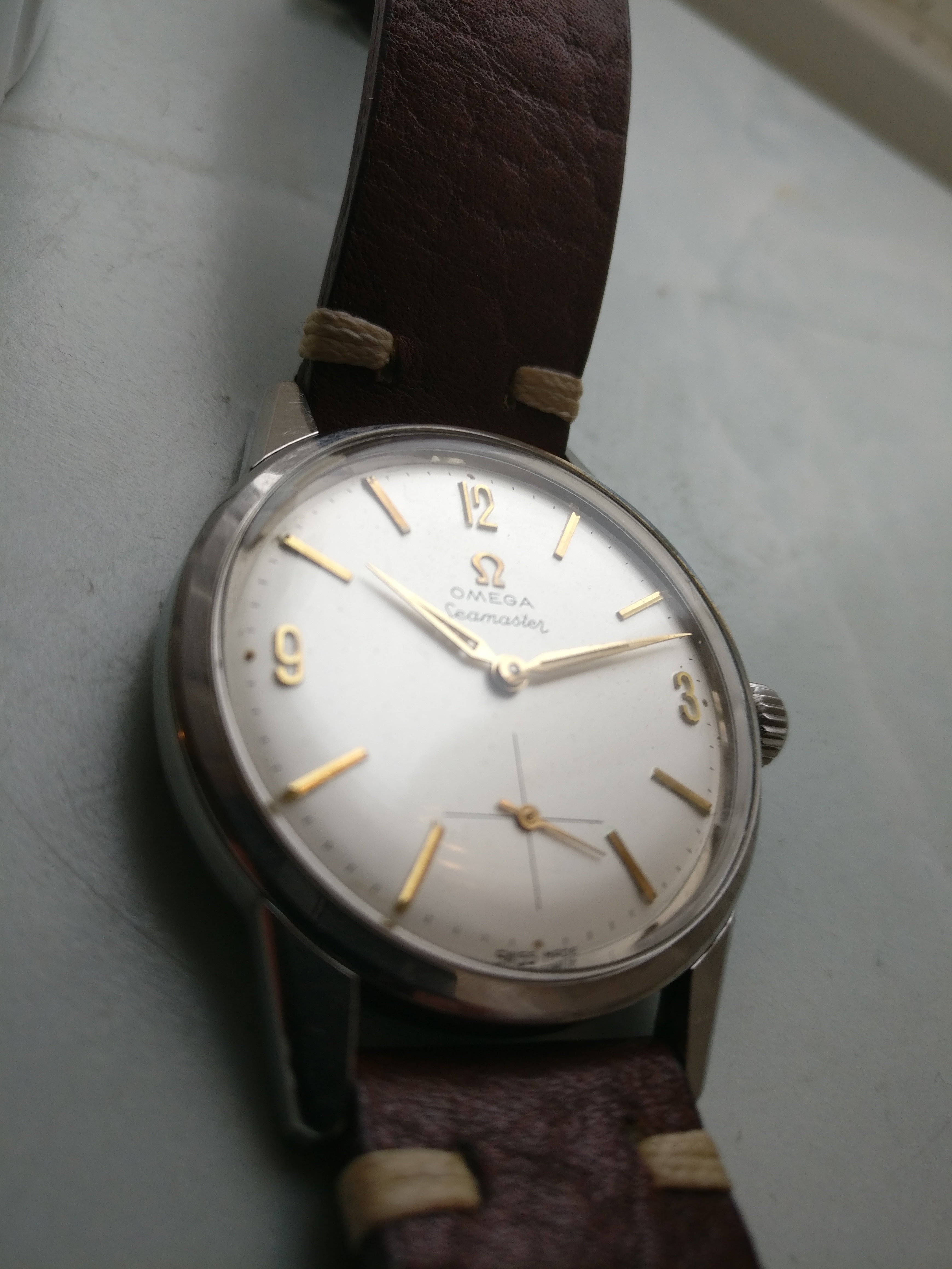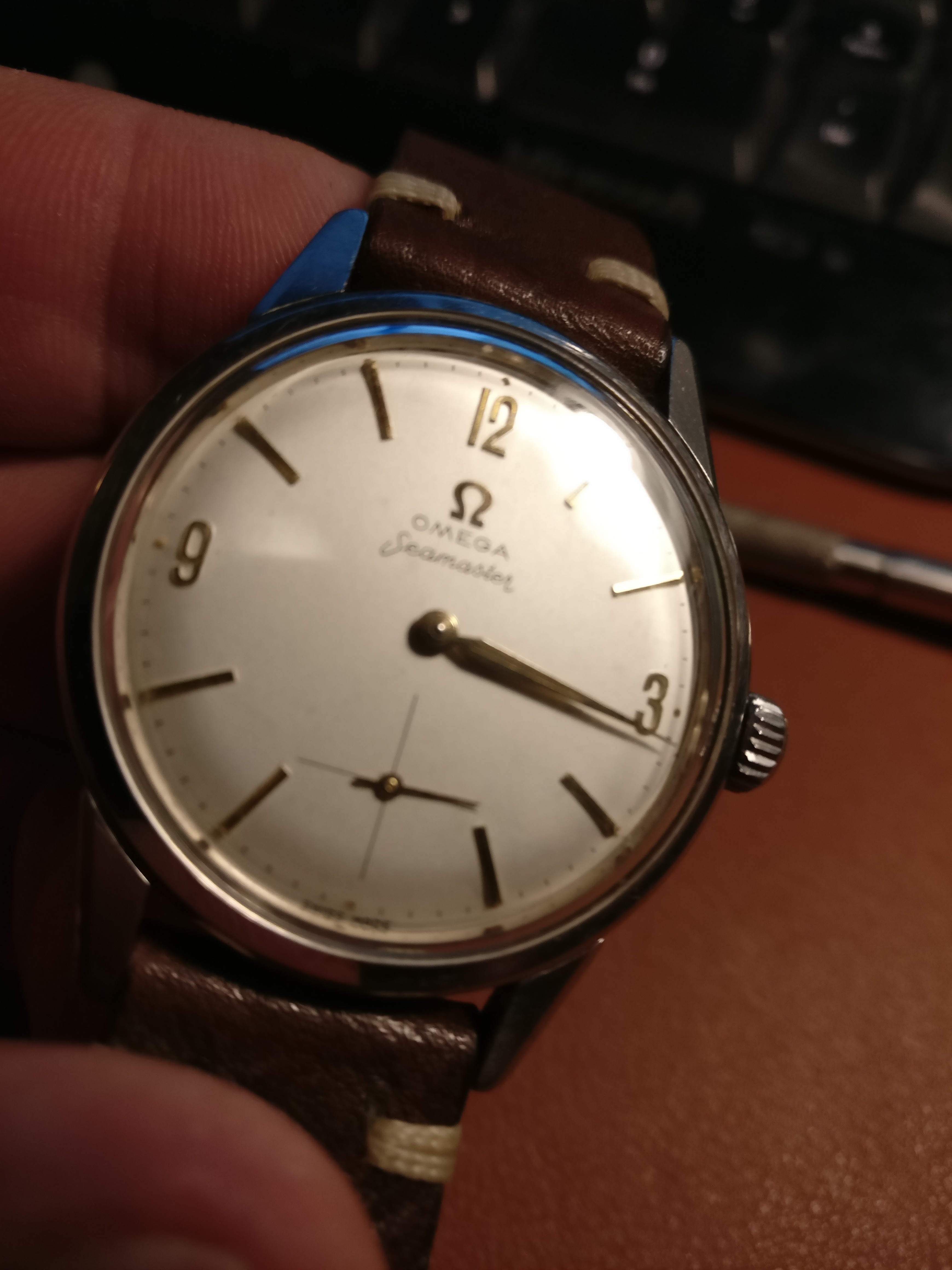 Bracelet: Not original to the watch, Brown leather with buckle