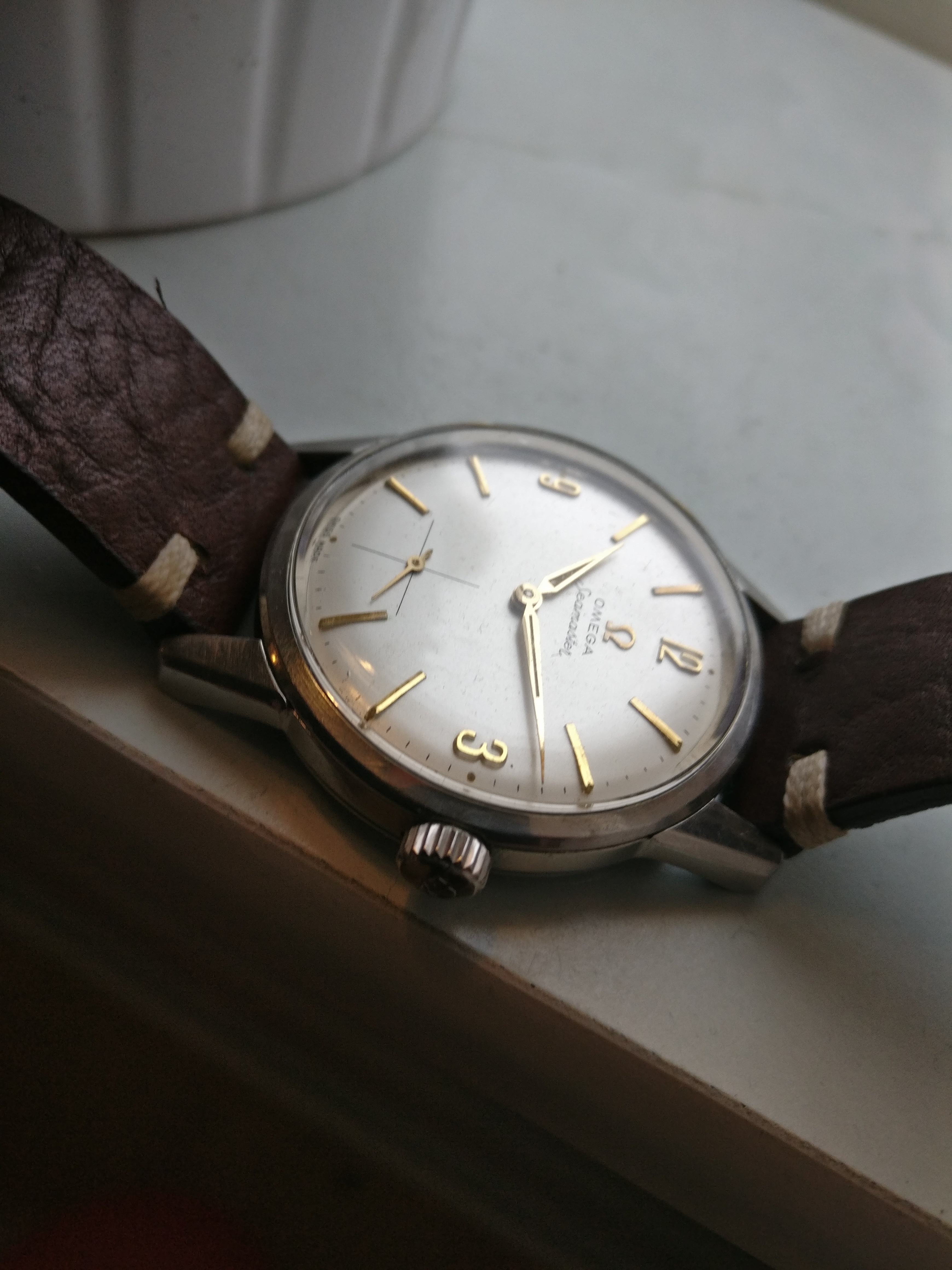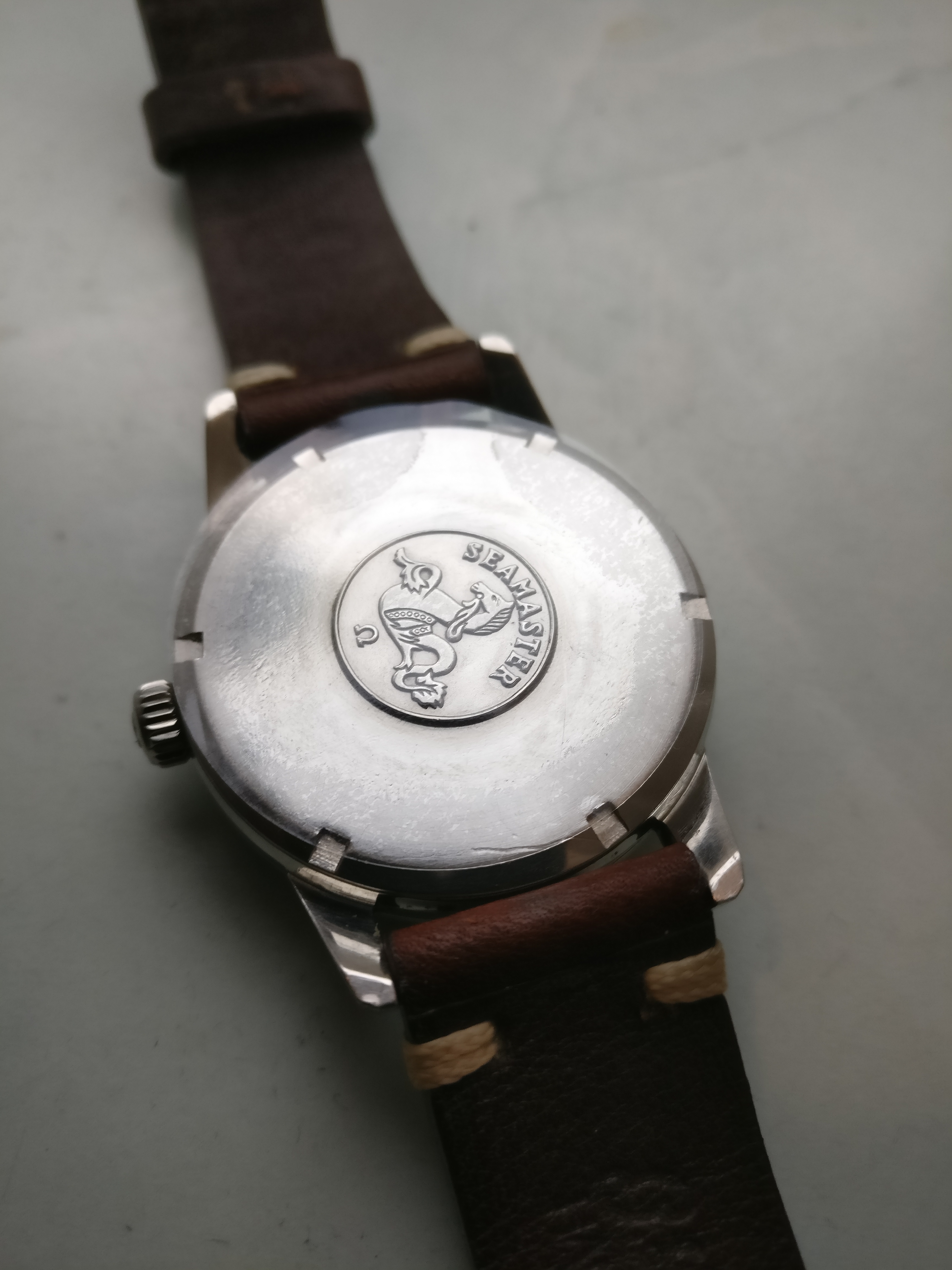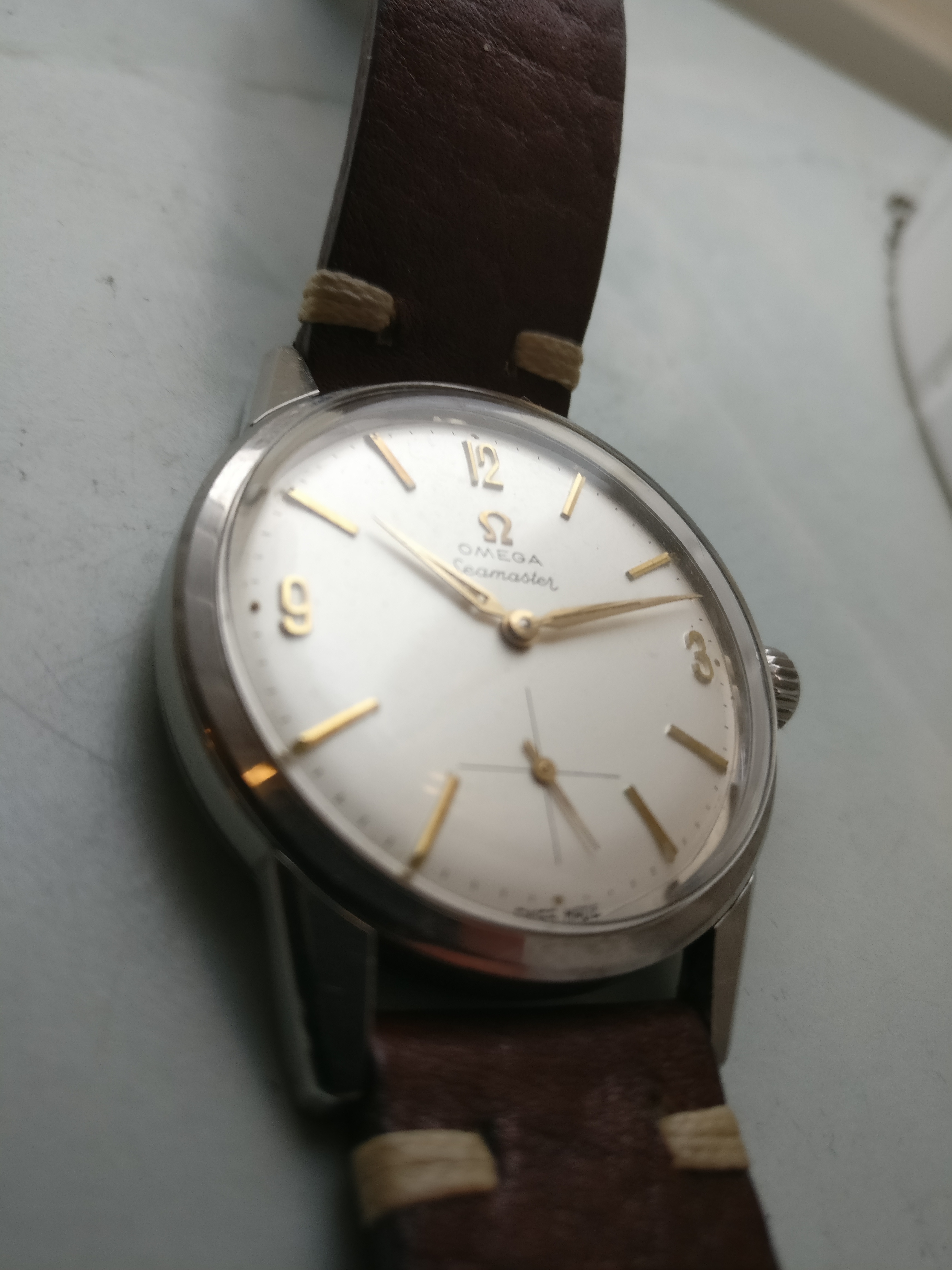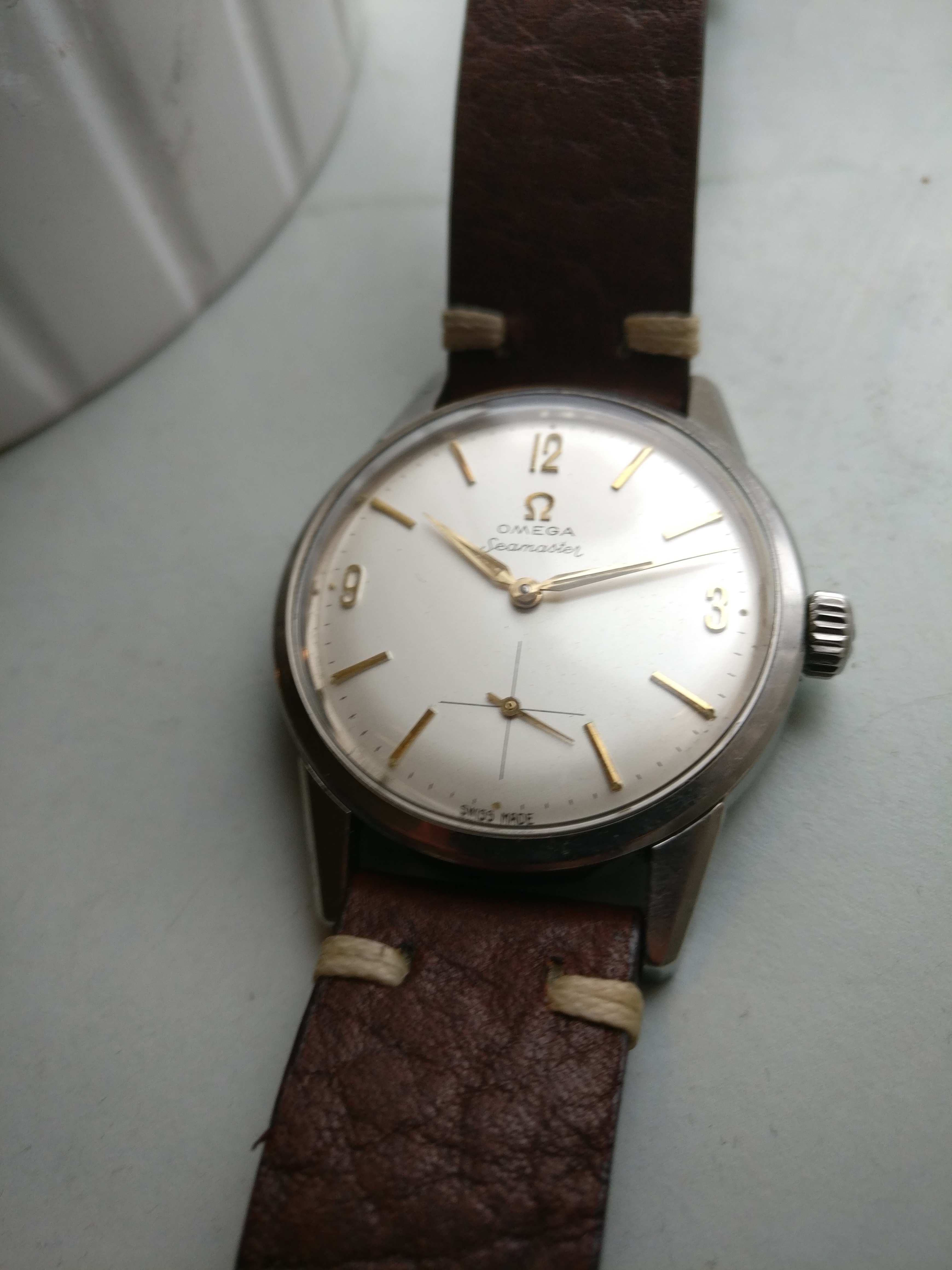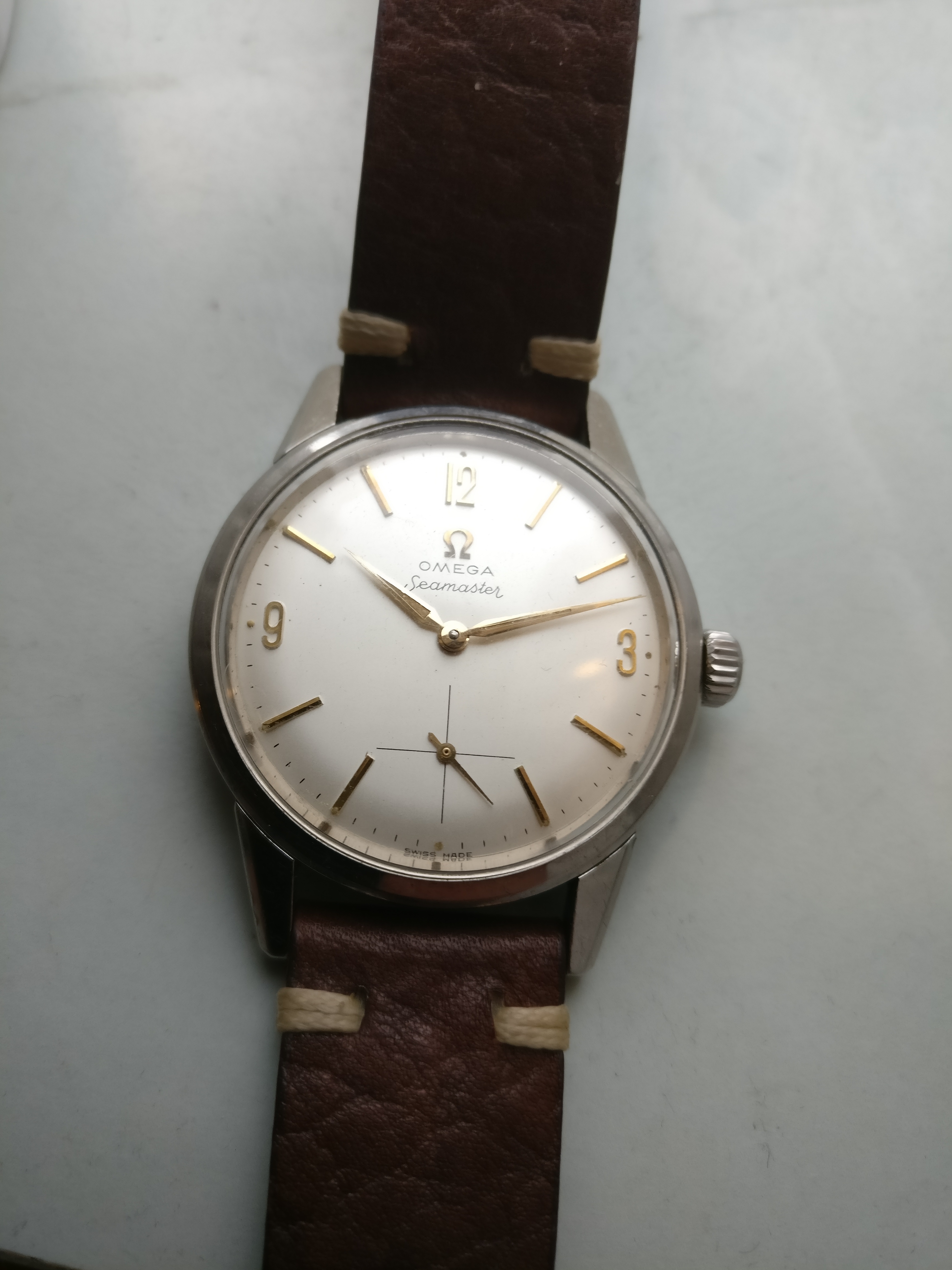 Bracelet: Not original to the watch, Brown leather with buckle