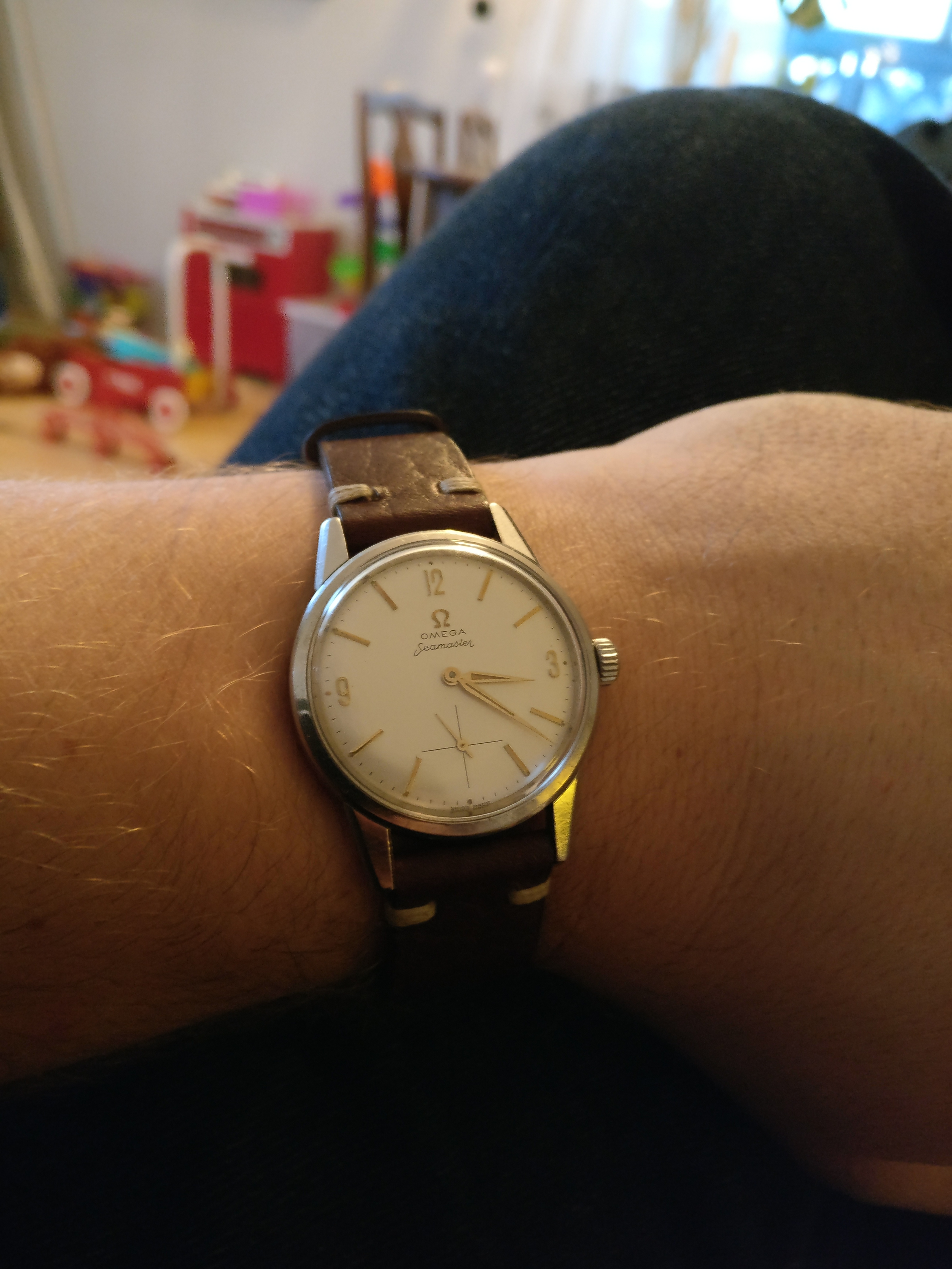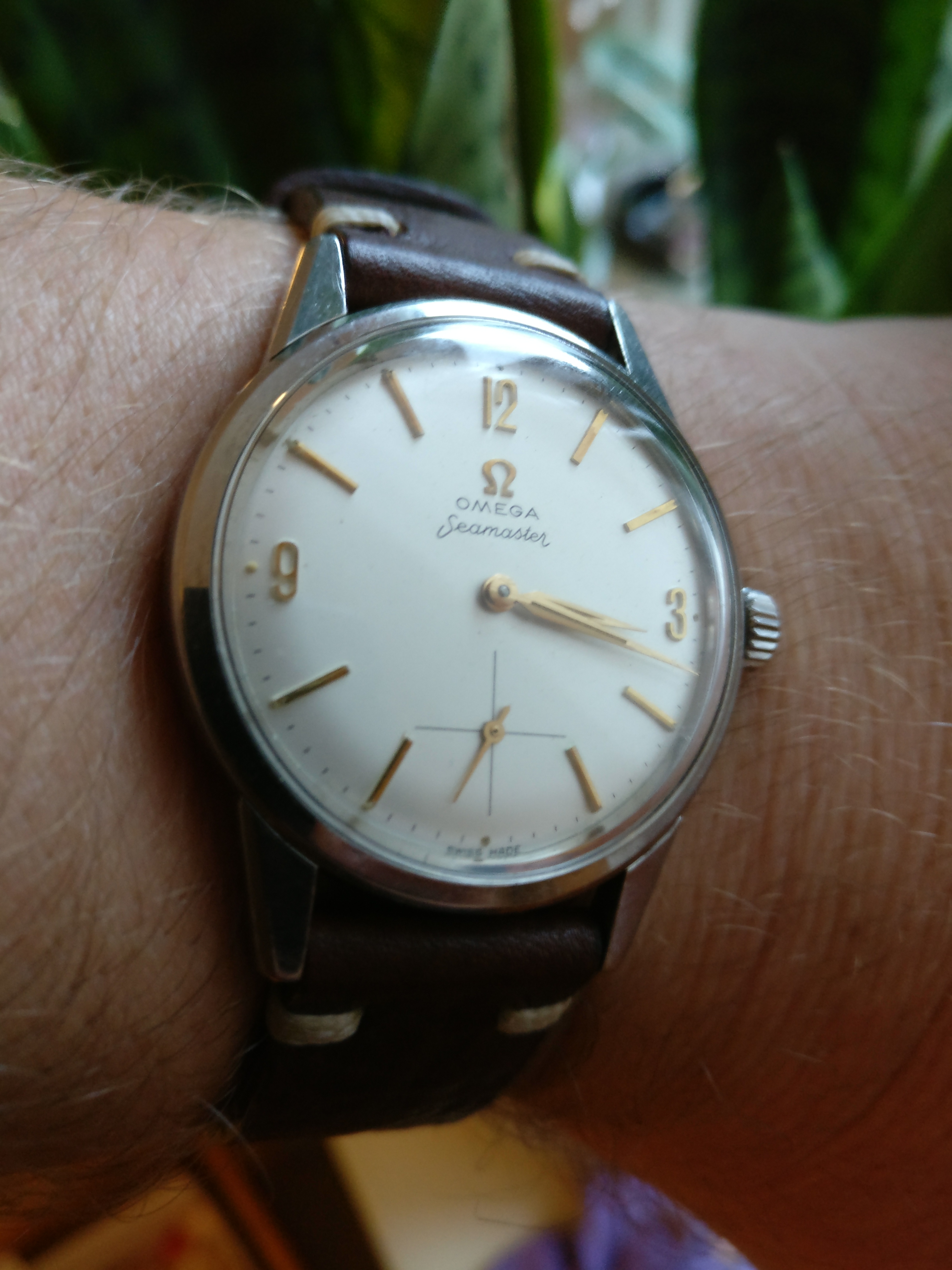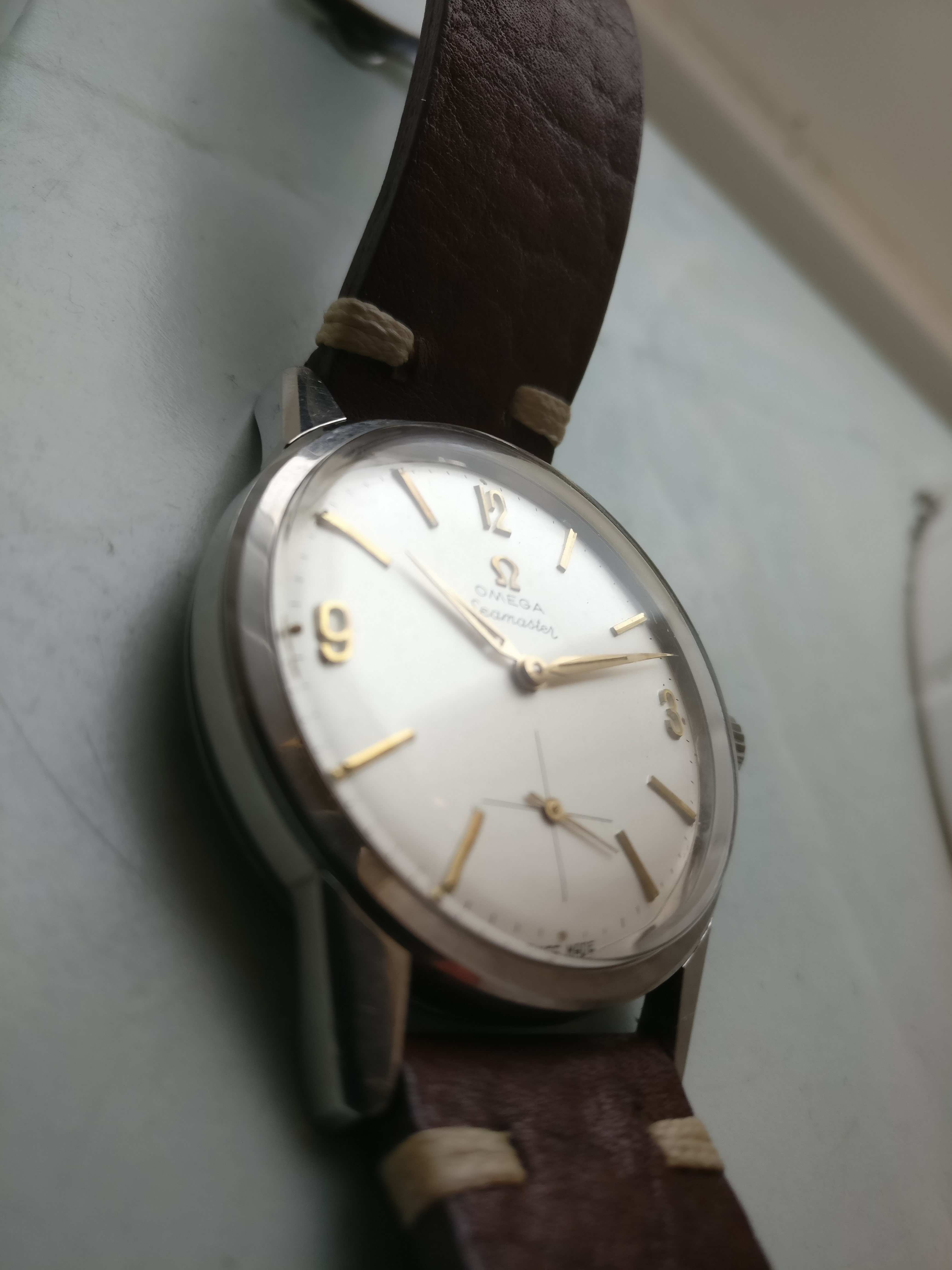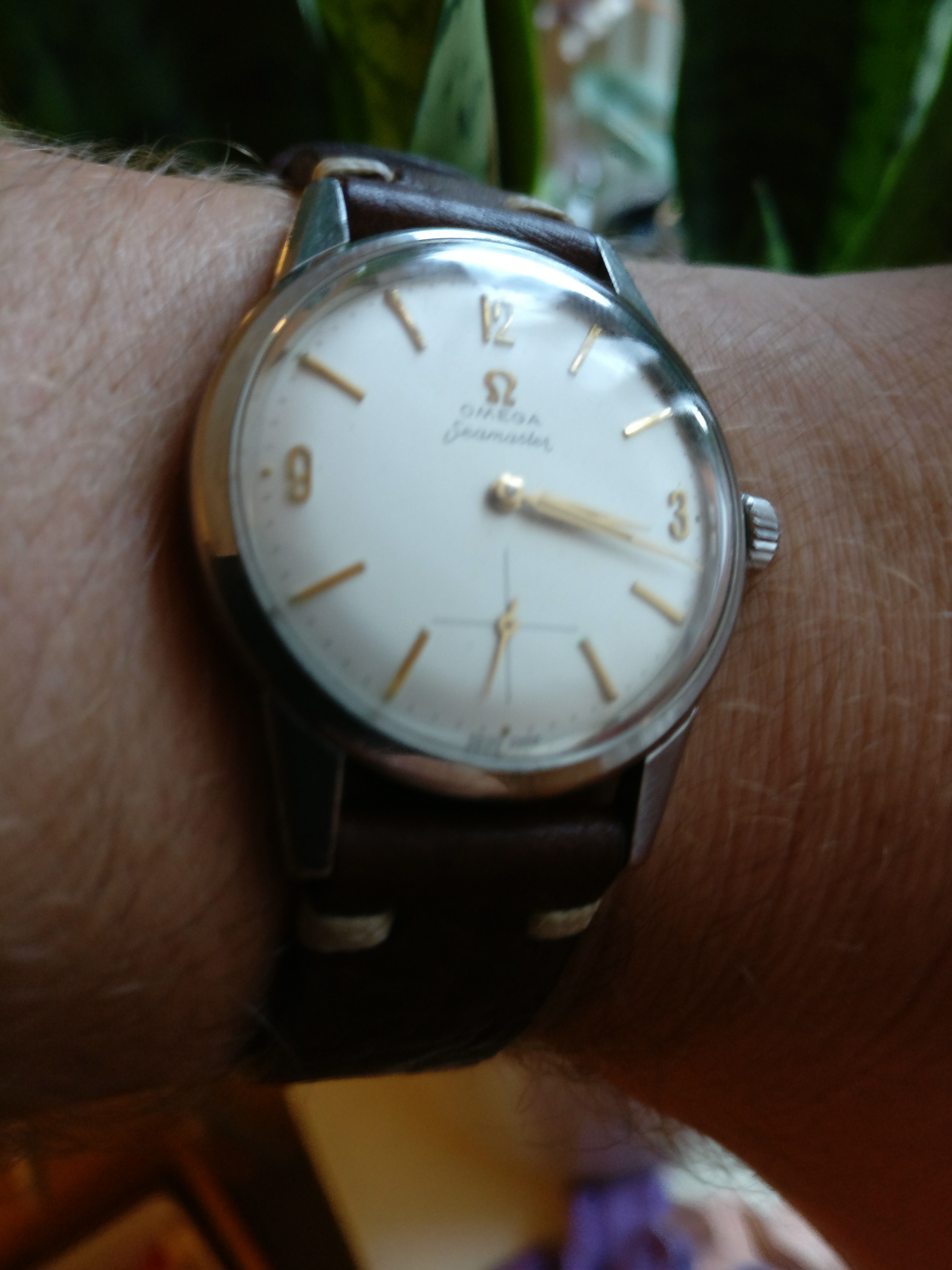 Bracelet: Not original to the watch, Brown leather with buckle