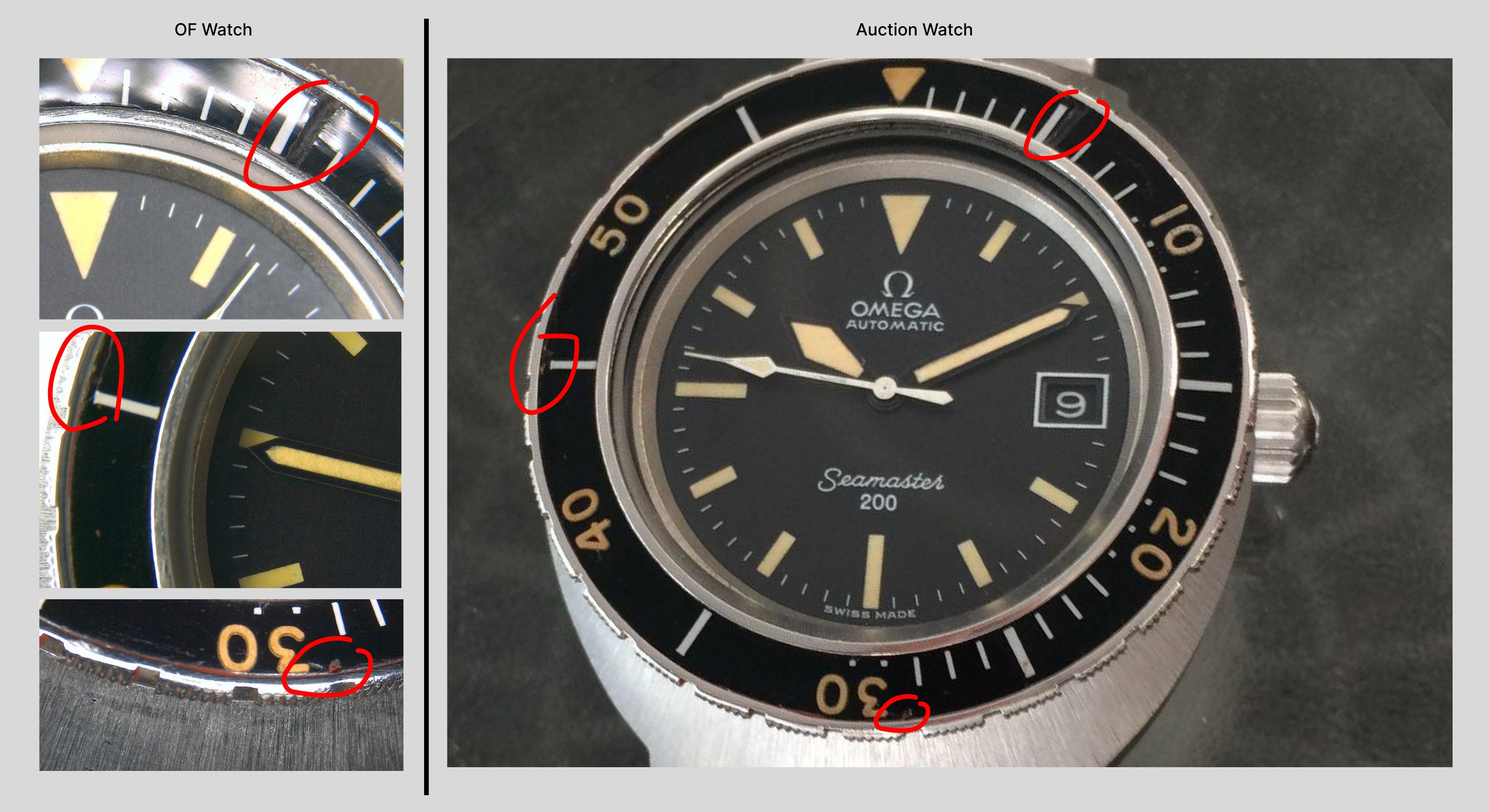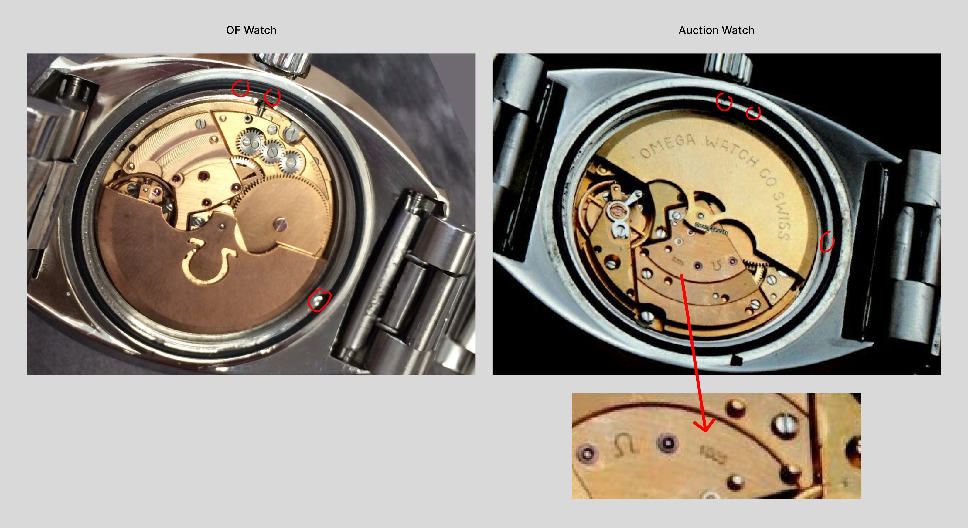 As you can see from the photos that I've attached and the link above it's obvious that the watch on the right (the ‘auction watch’) has the same bezel damage etc as the OF watch. The one main difference seems to be the movement, which has either been totally replaced or had some work done on it, mainly a new rotor. The other thing is that it's close to impossible to read the caliber number but it should be 1002. These are the only pictures of the movement that are supplied as such I'm feeling a bit of trepidation around the potential purchase.
