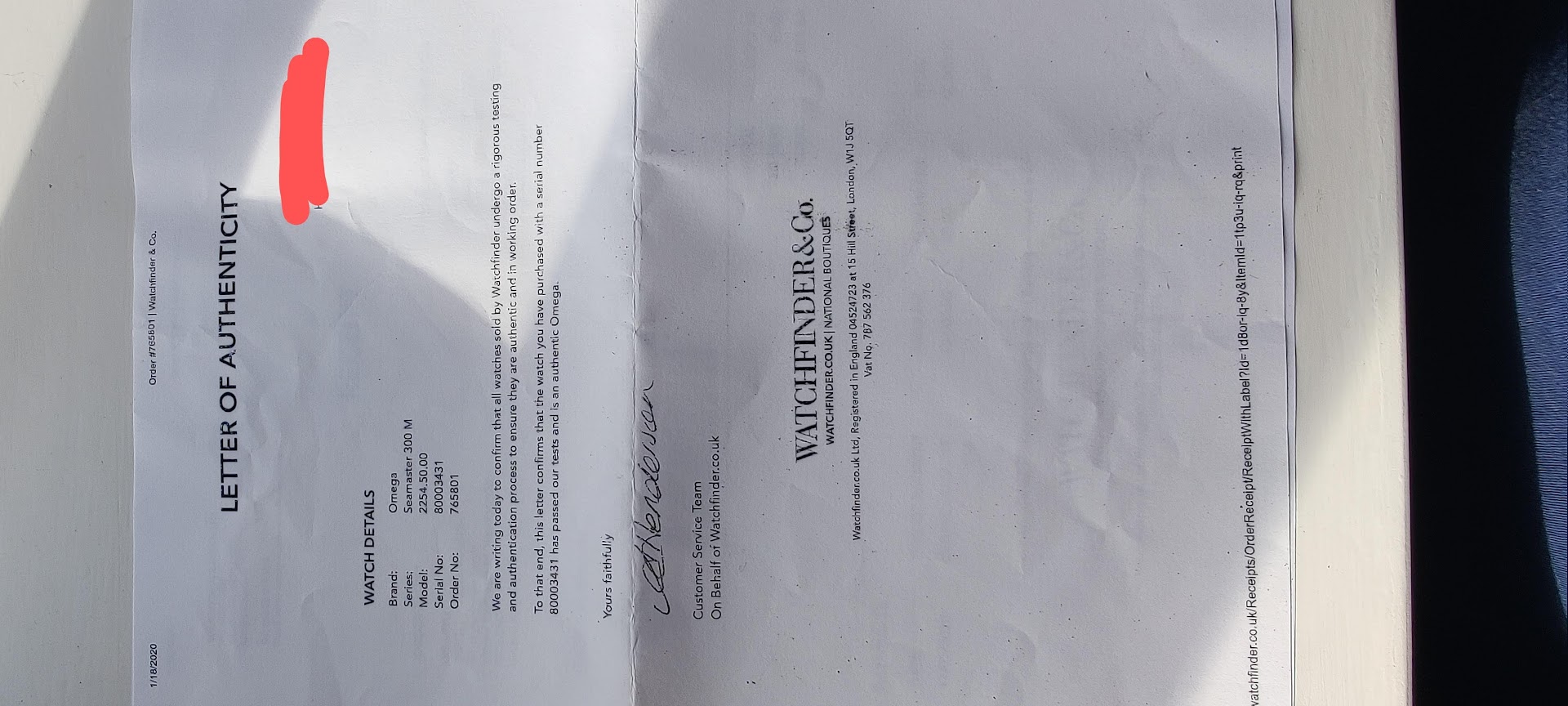 Some additional information, I purchased this with a Watch Finder letter of authenticity which will be included in the sale, and a 24 month warranty from 17/01/2020.