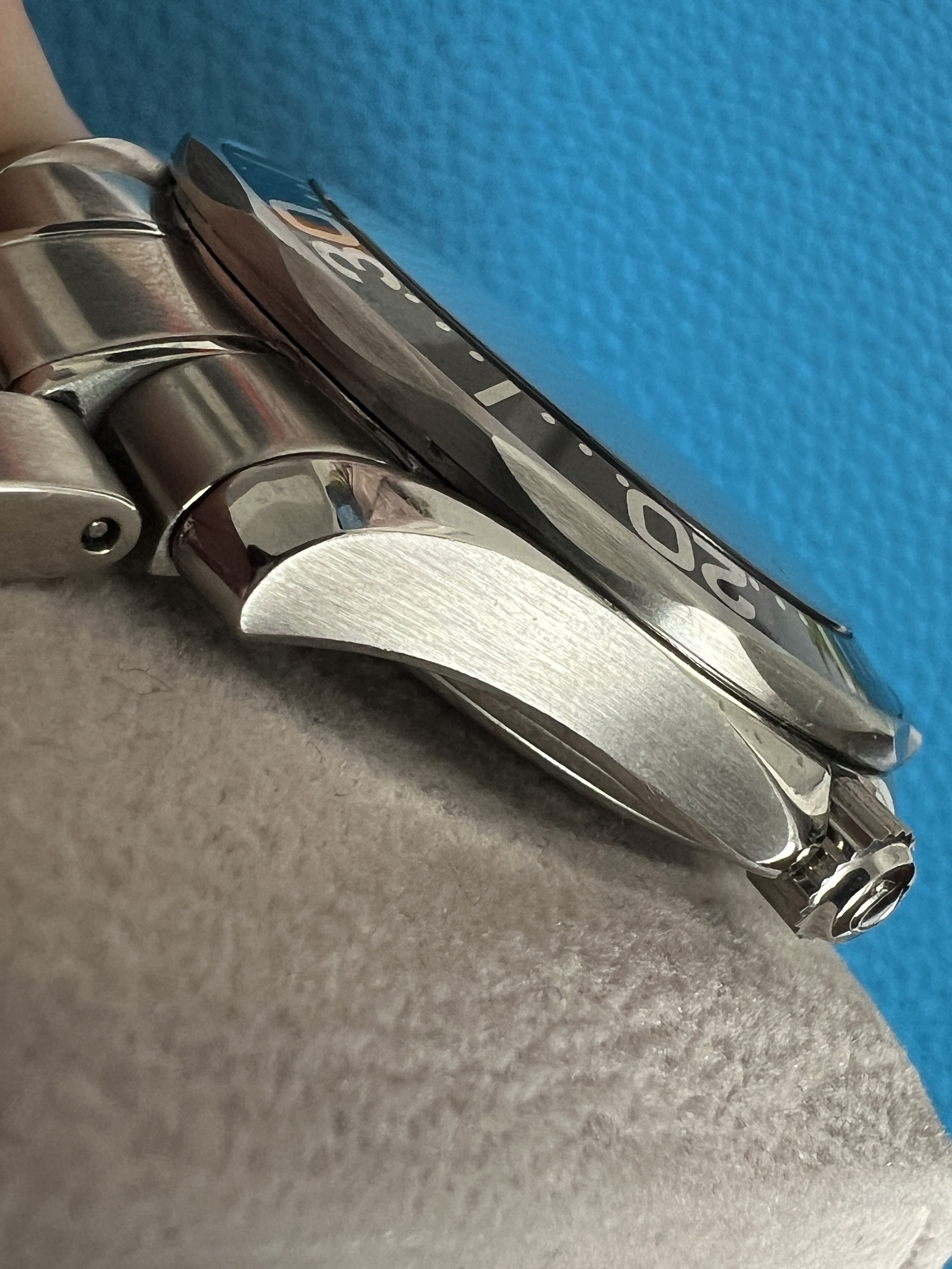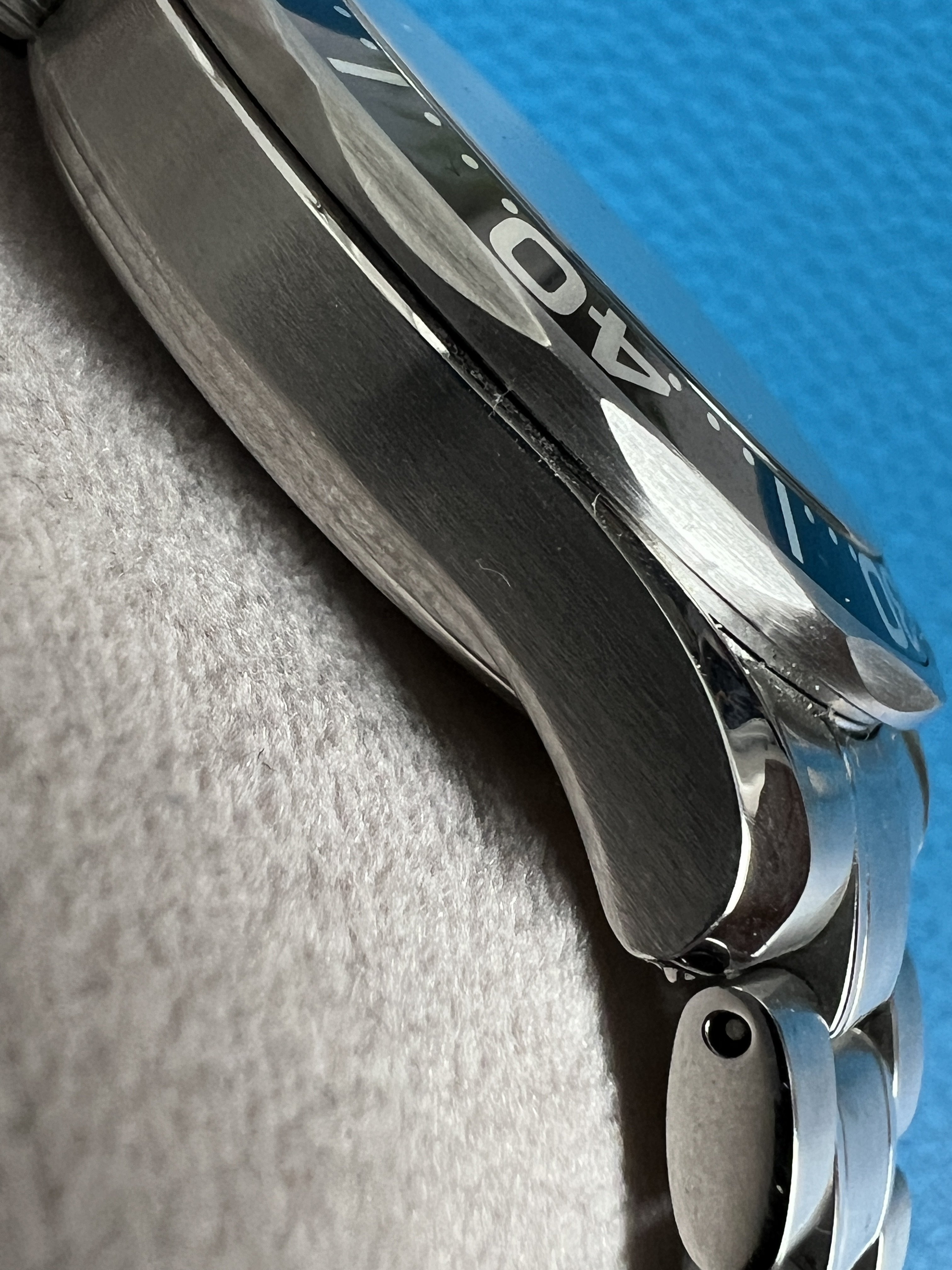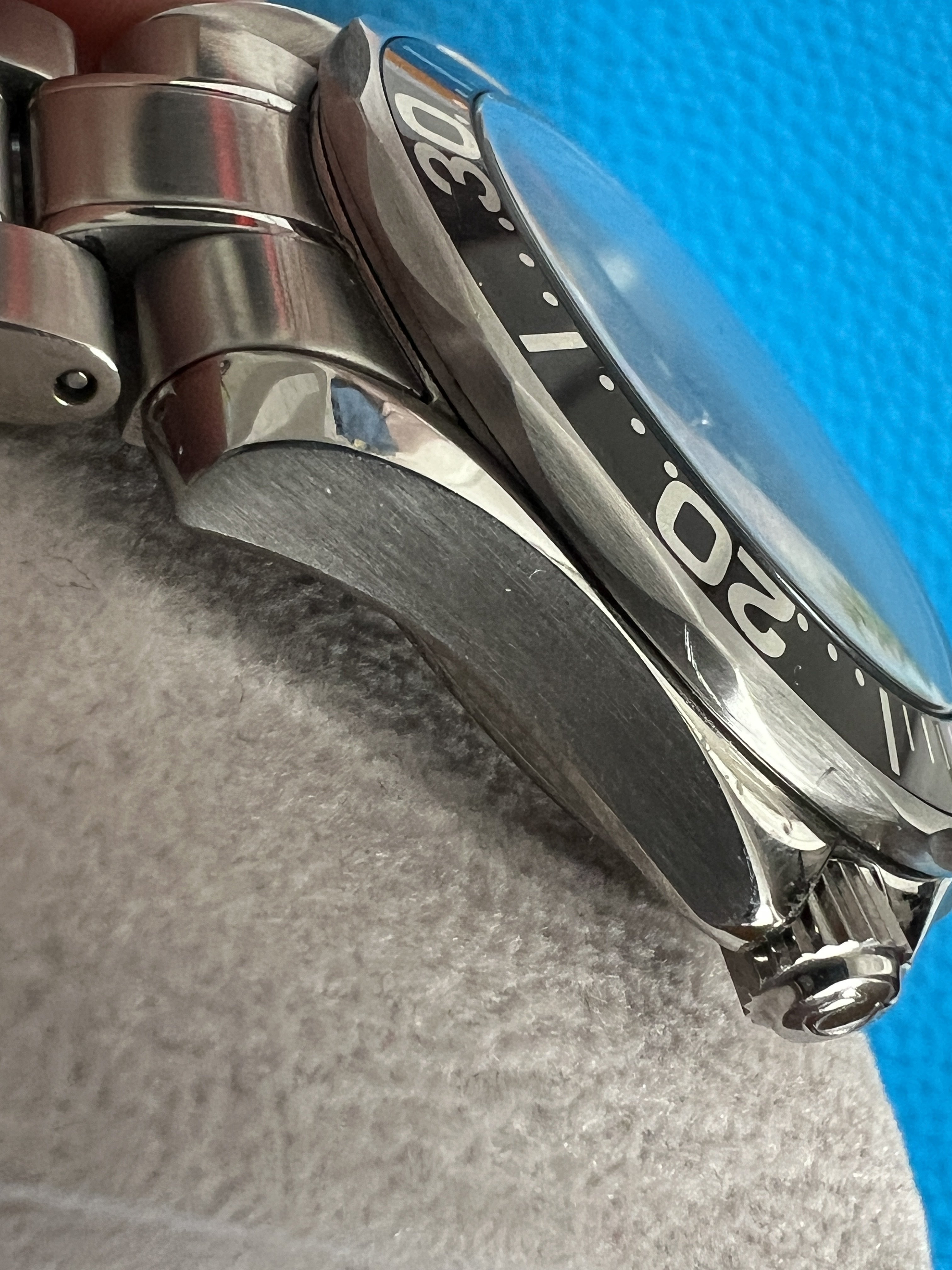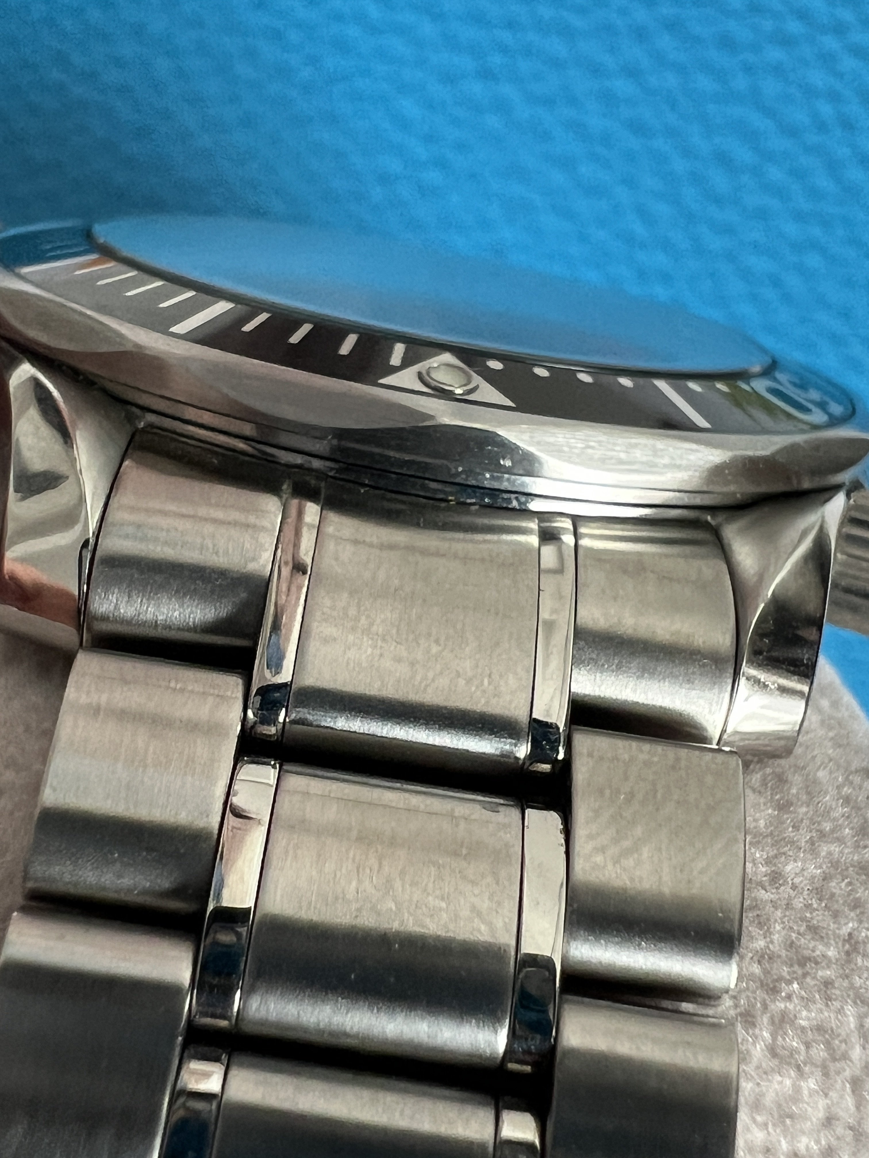 As I mentioned above, everything on the watch is in top condition as far as I can tell. The case has a couple marks on the bezel (I’m referring to the steel part, not the insert) to the right of the pip and again around the 18 mark that I’ve done my best to capture in the pics. There is also a mark on the lower crown guard next to the bezel mark at 18. I couldn’t find any other substantial marks on the case itself, and the original finishing is well intact. There are also some marks on the bracelet clasp and a few small marks on the bracelet itself that I’ve also done my best to capture in the images. The dial and hands are in excellent condition, and the red paint at the tip of the second hand has minimal fade compared to a lot of other examples I’ve seen. There are no marks on the crystal that I could find.