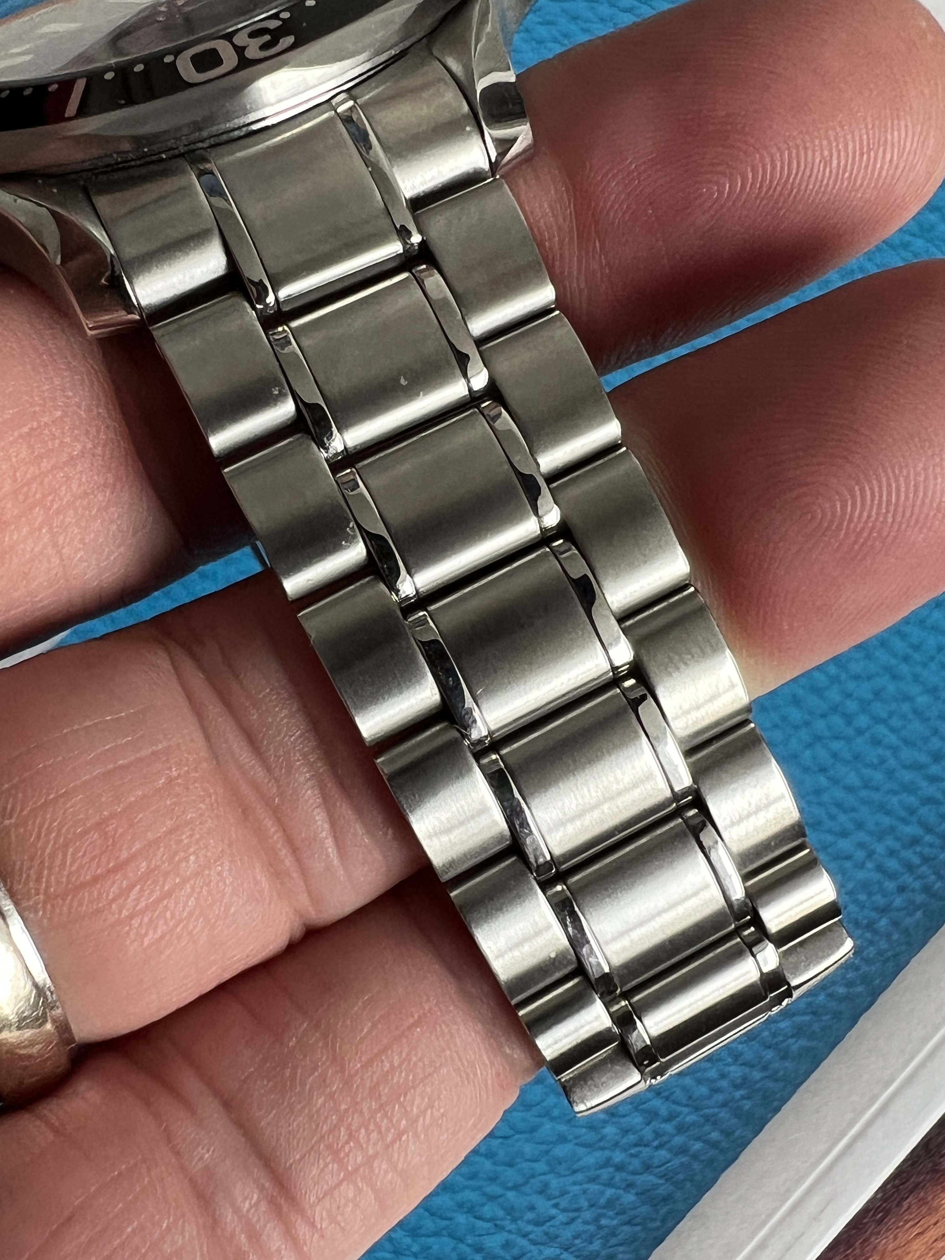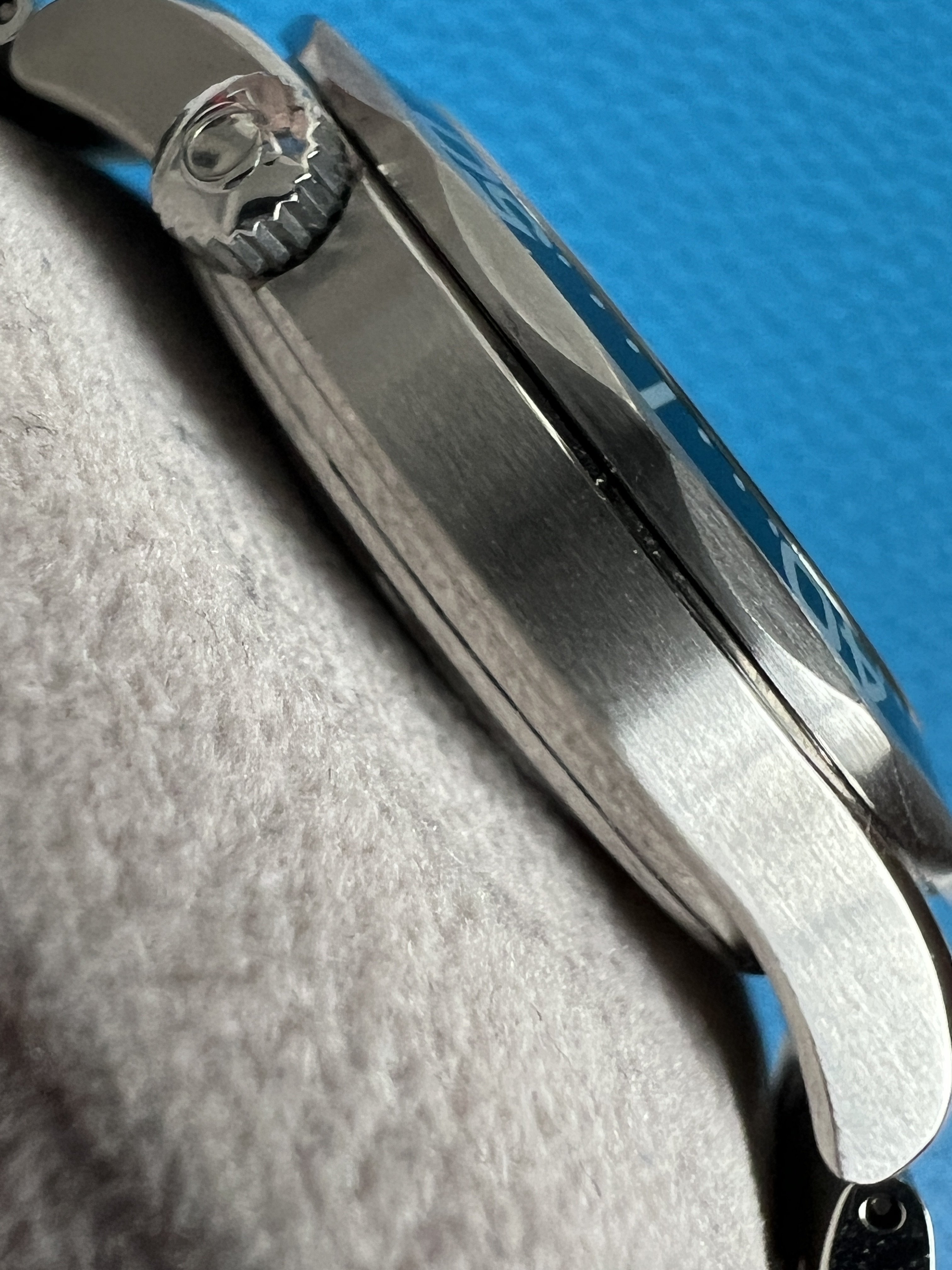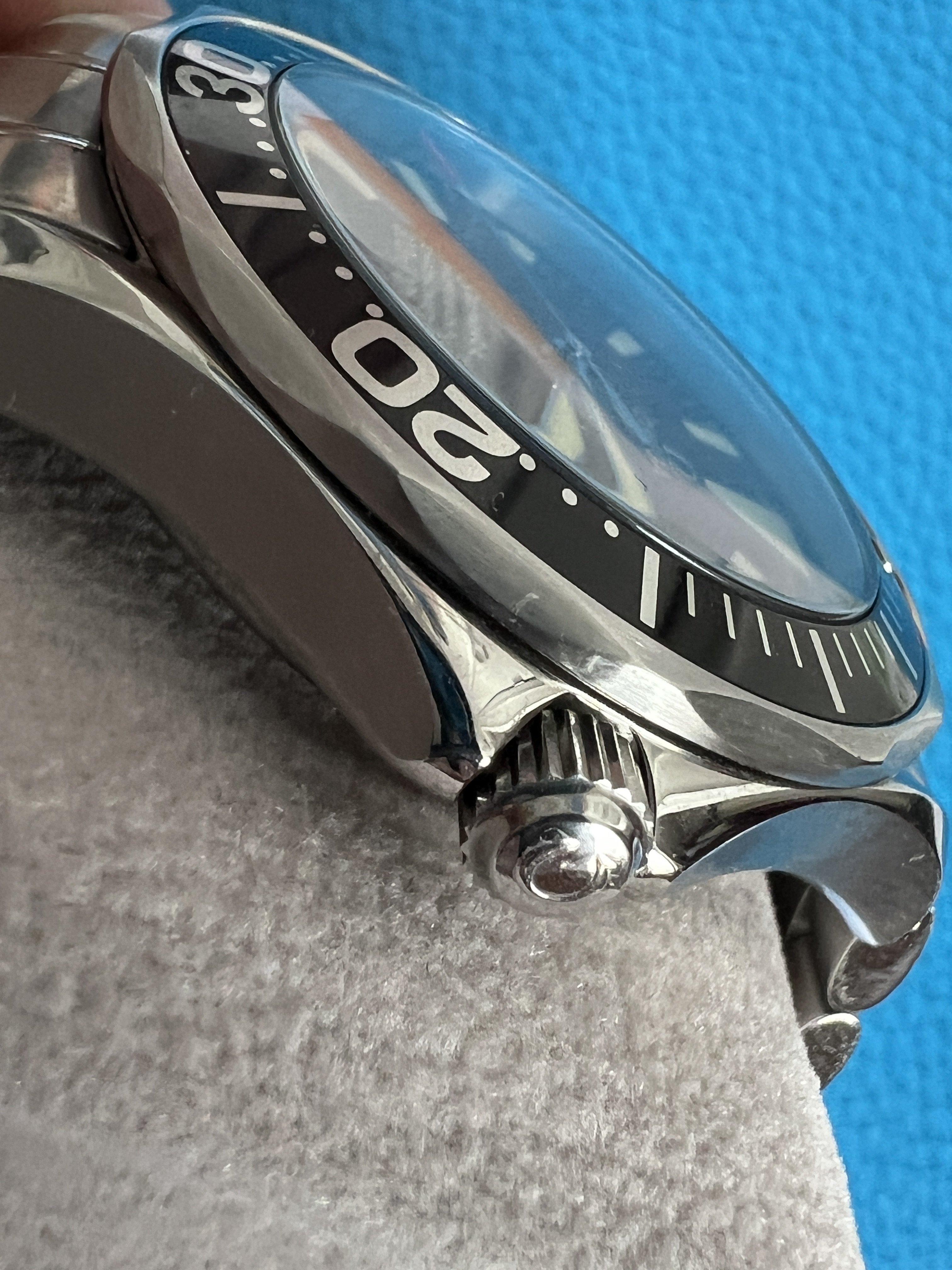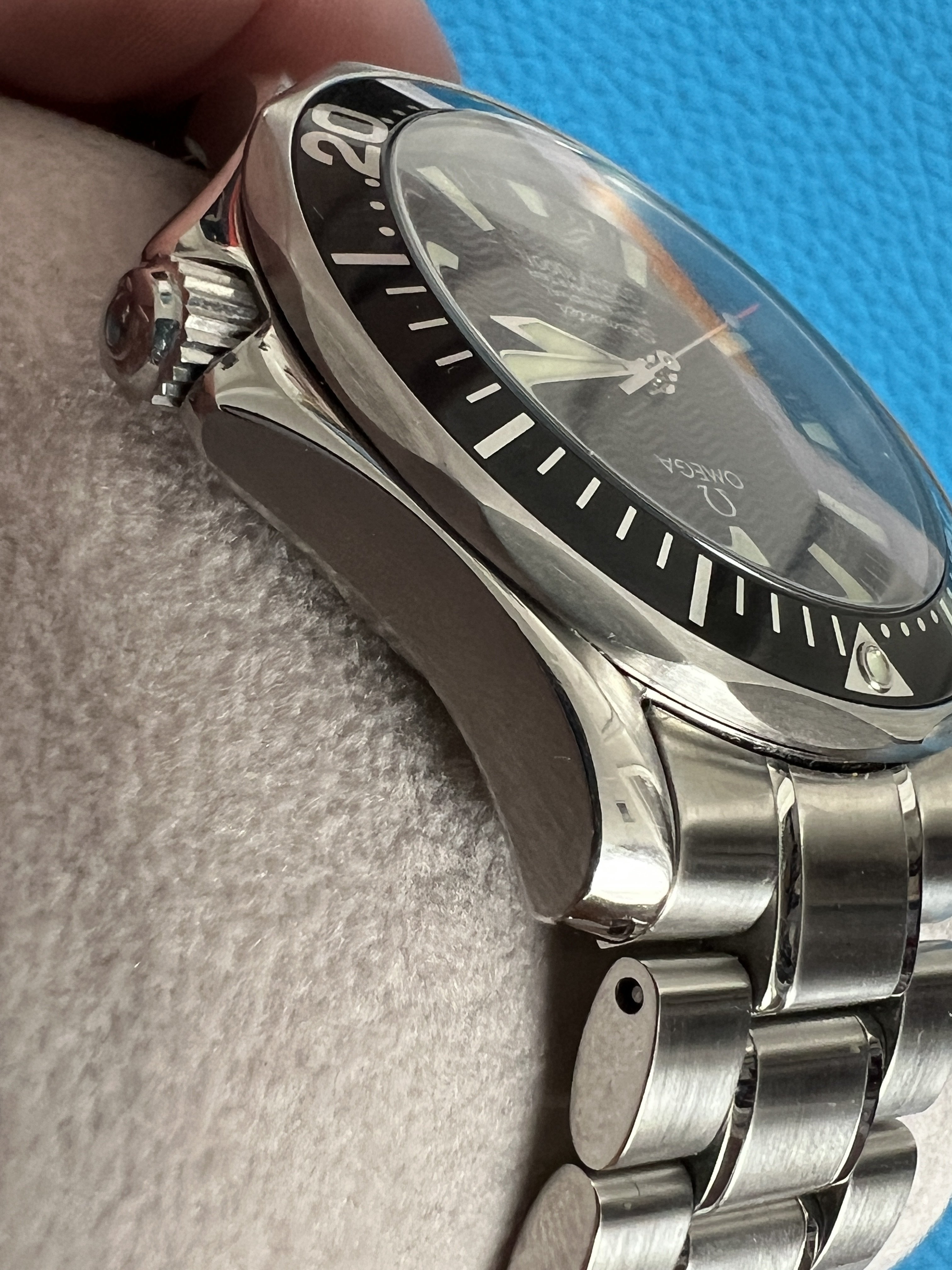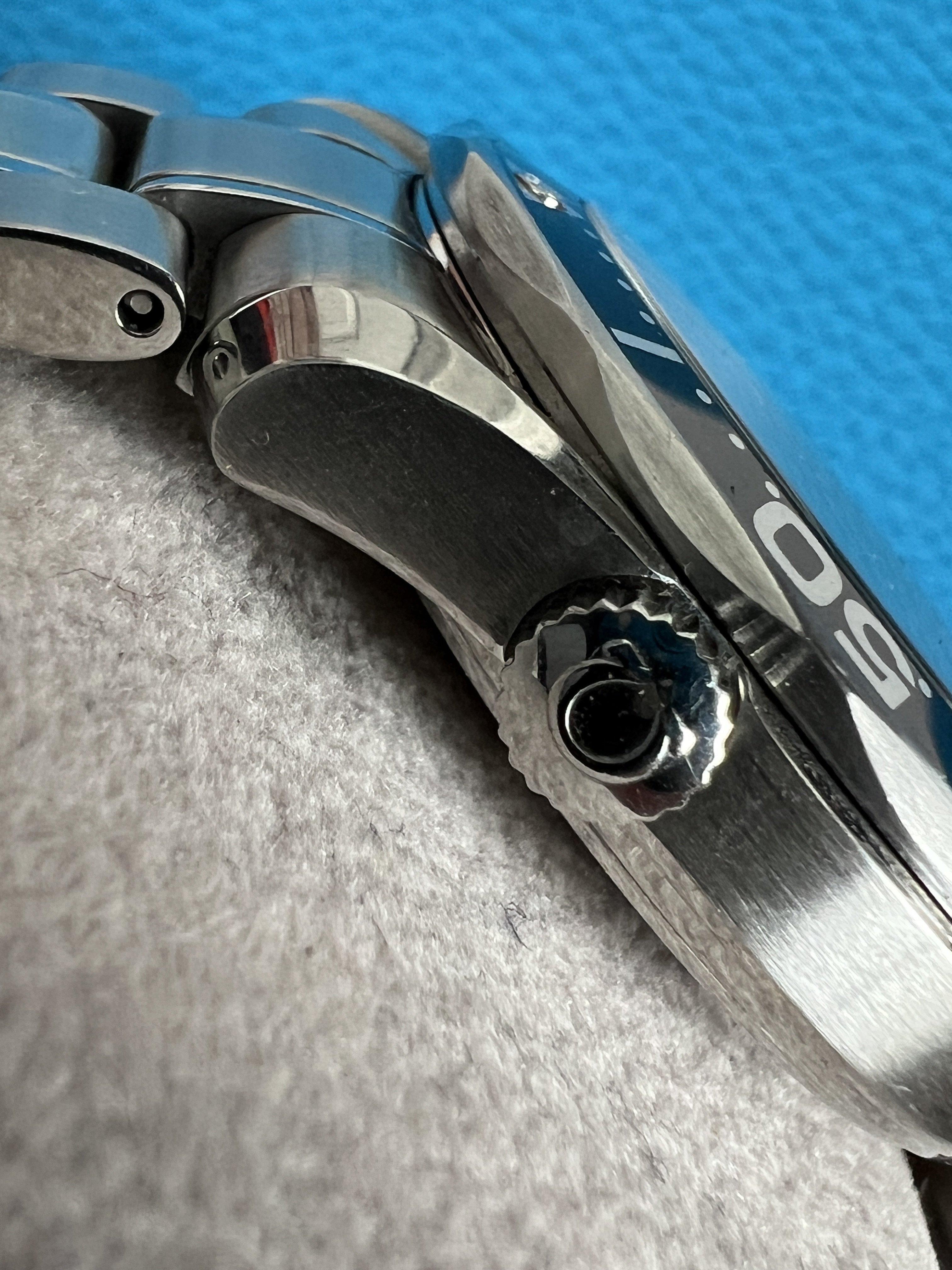 As I mentioned above, everything on the watch is in top condition as far as I can tell. The case has a couple marks on the bezel (I’m referring to the steel part, not the insert) to the right of the pip and again around the 18 mark that I’ve done my best to capture in the pics. There is also a mark on the lower crown guard next to the bezel mark at 18. I couldn’t find any other substantial marks on the case itself, and the original finishing is well intact. There are also some marks on the bracelet clasp and a few small marks on the bracelet itself that I’ve also done my best to capture in the images. The dial and hands are in excellent condition, and the red paint at the tip of the second hand has minimal fade compared to a lot of other examples I’ve seen. There are no marks on the crystal that I could find.