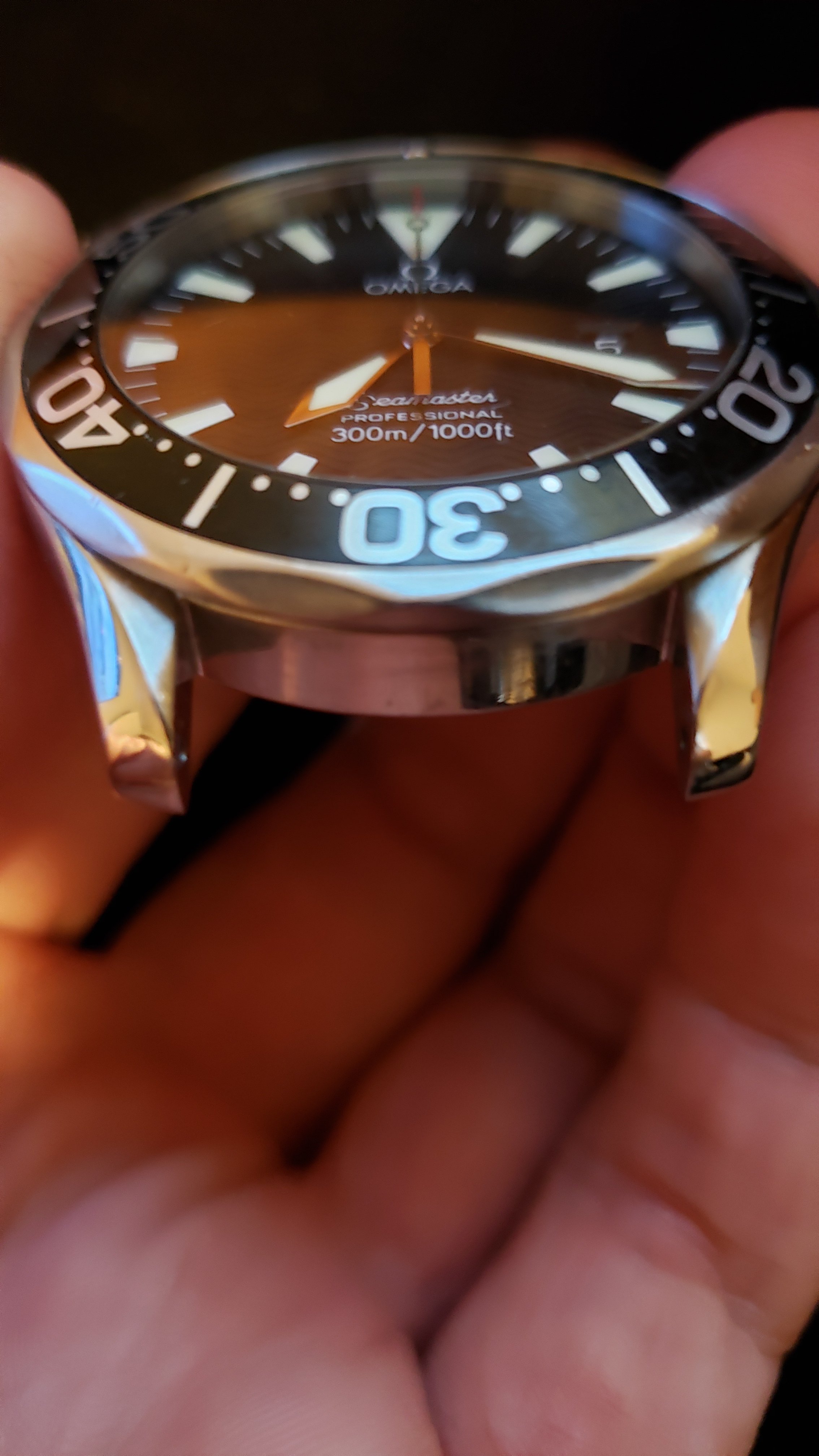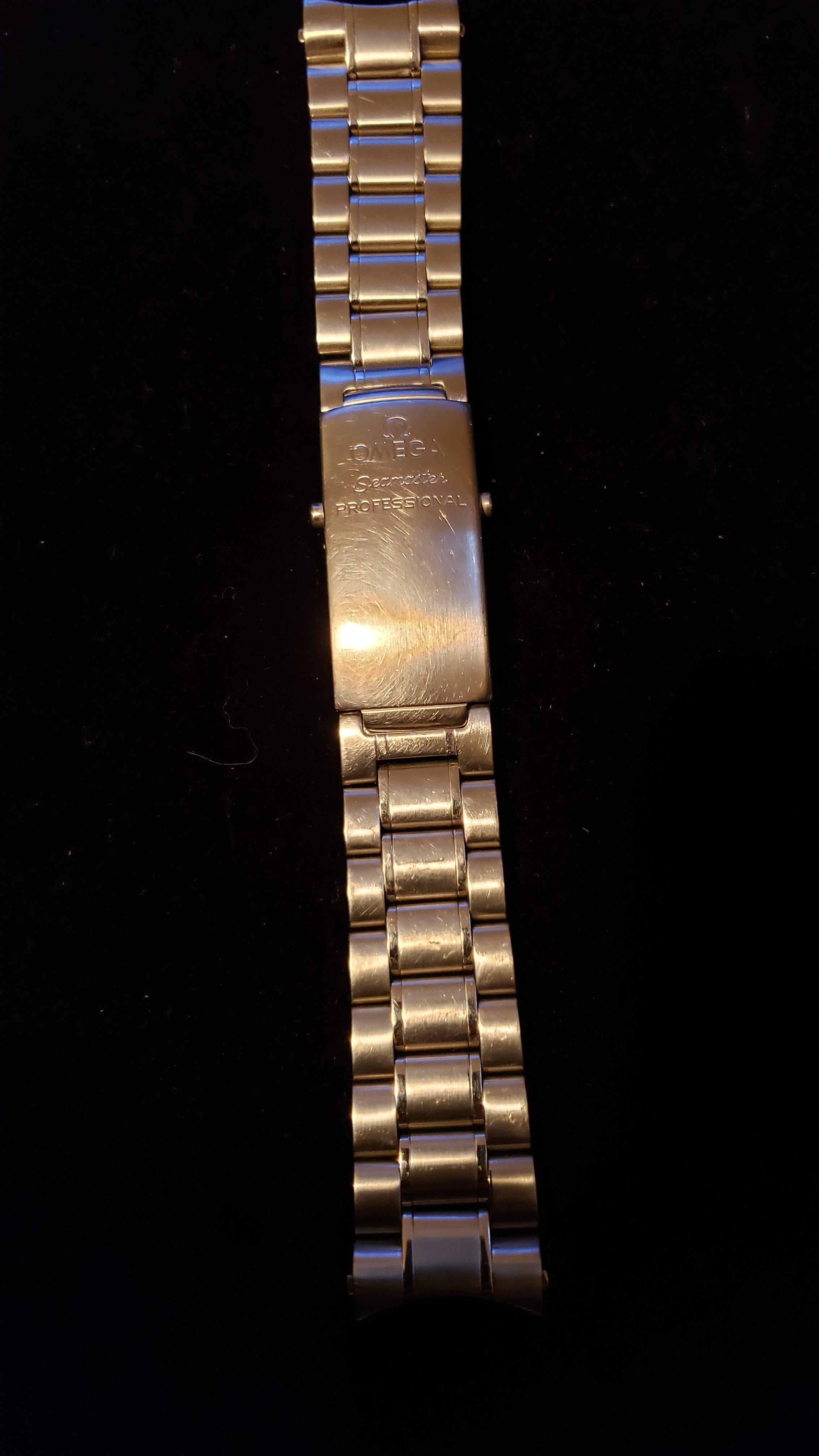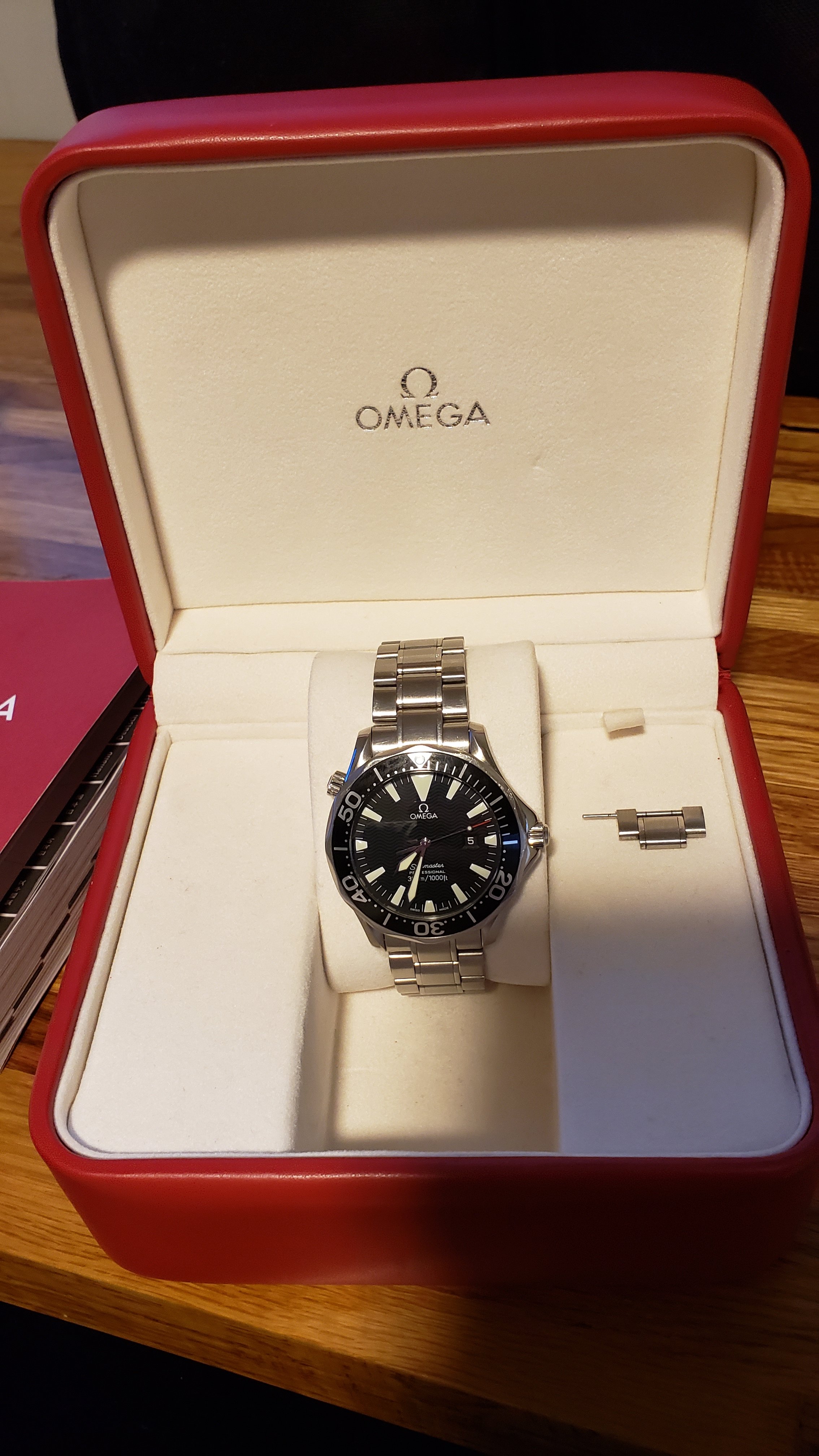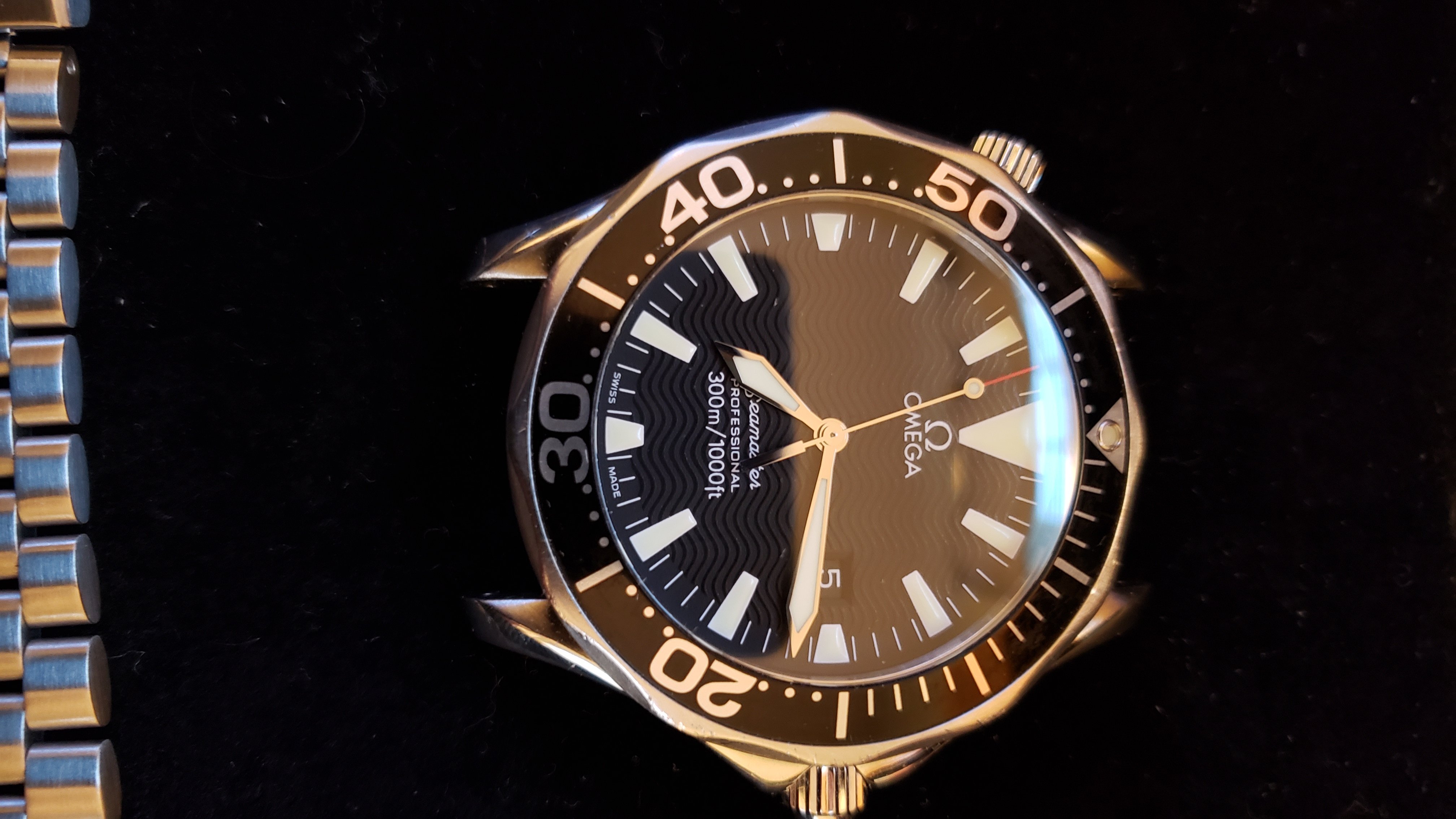 ·Selling my daily wearer. As you can see the bracelet is well worn and shows many fine scratches. I had the clasp spring replaced last fall and it holds tight with a nice click. The hinge on the folding clasp (or rather the pin) probably could be replaced but at the time of the spring replacement I didn't think of it. The case does not show much signs of use and has no dings or dents. The saphire is perfect. The bezel.... well it's seen better days. Check out the photos, I tried my best to get close ups of the scratches. If I were to swap it out for a new bezel the watch would be near perfect. I purchased this used in late 2018 and the previous owner had it serviced in January of the same year. I can't find the receipt, which he included with the sale, but it was for a full service thru Omega totaling $450 or $475 (can't remember but I'll try to find it) Not sure if the watch was polished at time of service but the edges seem as crisp as the cases on my new omega watches. Included is an extra link, manual and box/outer box only or in other words, only what is pictured.
