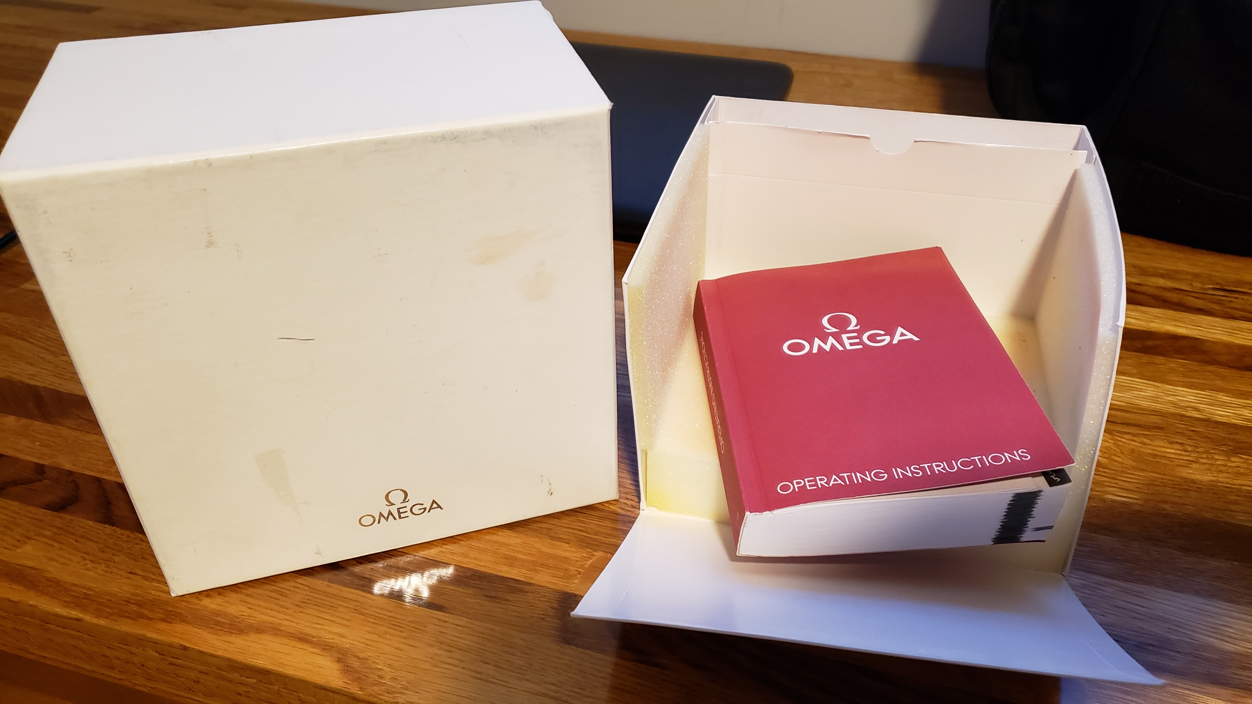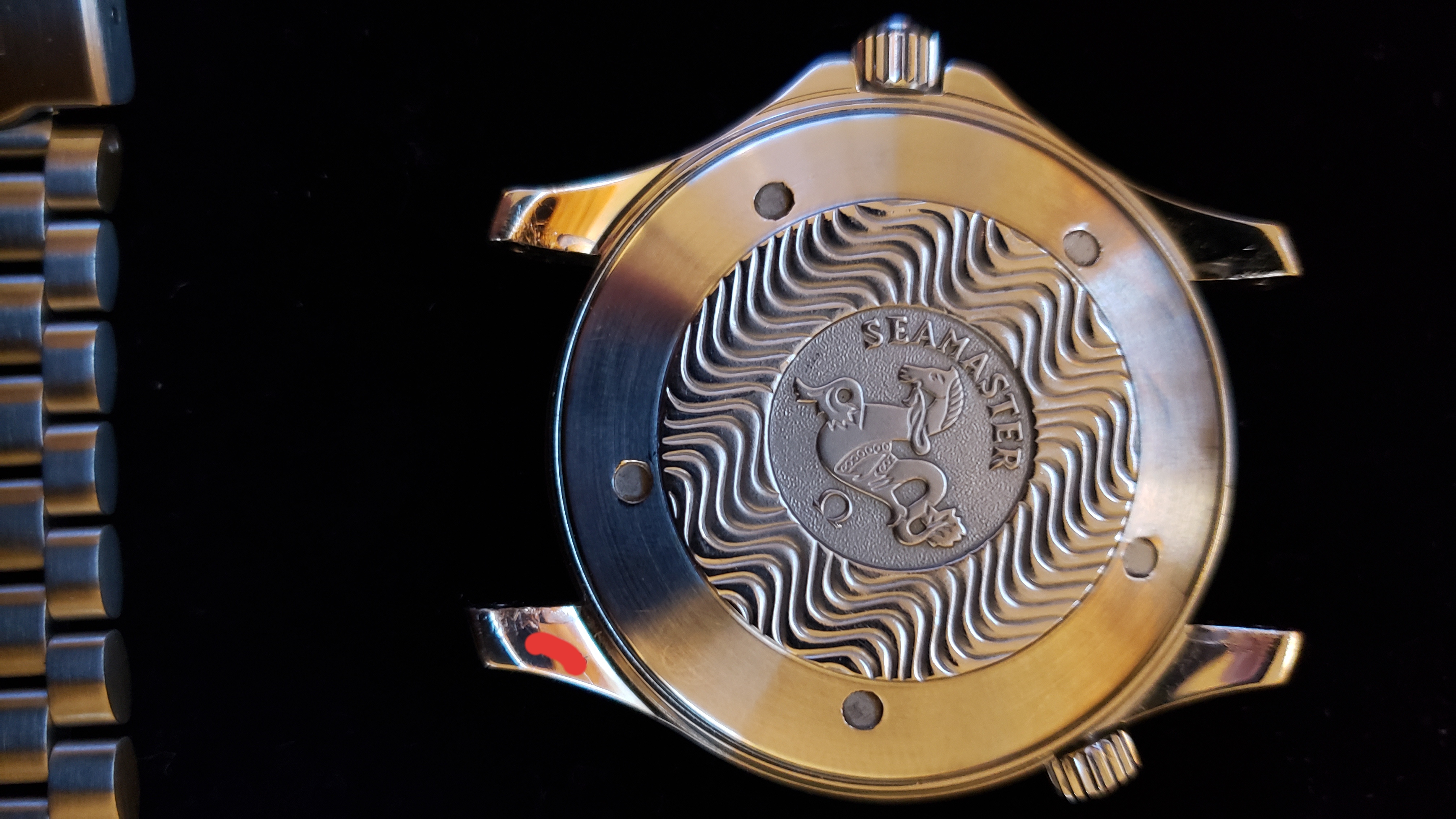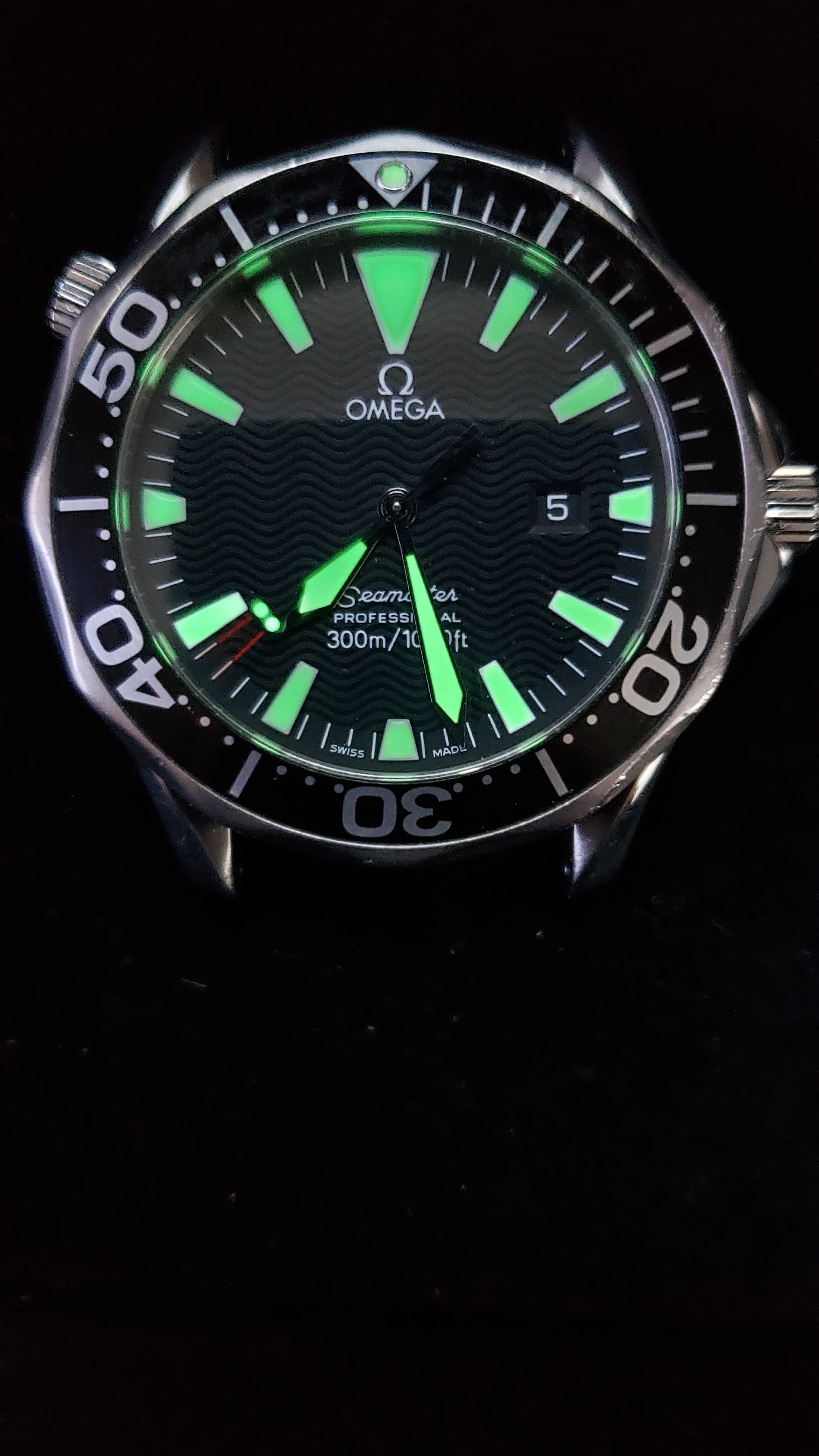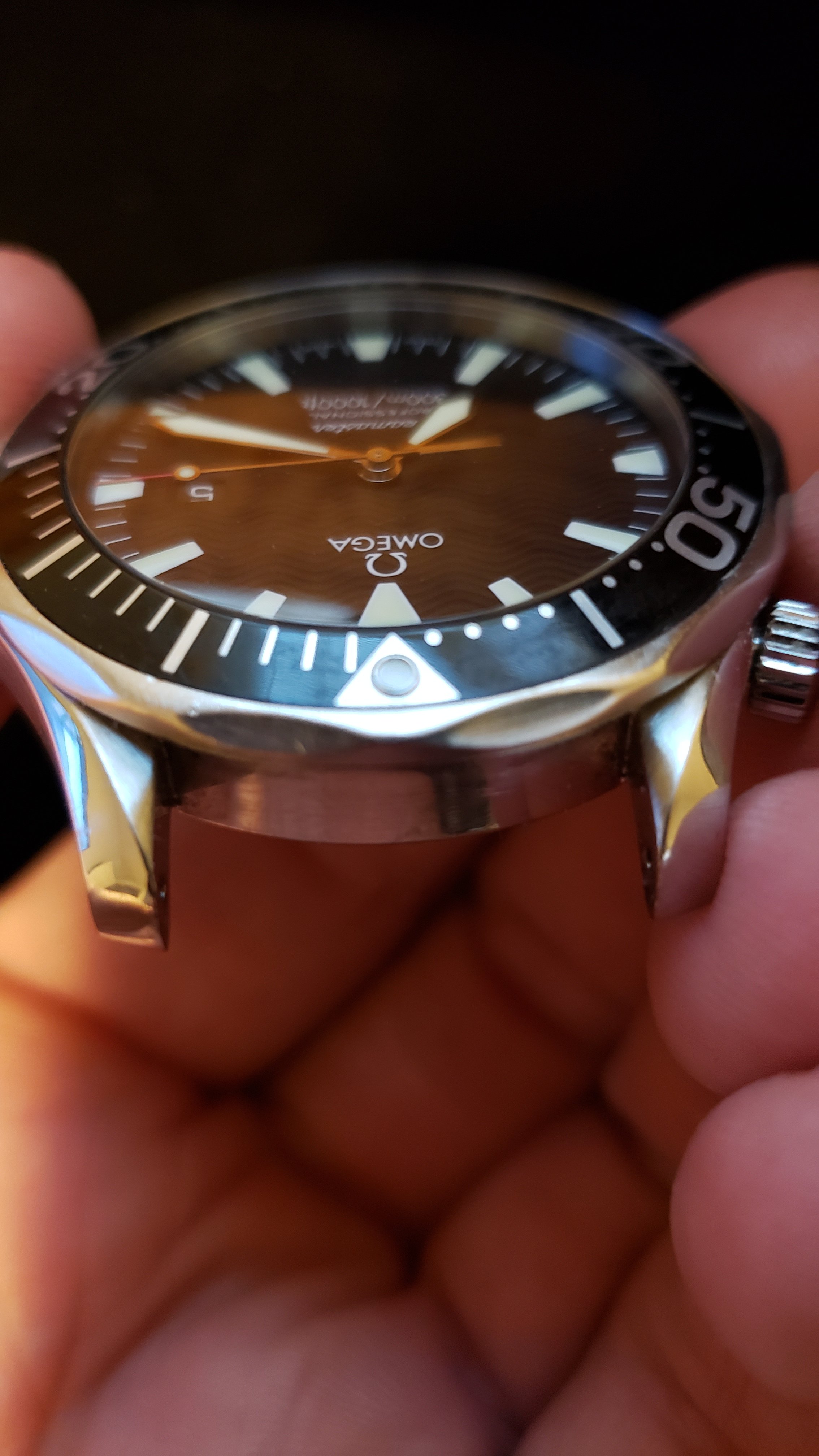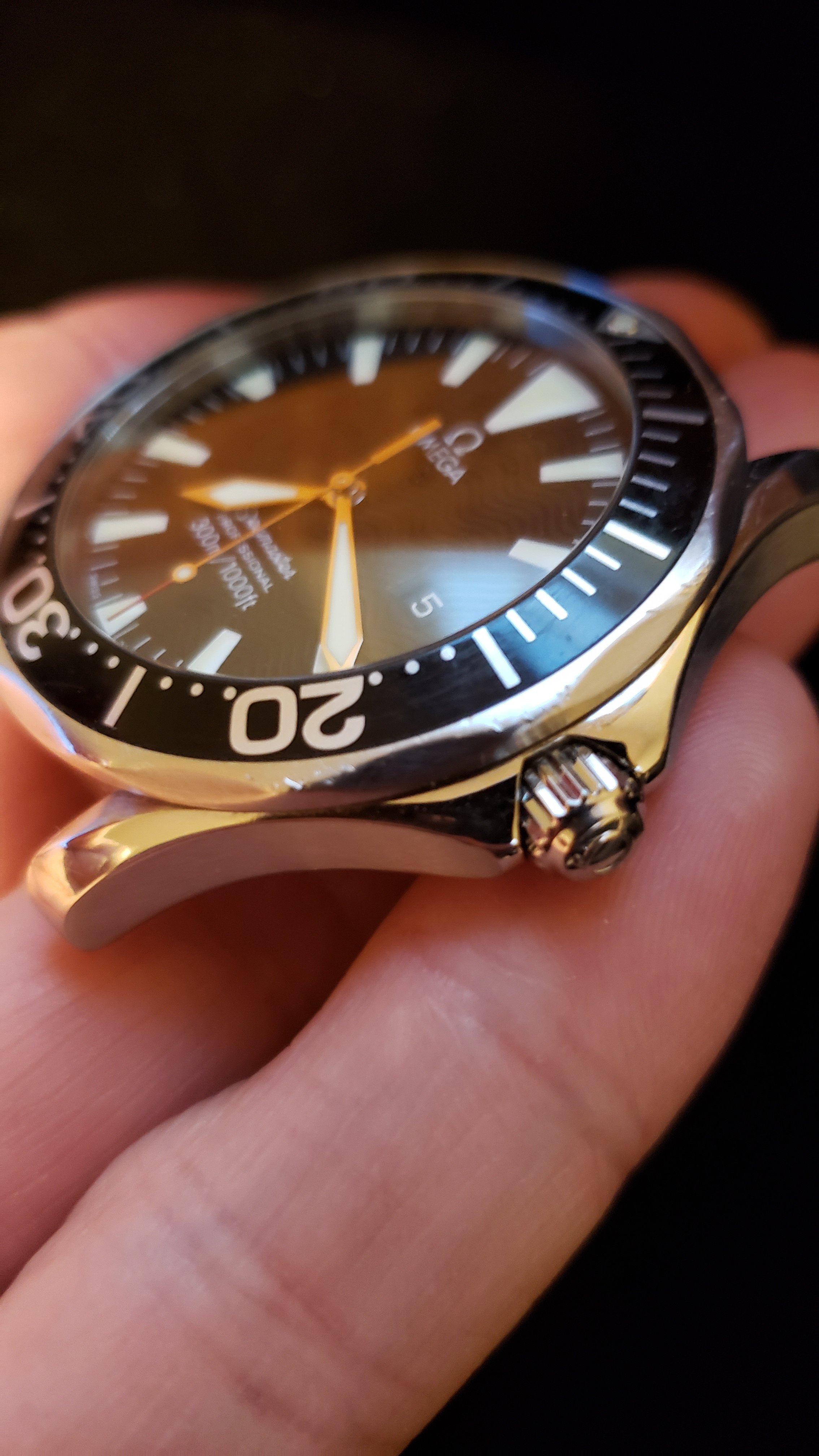 ·Selling my daily wearer. As you can see the bracelet is well worn and shows many fine scratches. I had the clasp spring replaced last fall and it holds tight with a nice click. The hinge on the folding clasp (or rather the pin) probably could be replaced but at the time of the spring replacement I didn't think of it. The case does not show much signs of use and has no dings or dents. The saphire is perfect. The bezel.... well it's seen better days. Check out the photos, I tried my best to get close ups of the scratches. If I were to swap it out for a new bezel the watch would be near perfect. I purchased this used in late 2018 and the previous owner had it serviced in January of the same year. I can't find the receipt, which he included with the sale, but it was for a full service thru Omega totaling $450 or $475 (can't remember but I'll try to find it) Not sure if the watch was polished at time of service but the edges seem as crisp as the cases on my new omega watches. Included is an extra link, manual and box/outer box only or in other words, only what is pictured.