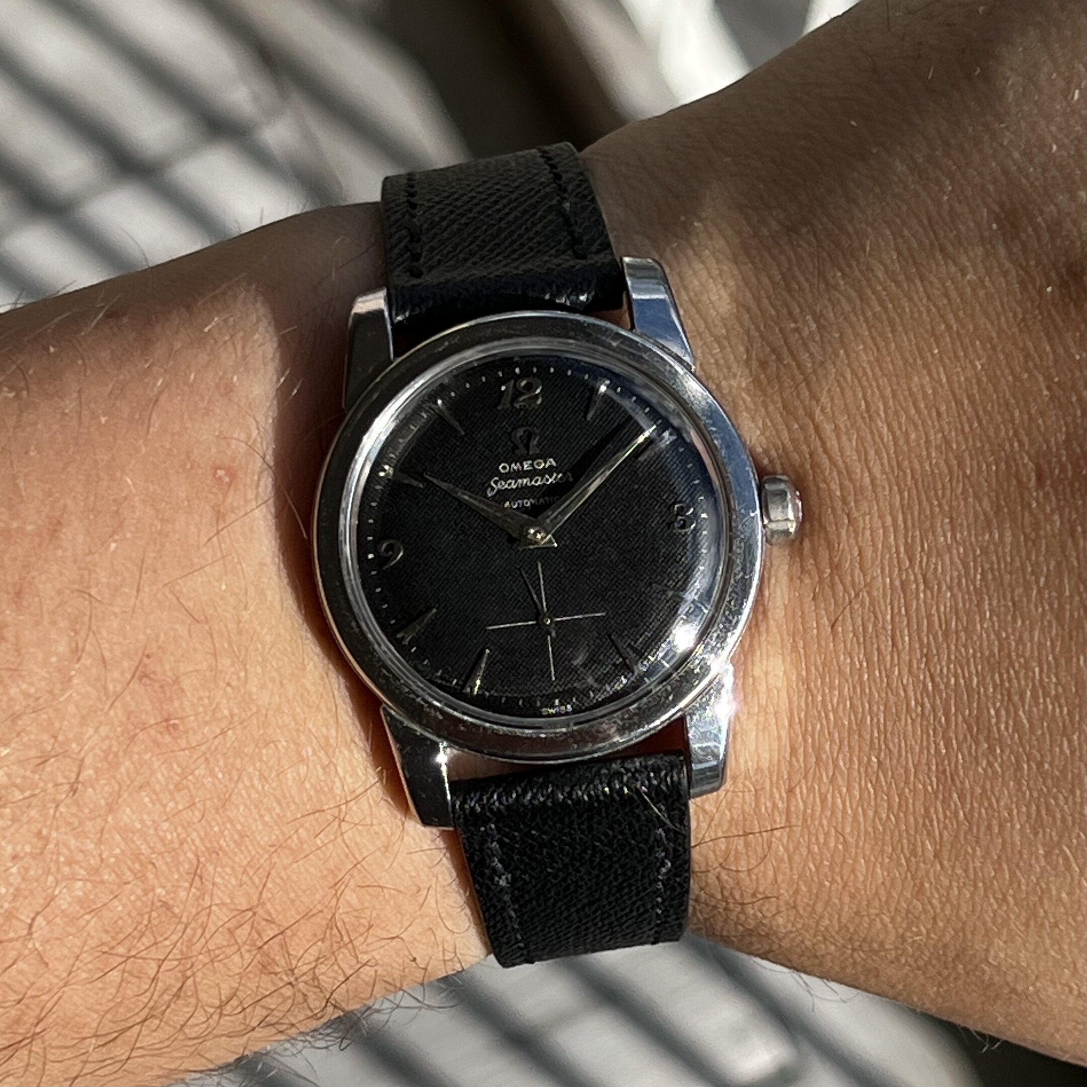 The watch is recently serviced and comes with a custom quality saffiano strap and Omega buckle.