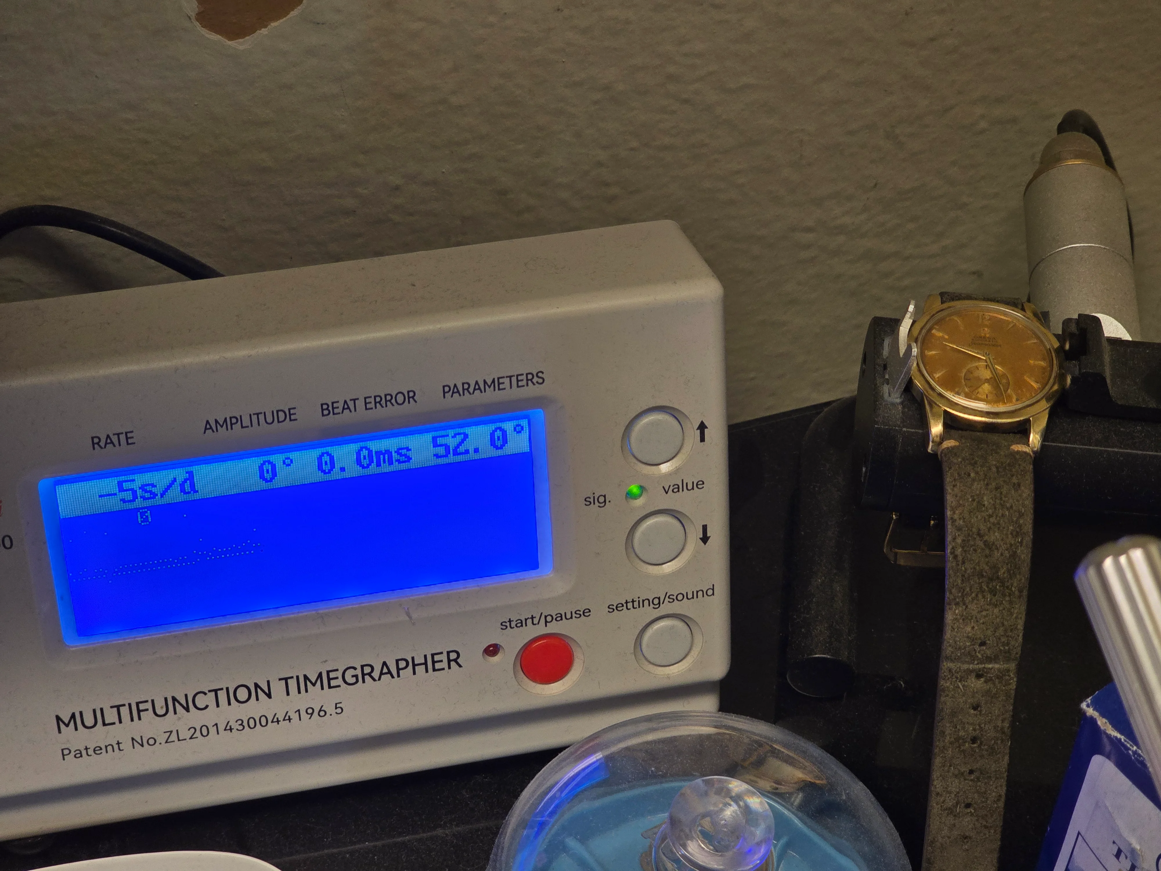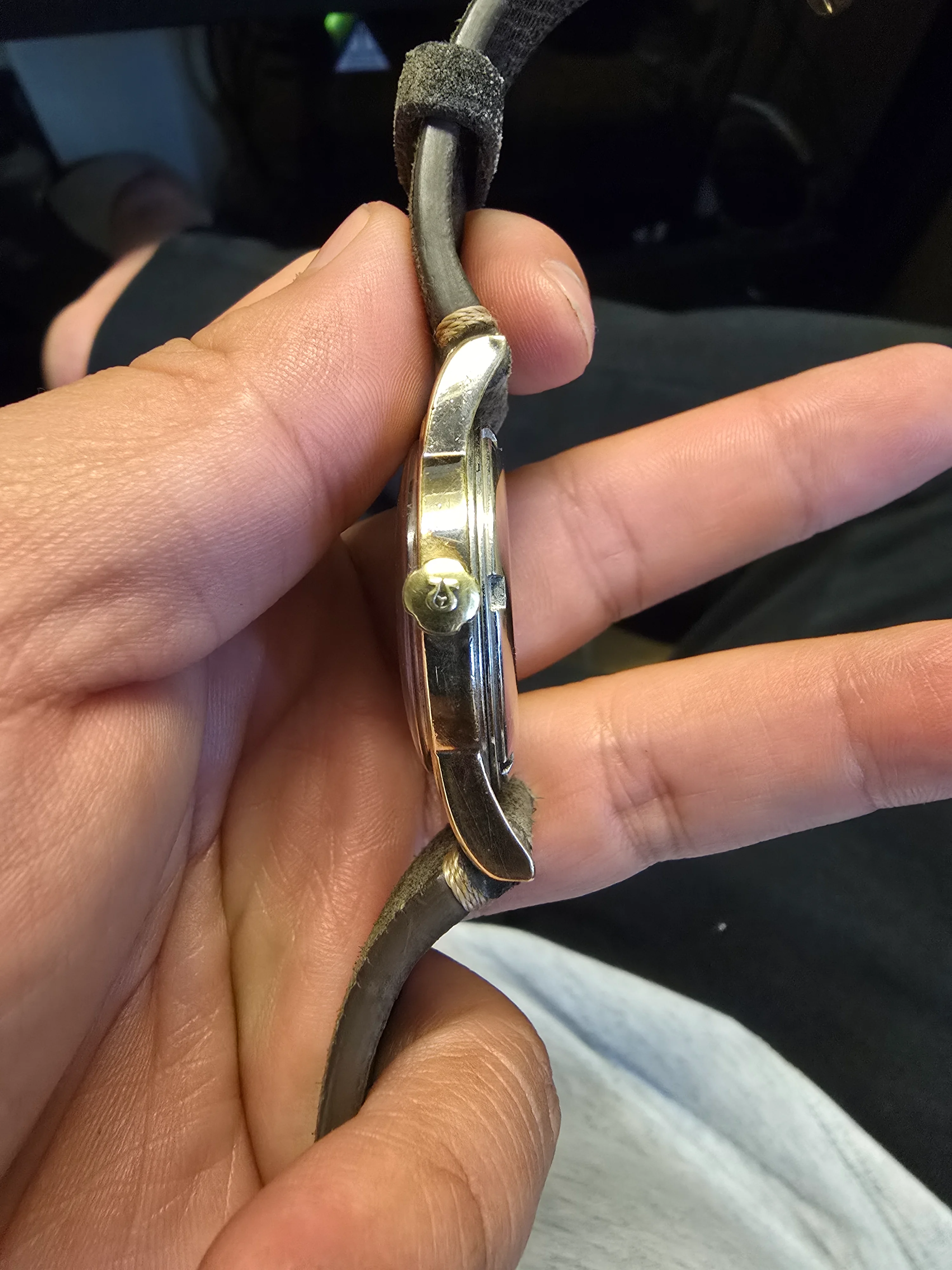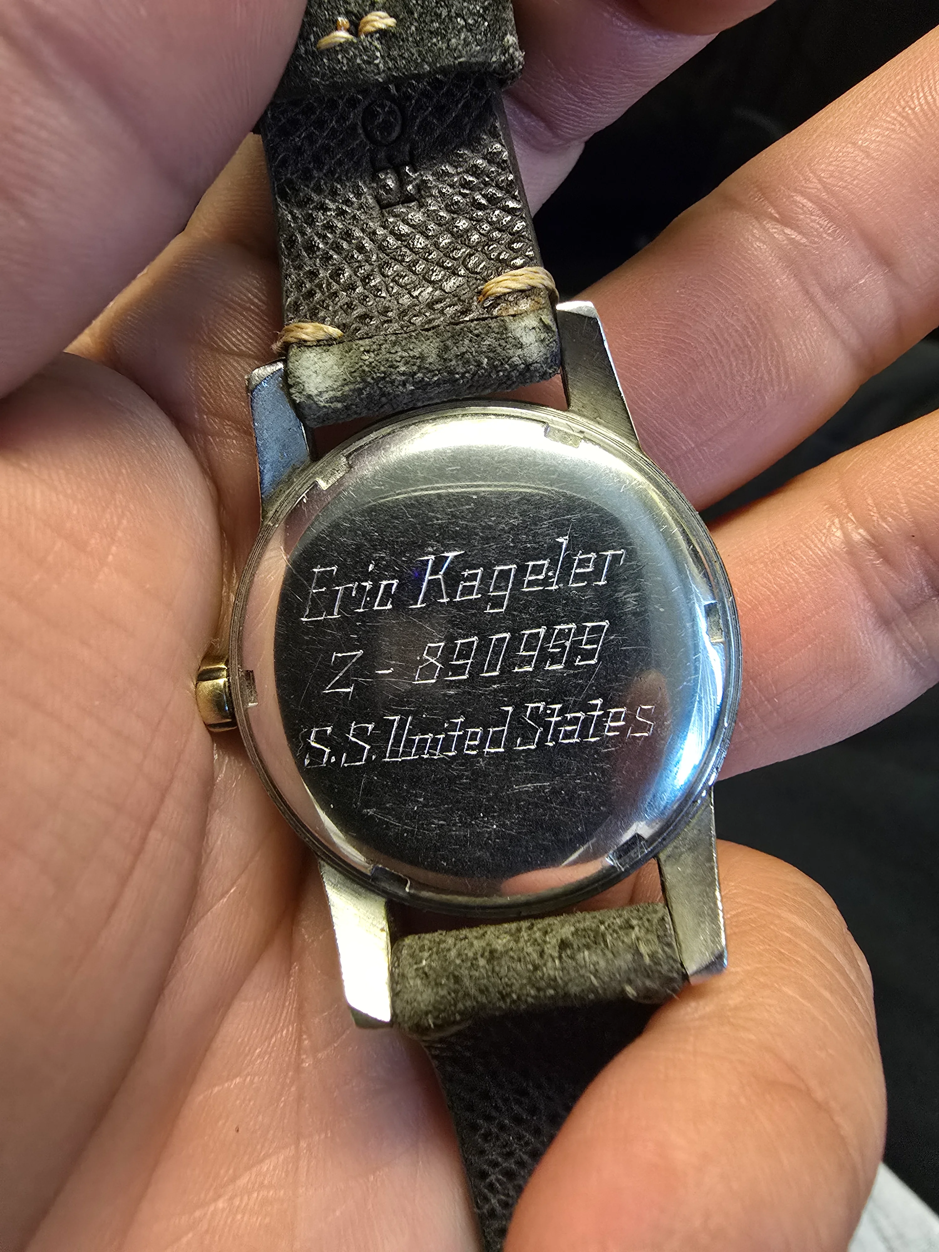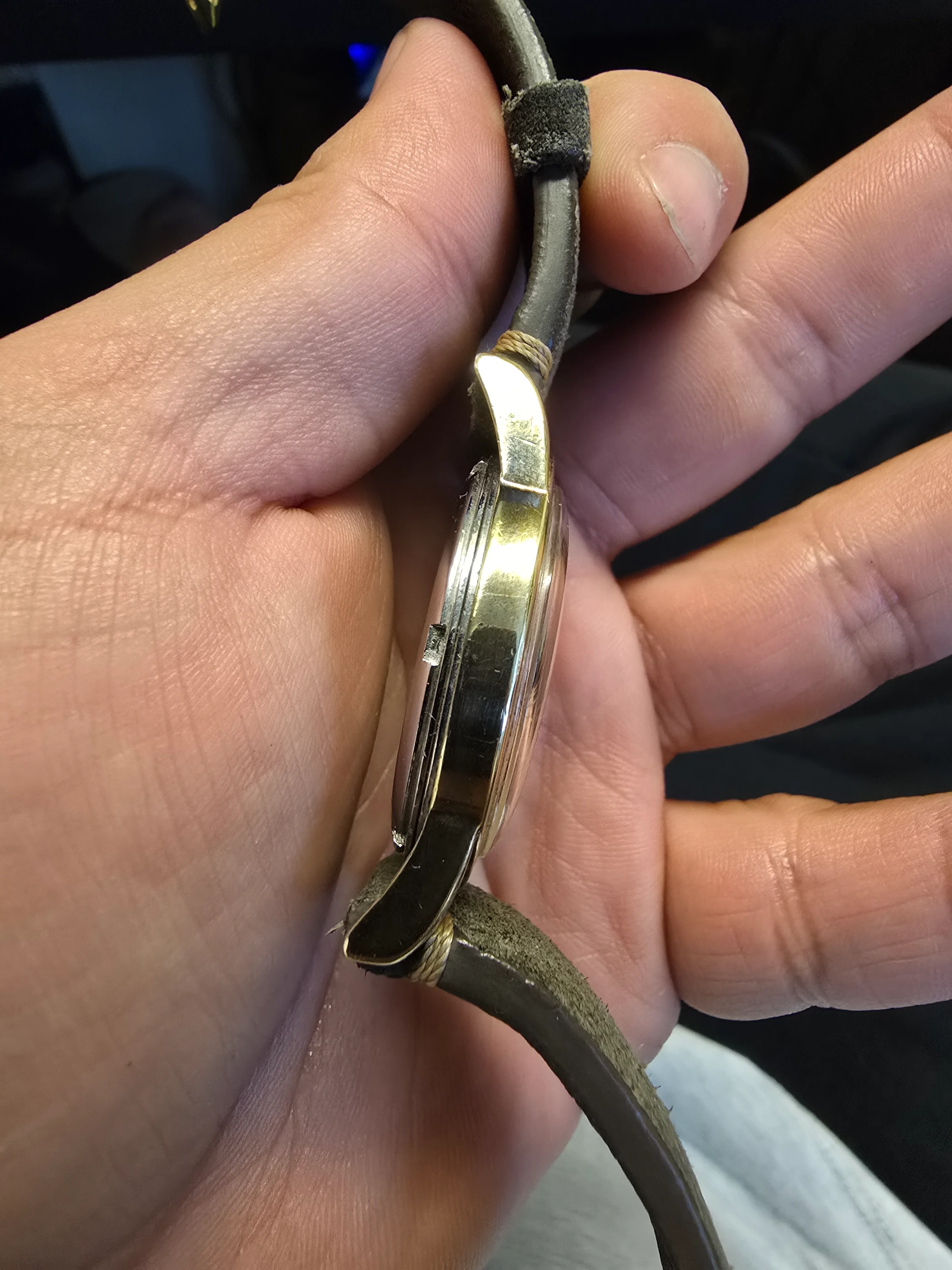 Condition: Excellent for its age, with one small flaw—a minor chip in the gold plating on the top right lug (covered by the strap and not noticeable).