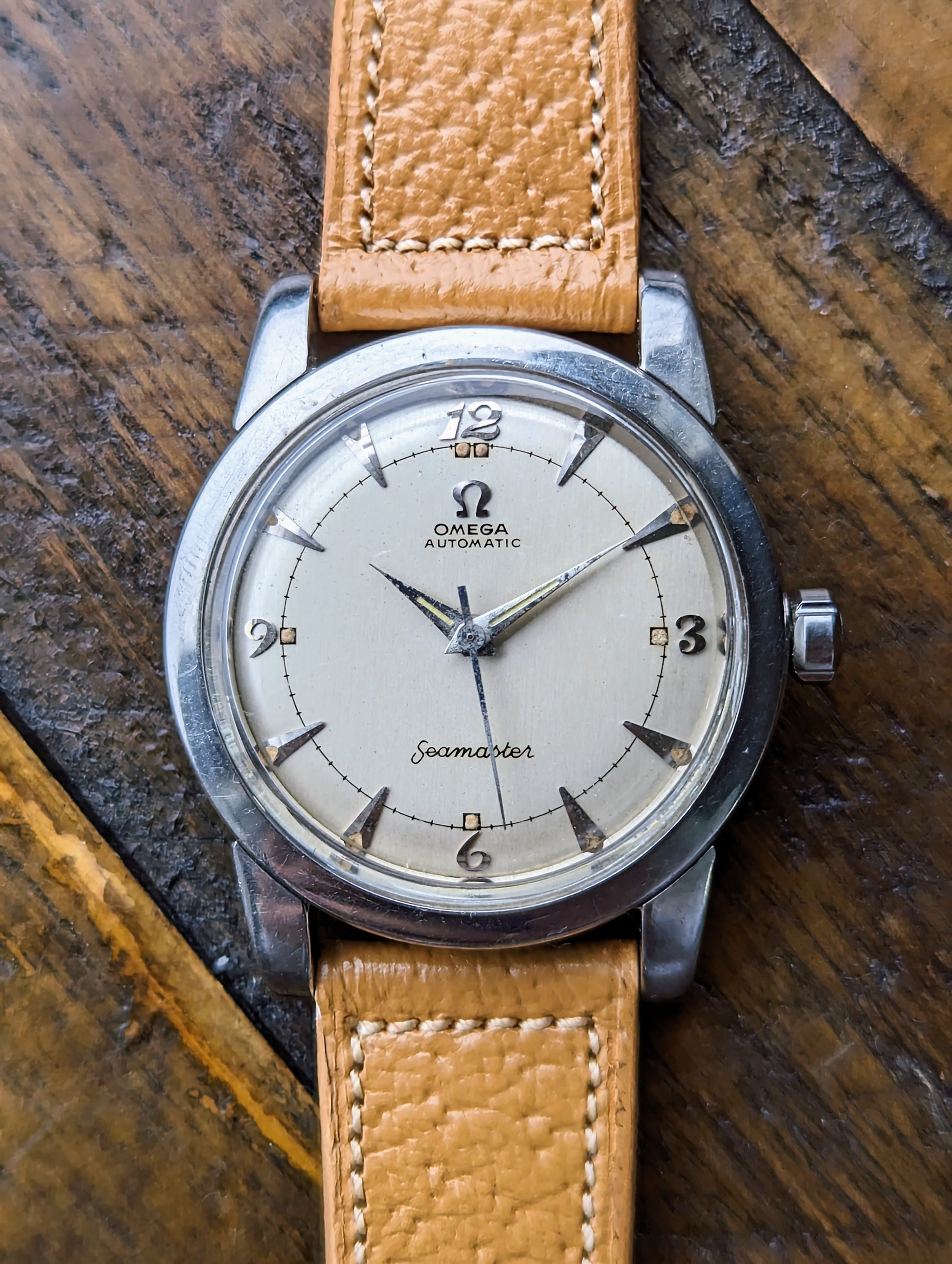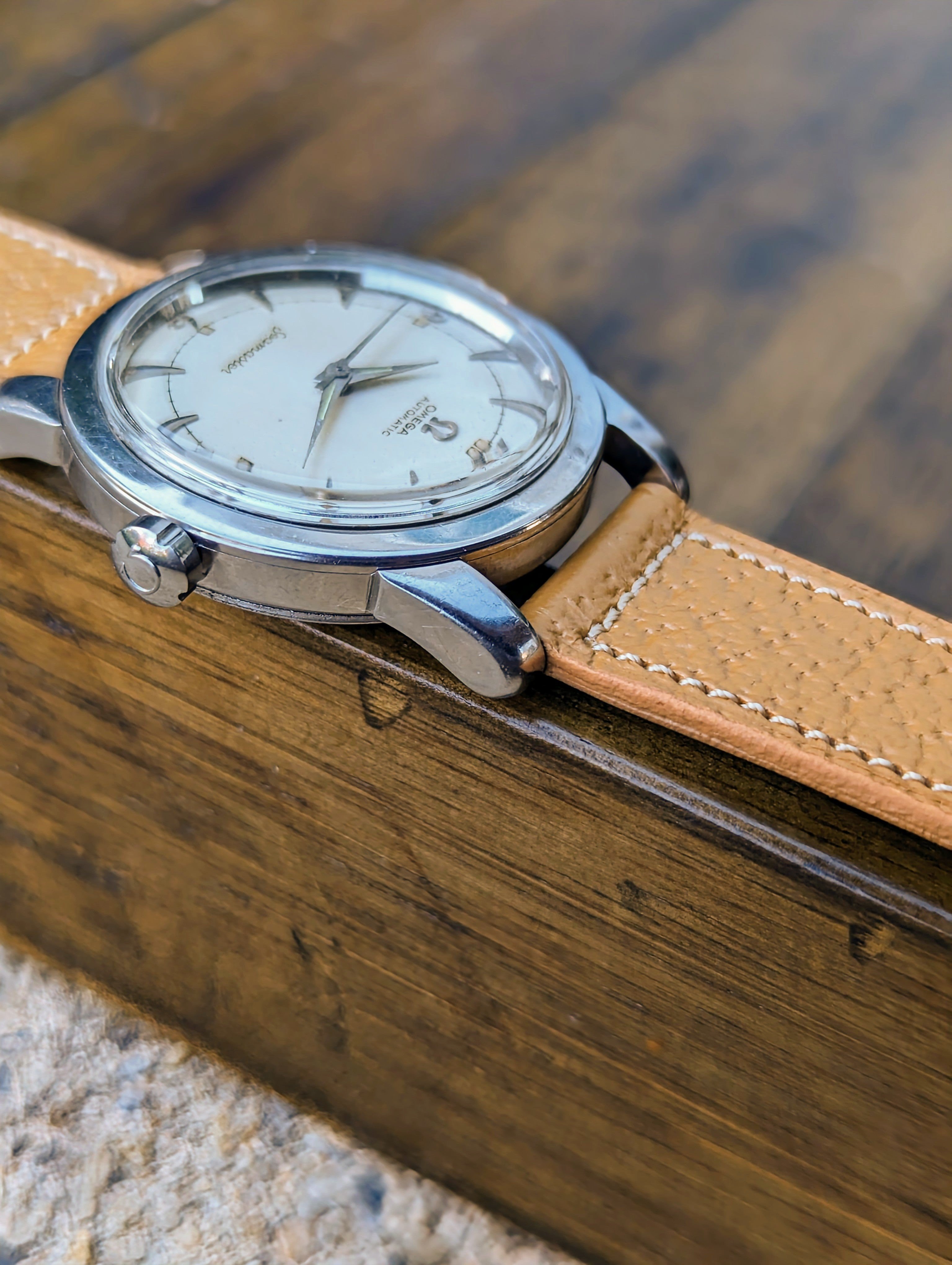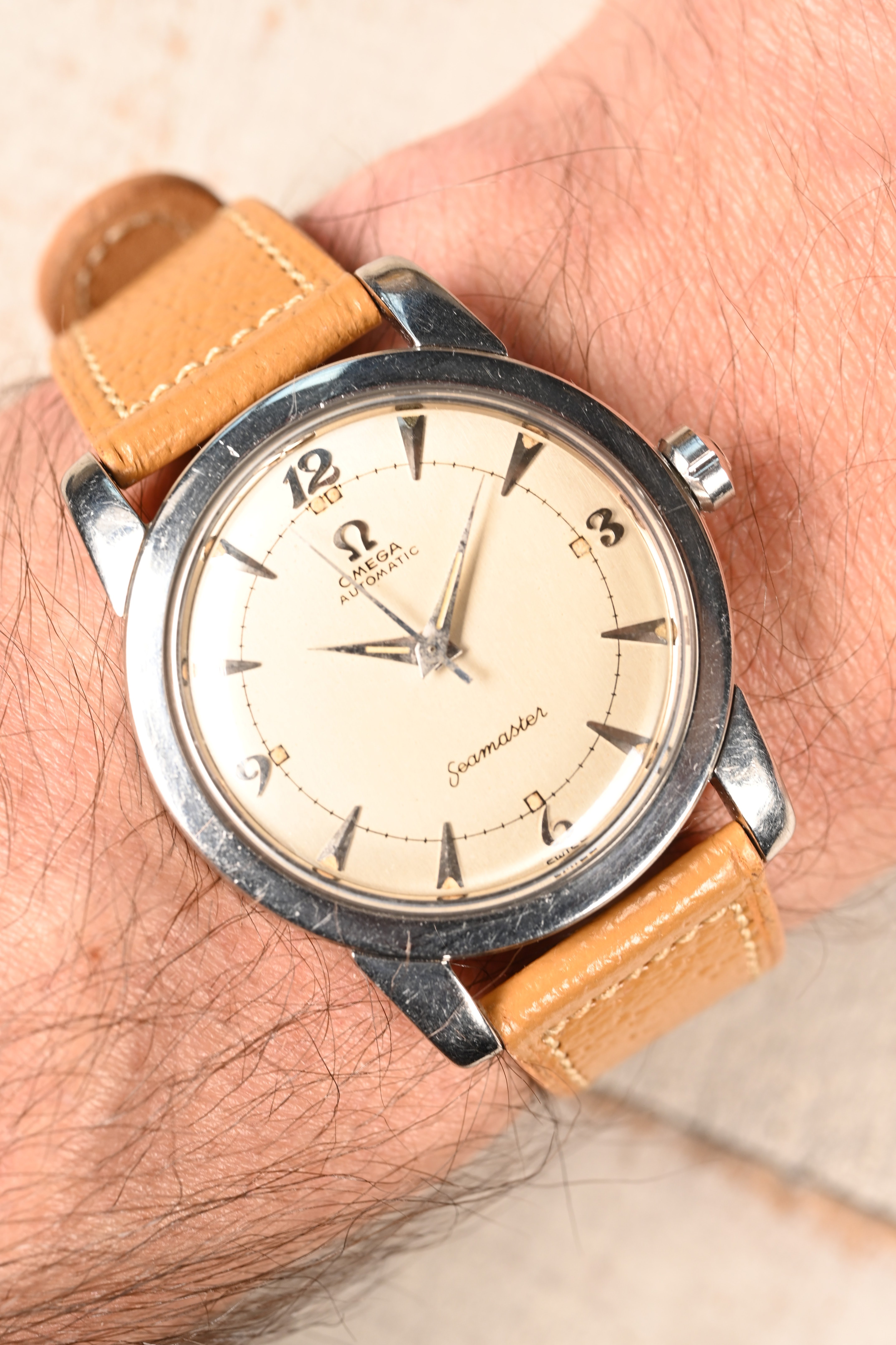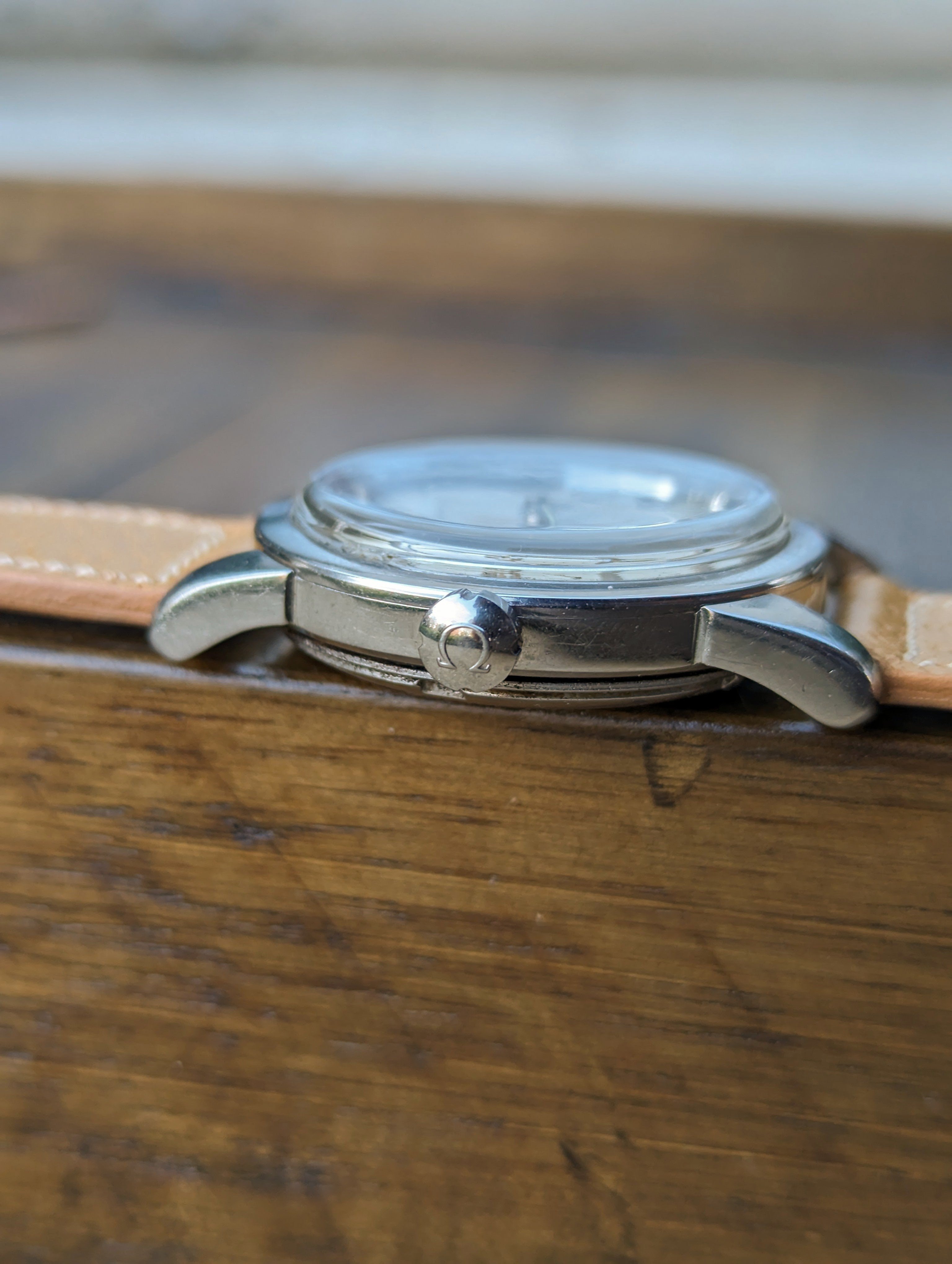 CASE: The 34mm stainless steel case is in fair shape. The case has previously been polished in the past. The original beveled lugs have become faded from previous polishes. The case presents with light wear commensurate with its age. The crystal has been replaced some time in the past. It is completed by a modern OEM Omega replacement crown that is the correct style for the reference.