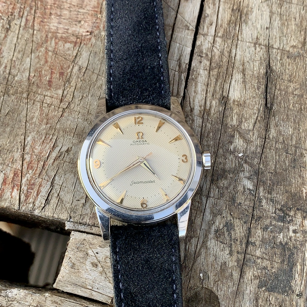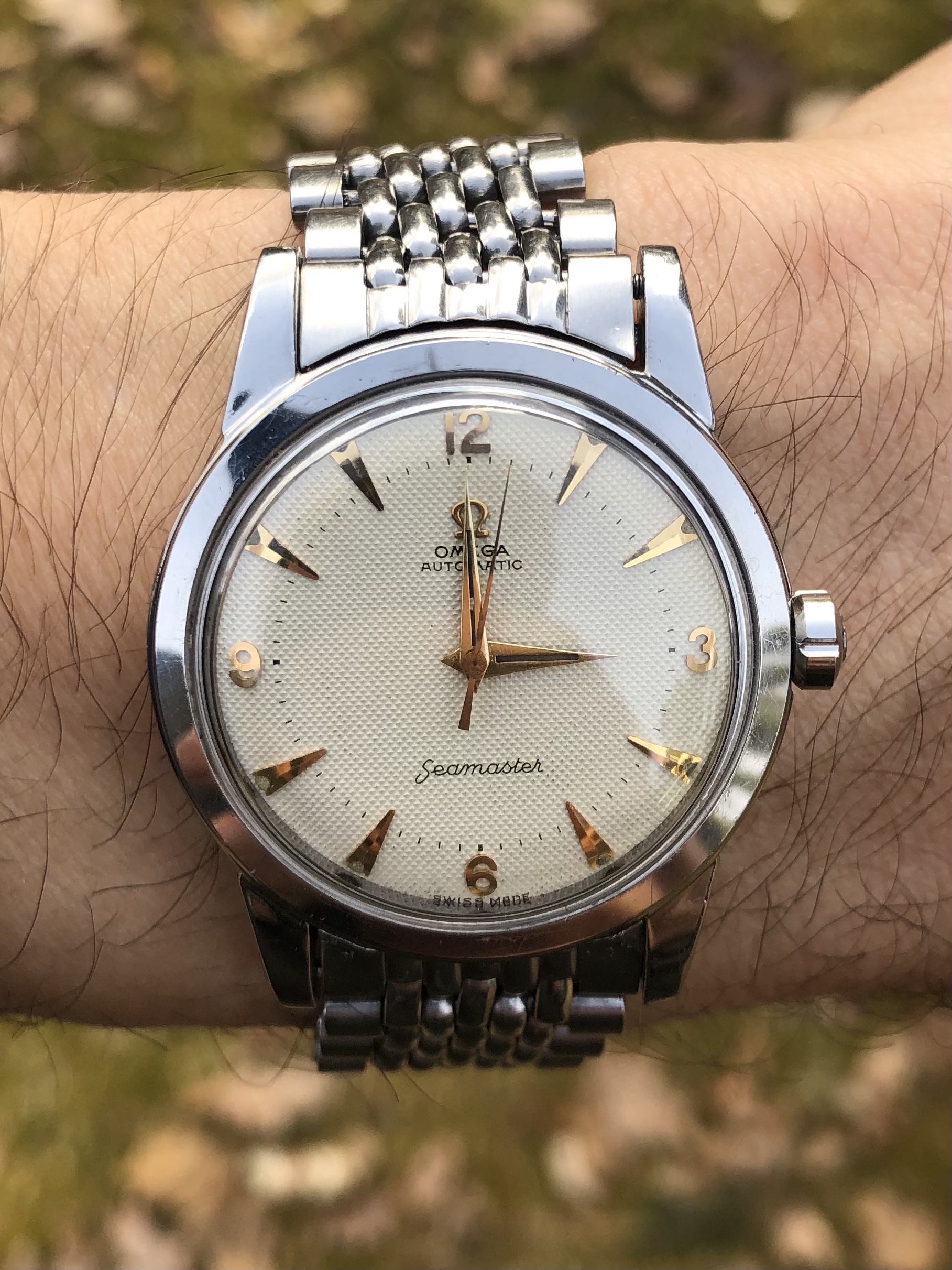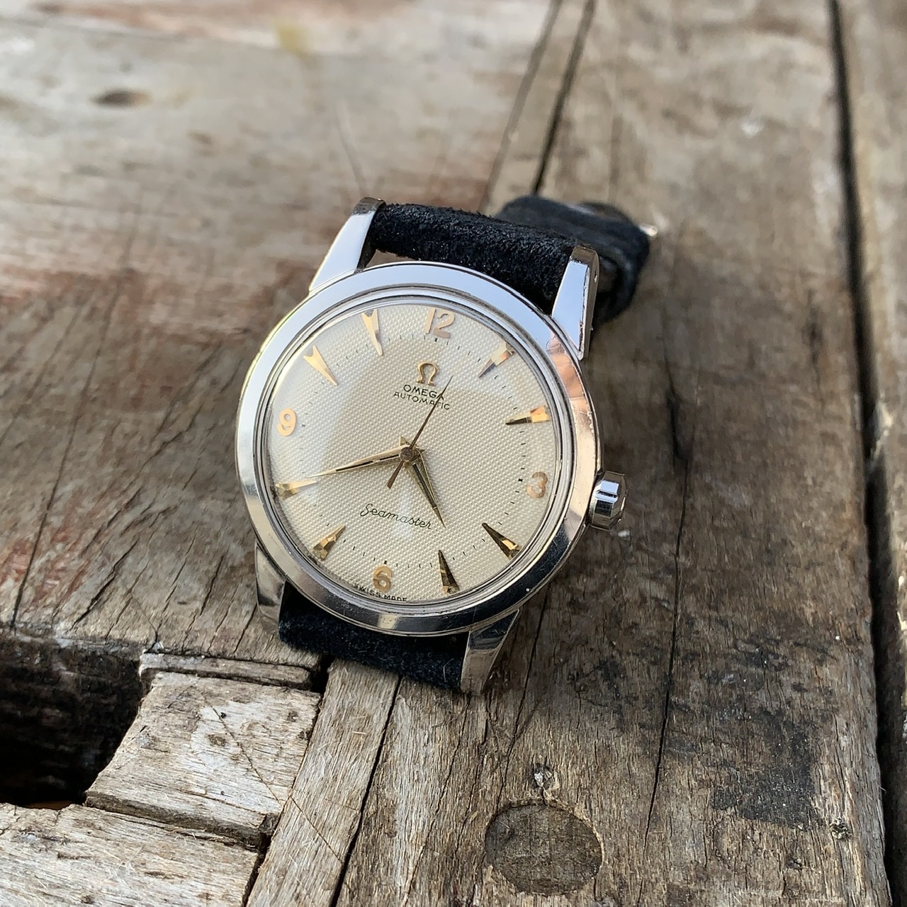 The honeycomb dial has a lovely beige color and applied gold hour markers/numerals. It’s in flawless condition and absolutely gorgeous with its original lume still being intact. The hand are golden as well and miss some lume.