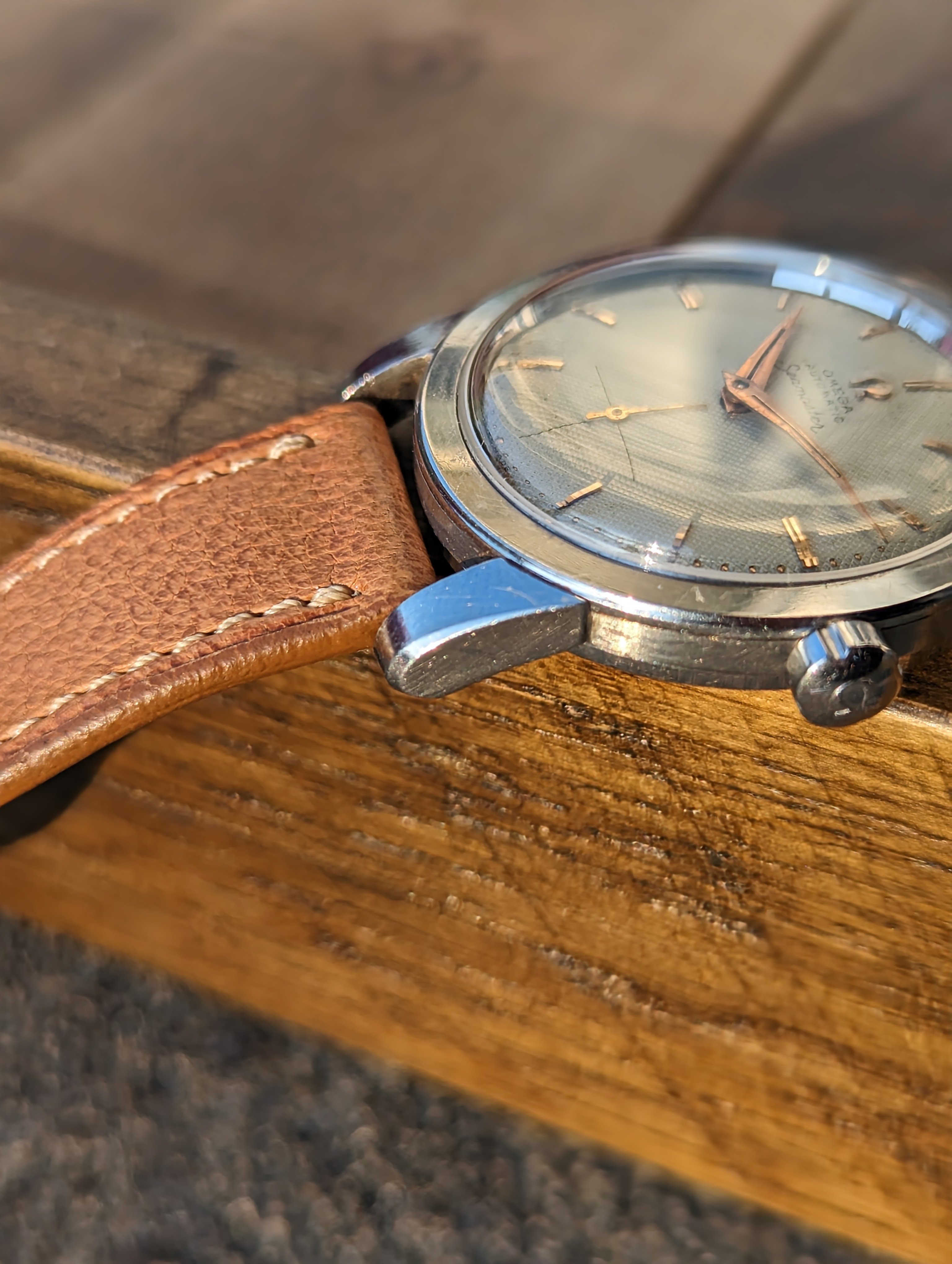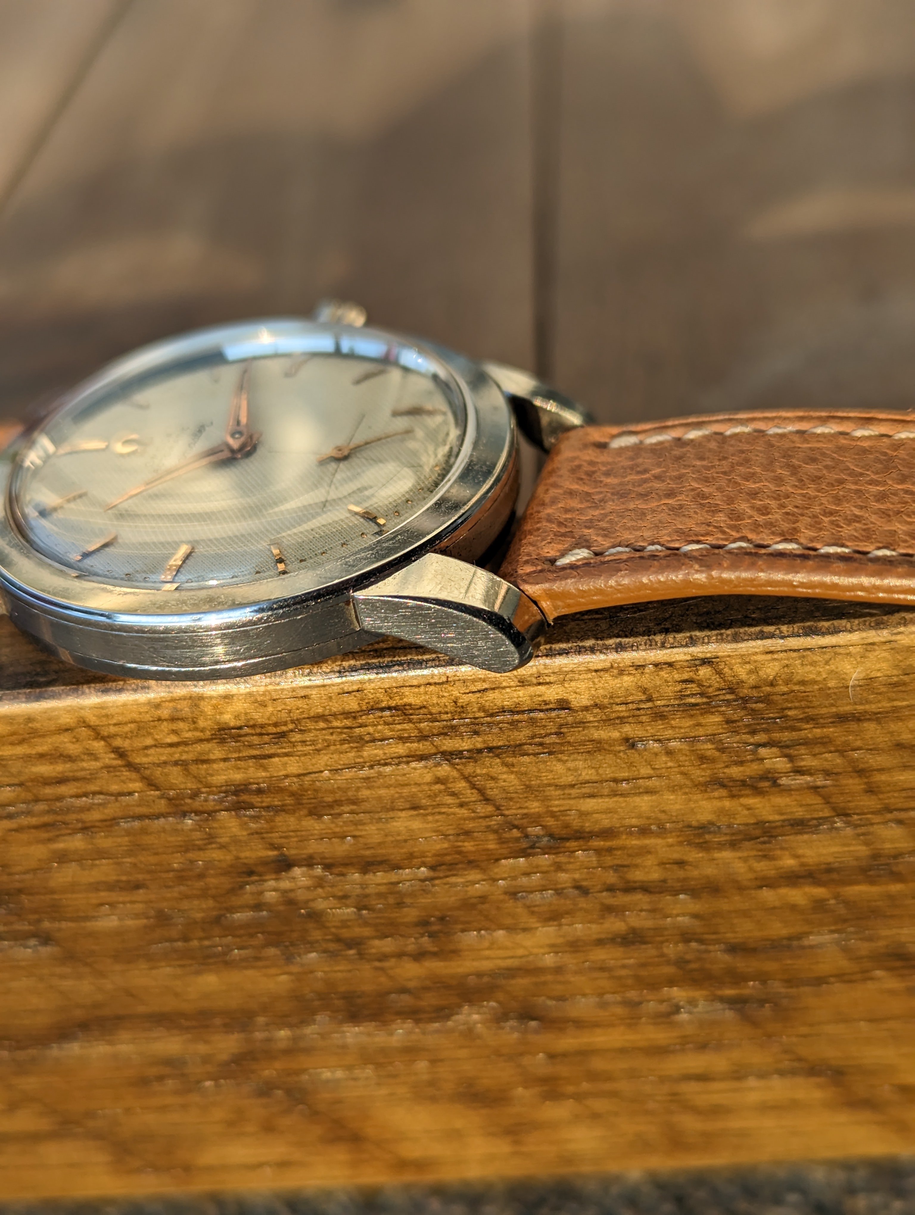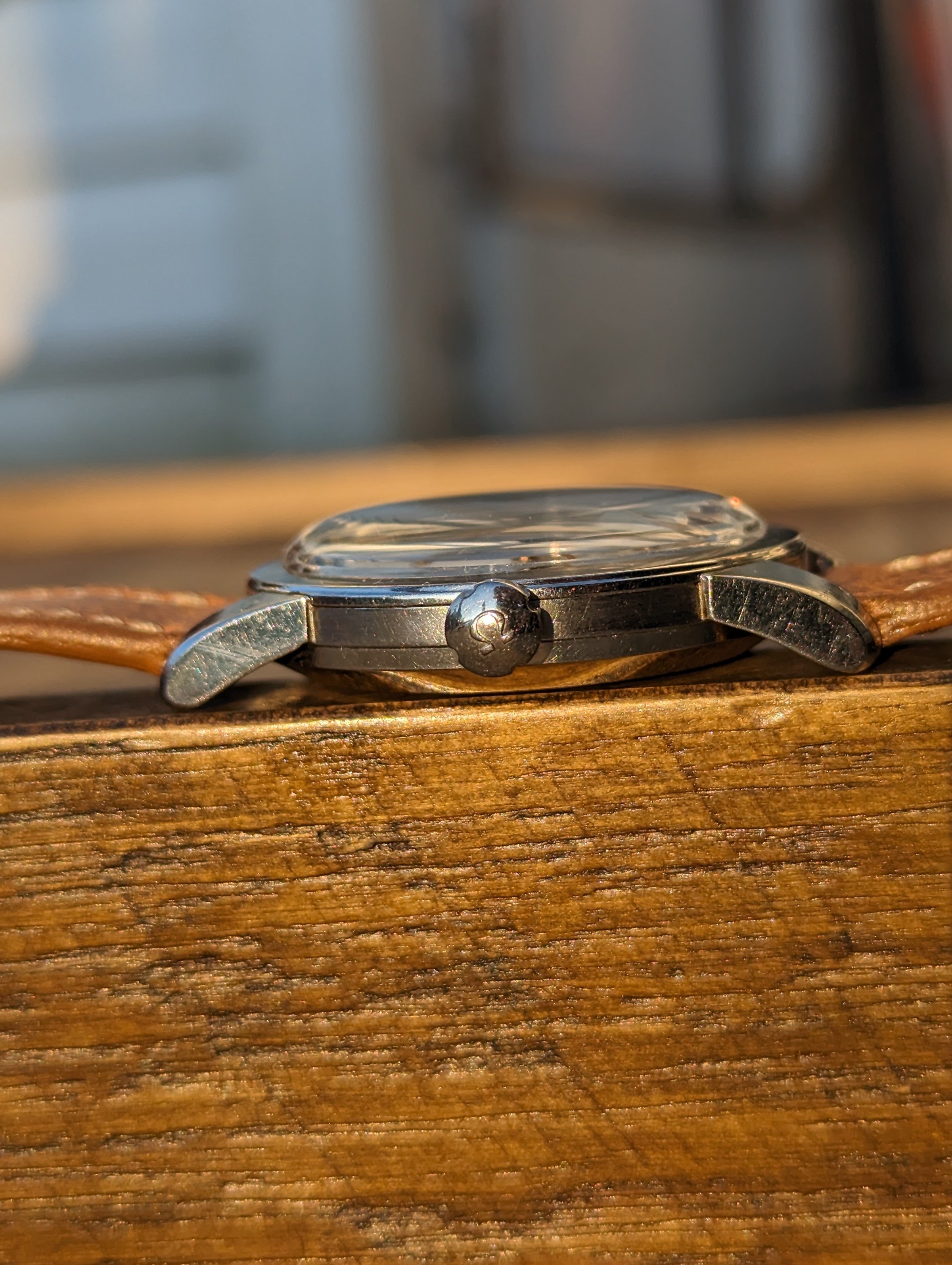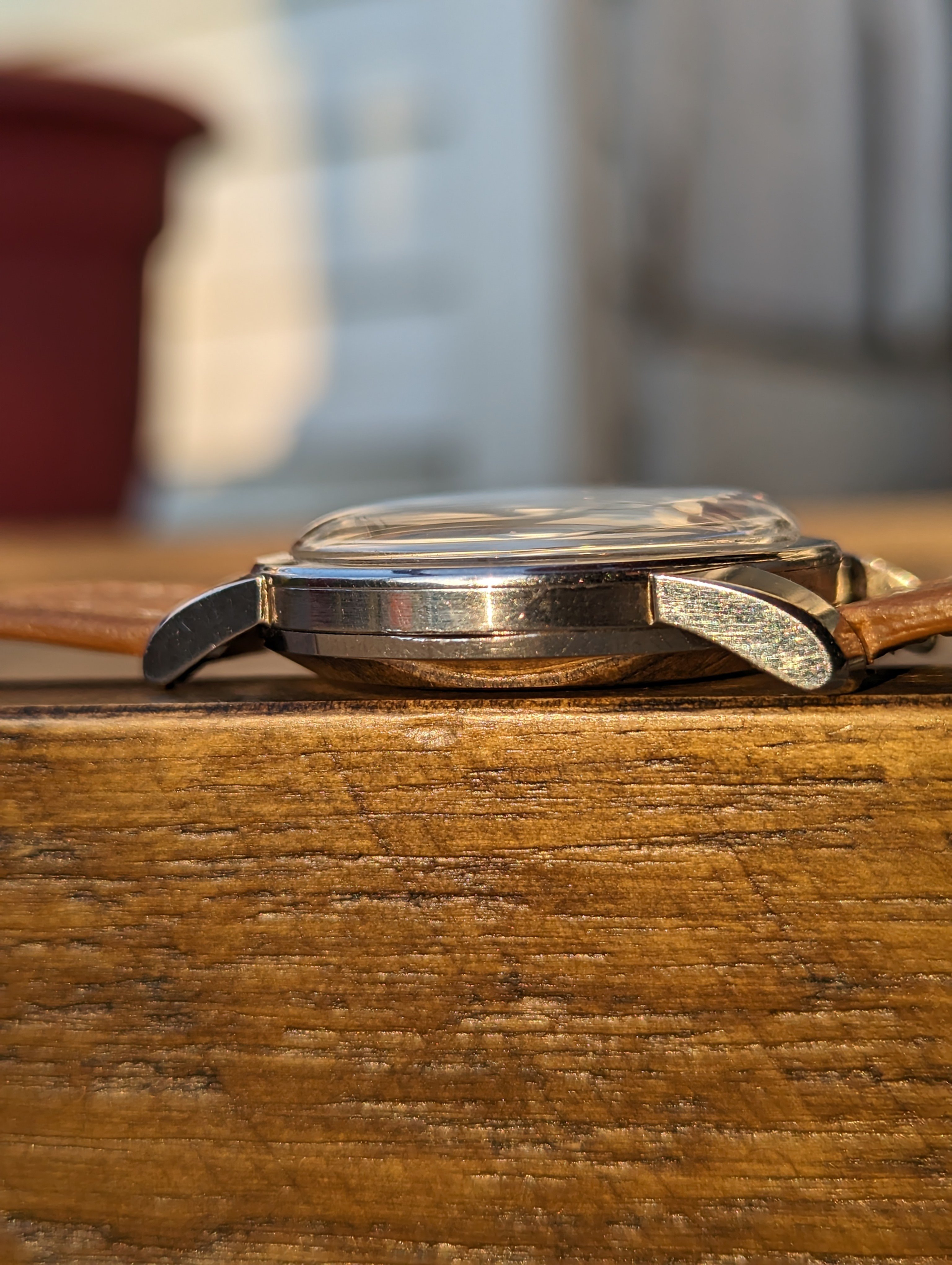 CASE: The 34mm stainless steel case is very strong and is excellently preserved. It has been only very lightly polished in the past. The original bevels are very evident and distinct on all four lugs. The case presents with light wear throughout commensurate with its age. It is completed by the correct and original crown. The crystal was replaced sometime in the past.