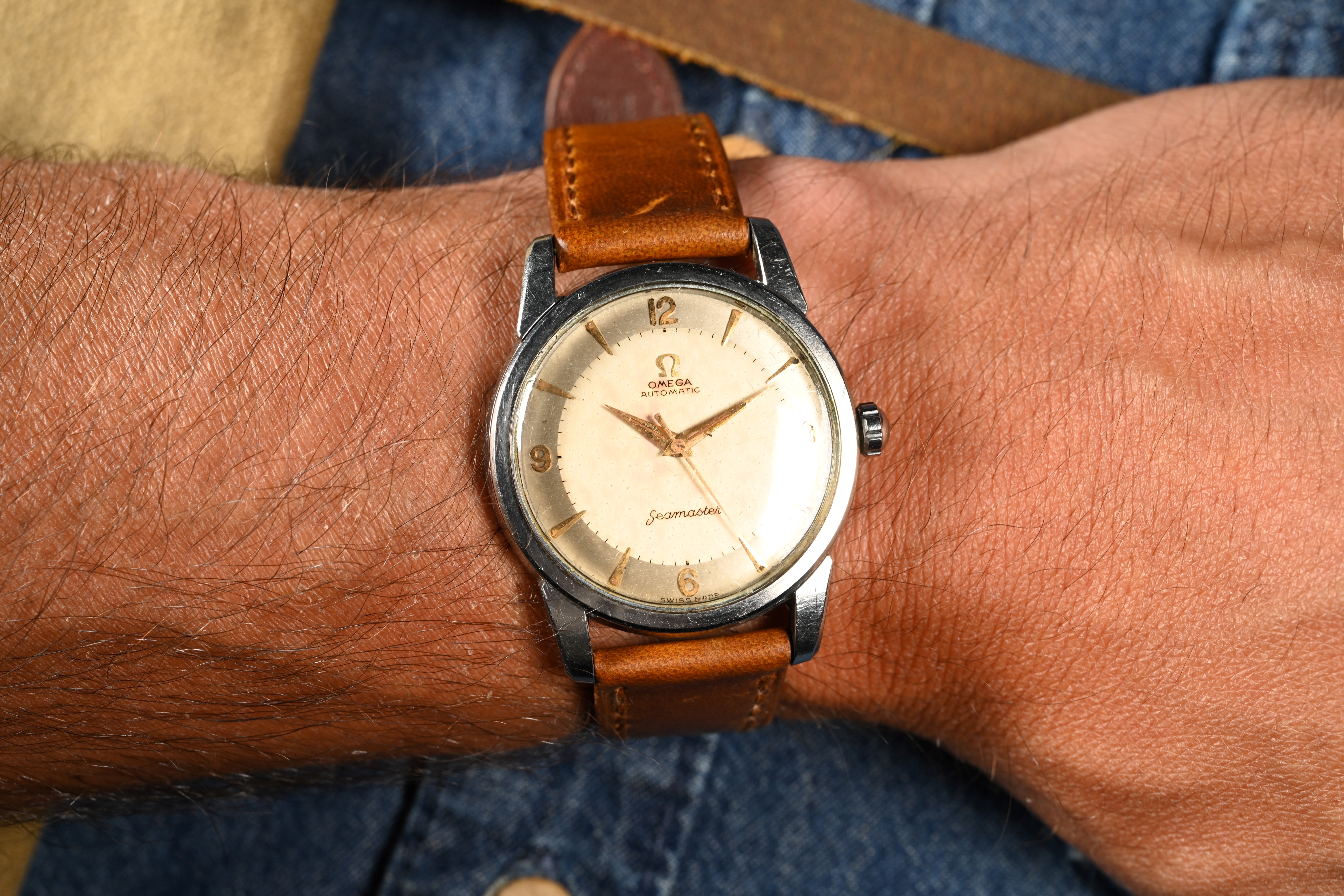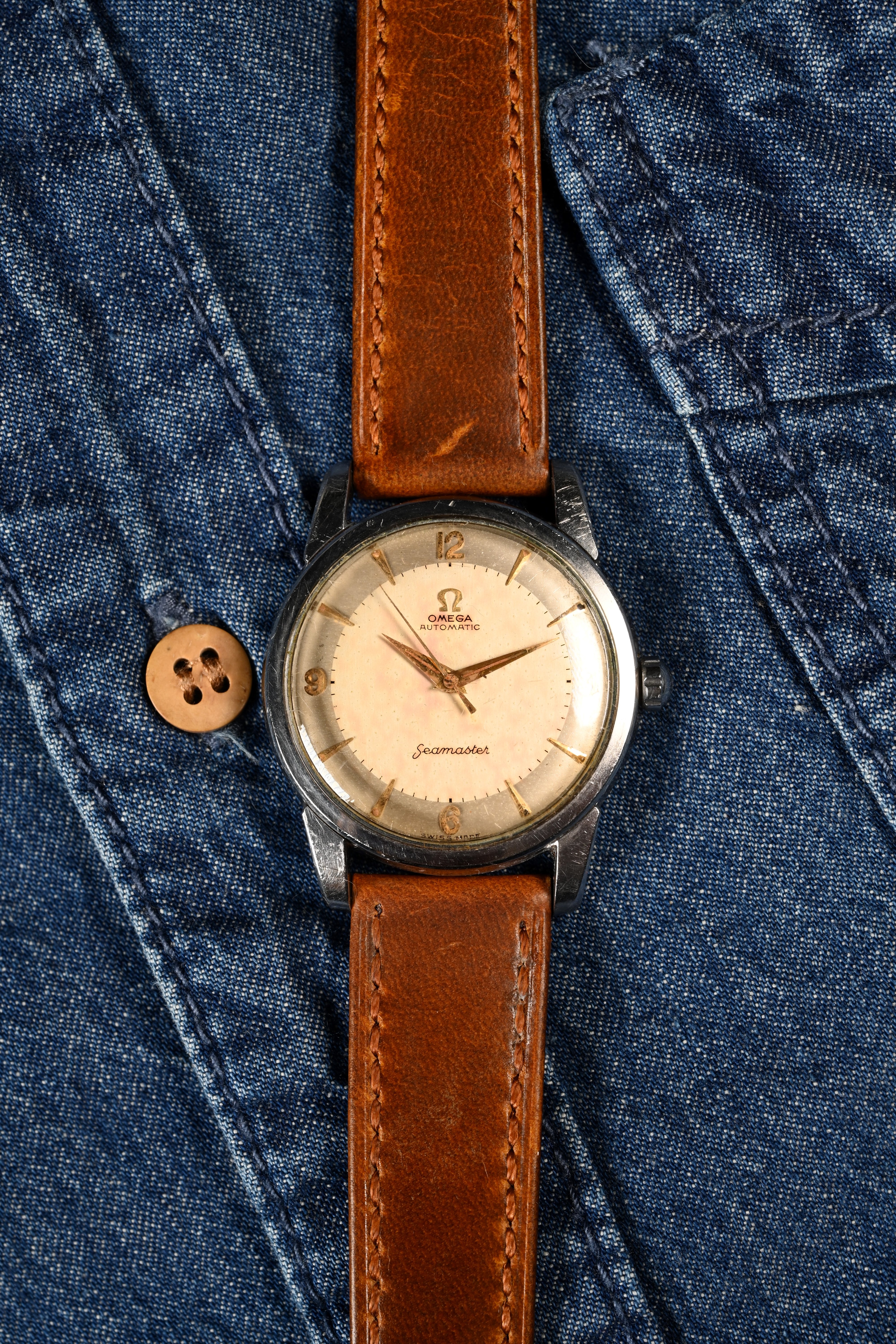 DIAL: An original two tone silver dial. The dial presents with gold applied Arabic numerals at the 12, 3, 6, and 9 position while the rest of the spots are occupied by dagger style hour markers. With the exception of the 2 and 5 o'clock hour markers, the lume on the dial has aged to a light pumpkin patina and matches the hands perfectly. The hands present with some oxidization and the dial has light spotting throughout.