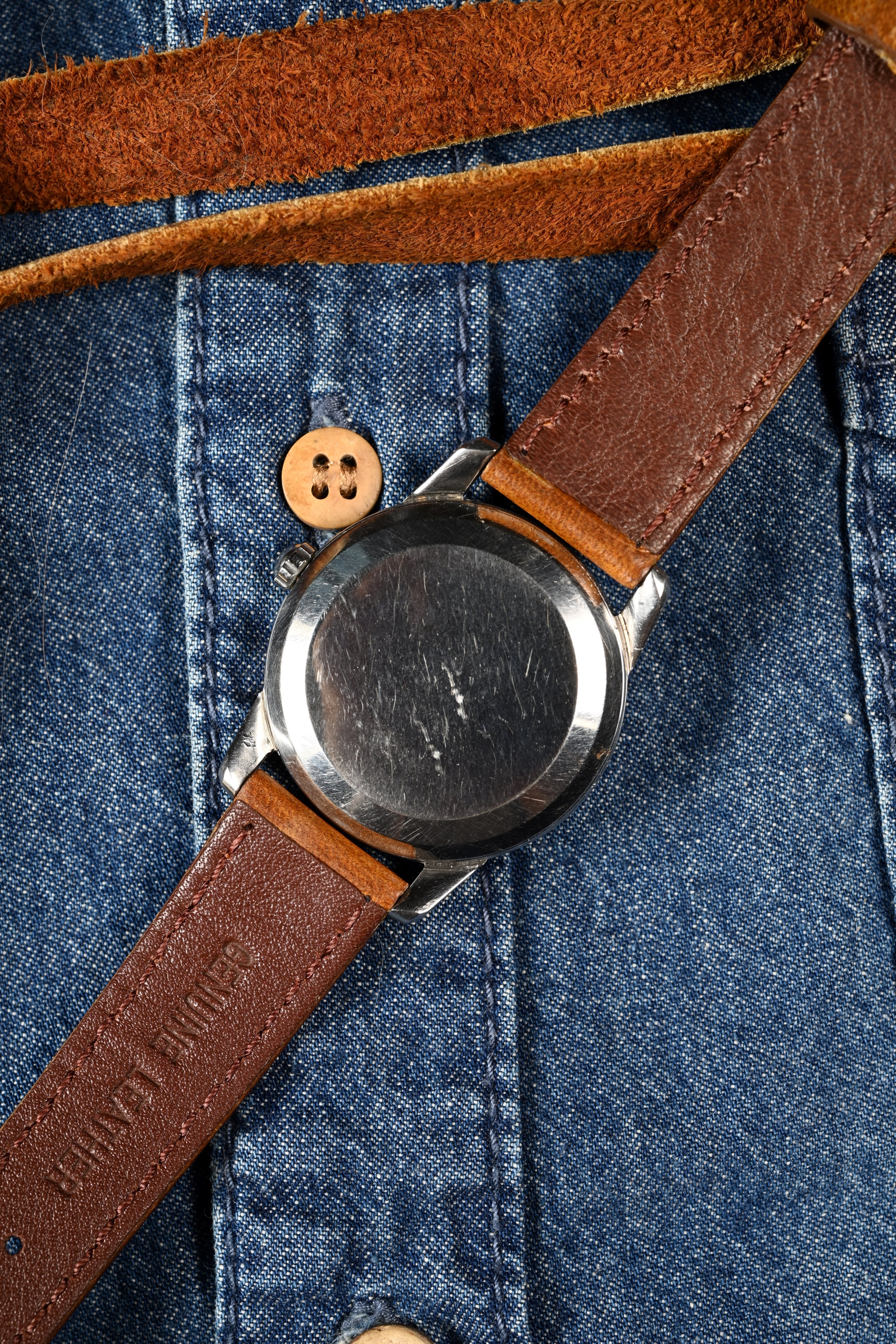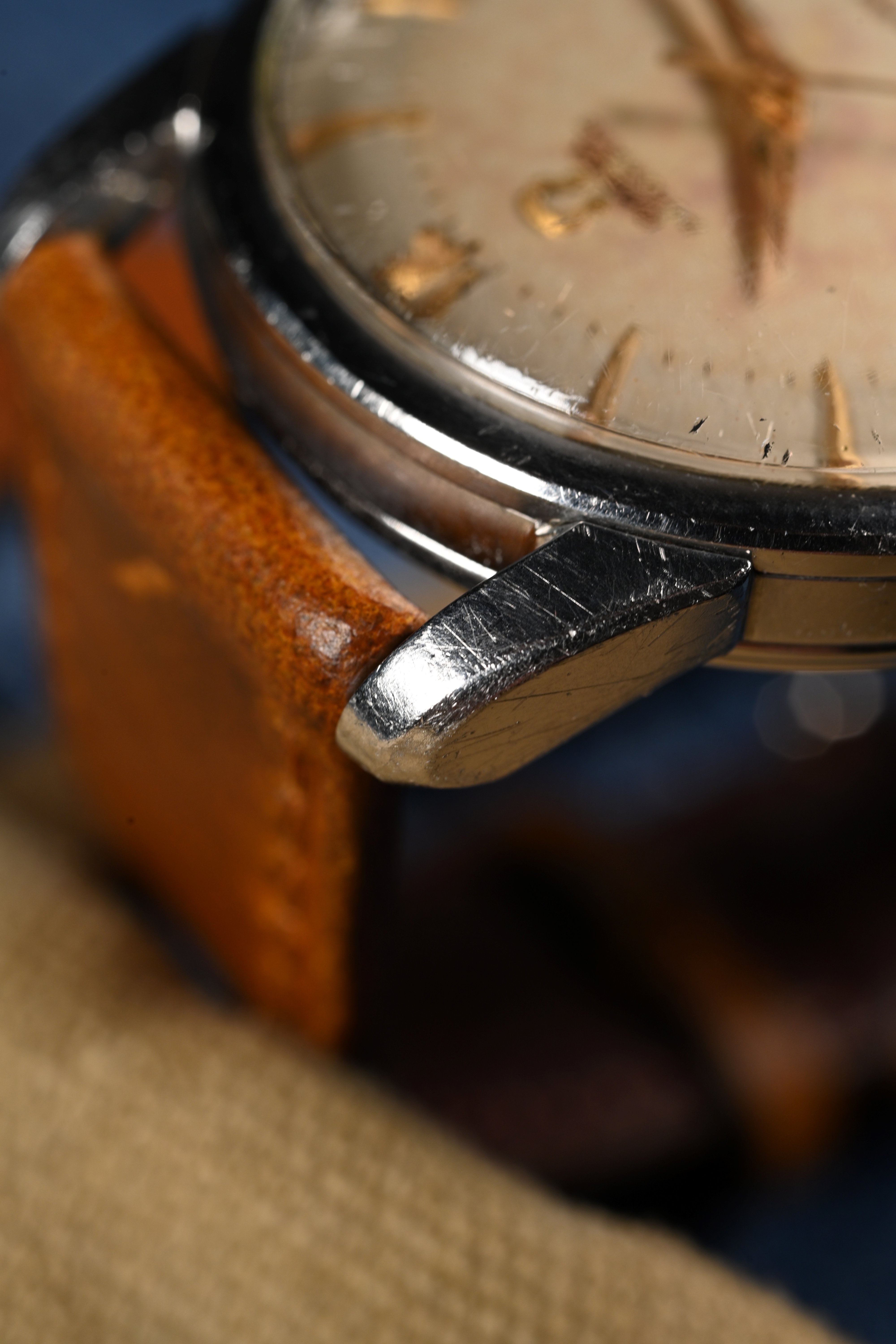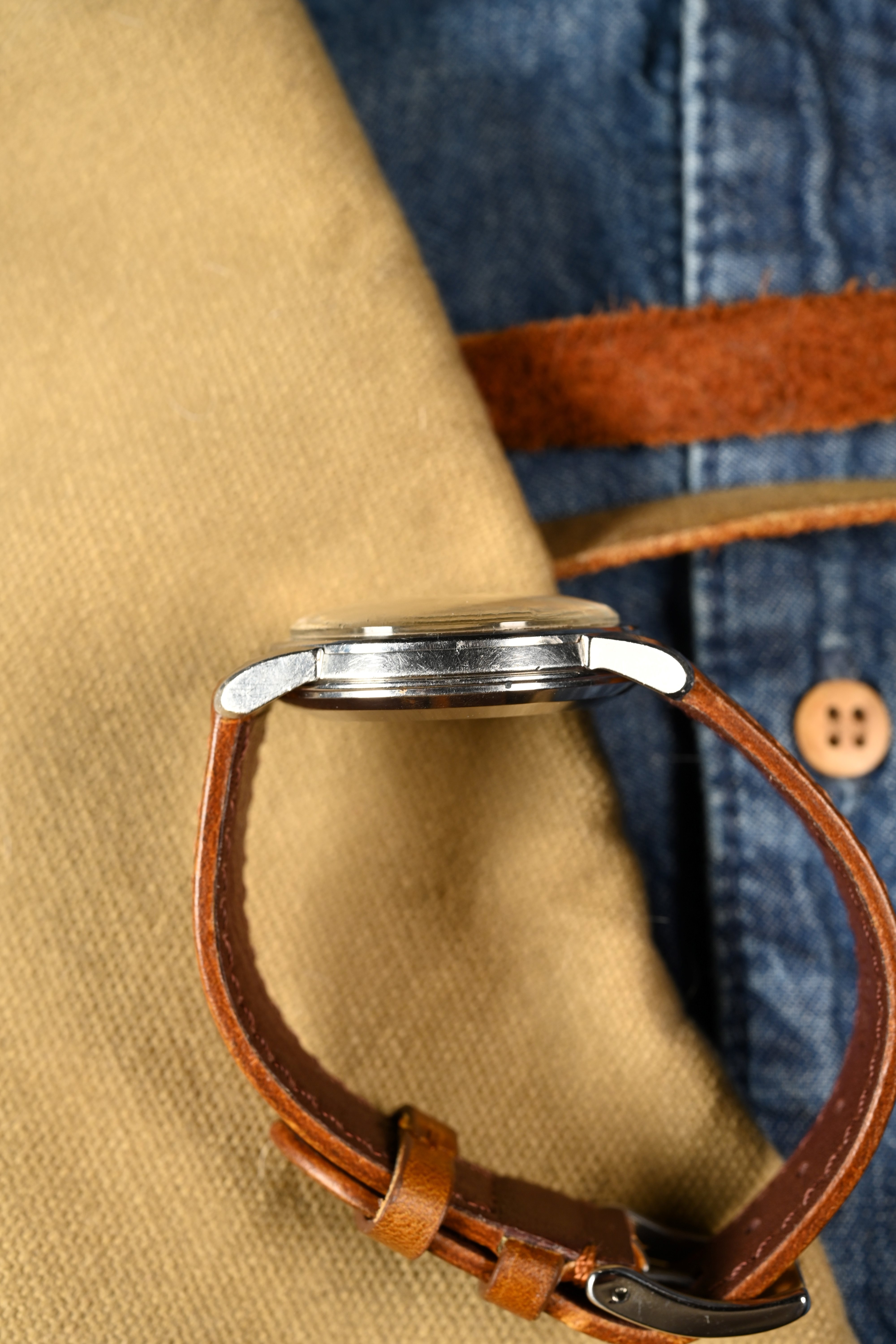 CASE: The 34mm stainless steel case has been lightly polished in the past and remains very strong. The factory original bevels can still be appreciated on all four lugs. The case presents with light to moderate wear throughout commensurate with honest use and its age. The crystal and crown have been replaced in the past. An original and correct crown for the reference may be put on for $75.