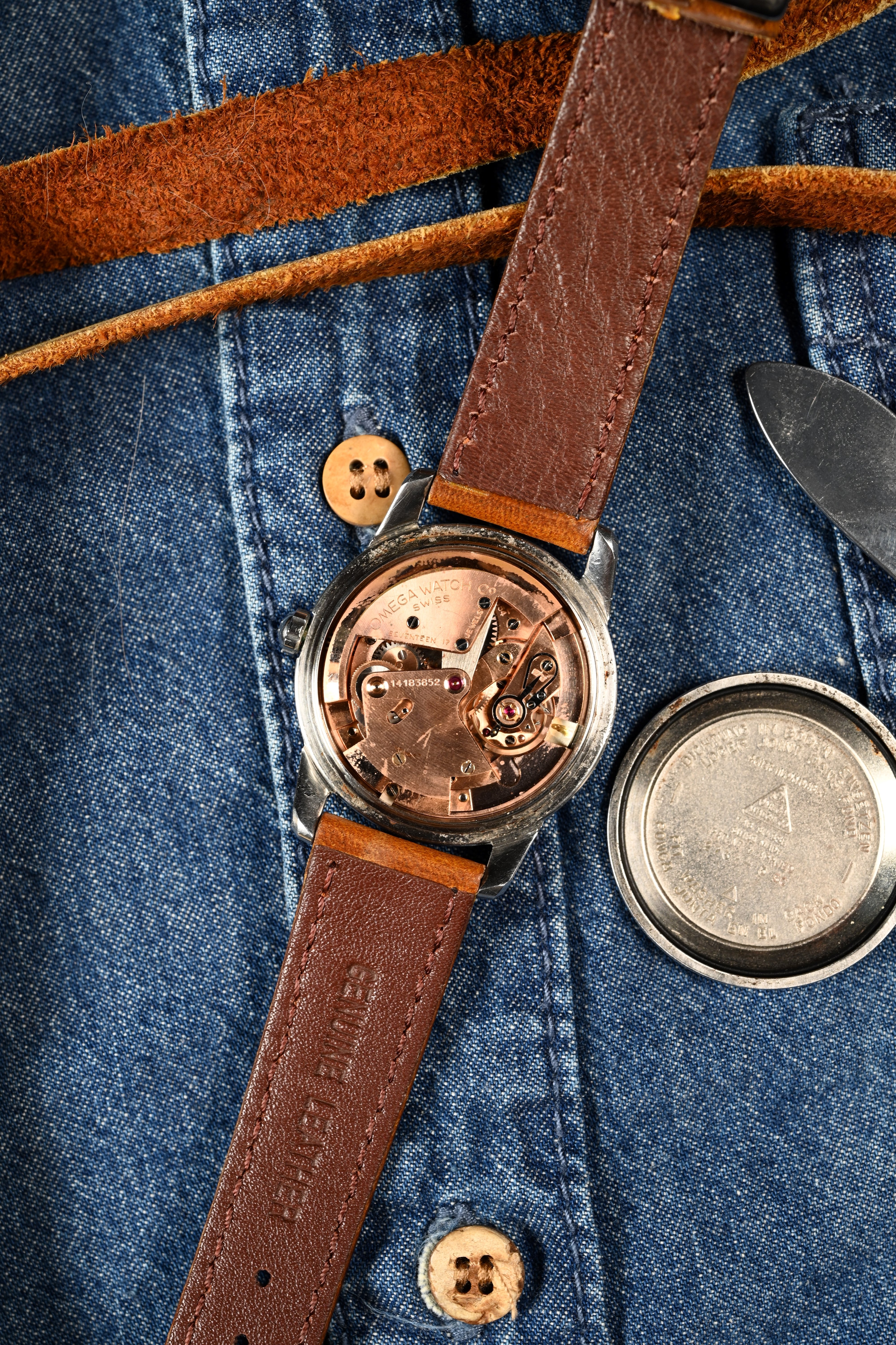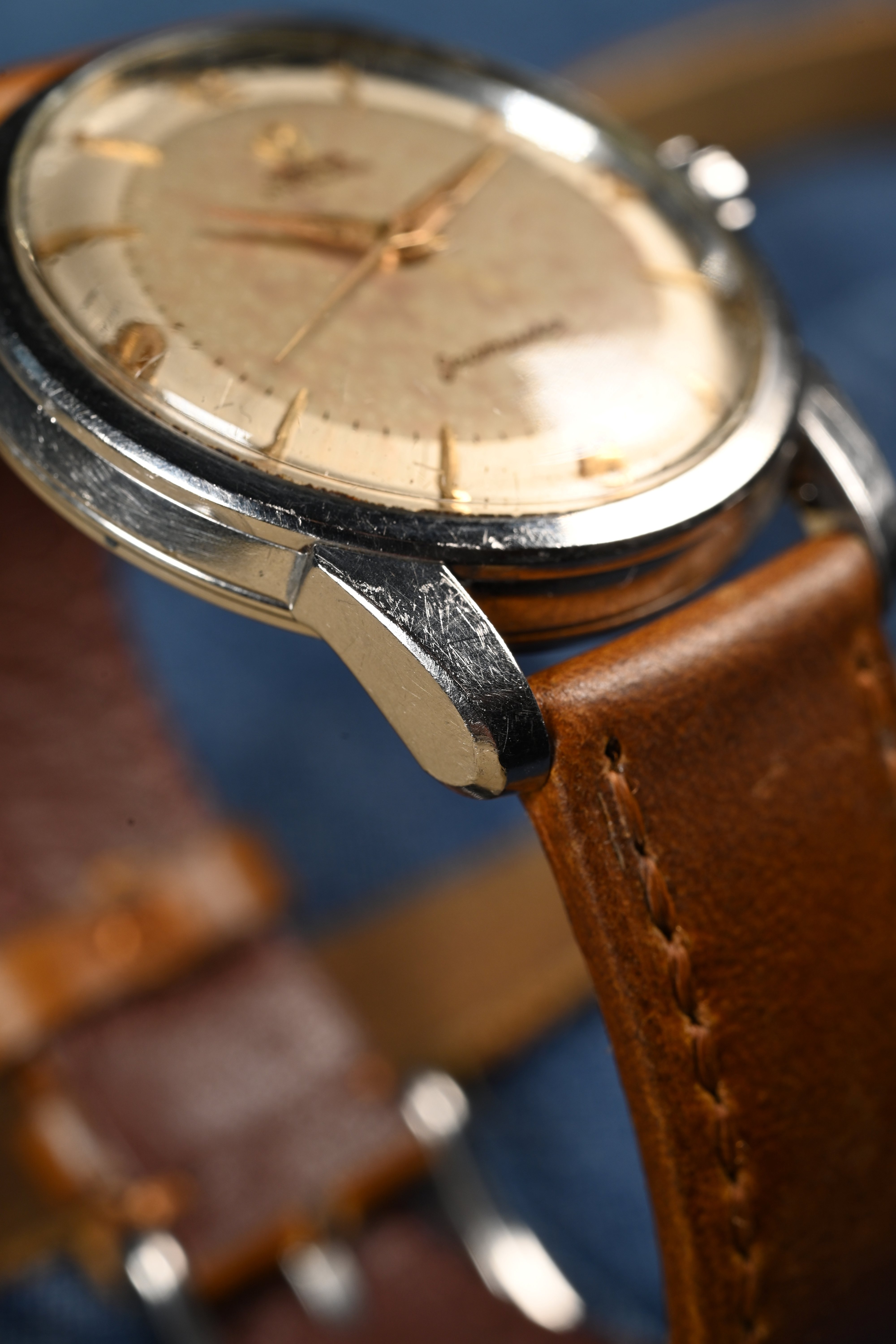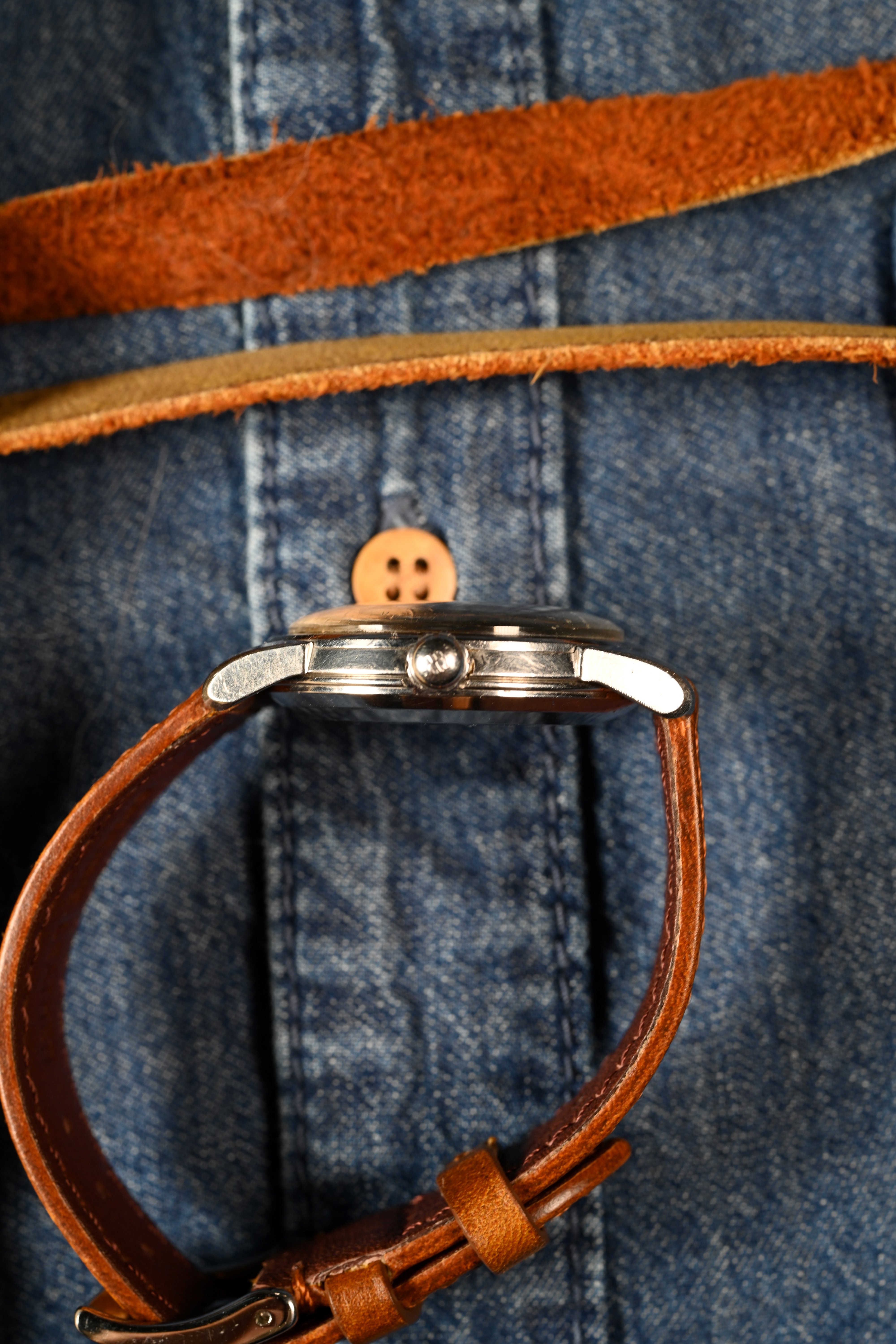 CASE: The 34mm stainless steel case has been lightly polished in the past and remains very strong. The factory original bevels can still be appreciated on all four lugs. The case presents with light to moderate wear throughout commensurate with honest use and its age. The crystal and crown have been replaced in the past. An original and correct crown for the reference may be put on for $75.