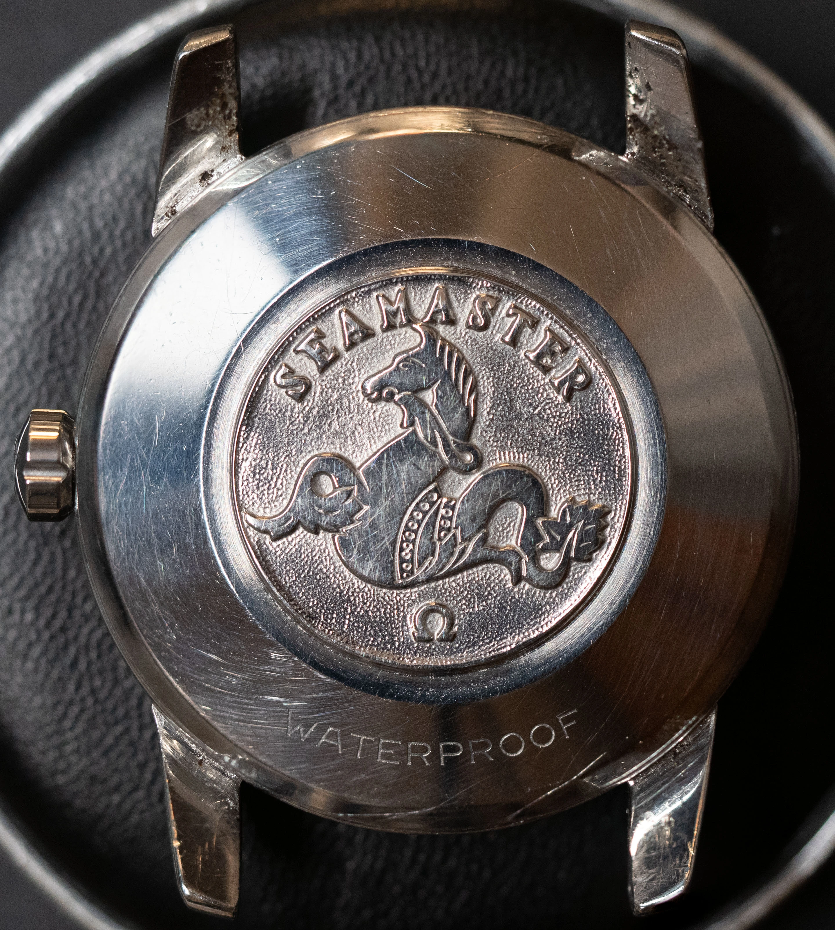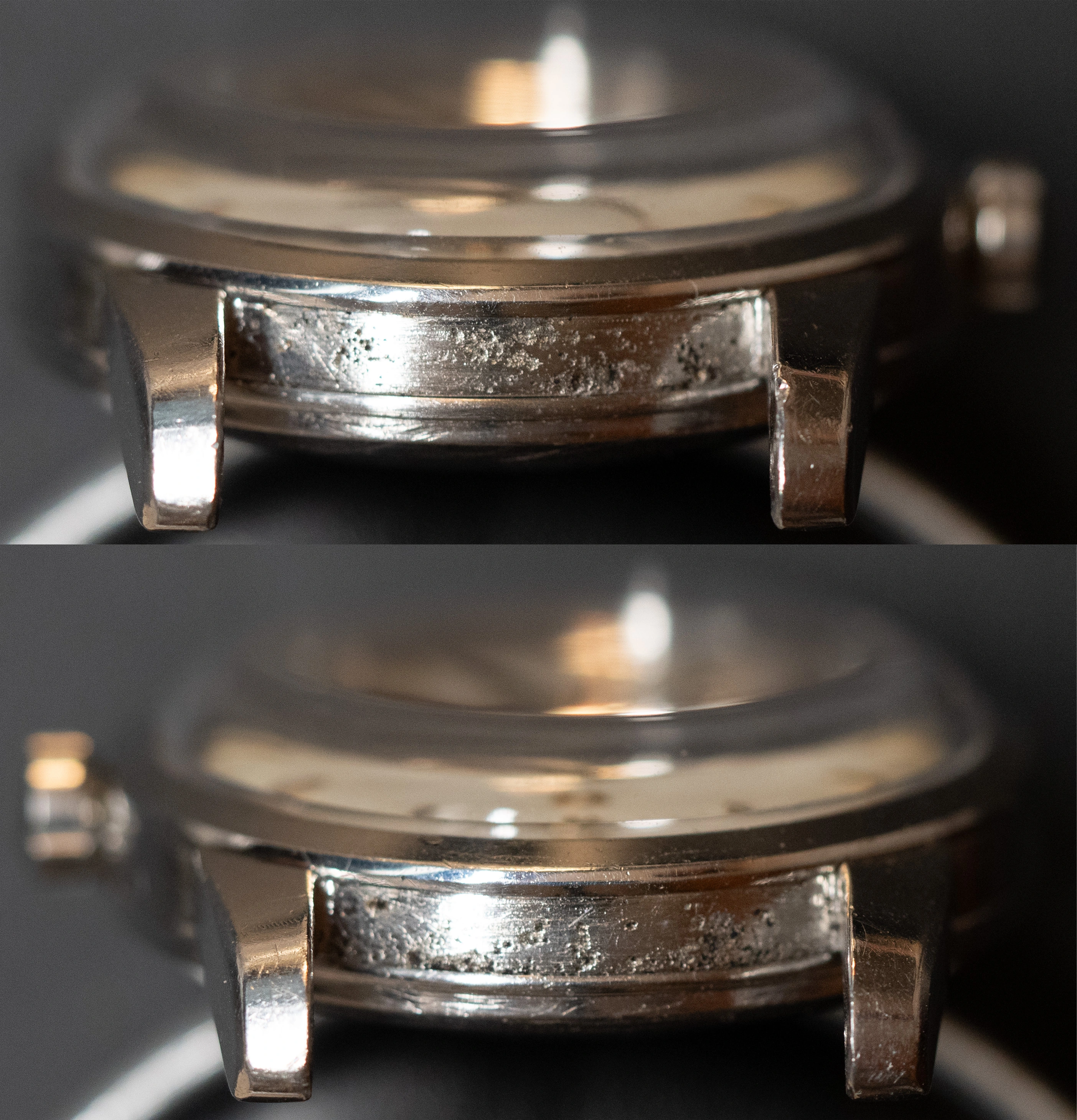 - The case has some pitting in between the lugs and on the outer surface on the back.